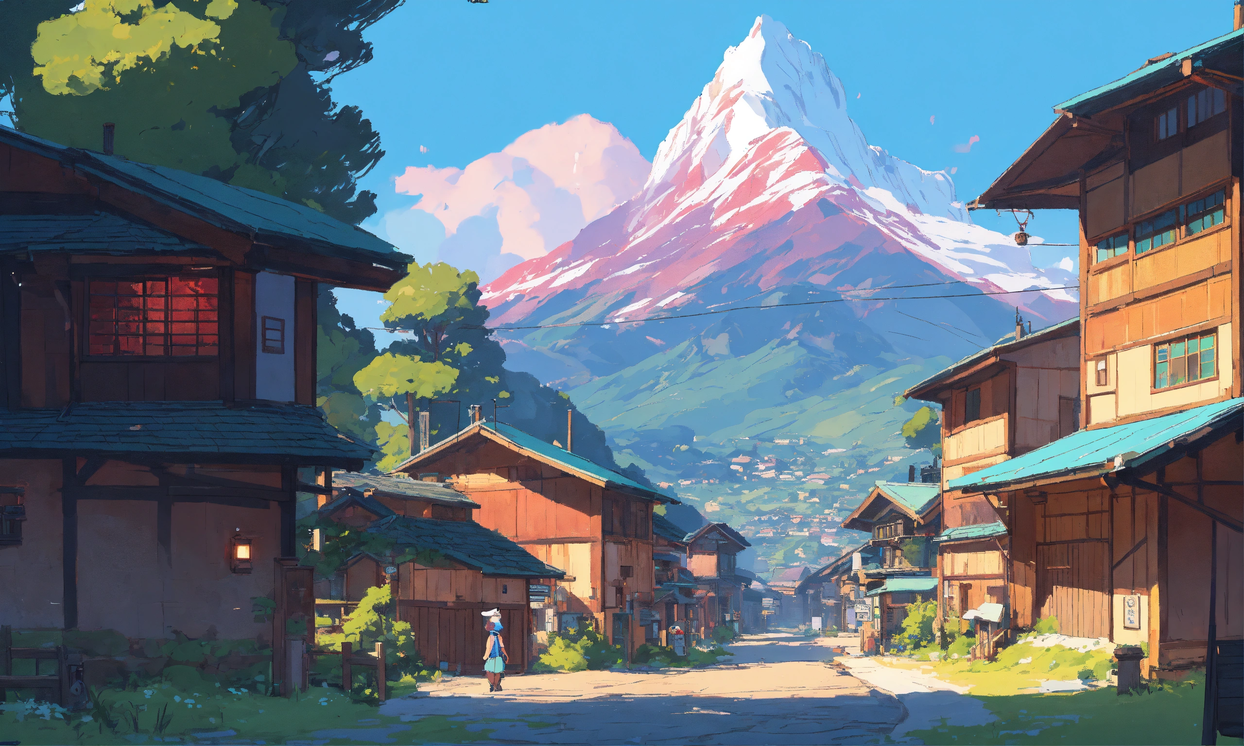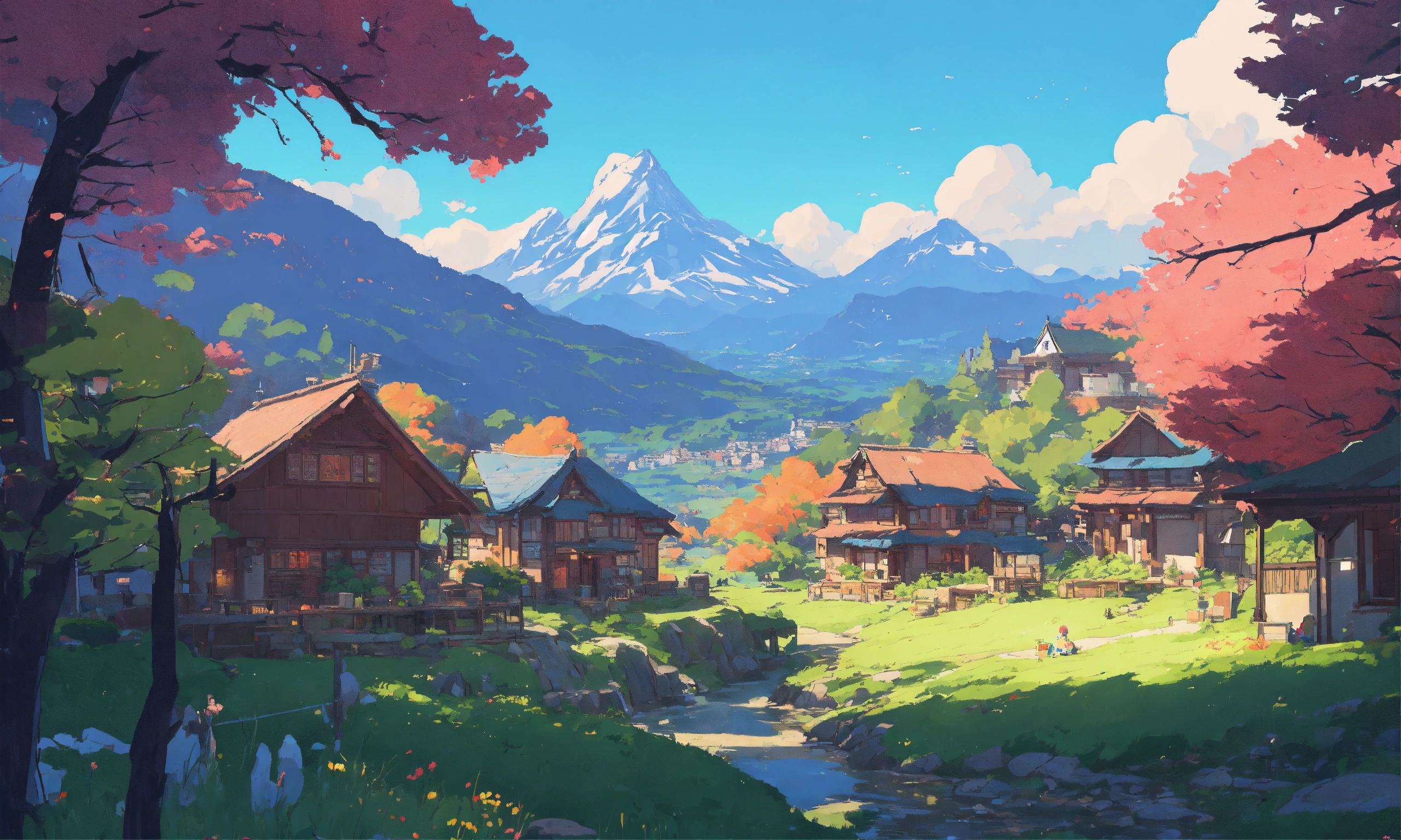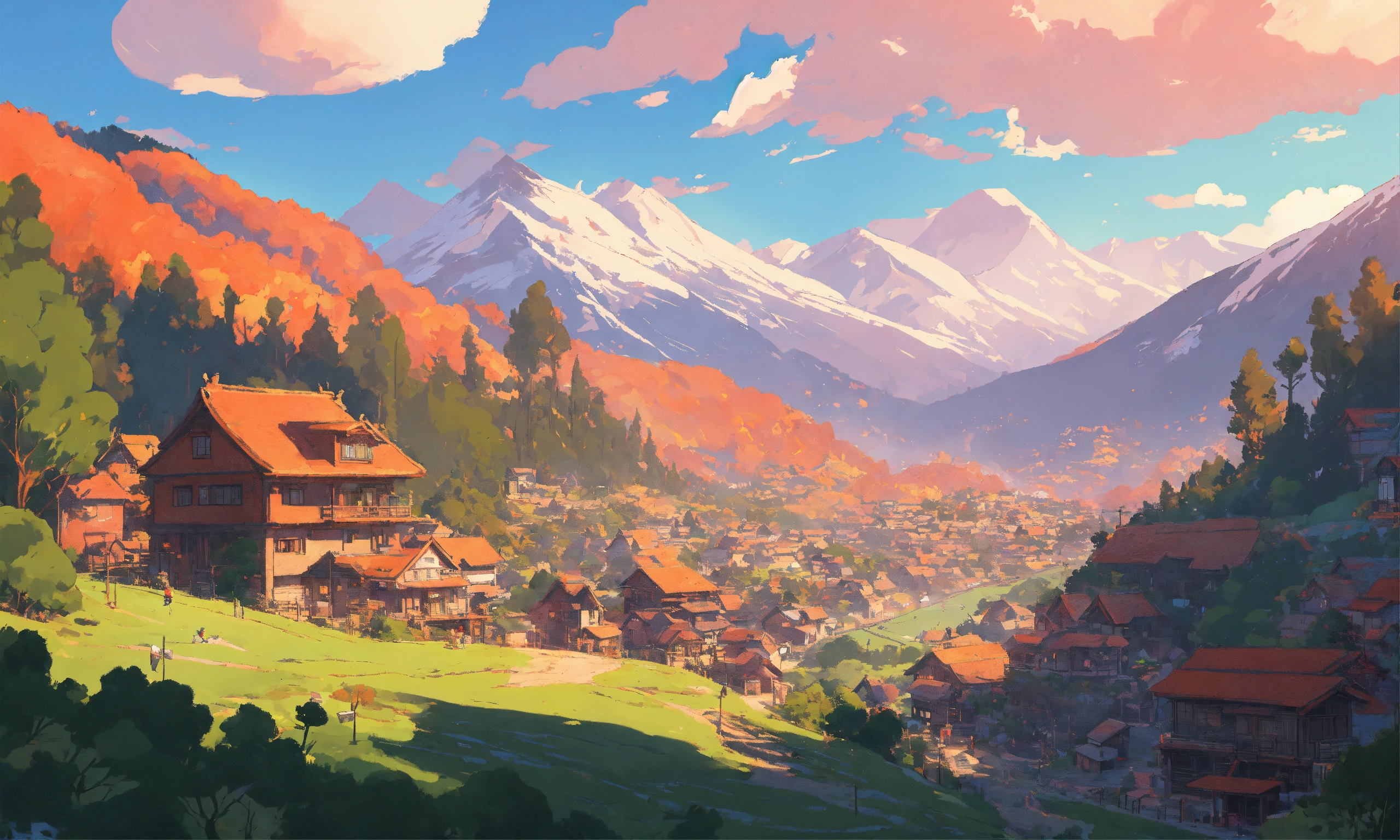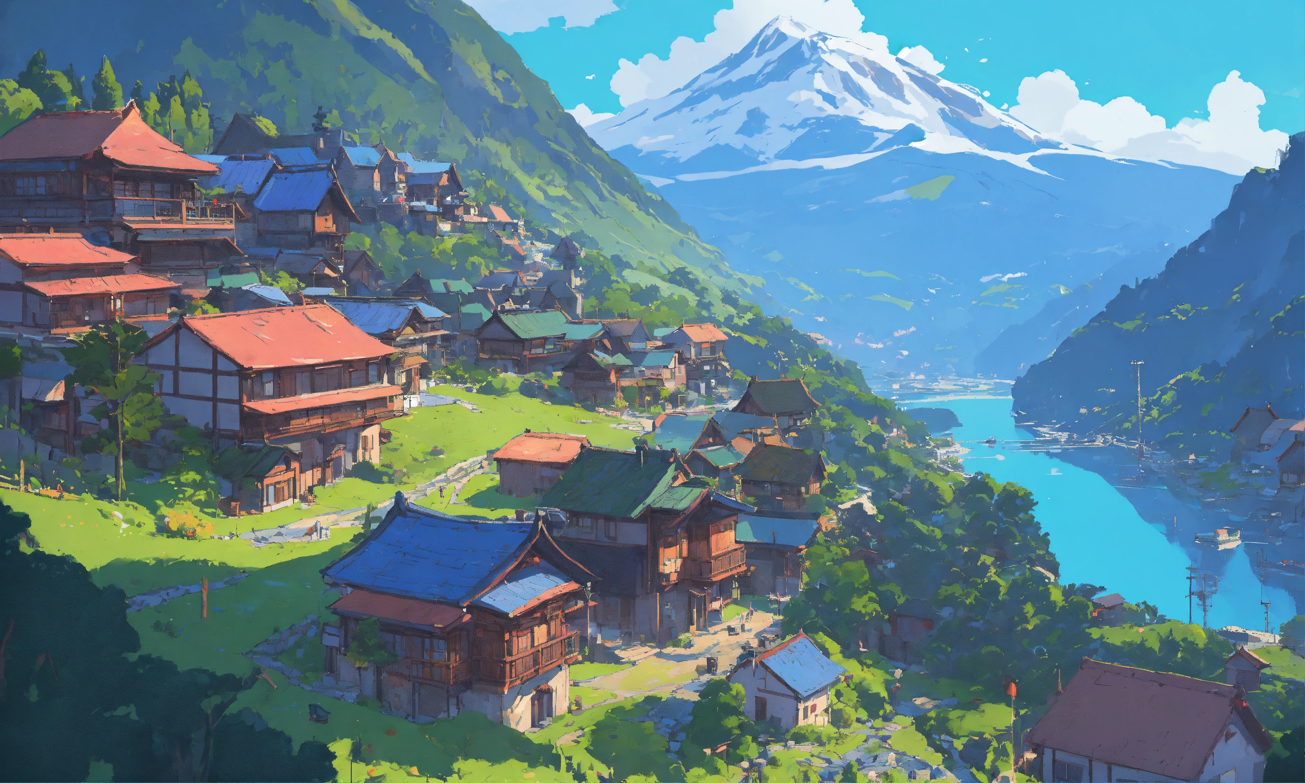 Digital art of a peaceful and serene village in mountains, cartoony style of laurie greasley, studio ghibli, akira toriyama, james gilleard, genshin impact, trending pixiv fanbox, acrylic palette knife, 4k, vibrant colors, devinart, trending on artstation, low details