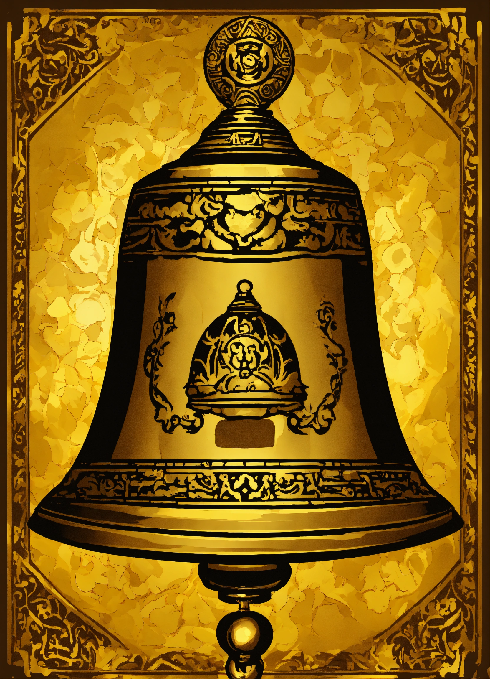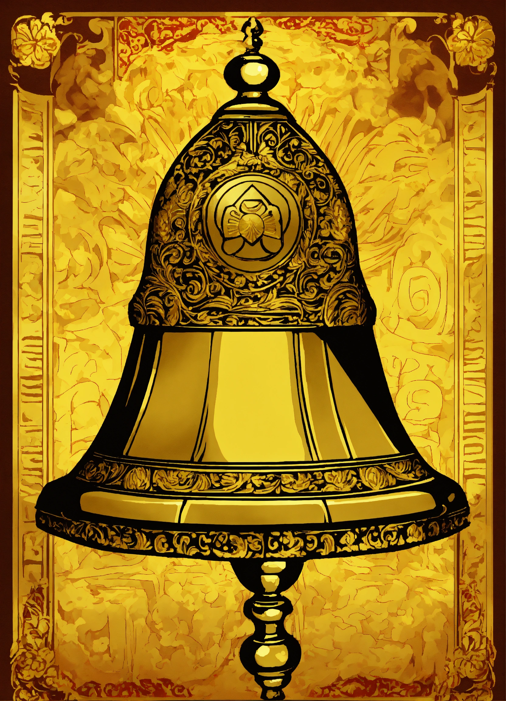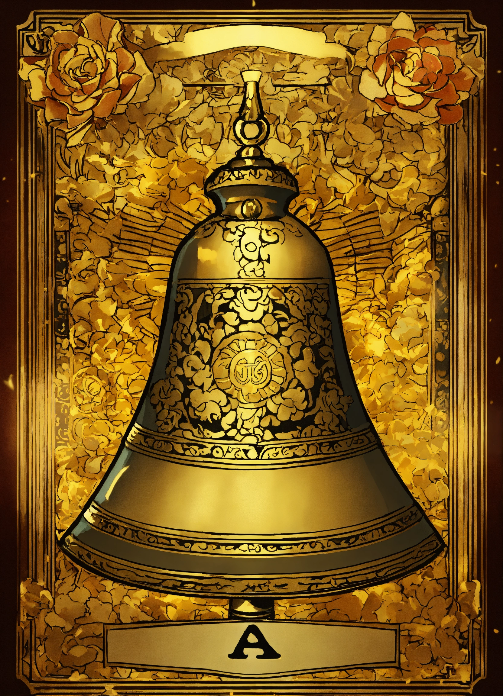 A big bell, based on the card "la campana" of the mexican lottery deck in anime style. gold background card styled.