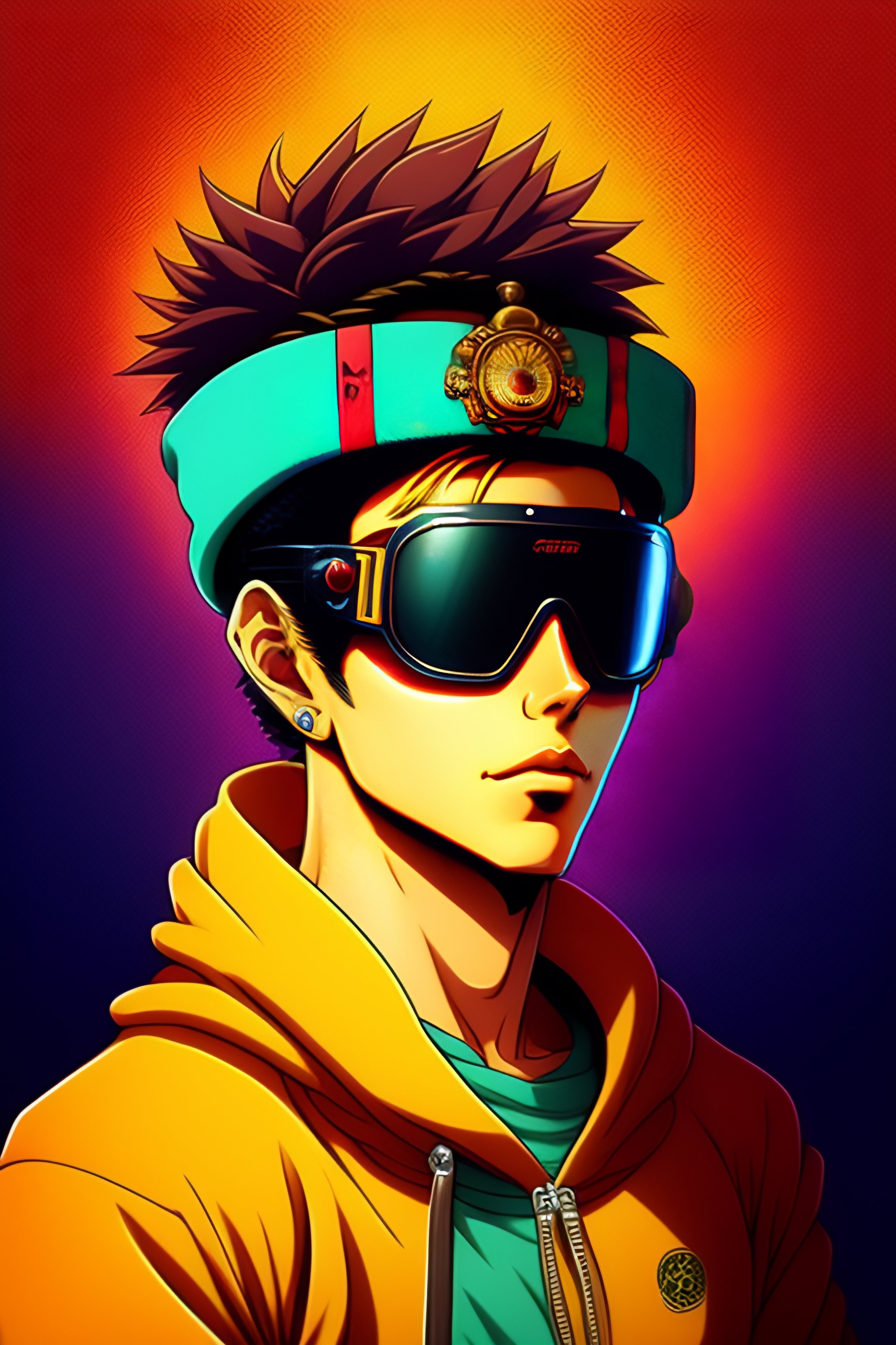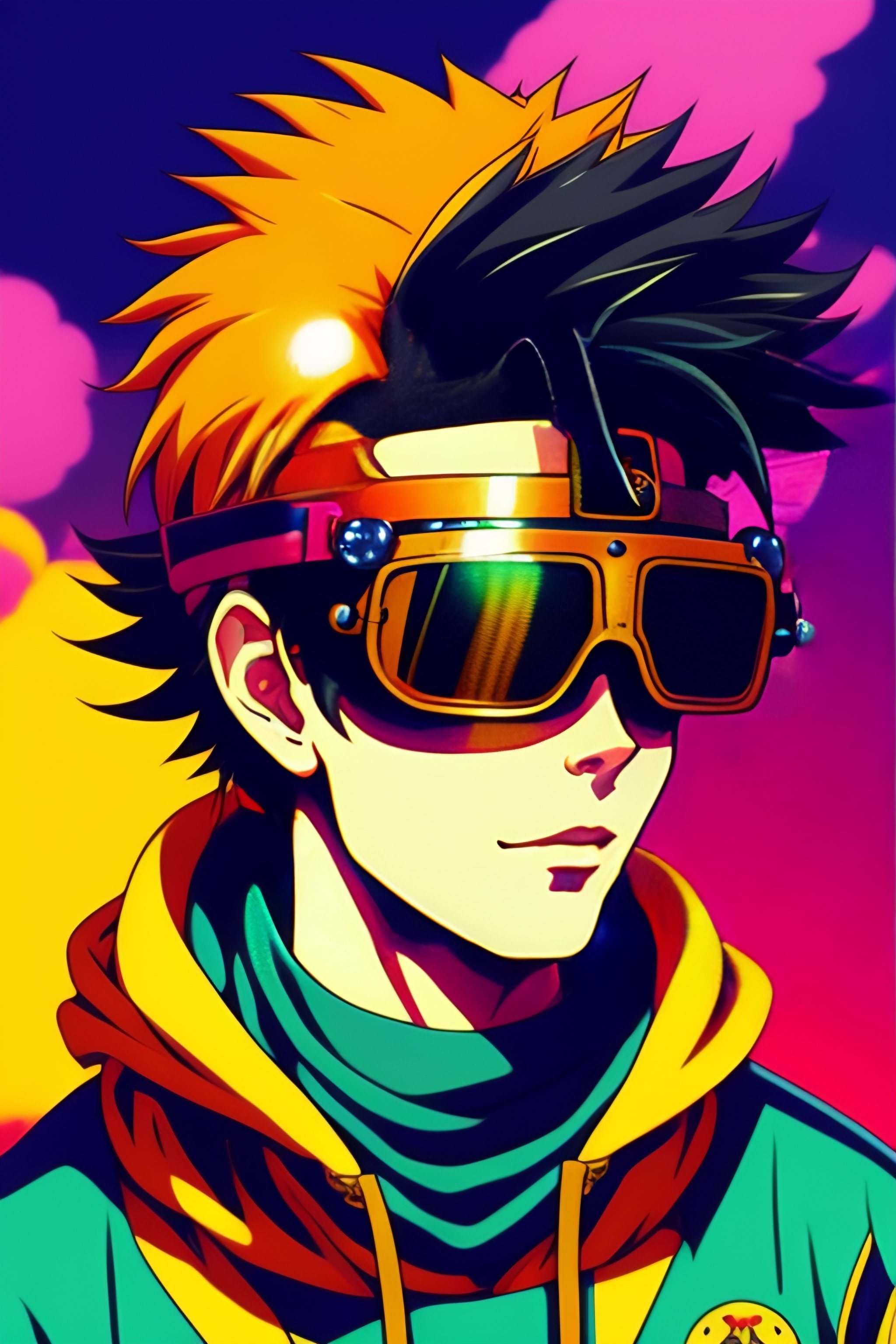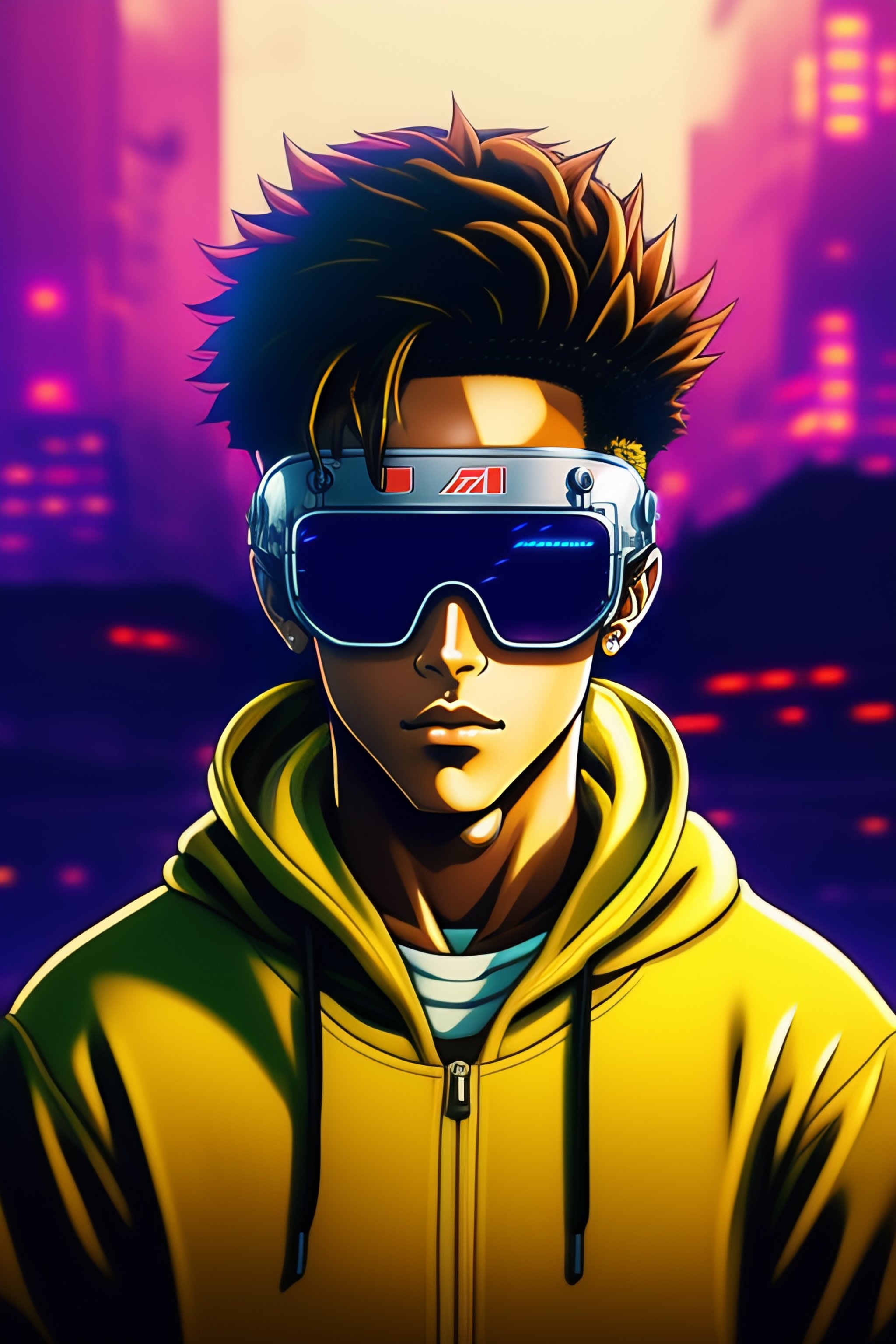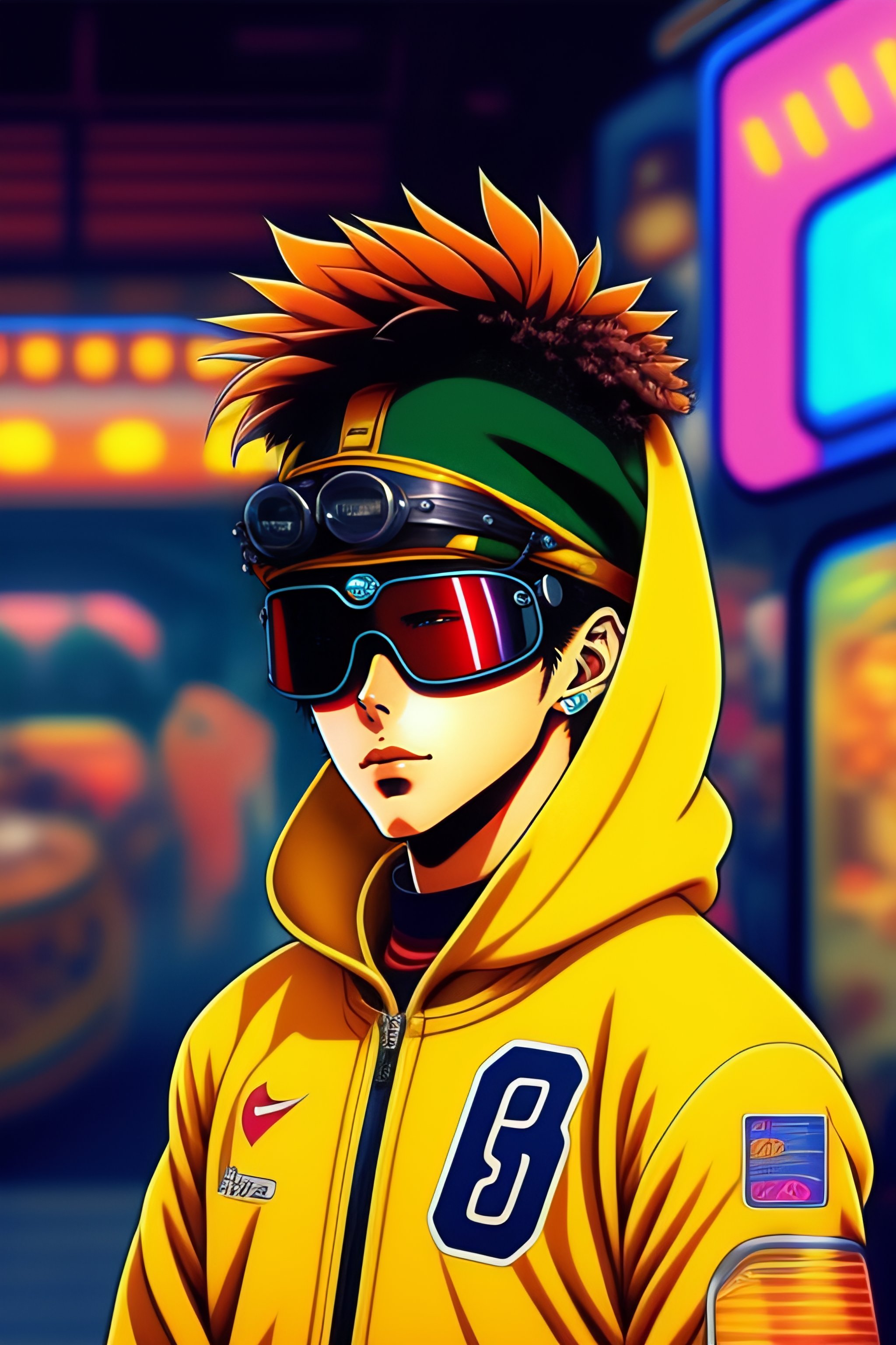 Vintage 90's anime style, retro.anime of neymar with bandage on nose wearing steampunk goggles wearing hoodie, in a arcade, sci-fi., surreal.