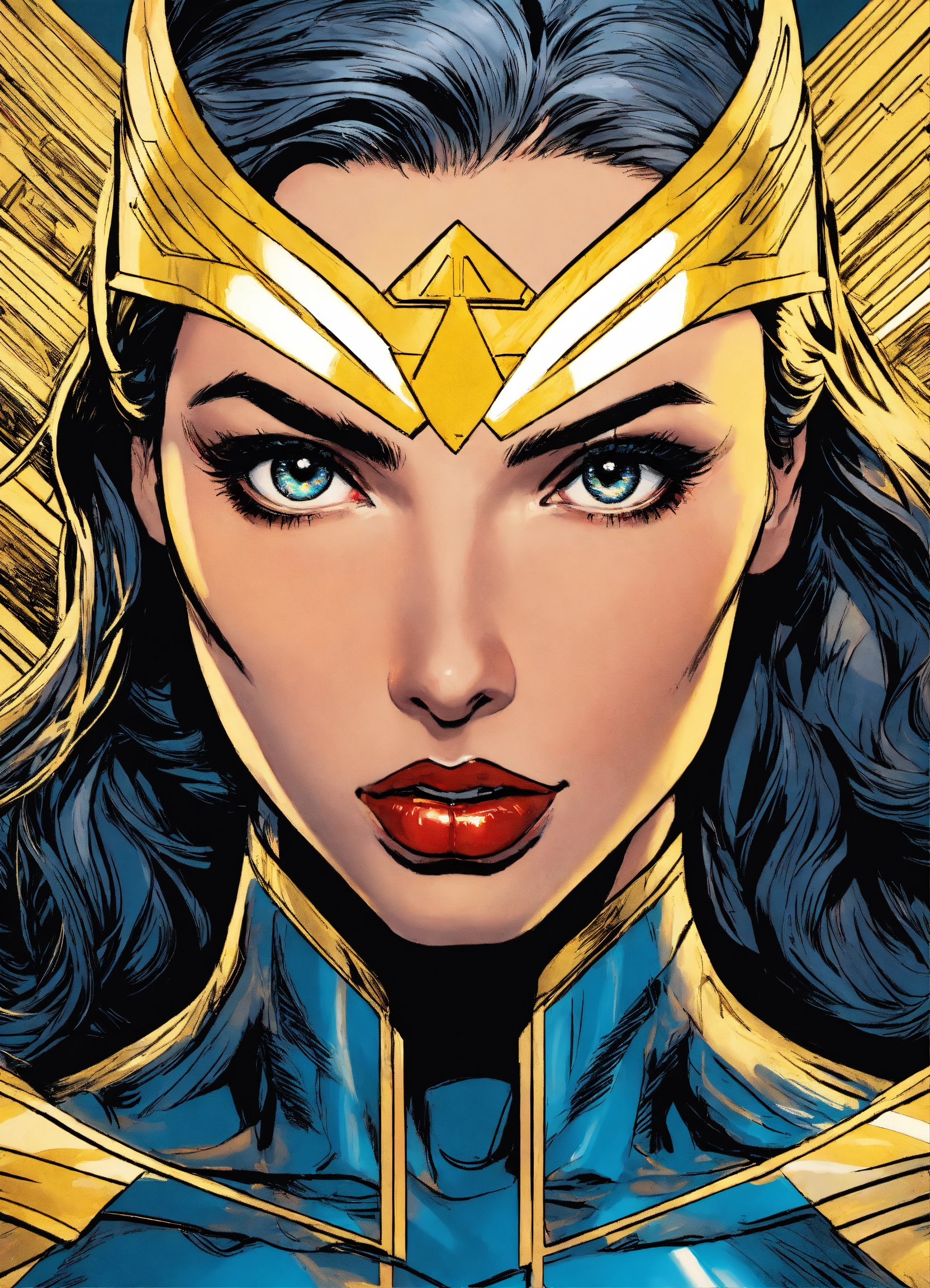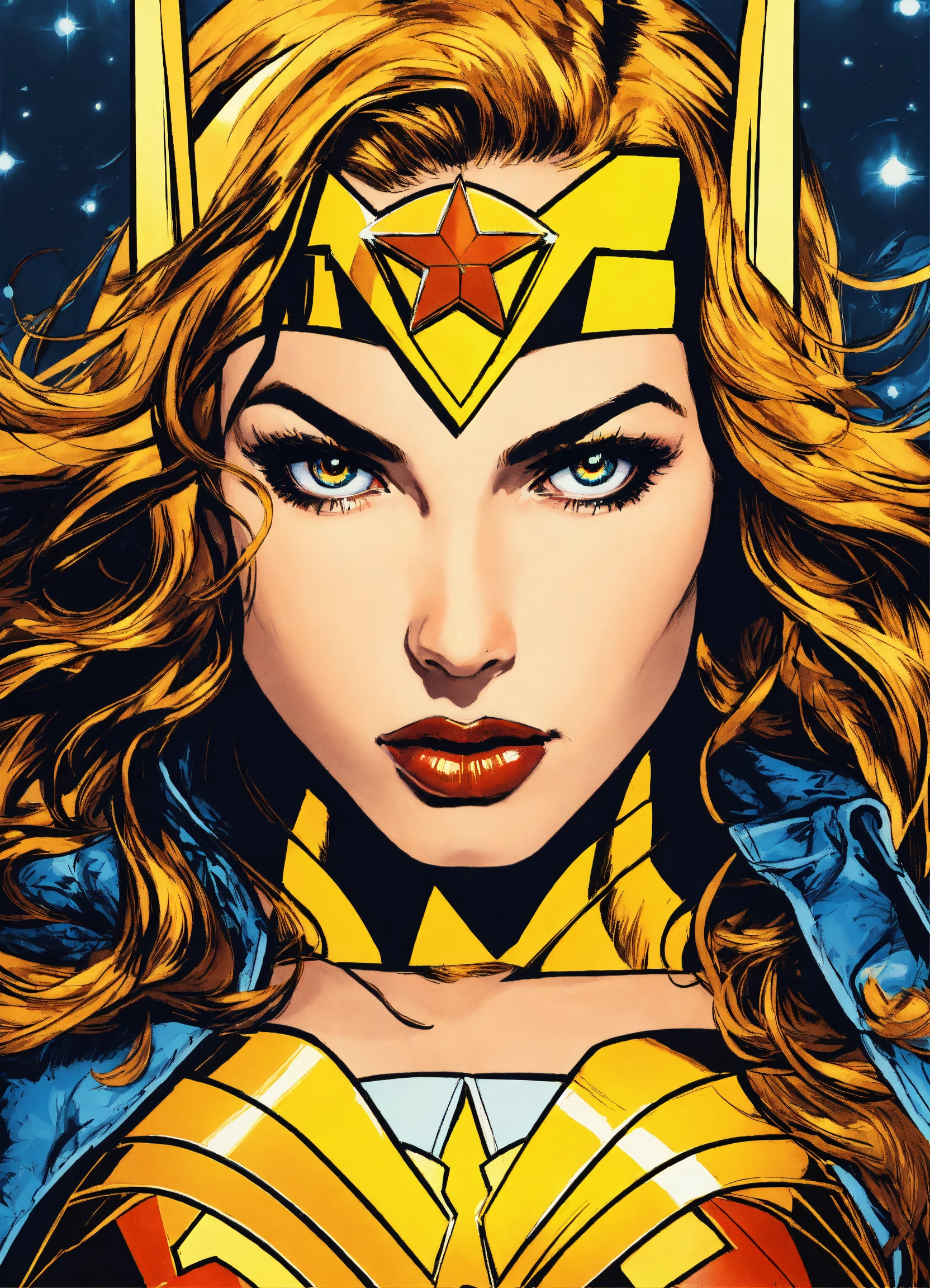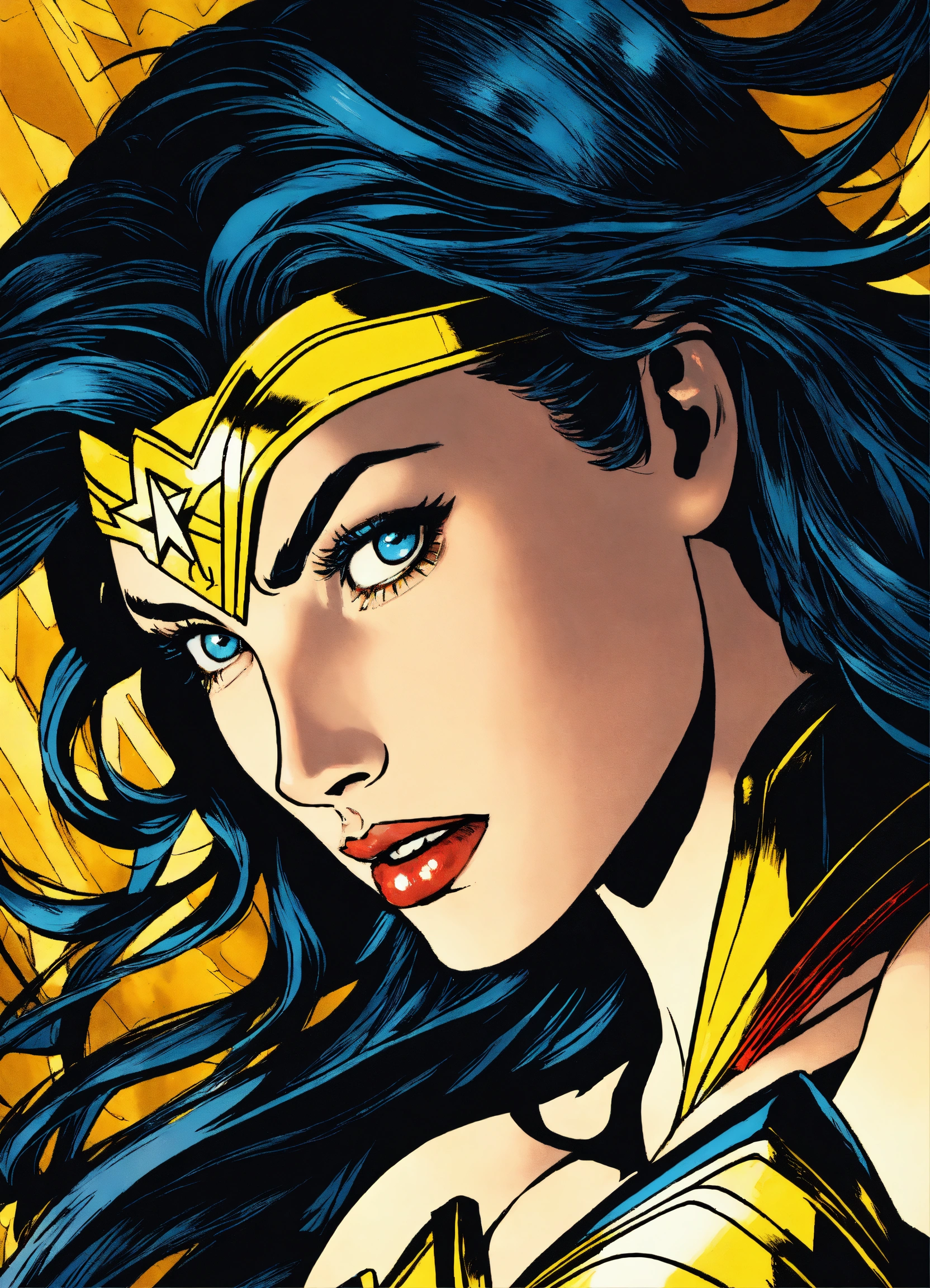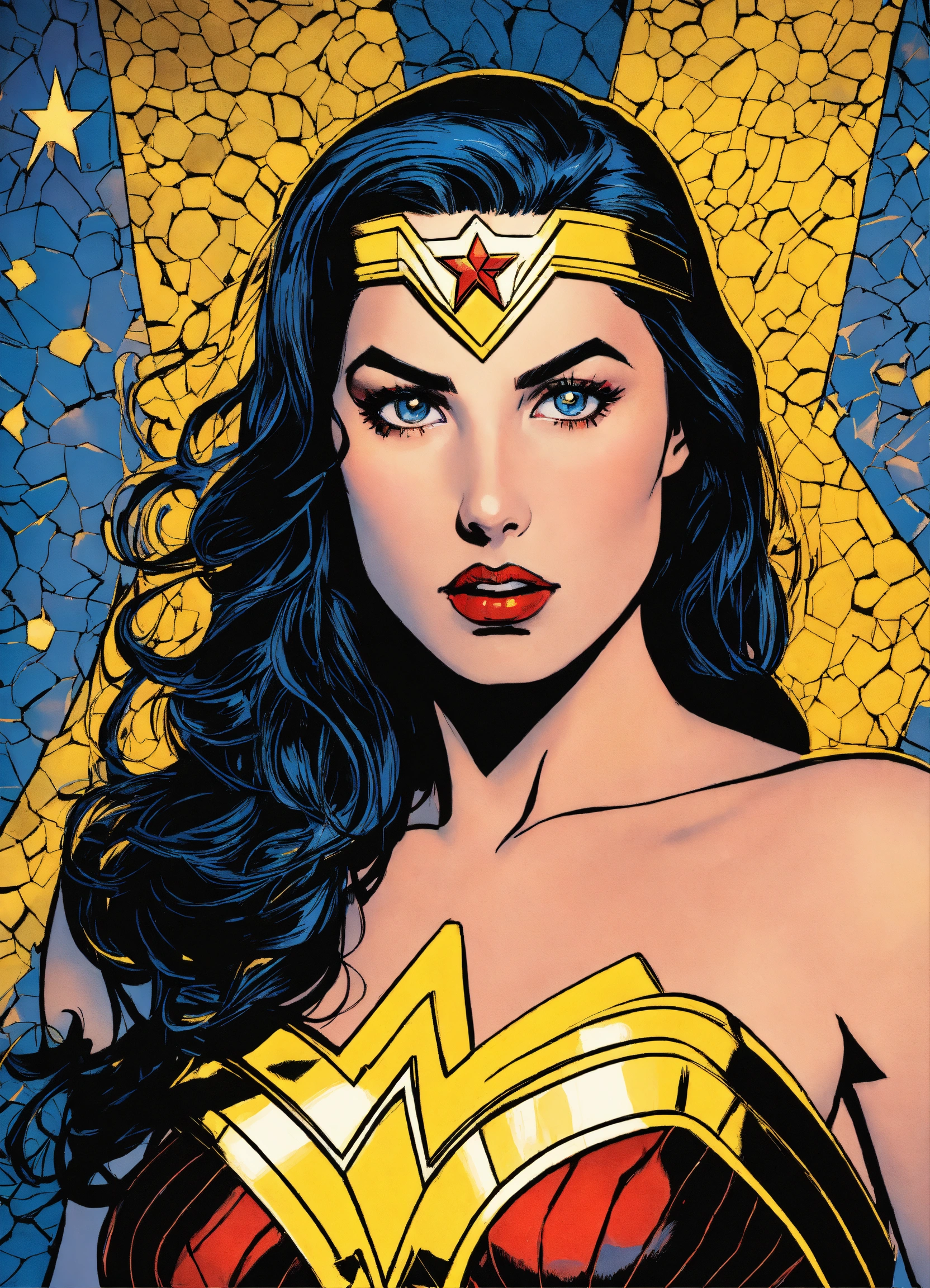 Surrealism, wonder woman, glowing golden eyes, concept art, sharp focus, intricate, highly detailed, smooth, soft glow of a nightlight, art by roy lichtenstein, comic book art style