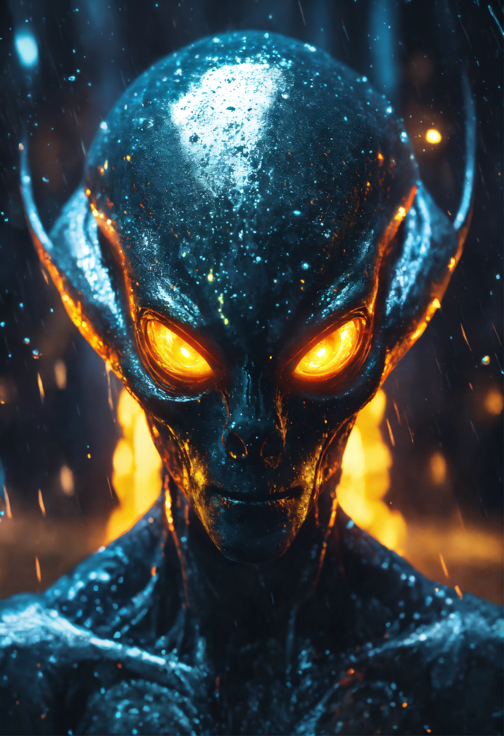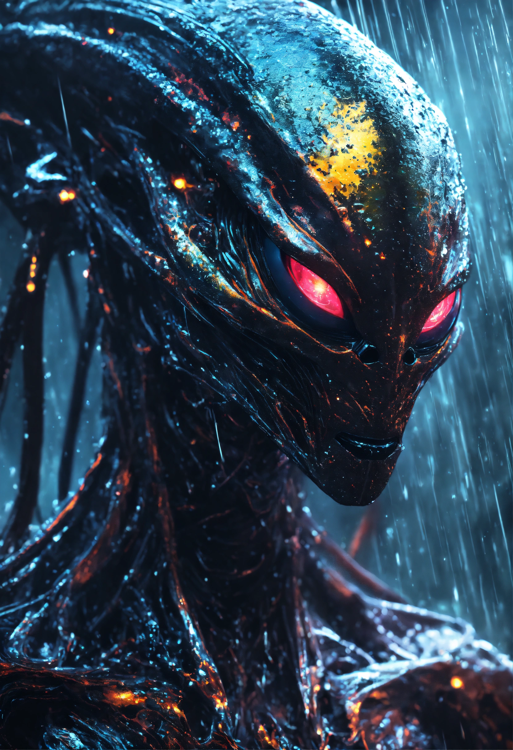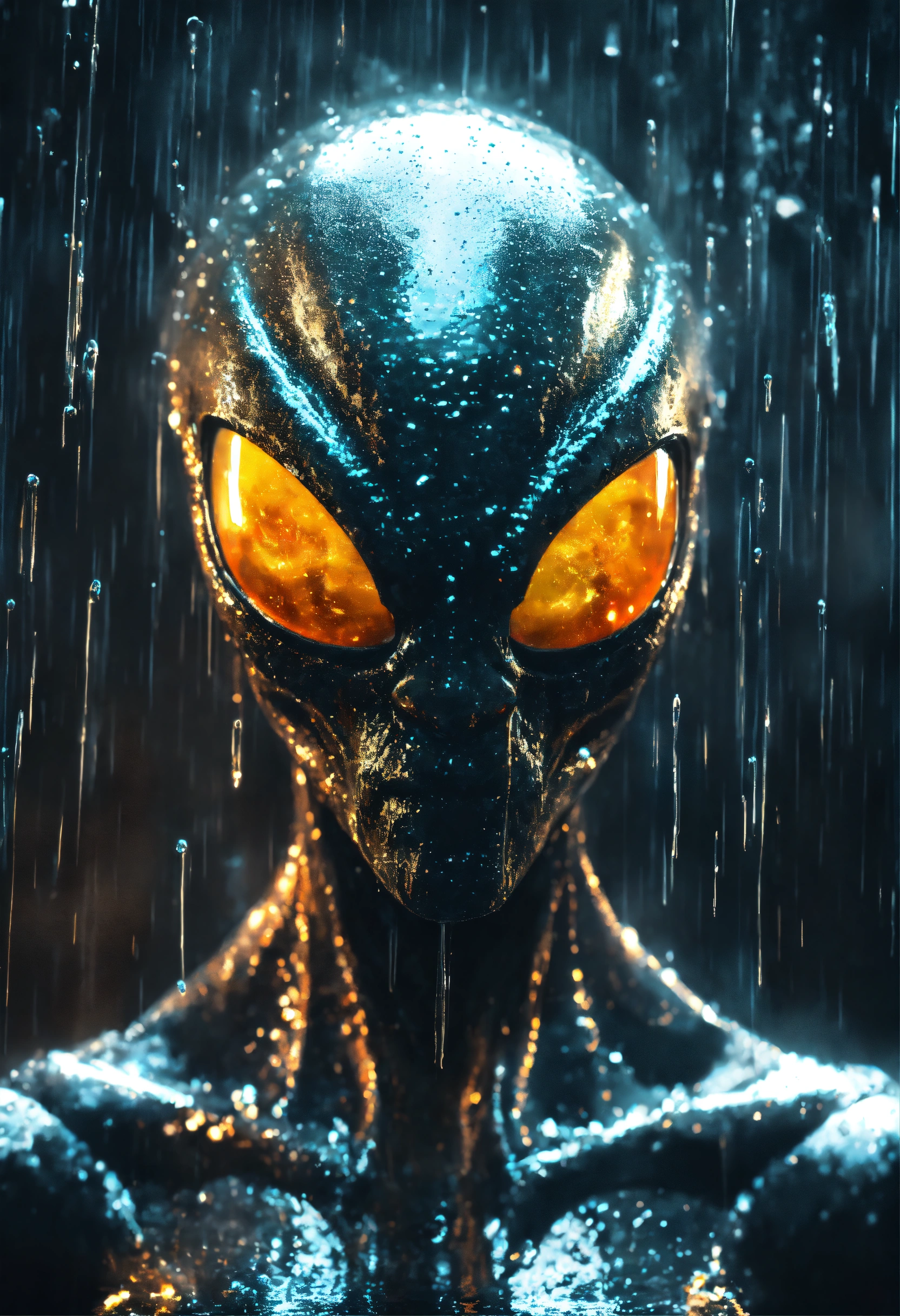 An menacing alien with glowing eyes filled with swirling galaxies, in the pouring rain, in the style of luminous liquid metal, ray tracing, raw character, 32k uhd, conceptual portraiture, wet - on - wet blending