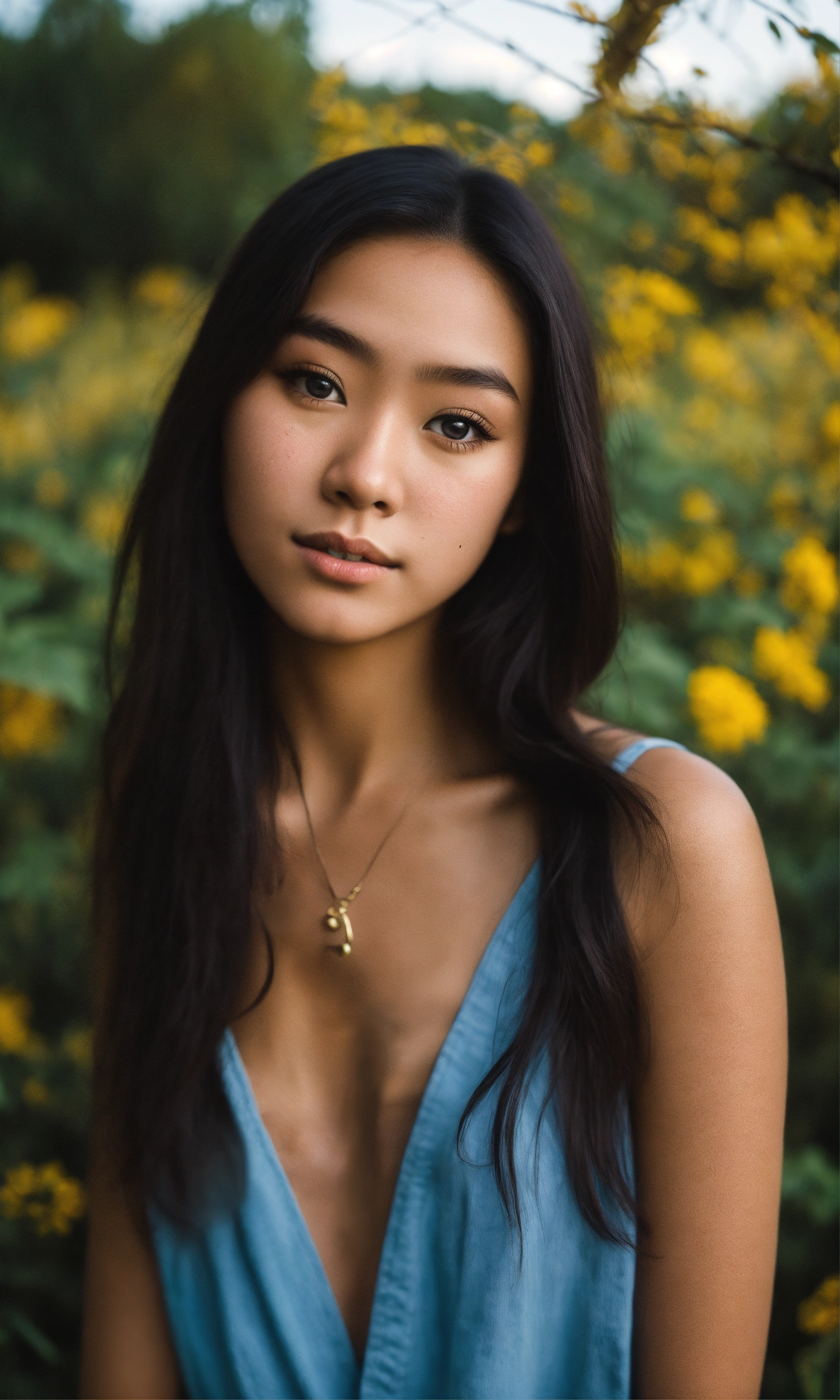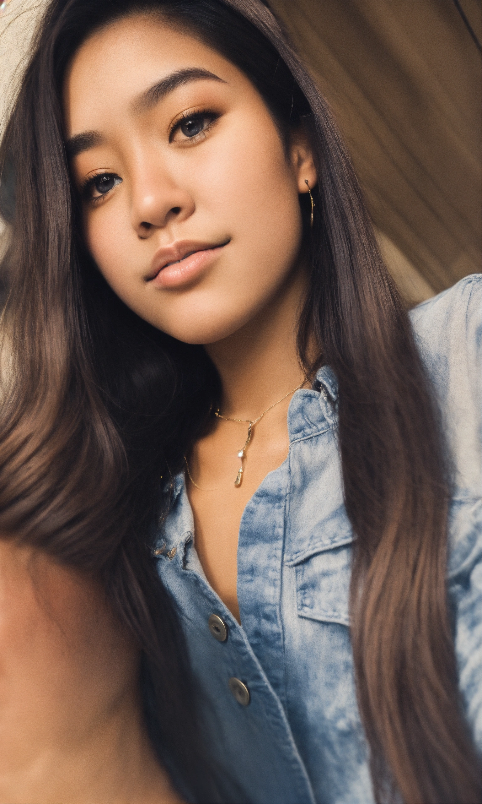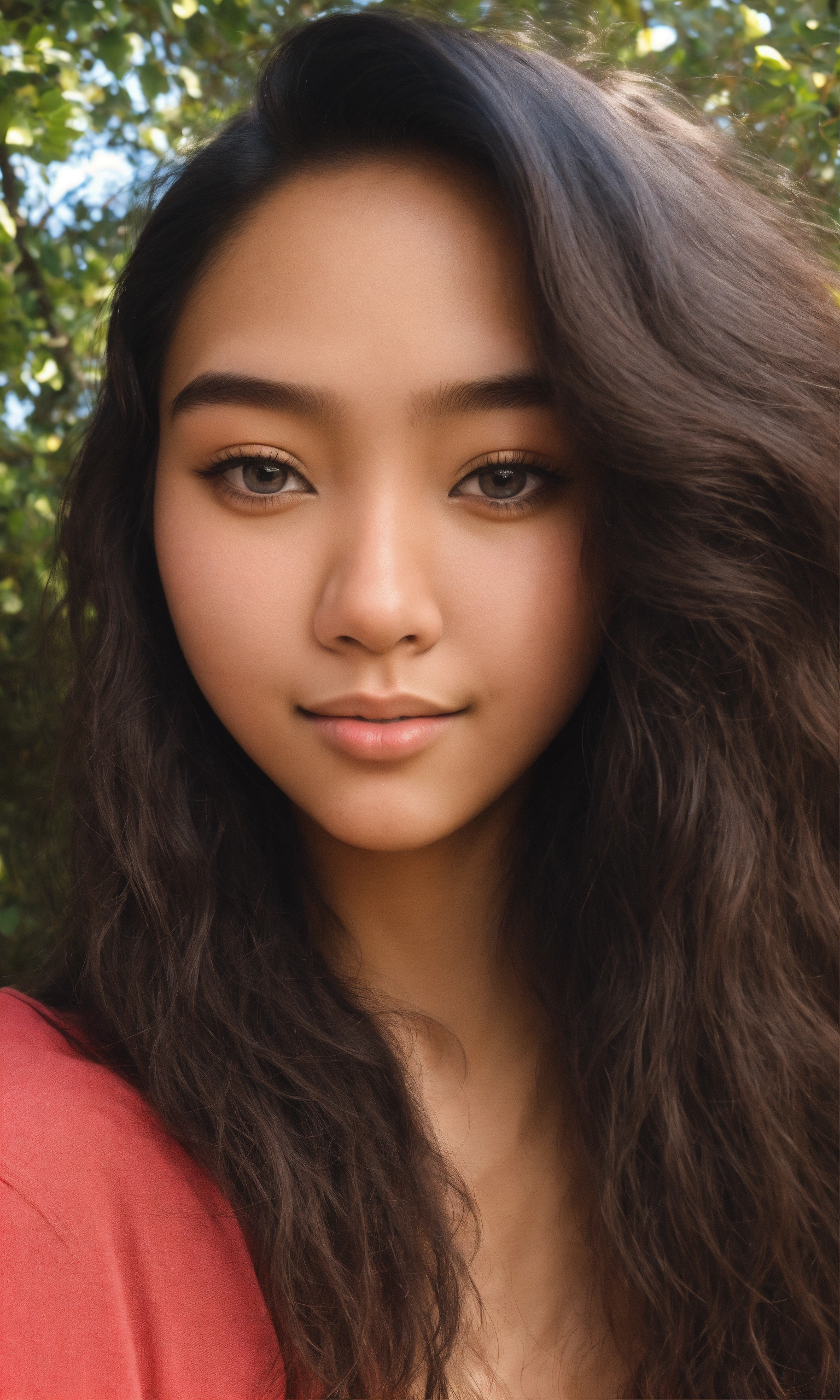 Create a selfie of a beautiful 18 year old girl of mixed black and japanese descent zoomed out