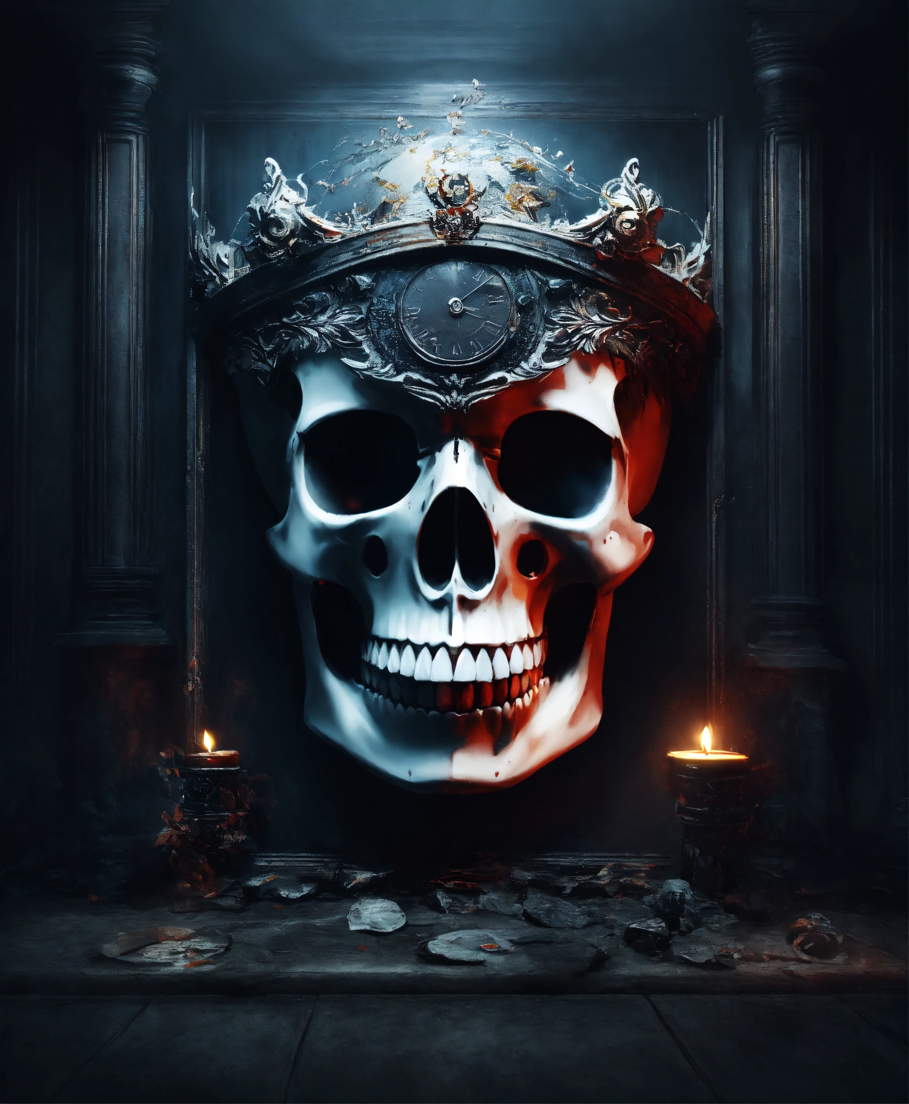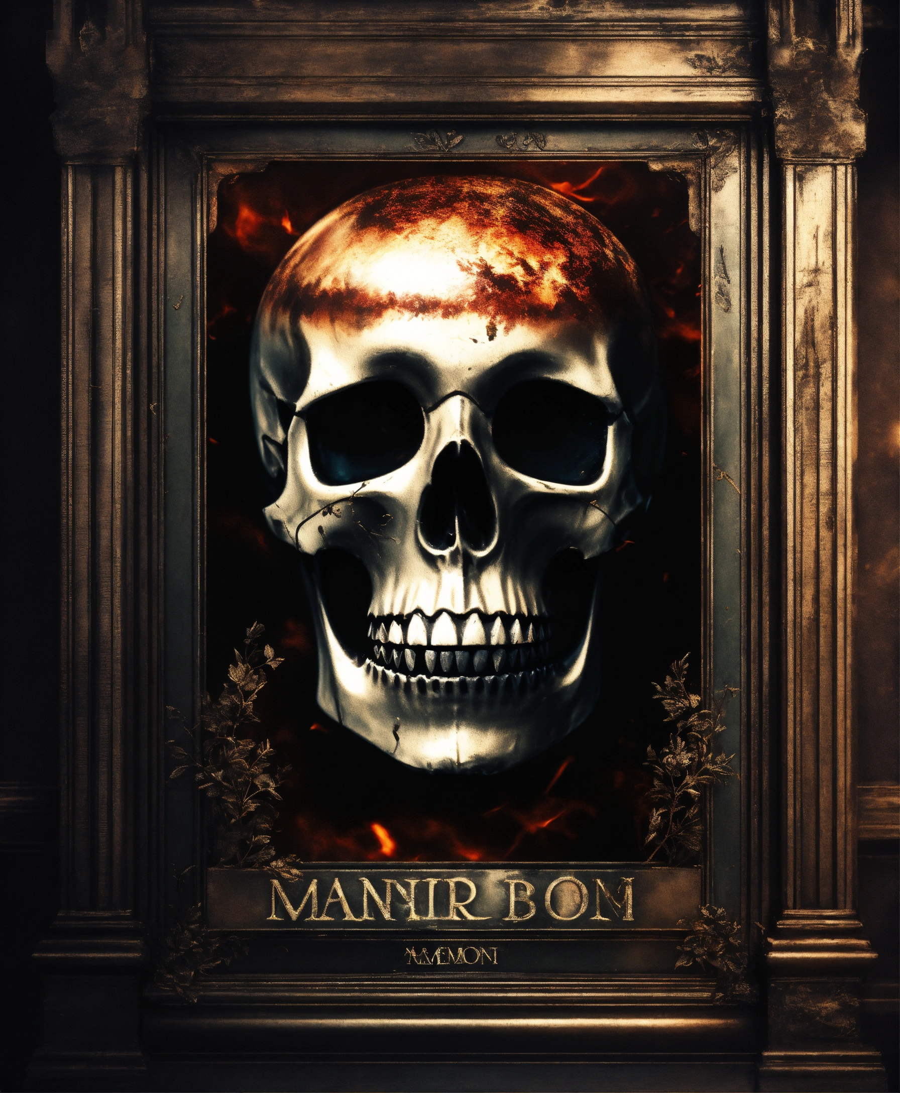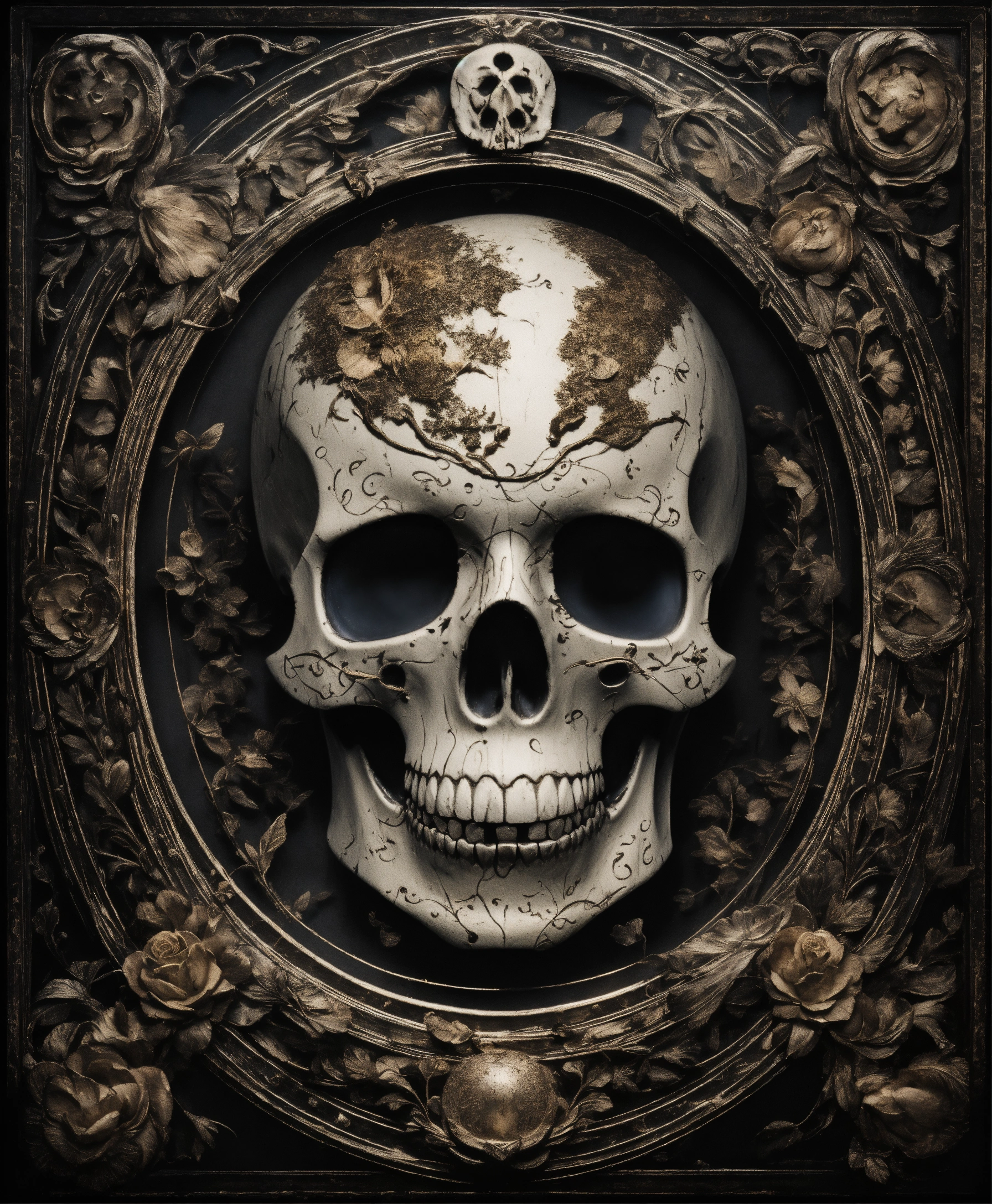 It represents absolute darkness, motion blur effect on the borders, add memento mori text to the image as a title, use 8k