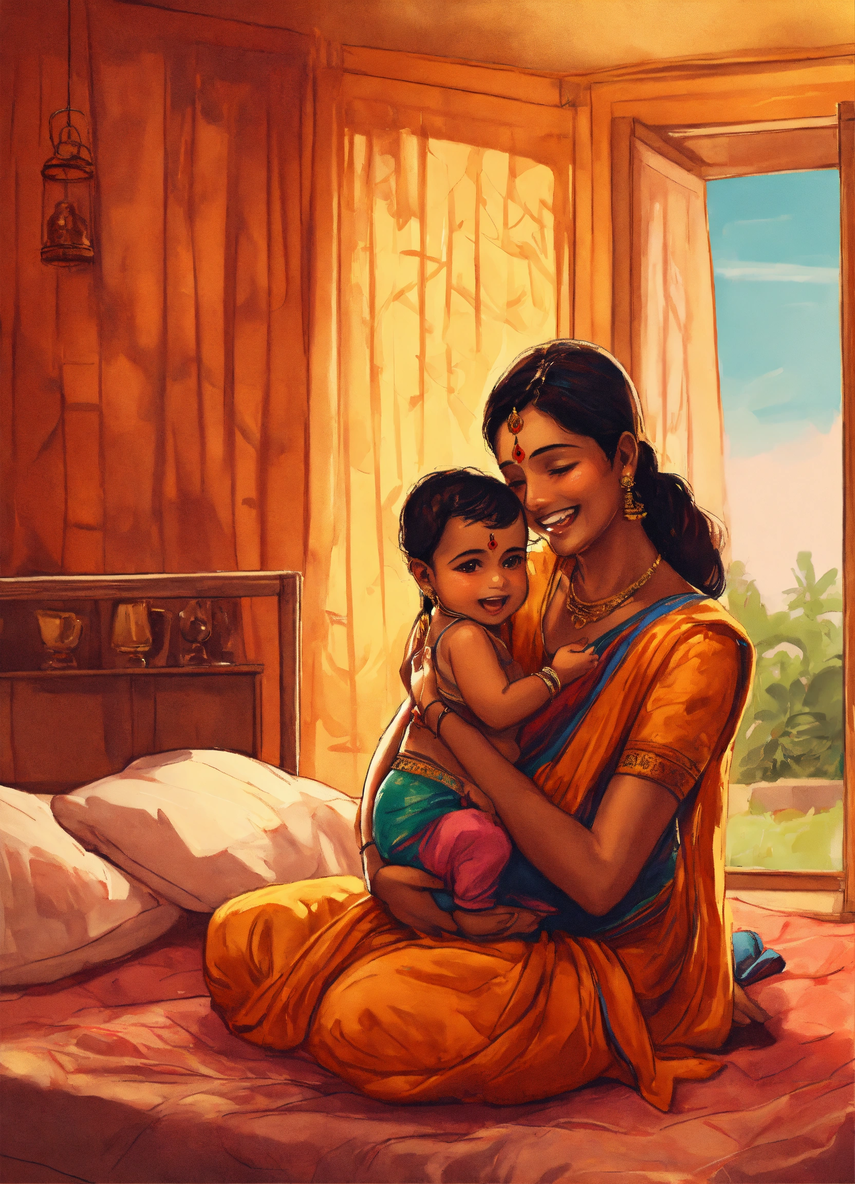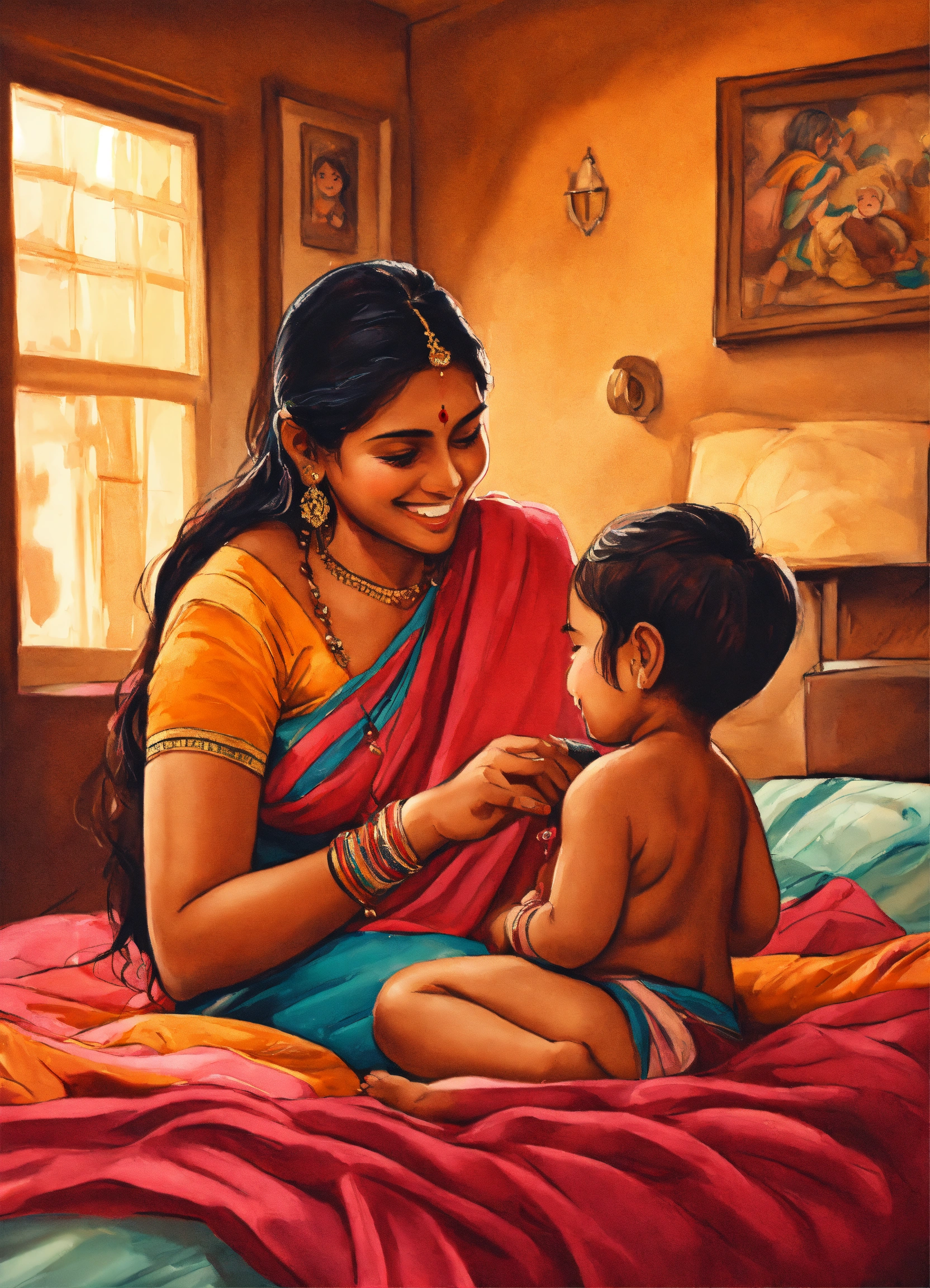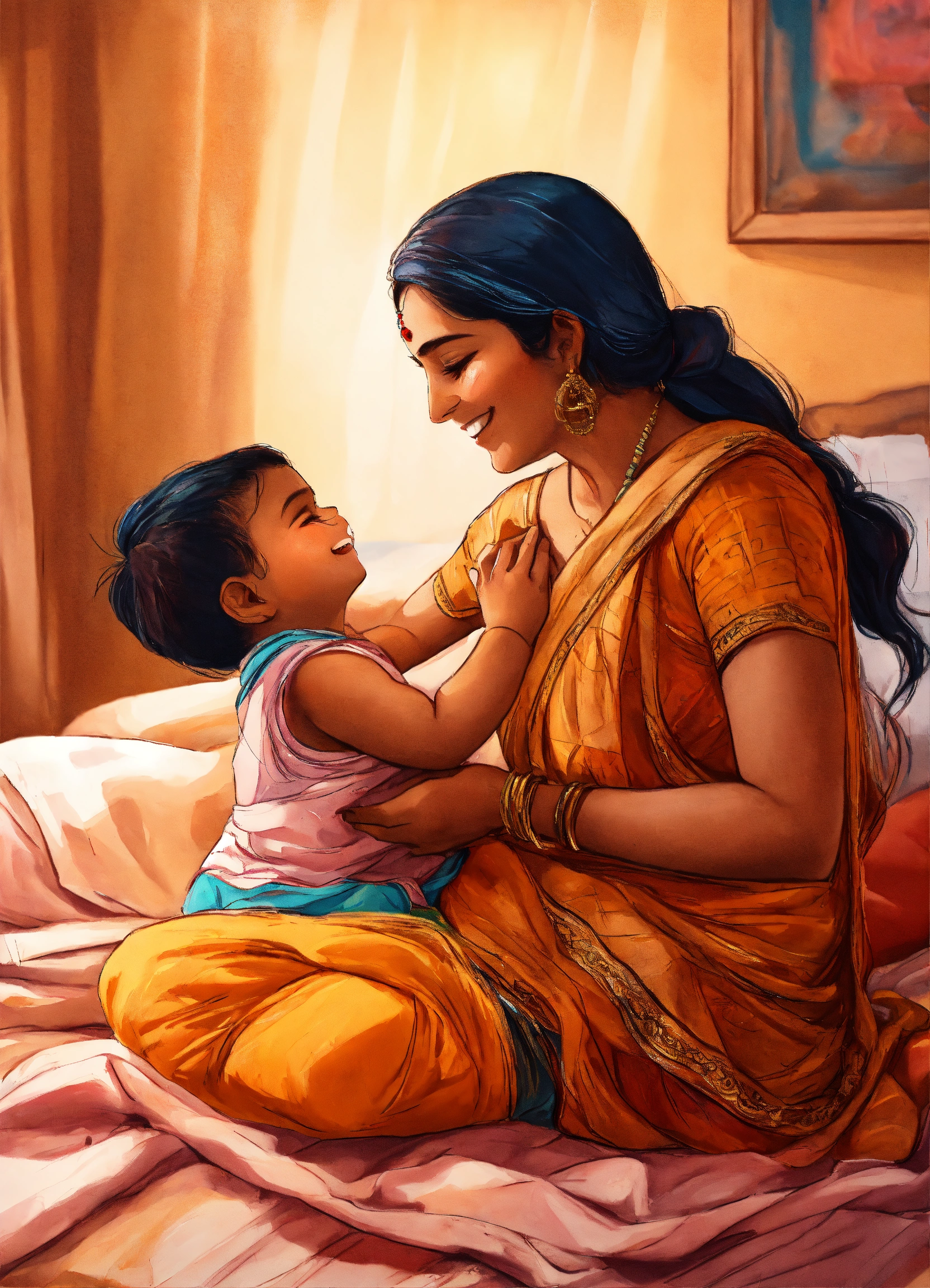 A hand drawn painting of an indian mother playing with her baby, the baby is on the bed, smiling, playing, inside the house, 8k, sharp, detailed, vibrant, vivid