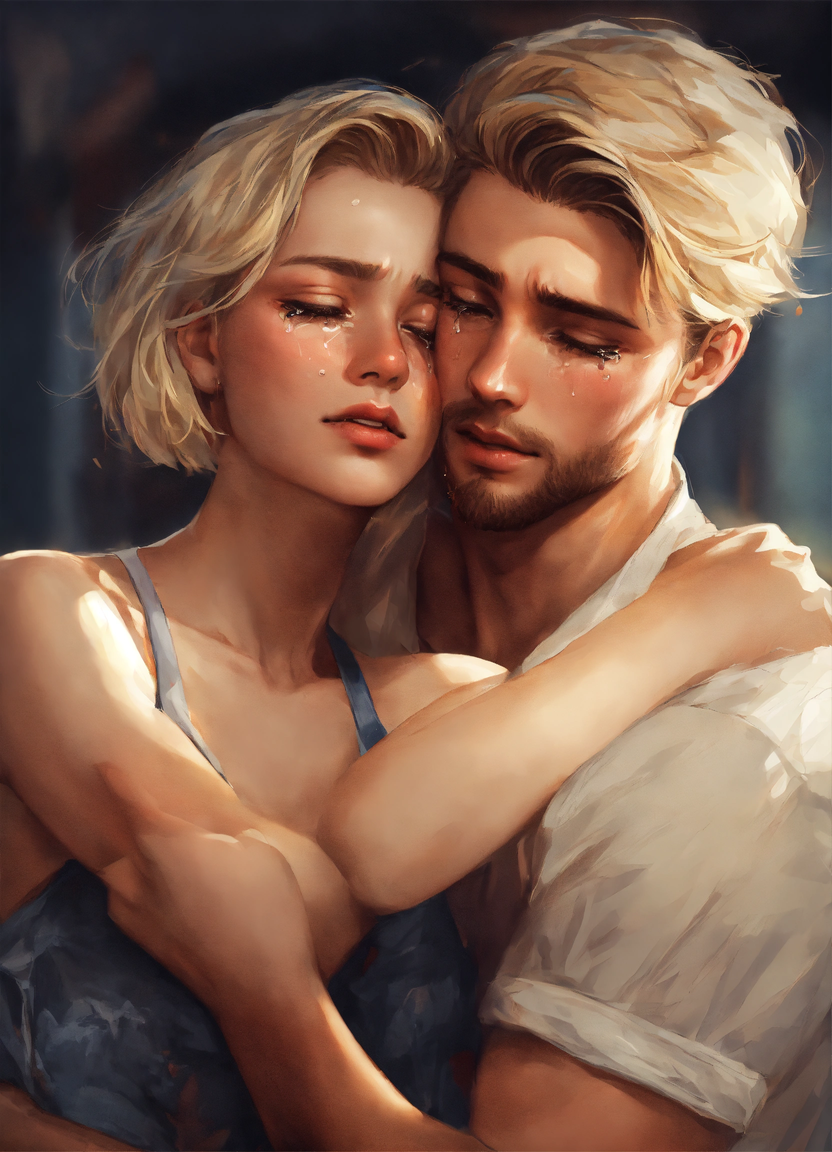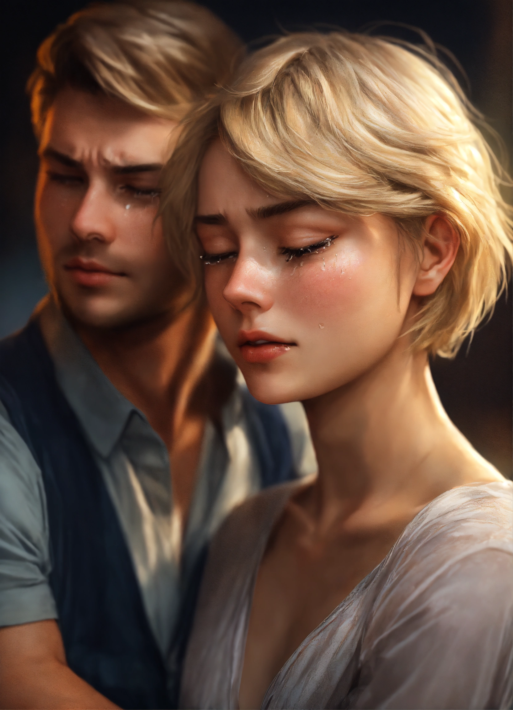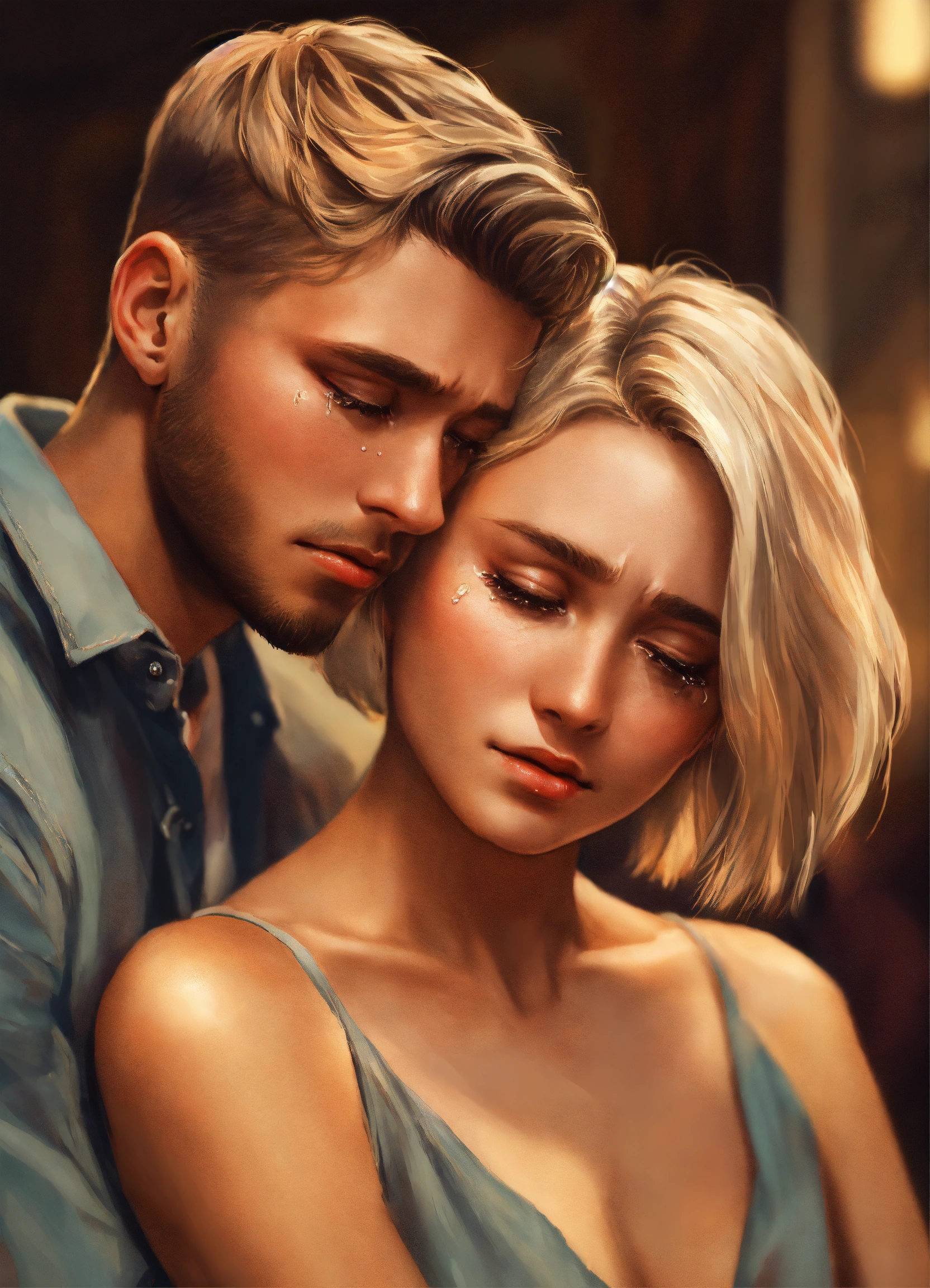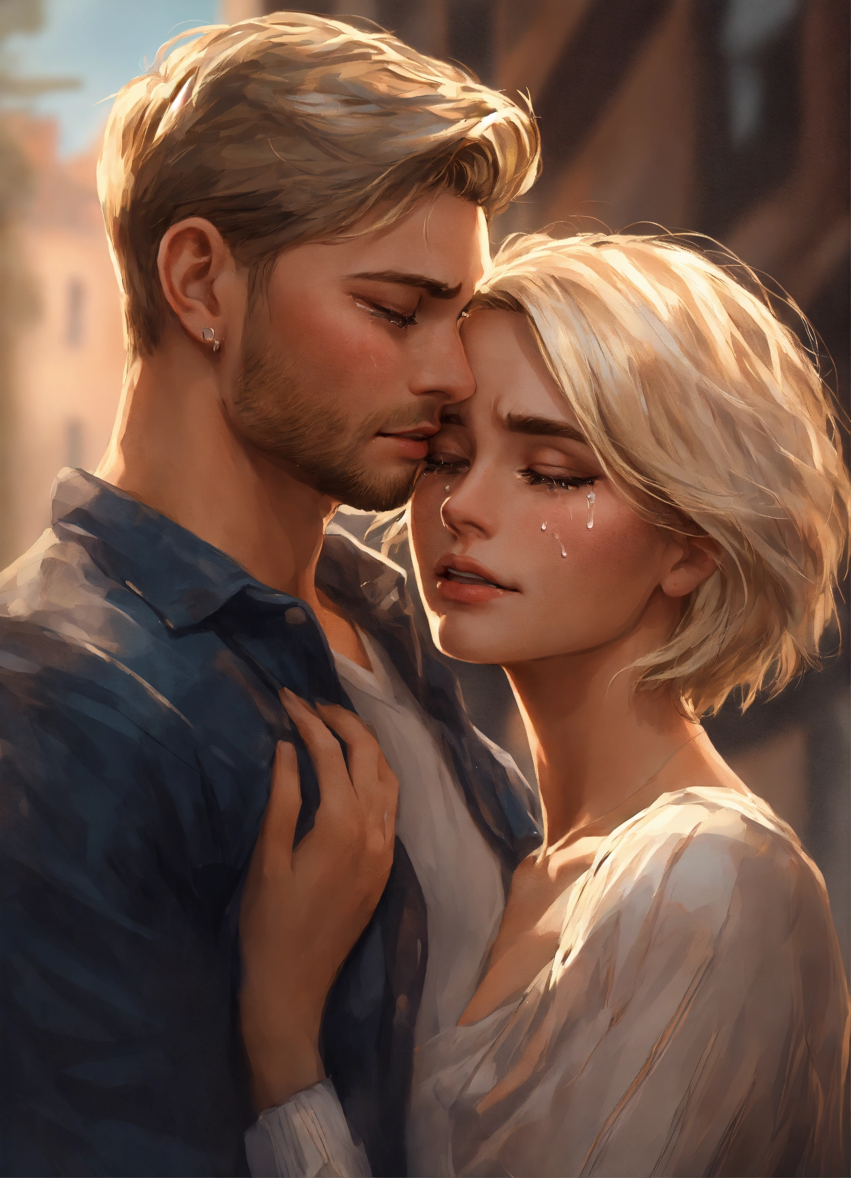 A beautiful blonde girl with short hair is crying, and a strict young handsome man hugs her from behind by the shoulders, clear facial features, detailed image, realistic, real, realistic facial features, realistic photography
