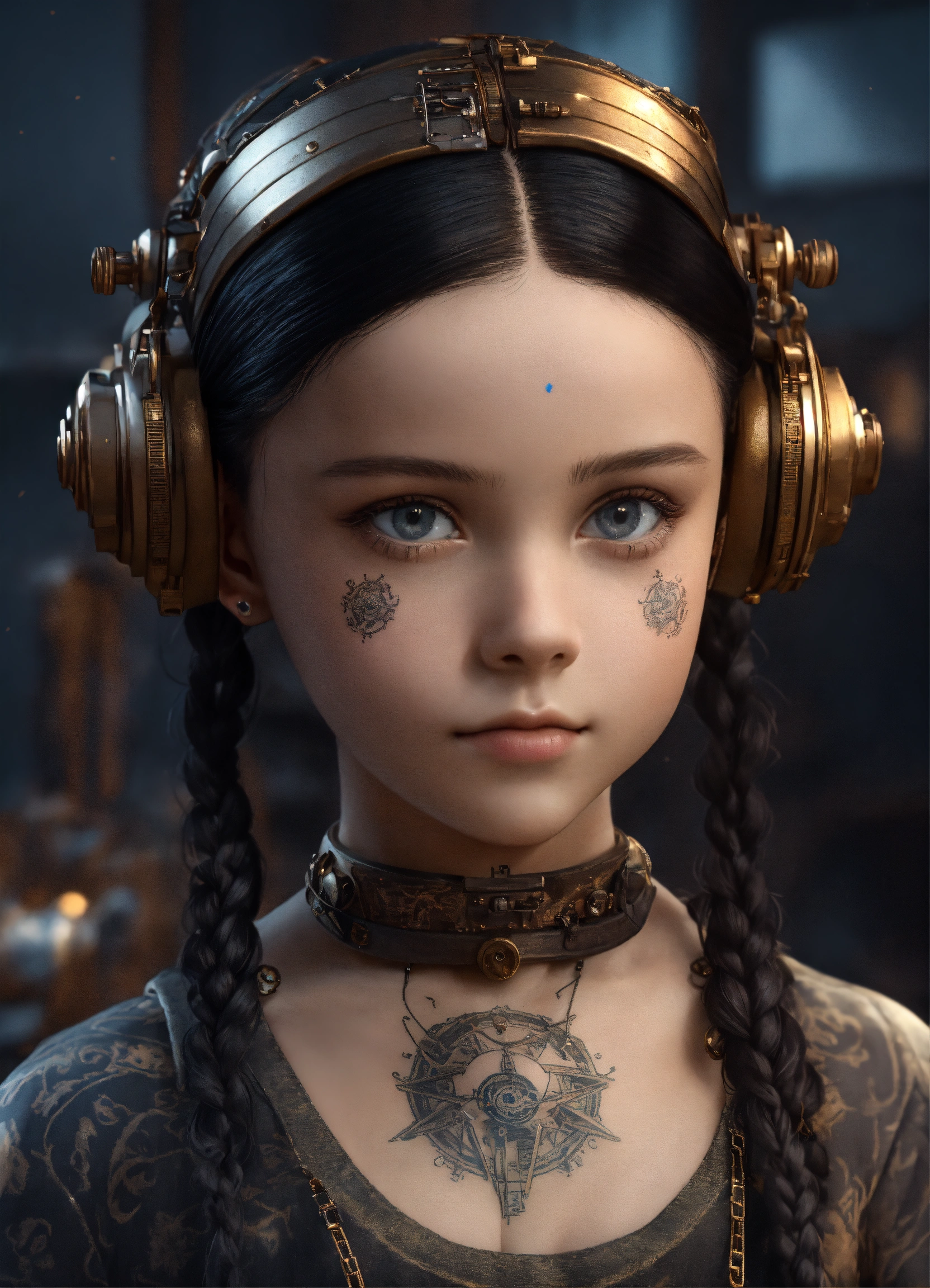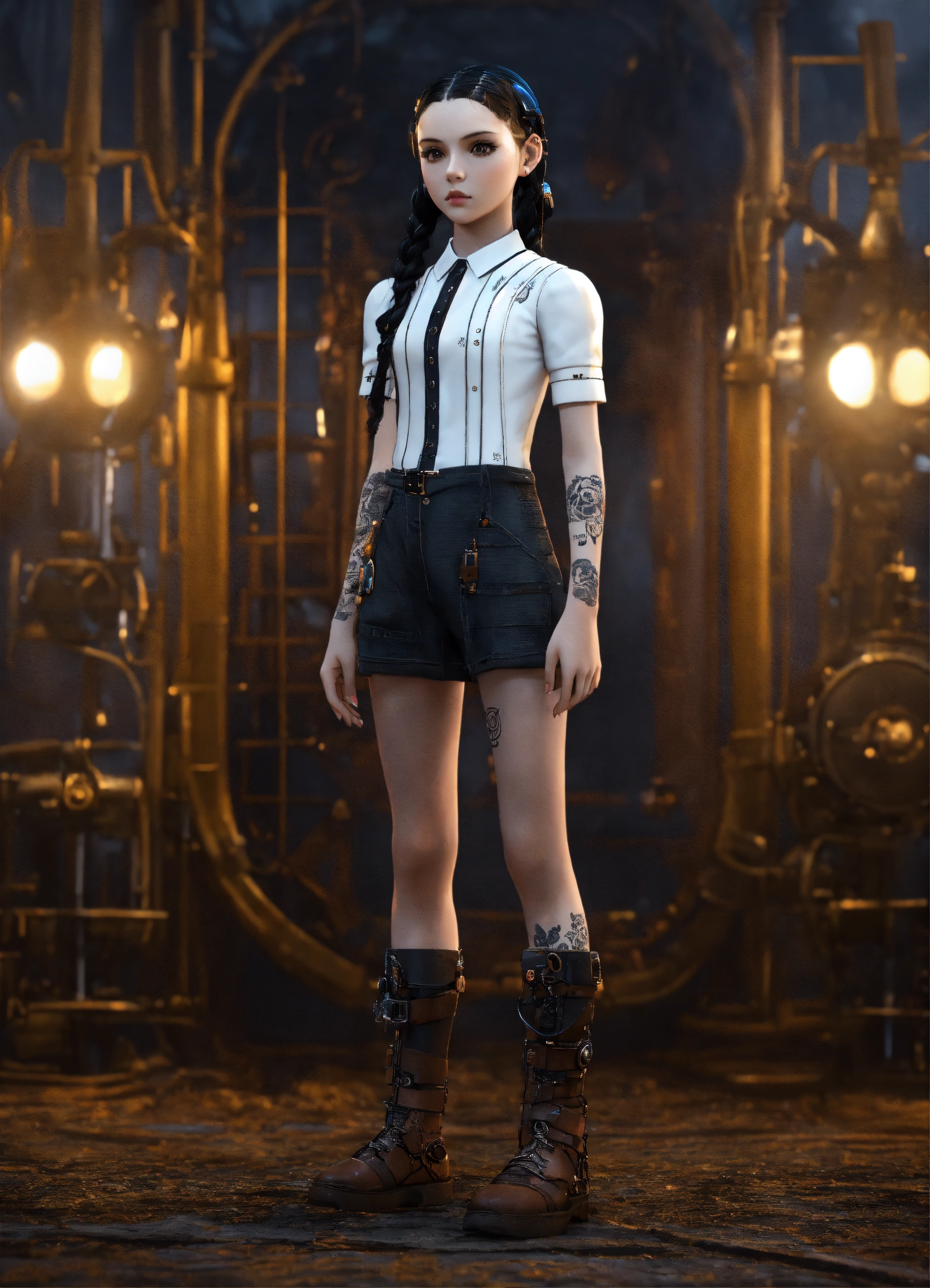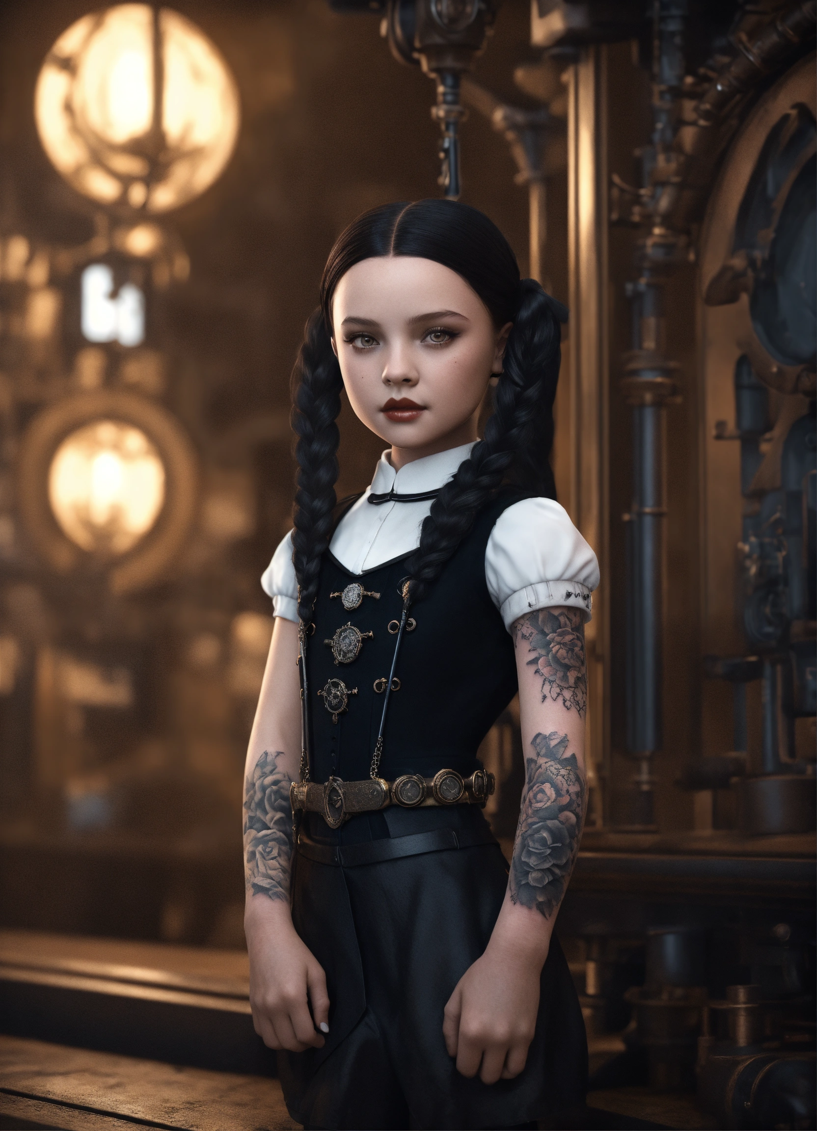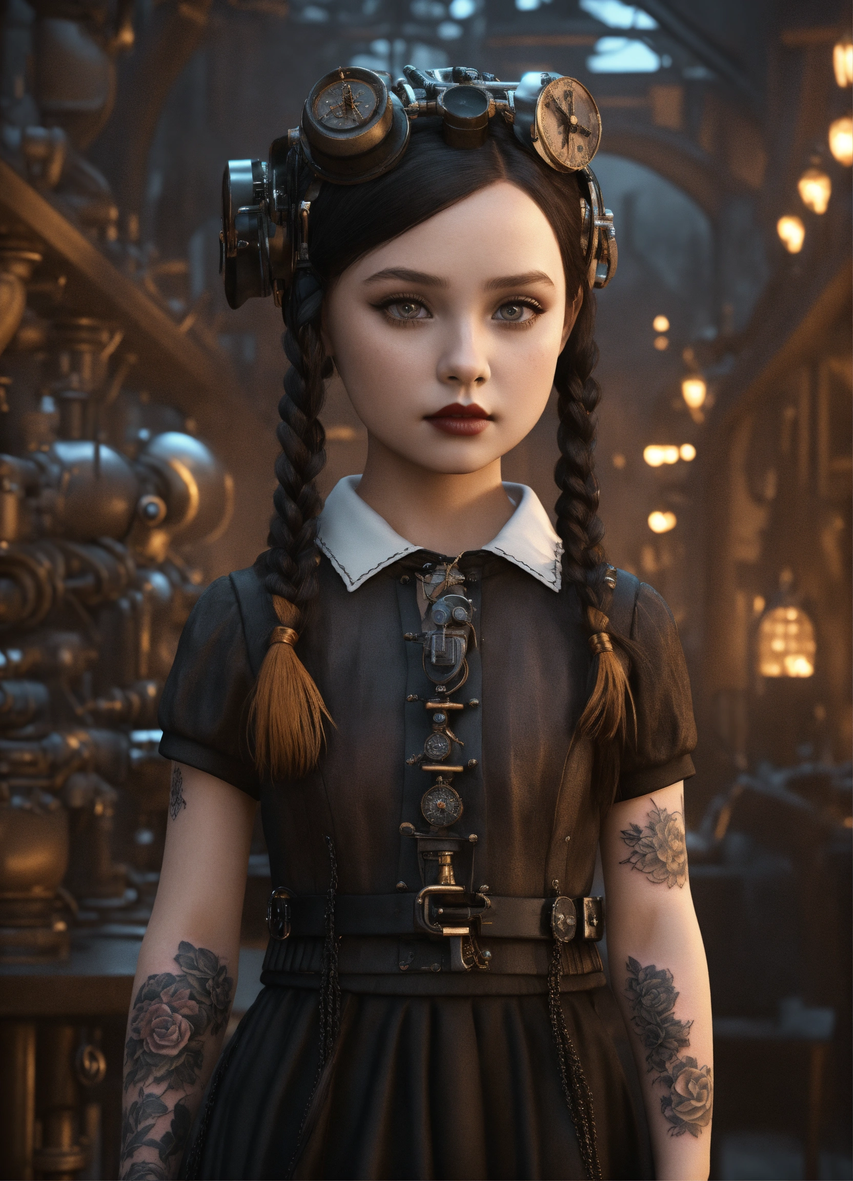 I want the same appearance, same hairstyle and same angle of the girl and the entire body within the image, little girl, standing in the center of the image, wednesday addams wearing tattooed steampunk cybernetic appearance realistic 3d rendering --q 5 --ar 11