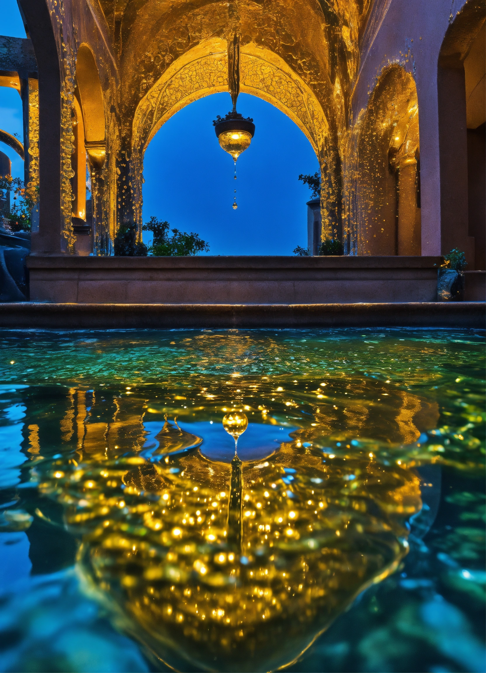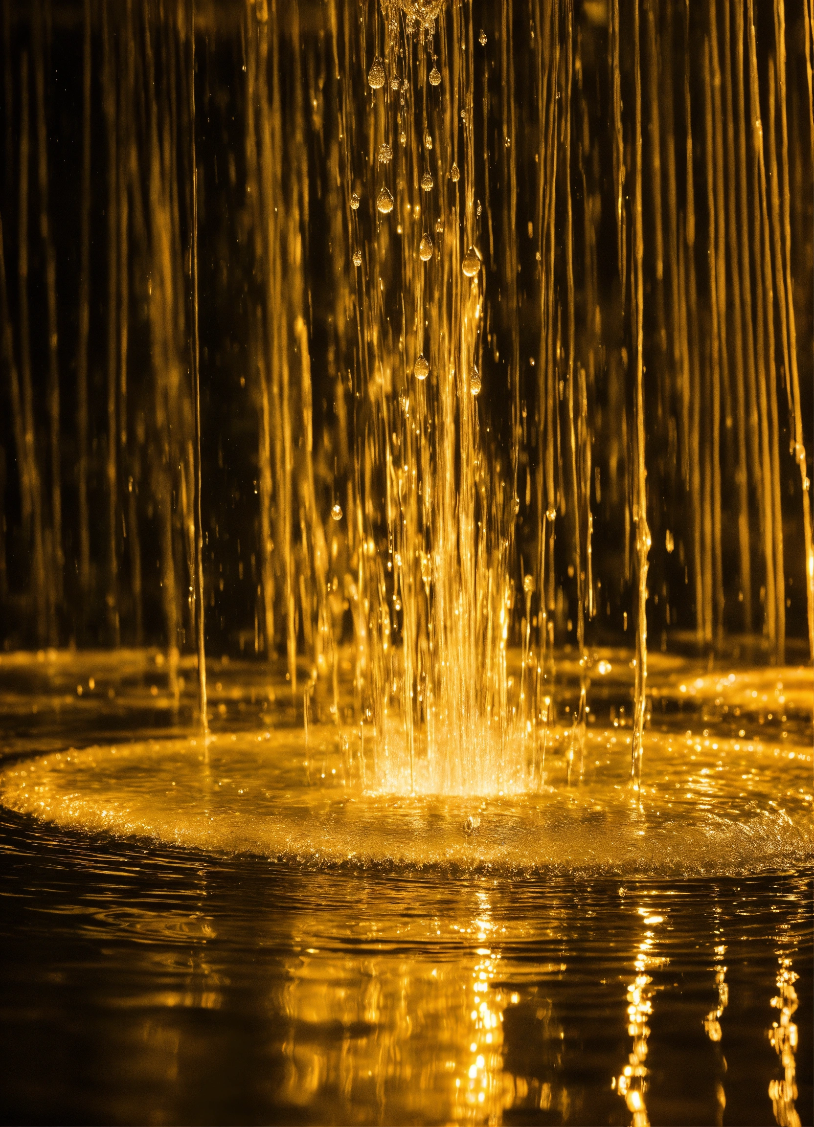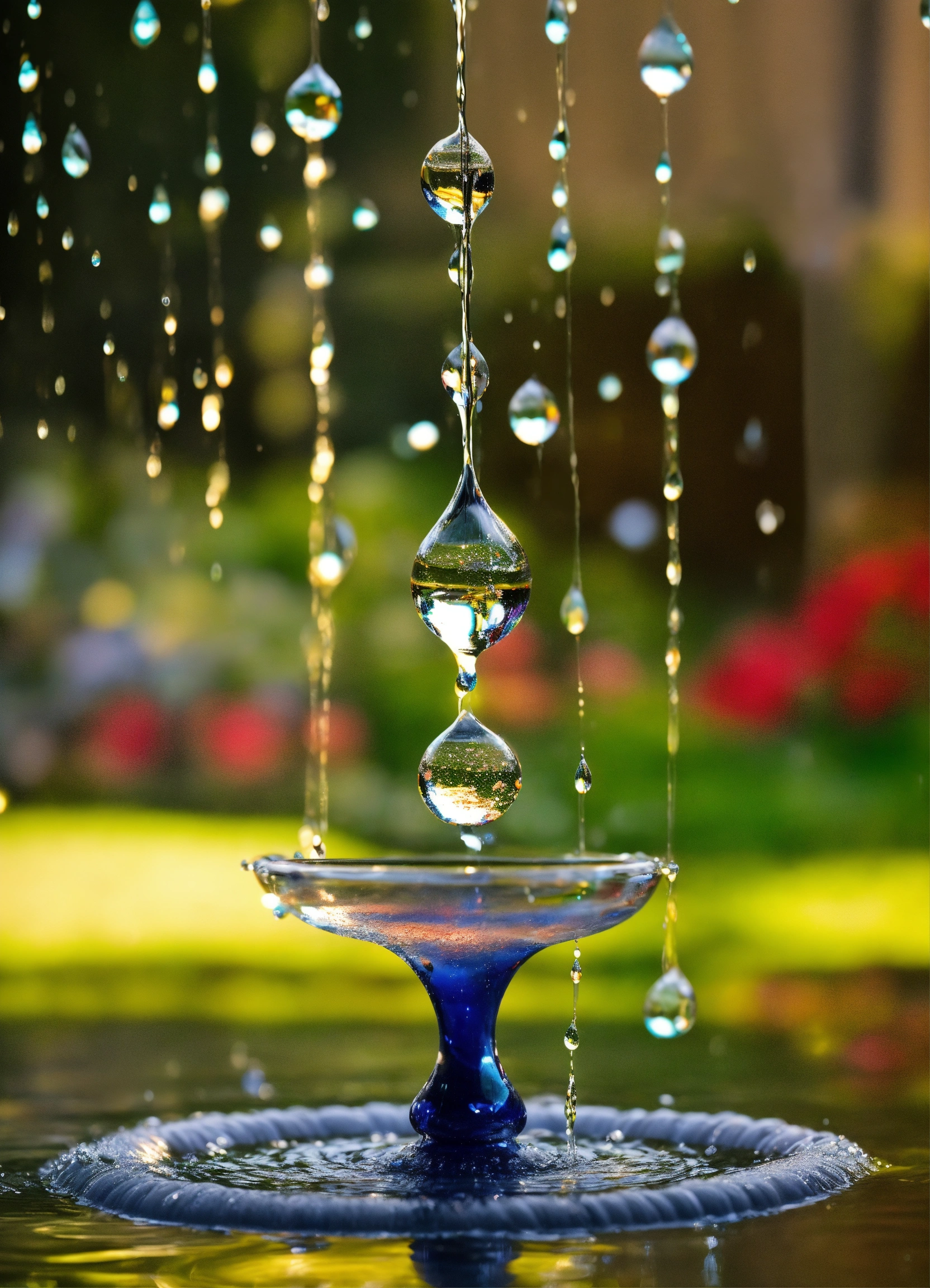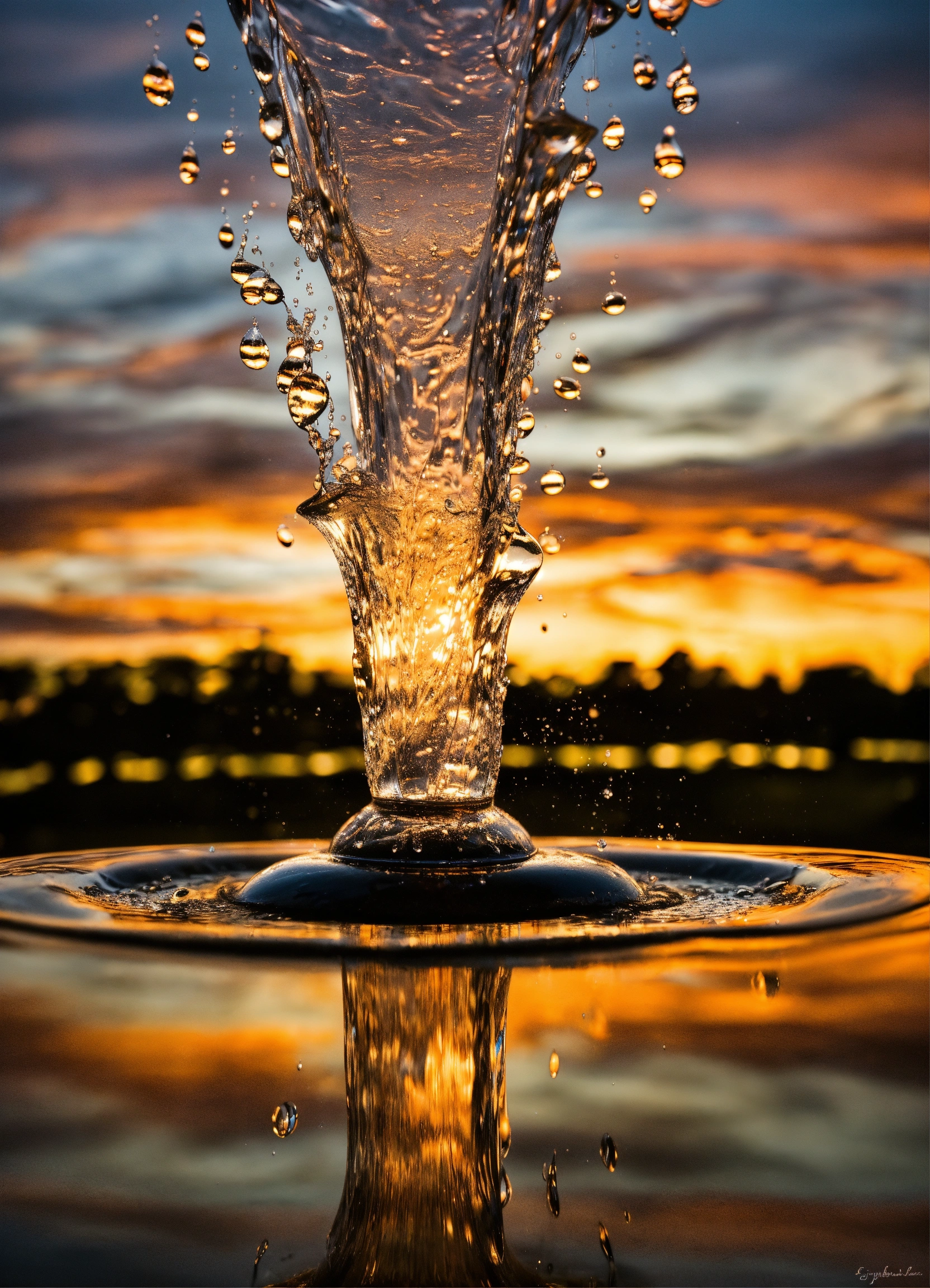 Drop of water resurface from under the water to the surface divides into multiple smaller drops above the water's surface these drops engage in a mesmerizing dance of swirling water fountain, synchronized movements, illustrating the beauty and complexity of life's continuous renewal