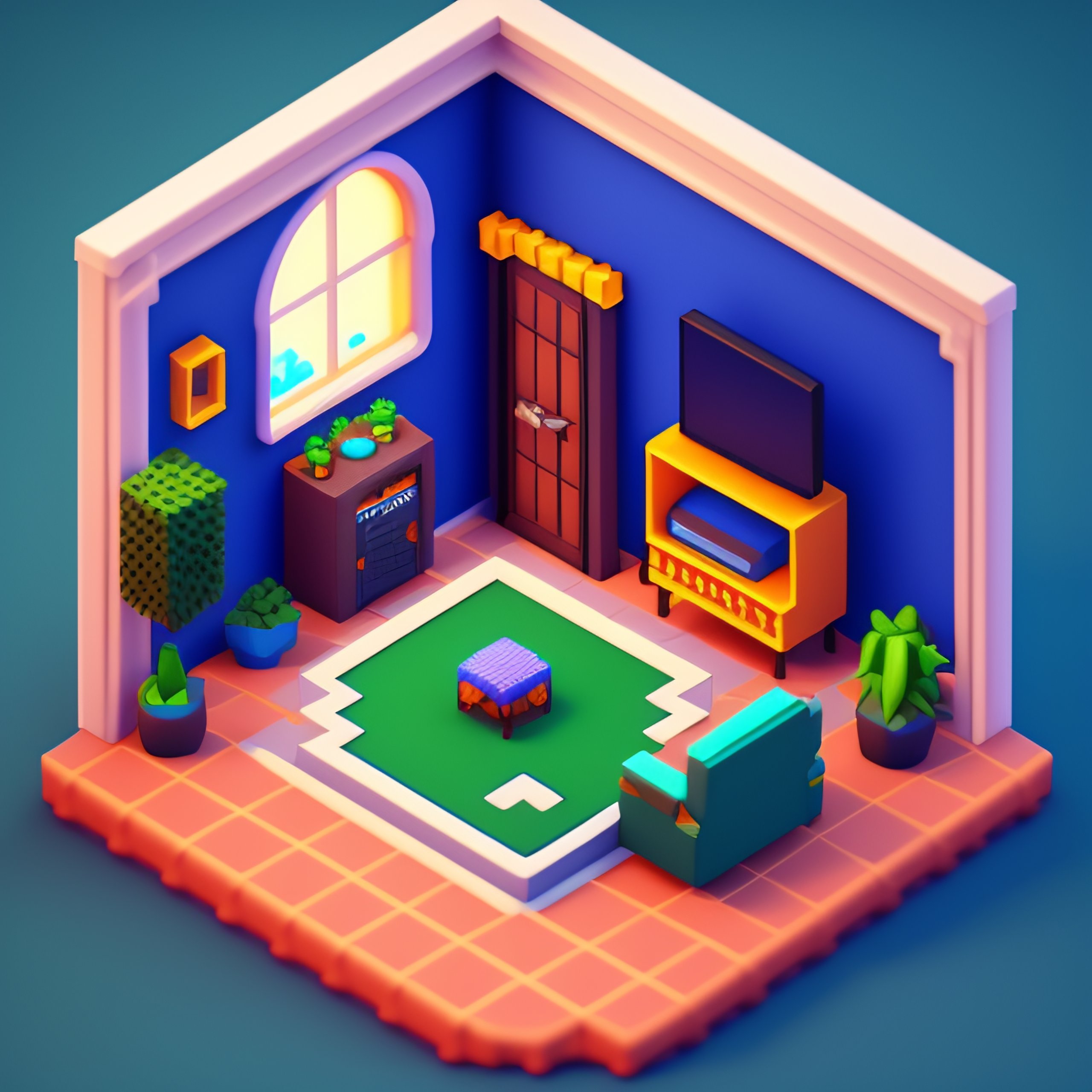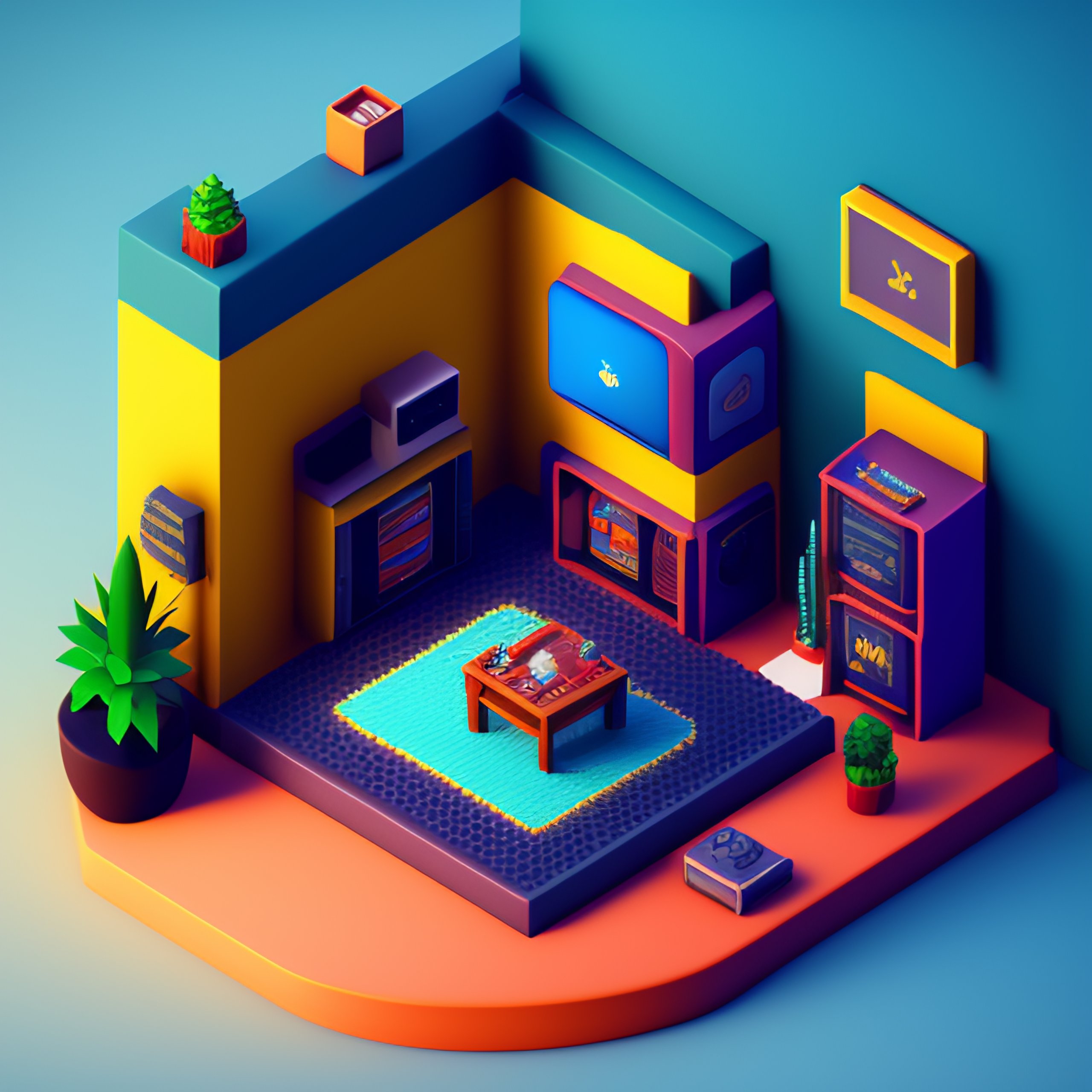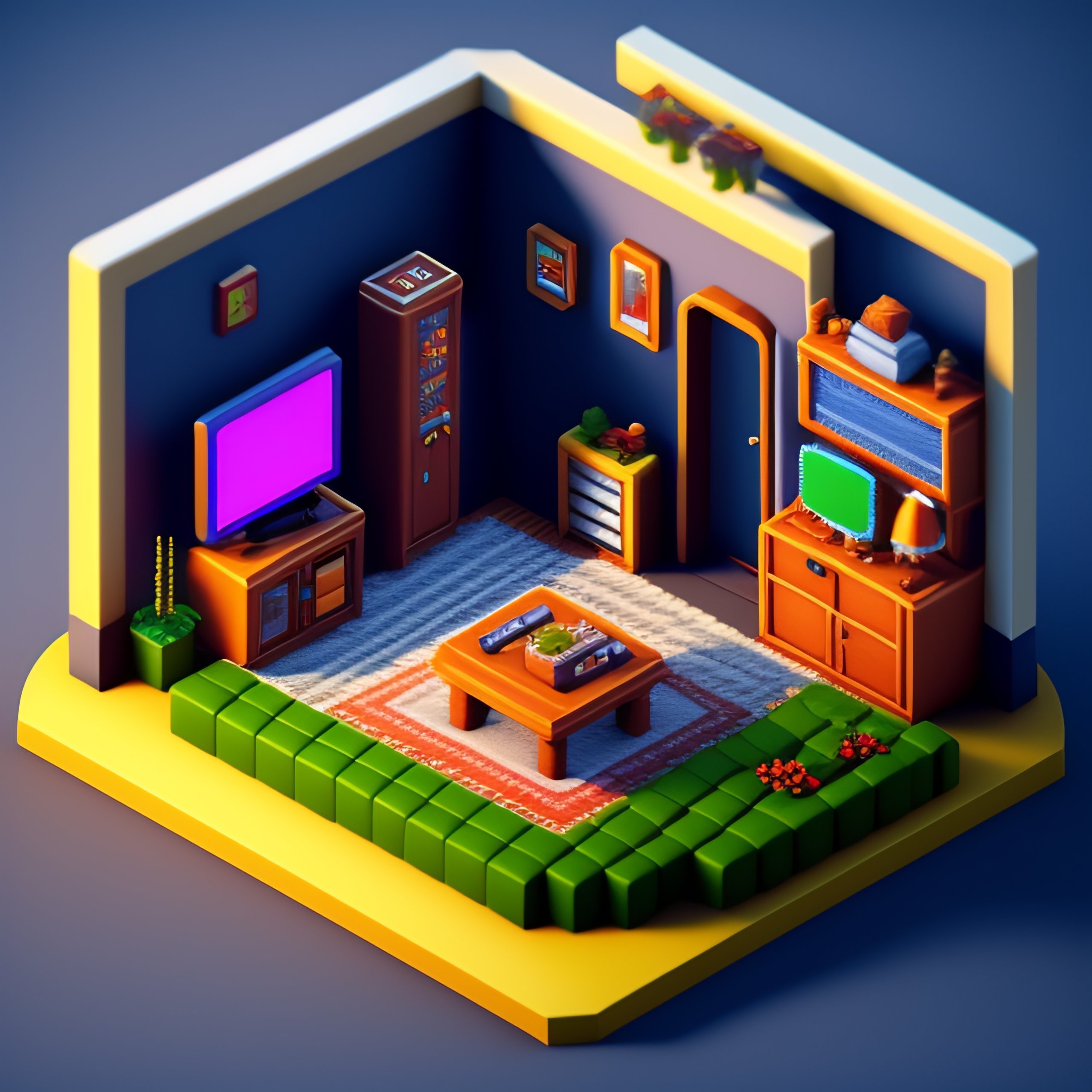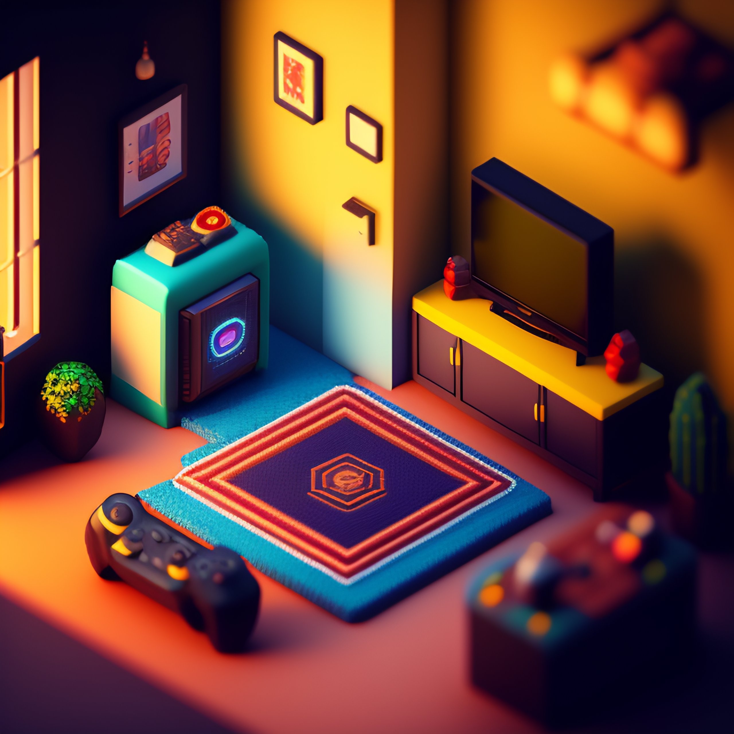 Detailed isometric gaming room, pixel art, unreal engine voxel render, video games, very cozy, nostalgia, boy in room in front of tv, dog running, c4d render