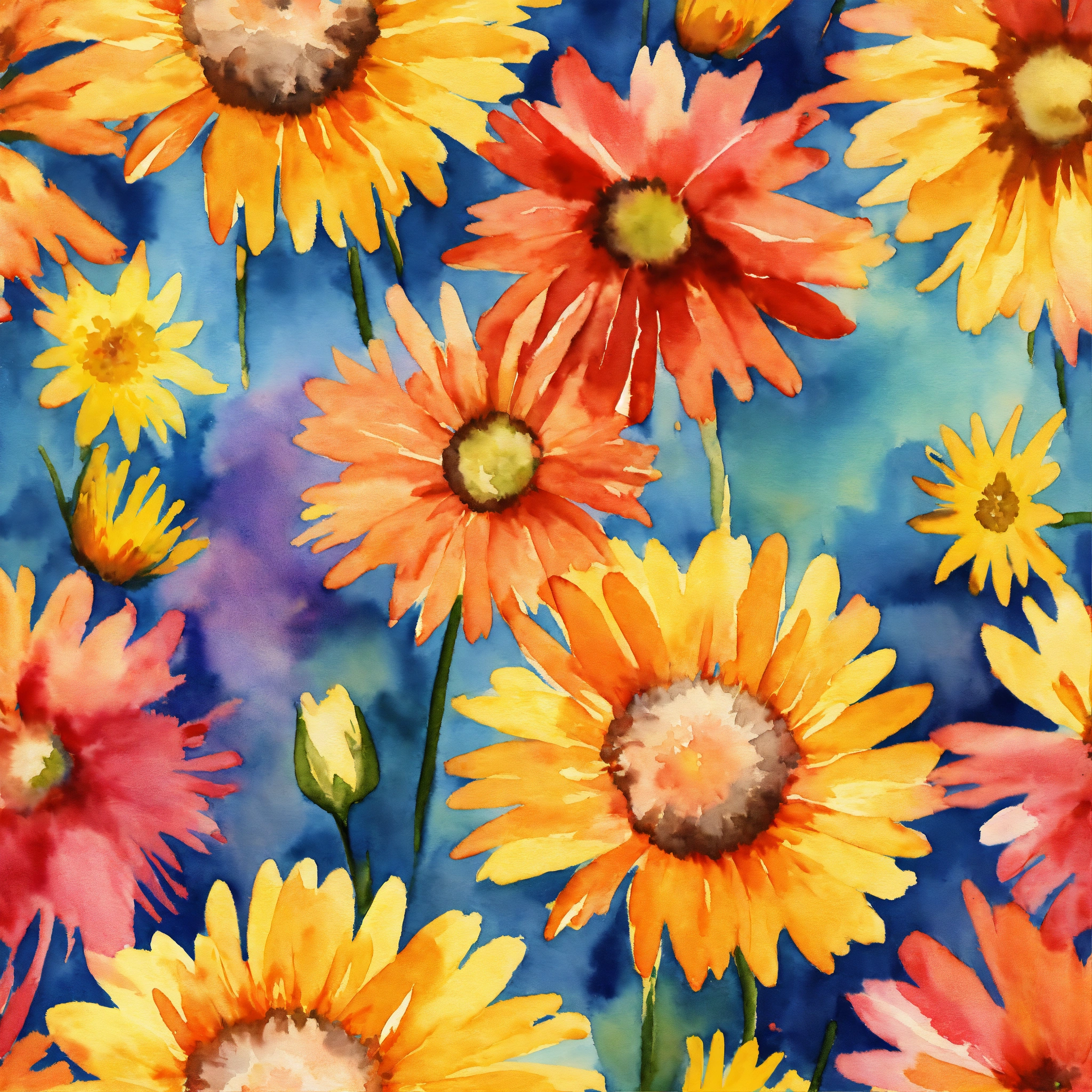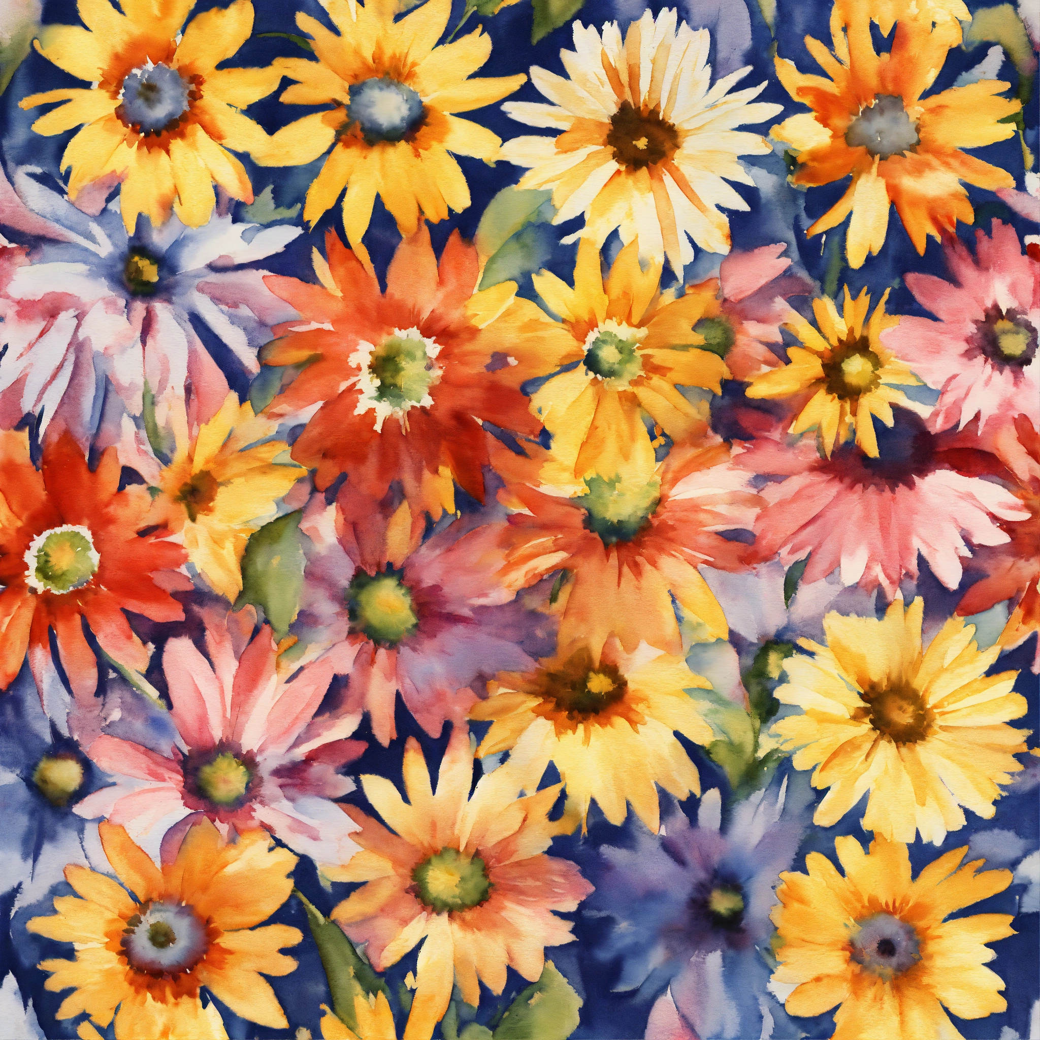 Watercolor multiple daisy in an ikat pattern formation. photorealistic with bright tones, 8k high resolution