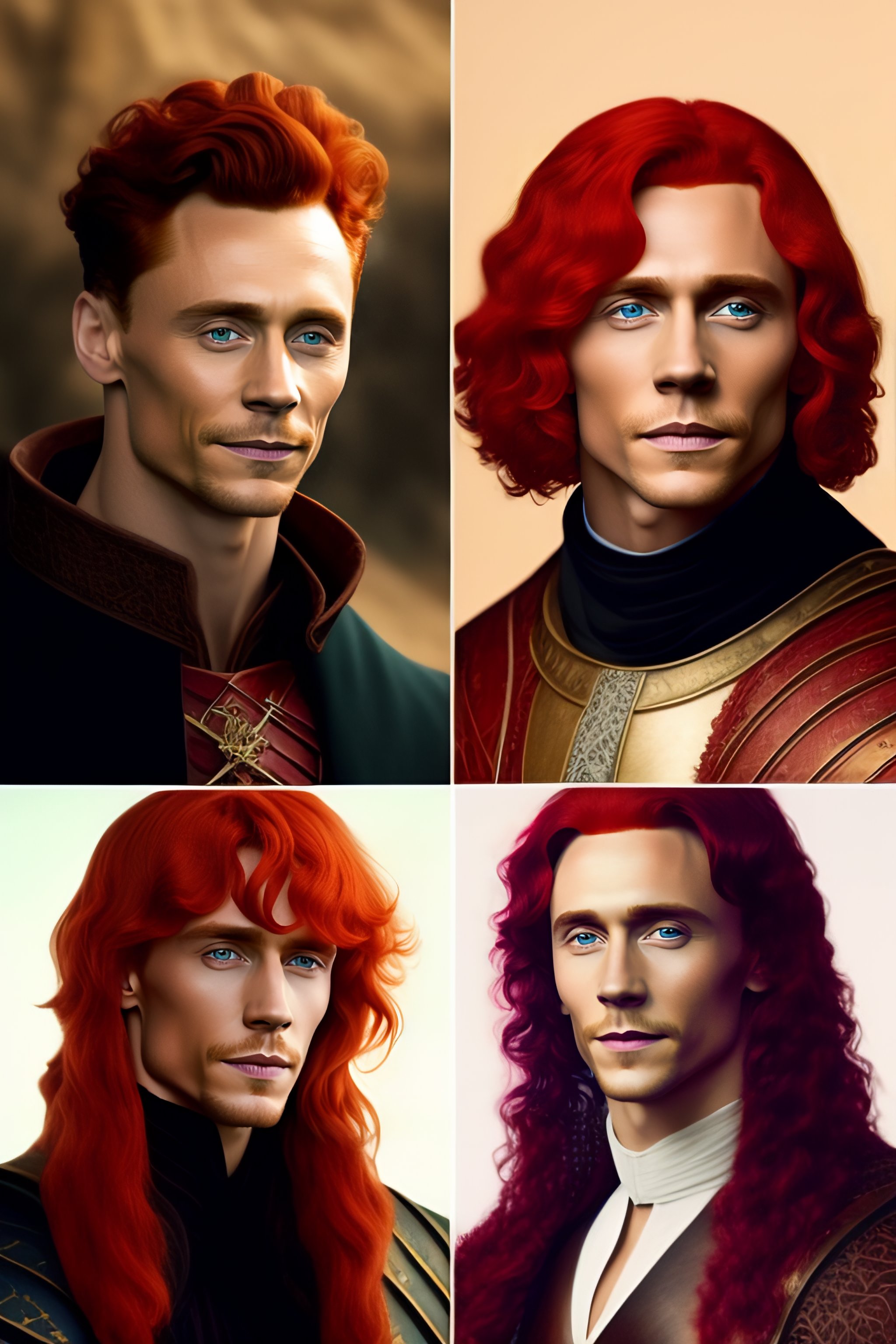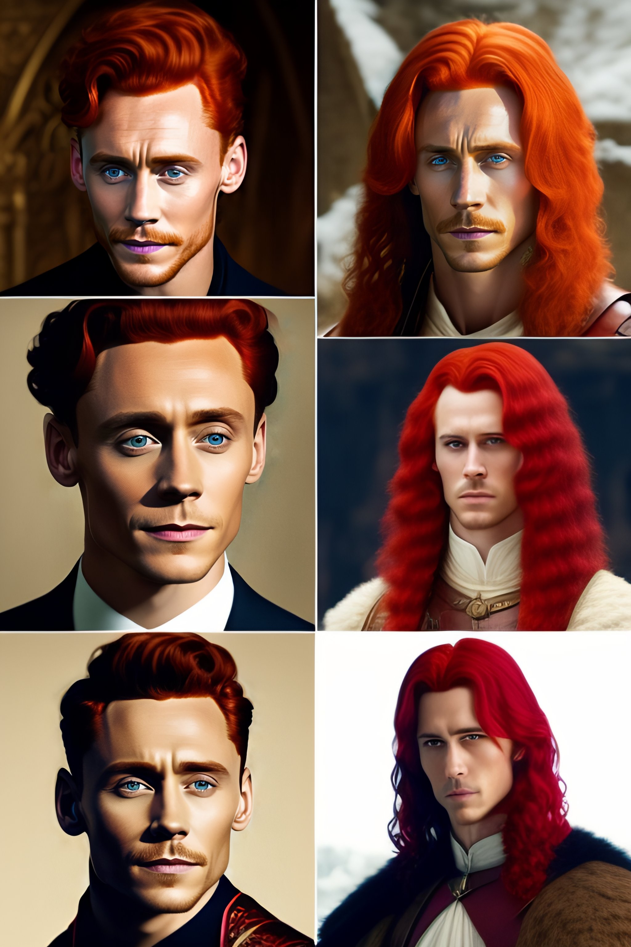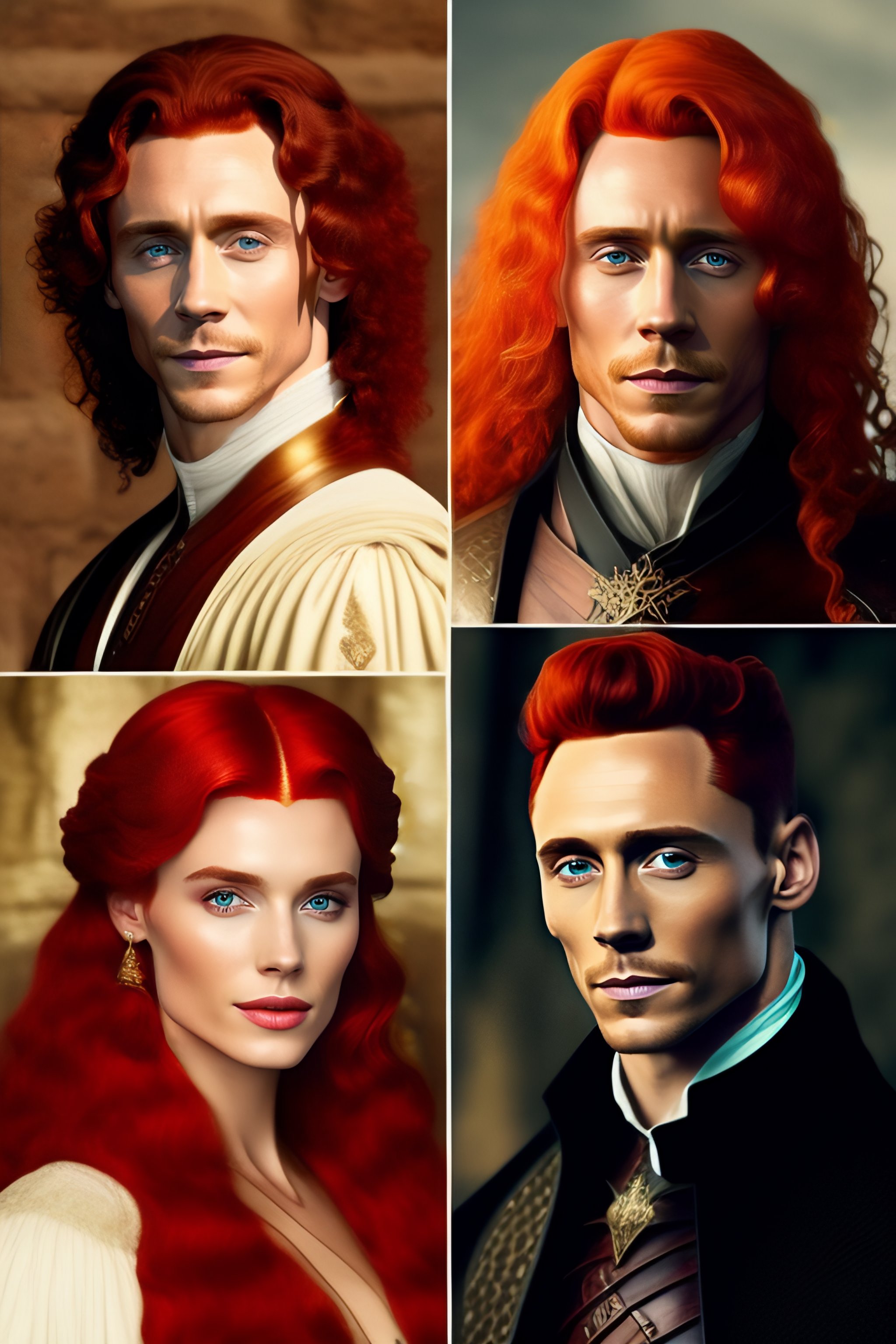 Tom hiddleston with red hair together with jacobs collins-levy with light hair in medieval style, detailed, art