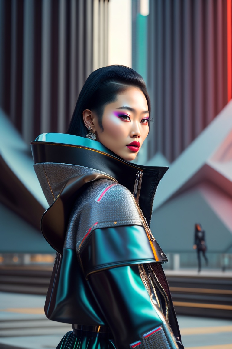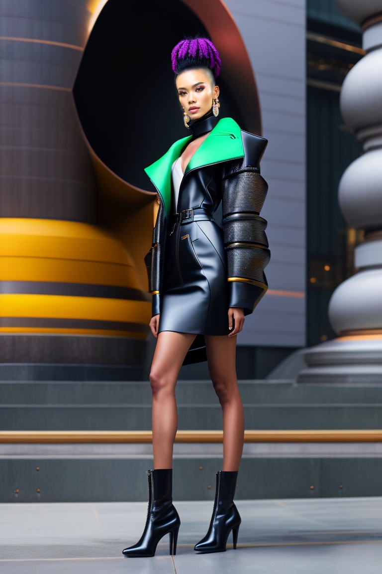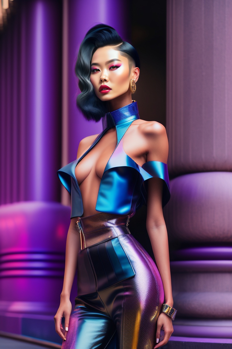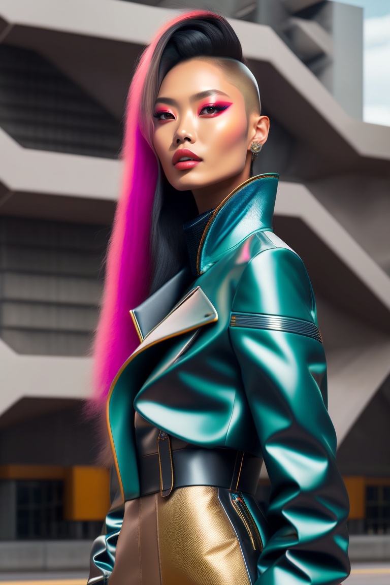 Cyberpunk, 80s, fortnite character, beautiful thai woman, hyperrealistic haute couture fashion model wearing outfit by balenciaga. photoshoot in the style of kinfolk magazine in front of brutalist parametric futuristic architectur. surrealism