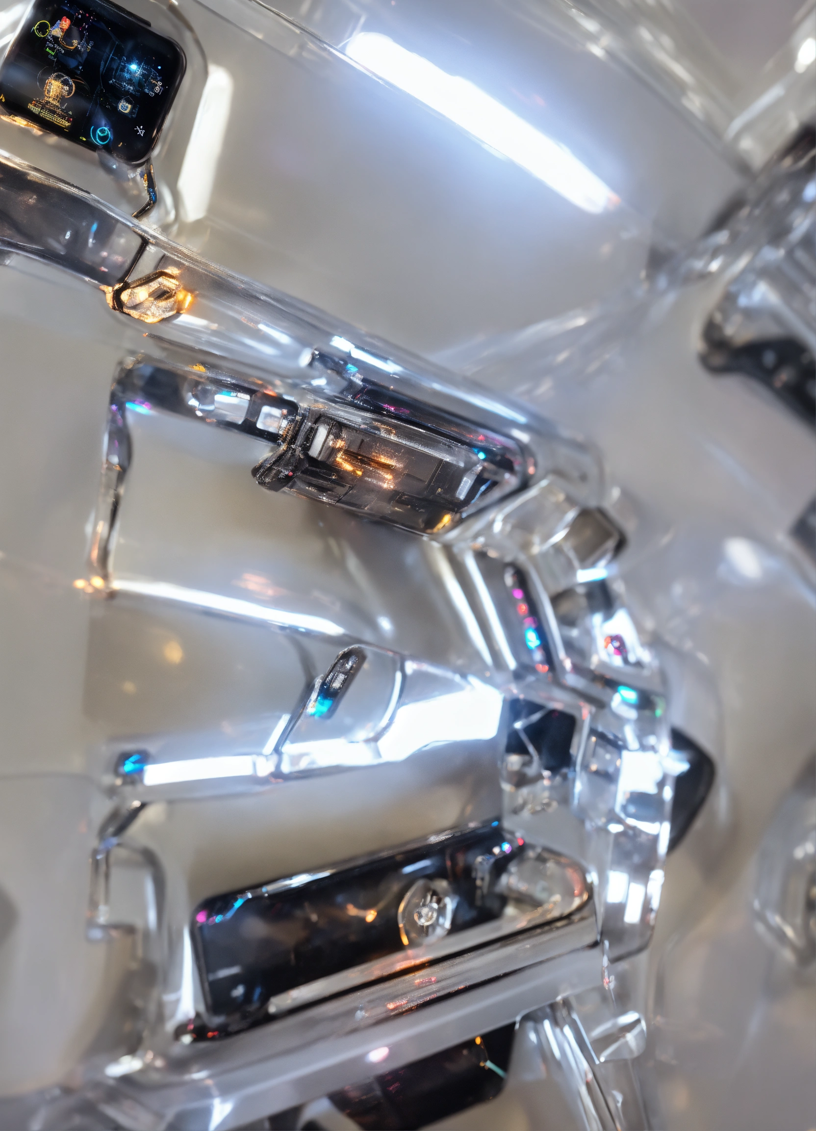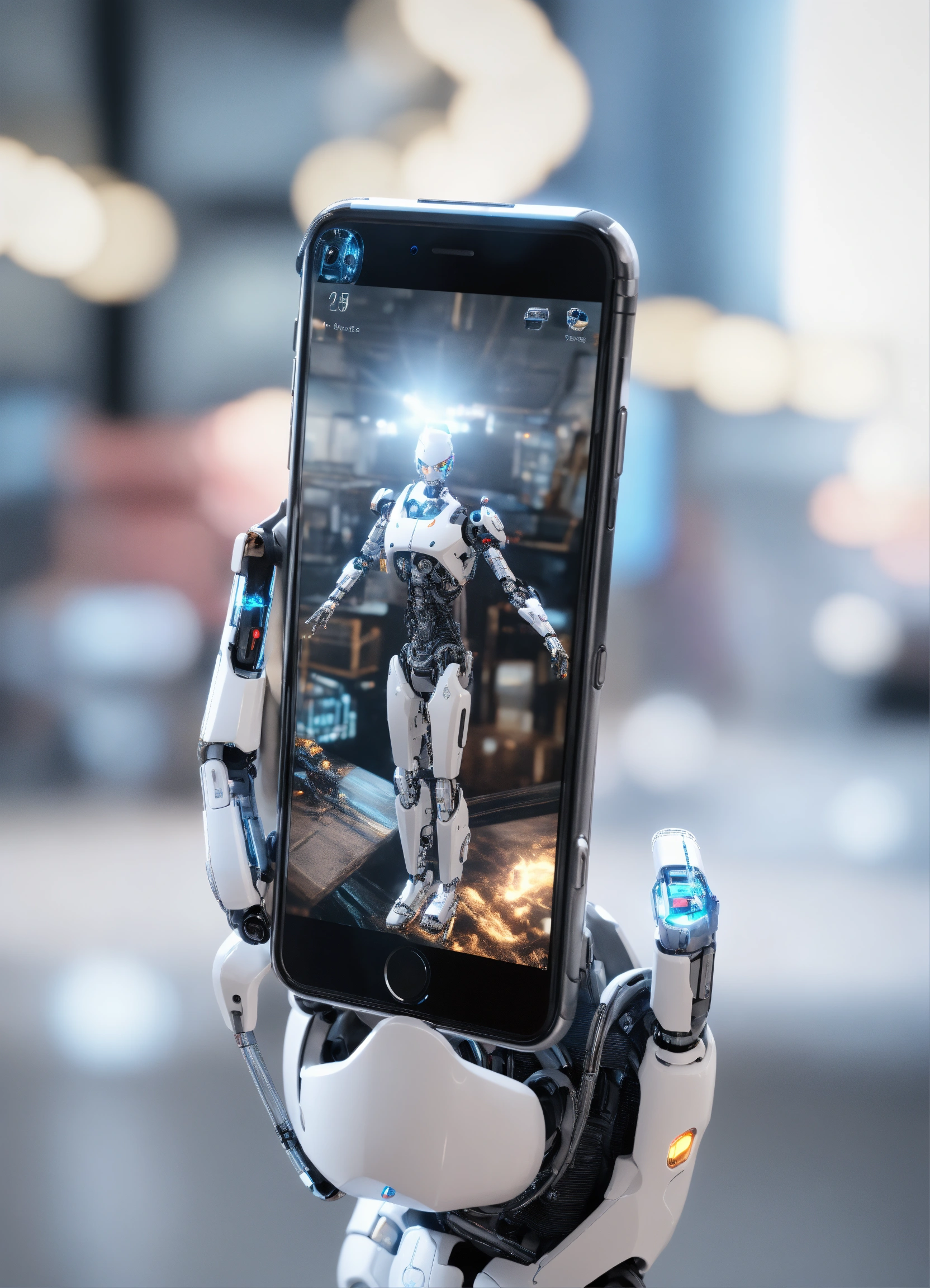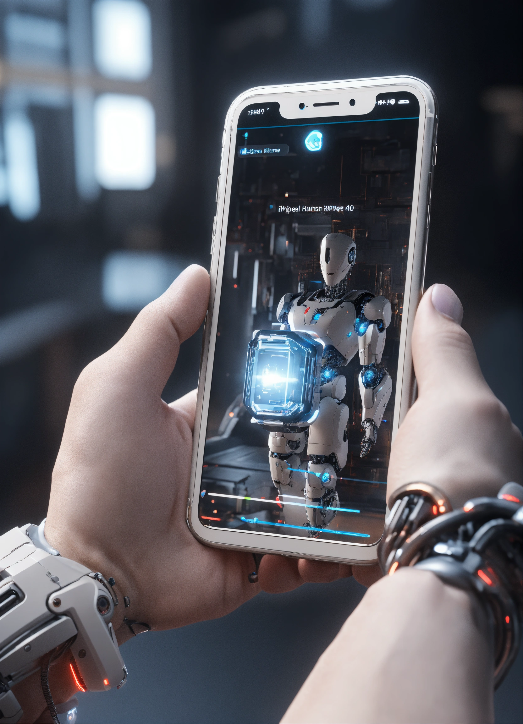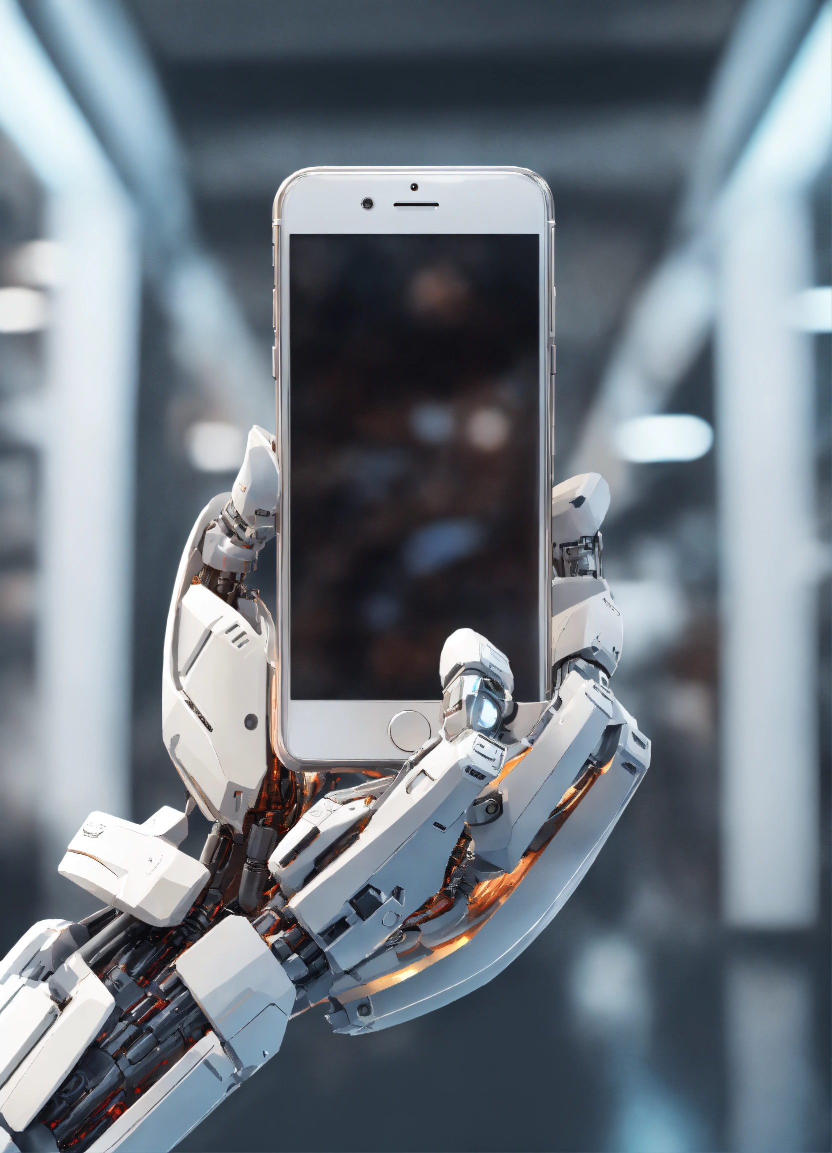 White humanoid cyborg arm holding iphone, first-person view, hdr, rendered in unreal engine, clear white background