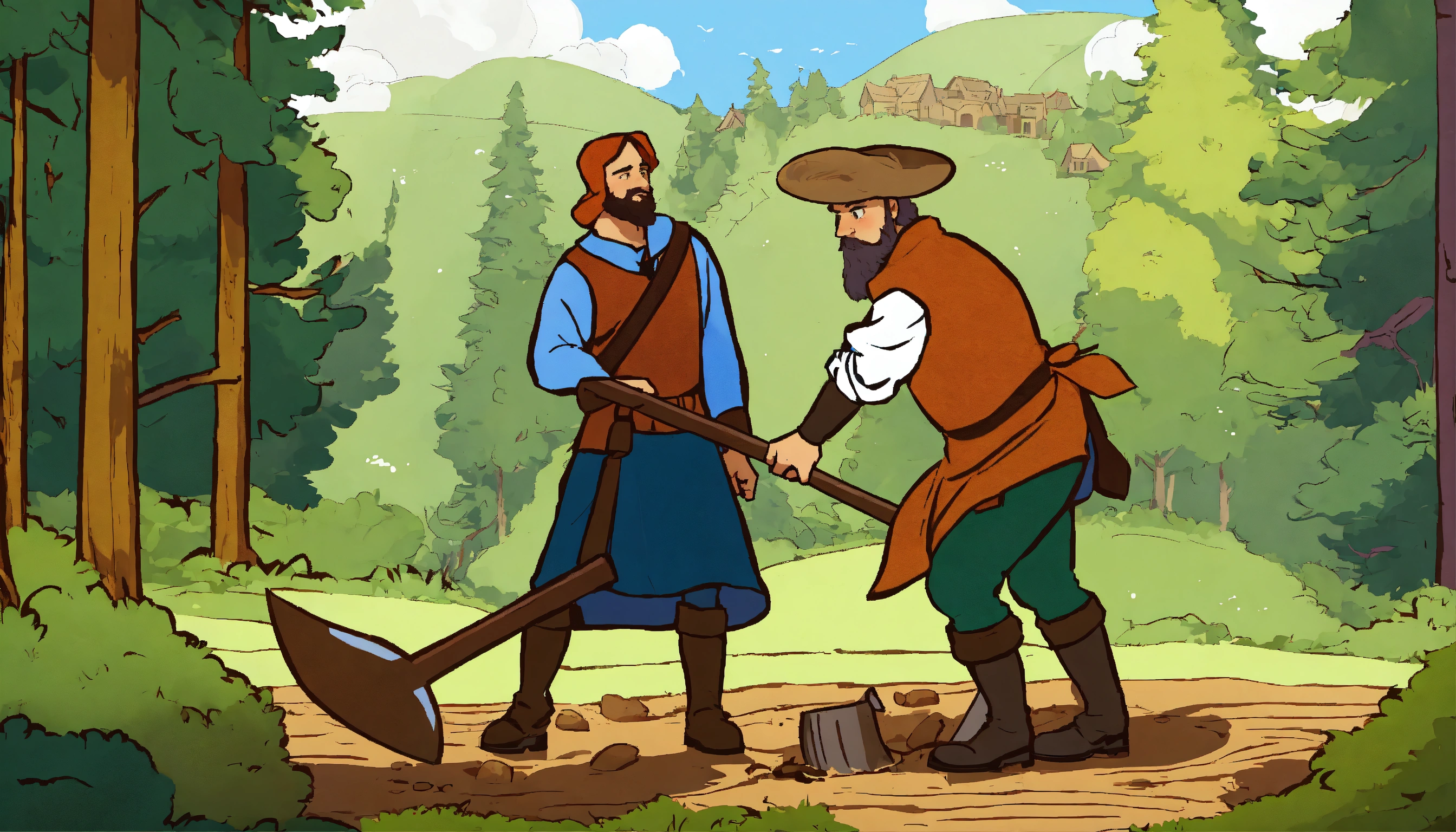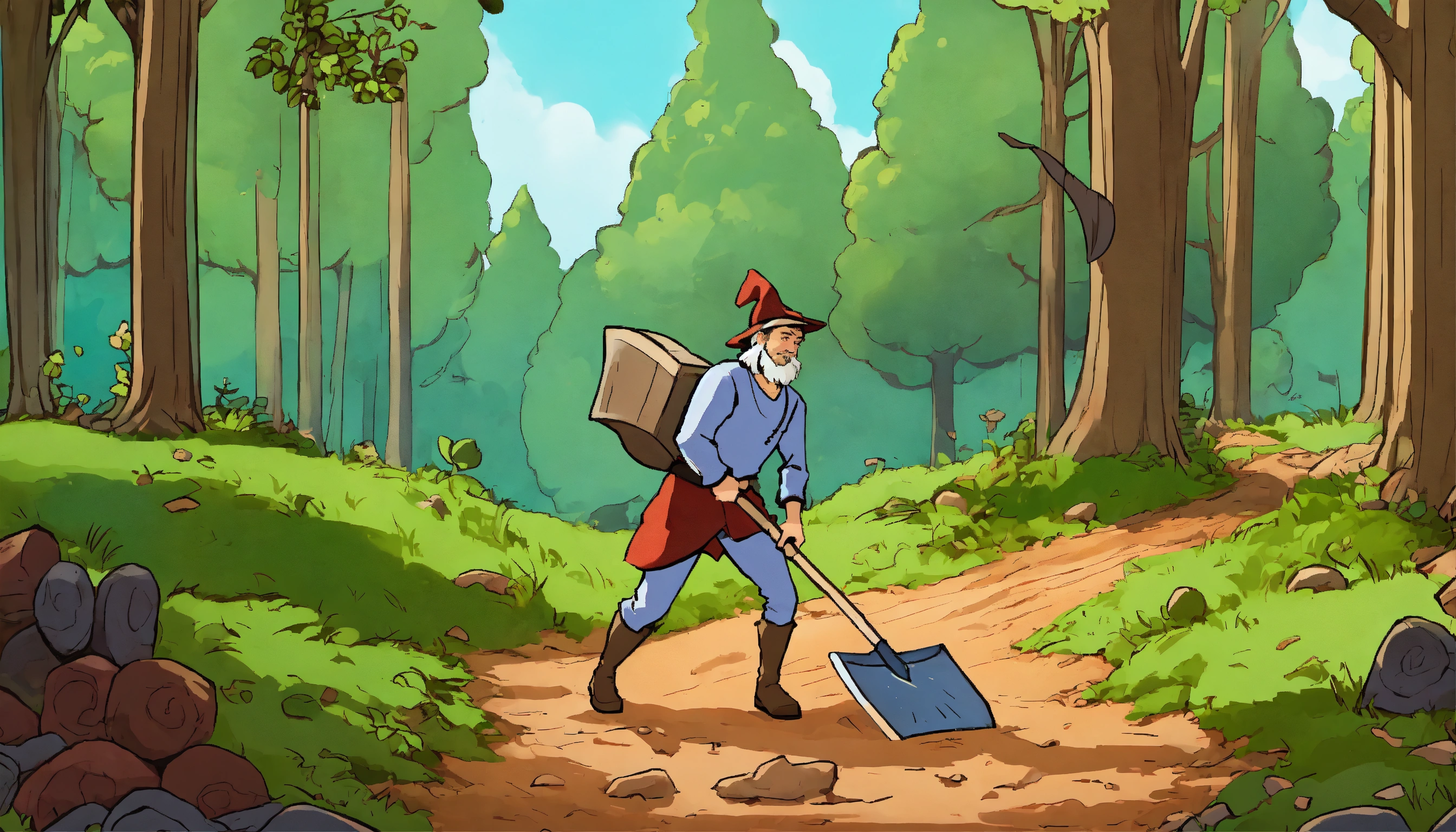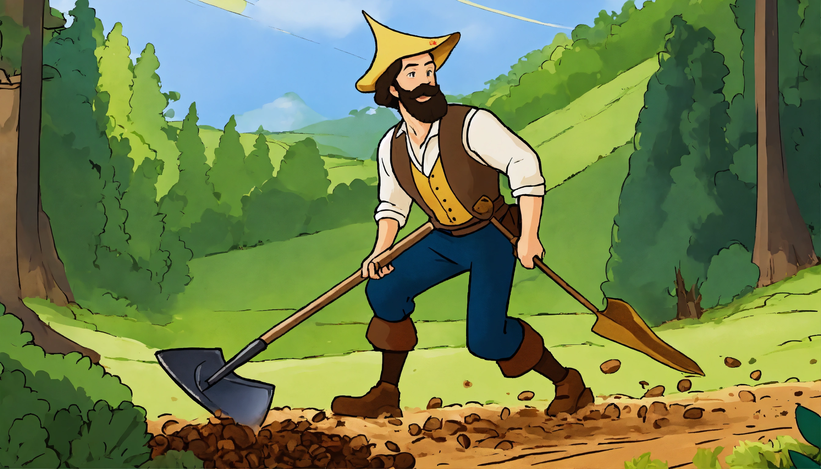 A cartoon-style man in the midieval classic cloths is plowing the ground with the shovel at the forest edge