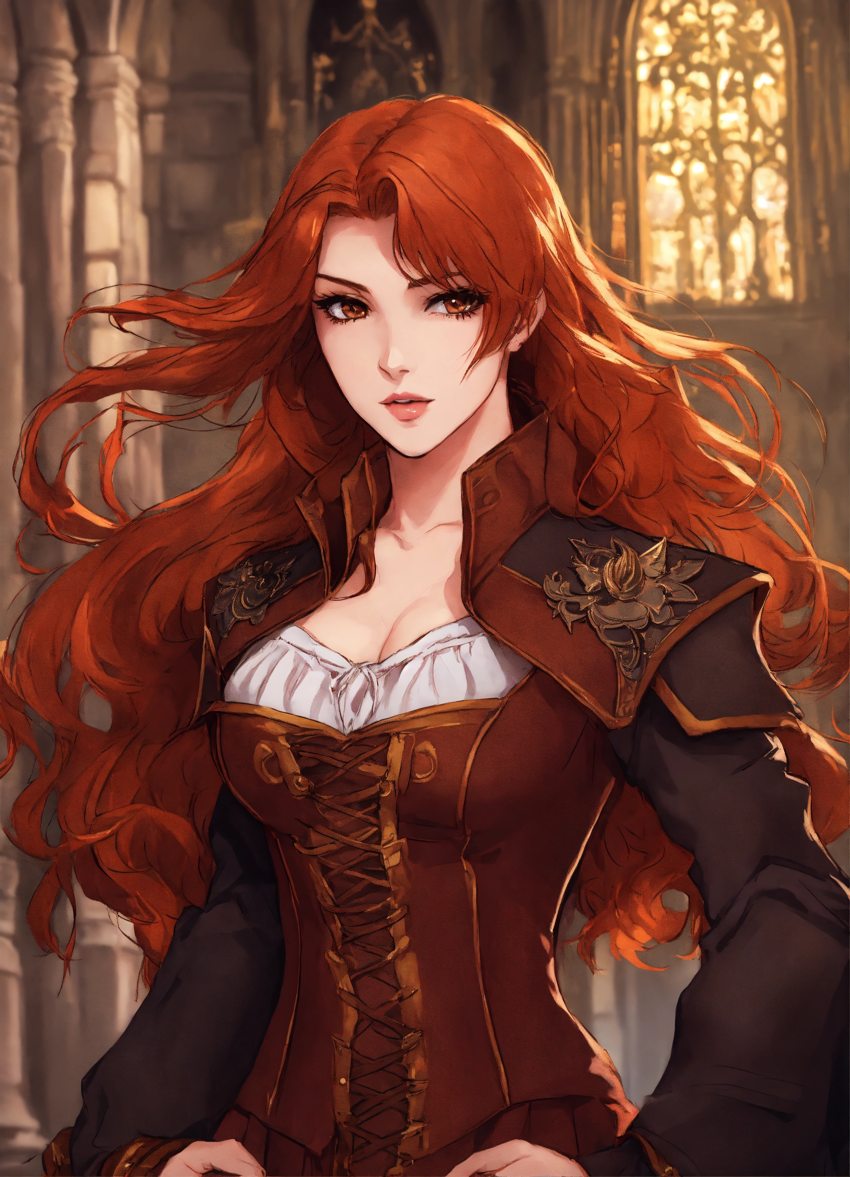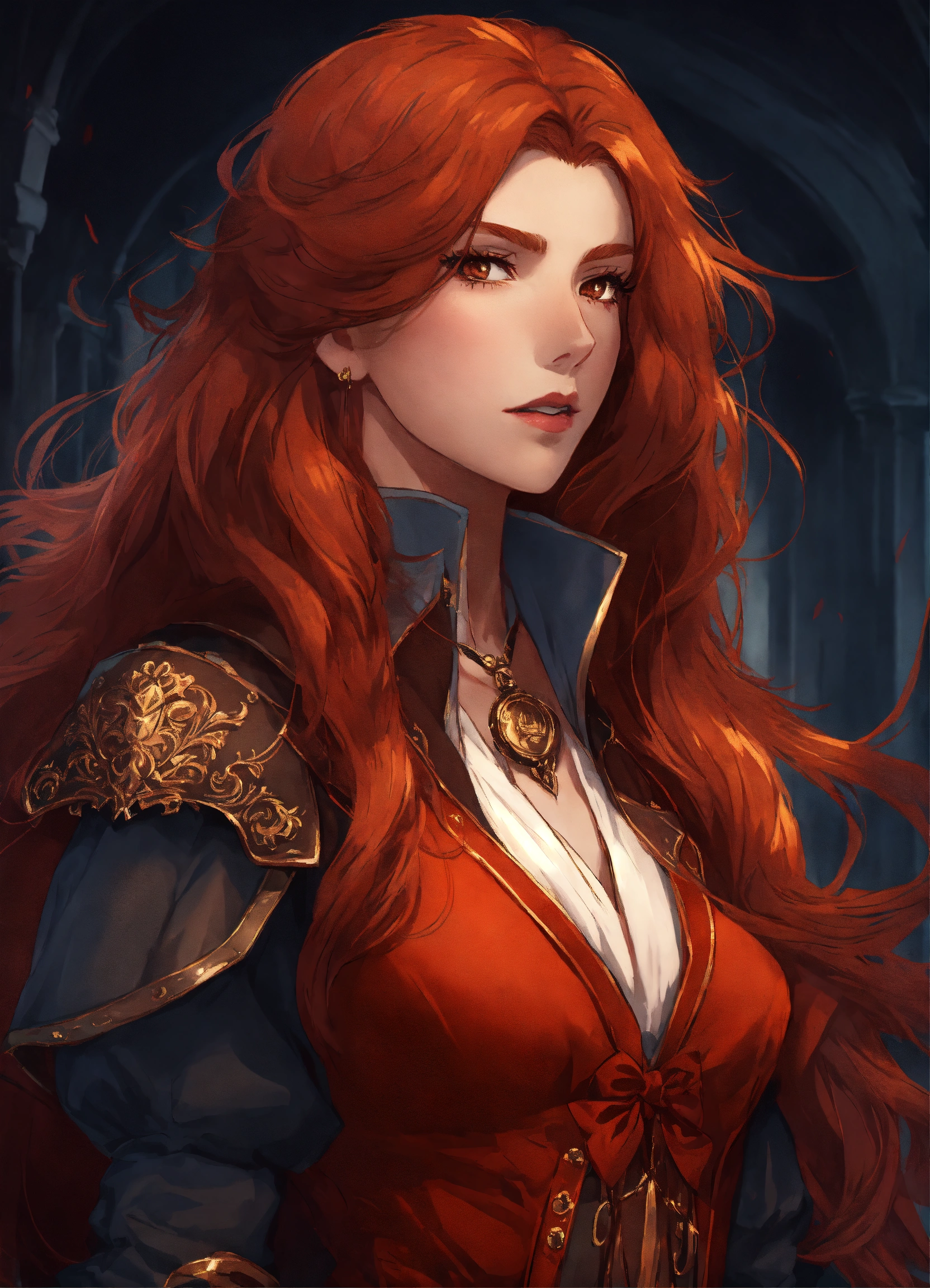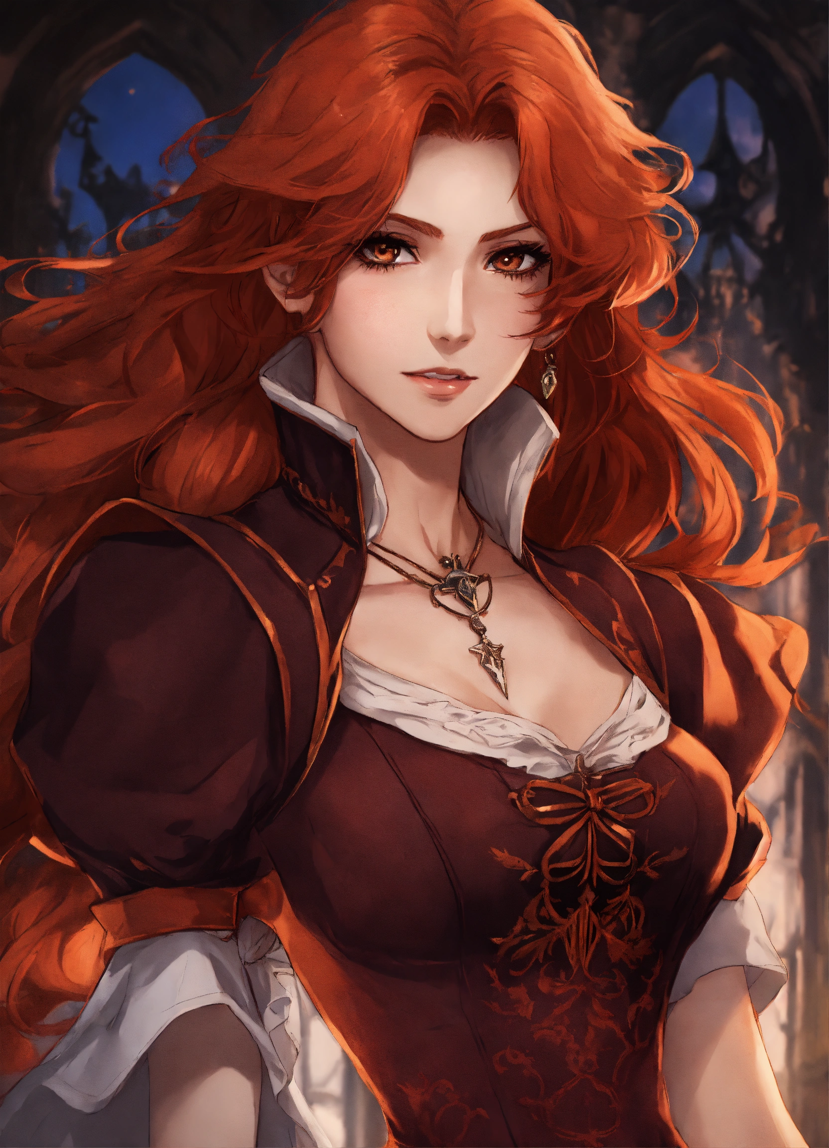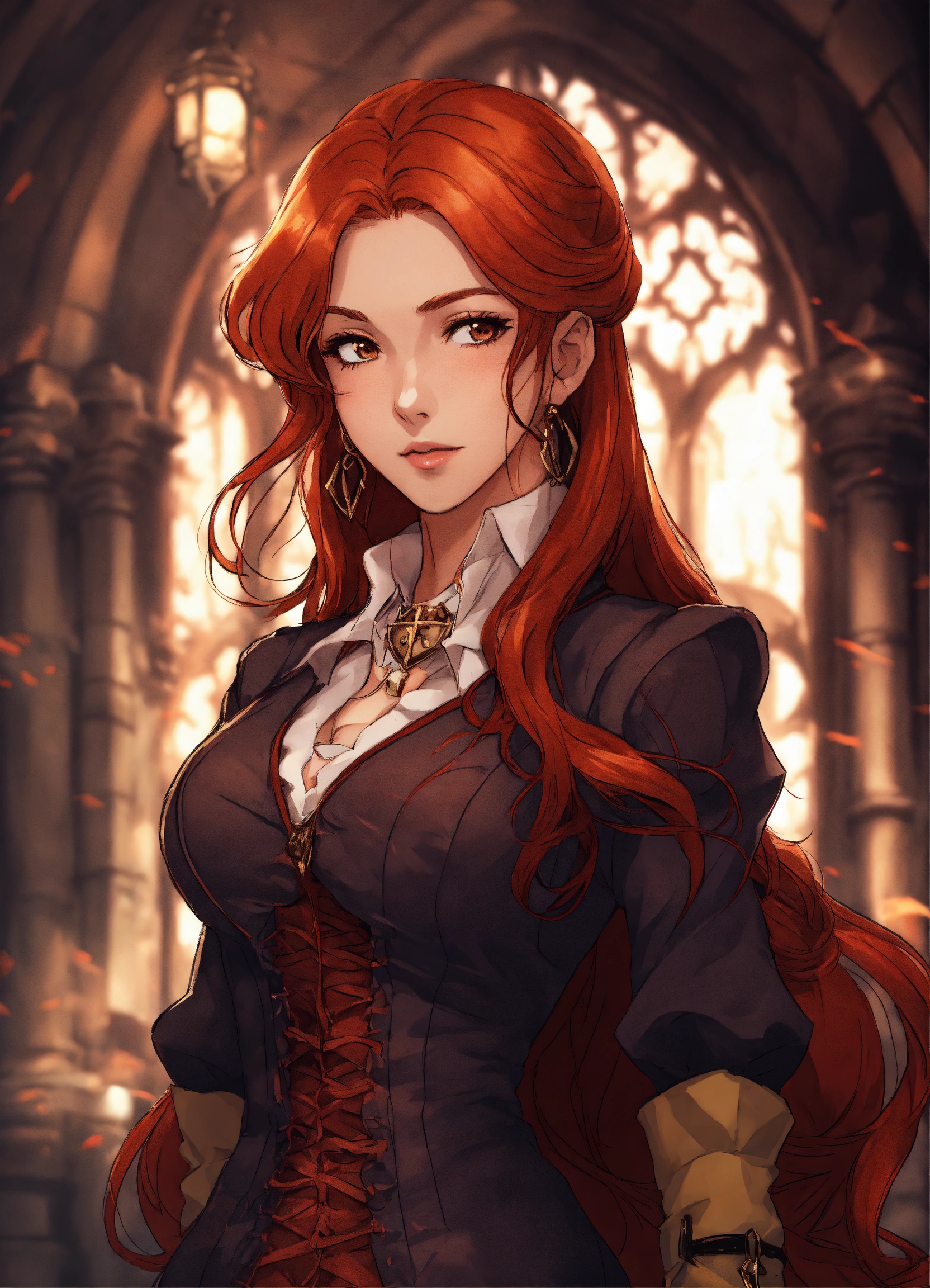 Beautiful redhead woman in the style of anime castlevania, castlevania, anime, brown eyes, manga, detailed, dark clothes, dress