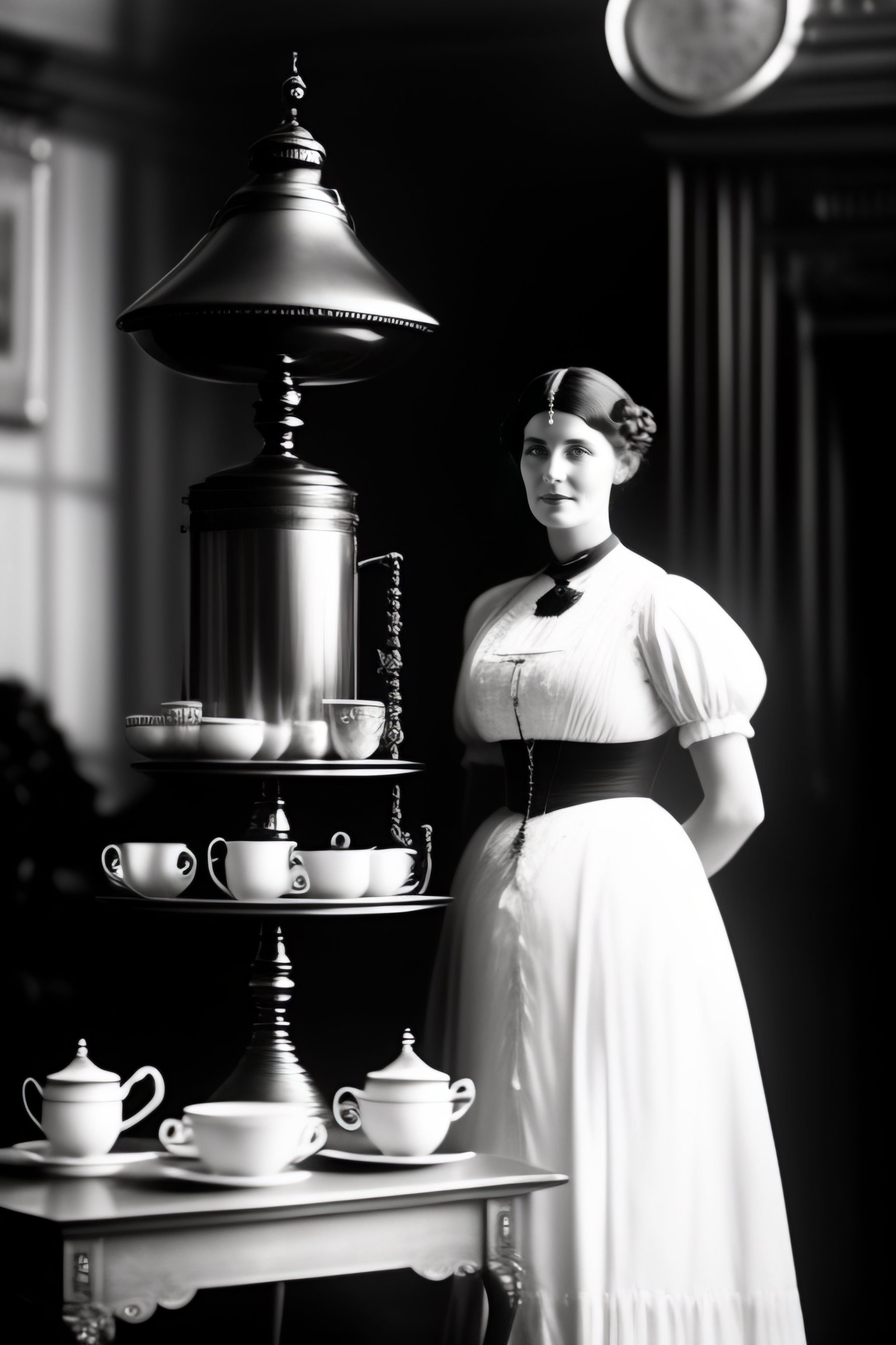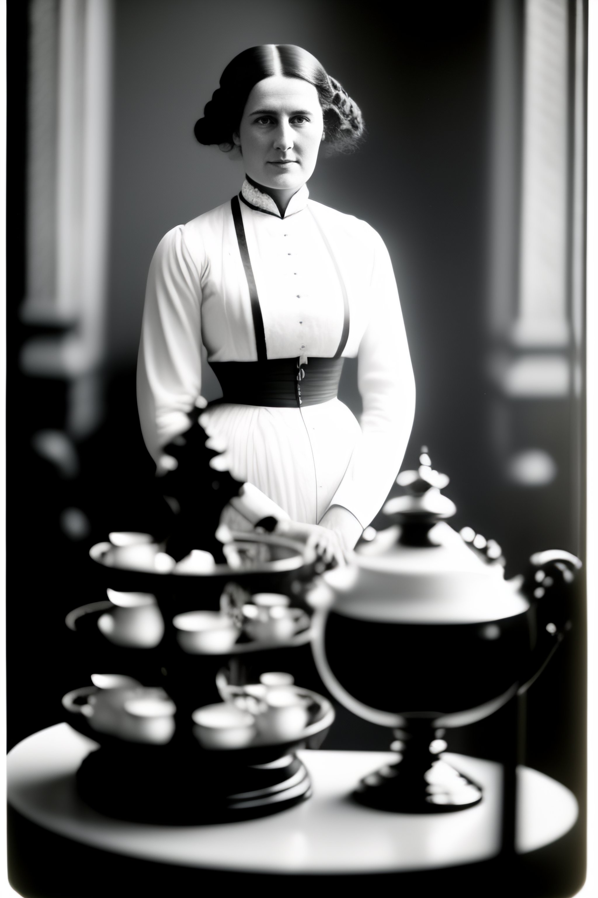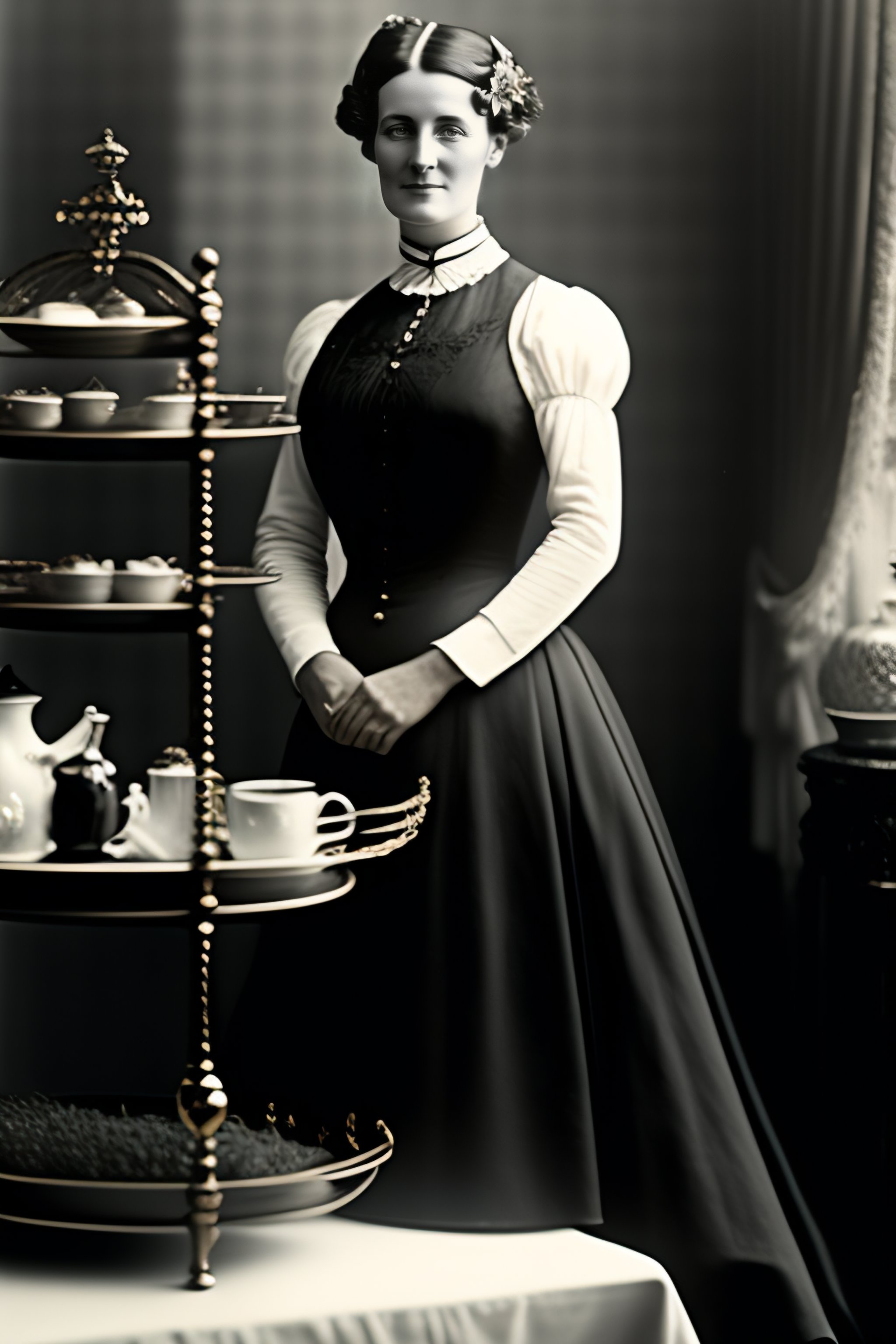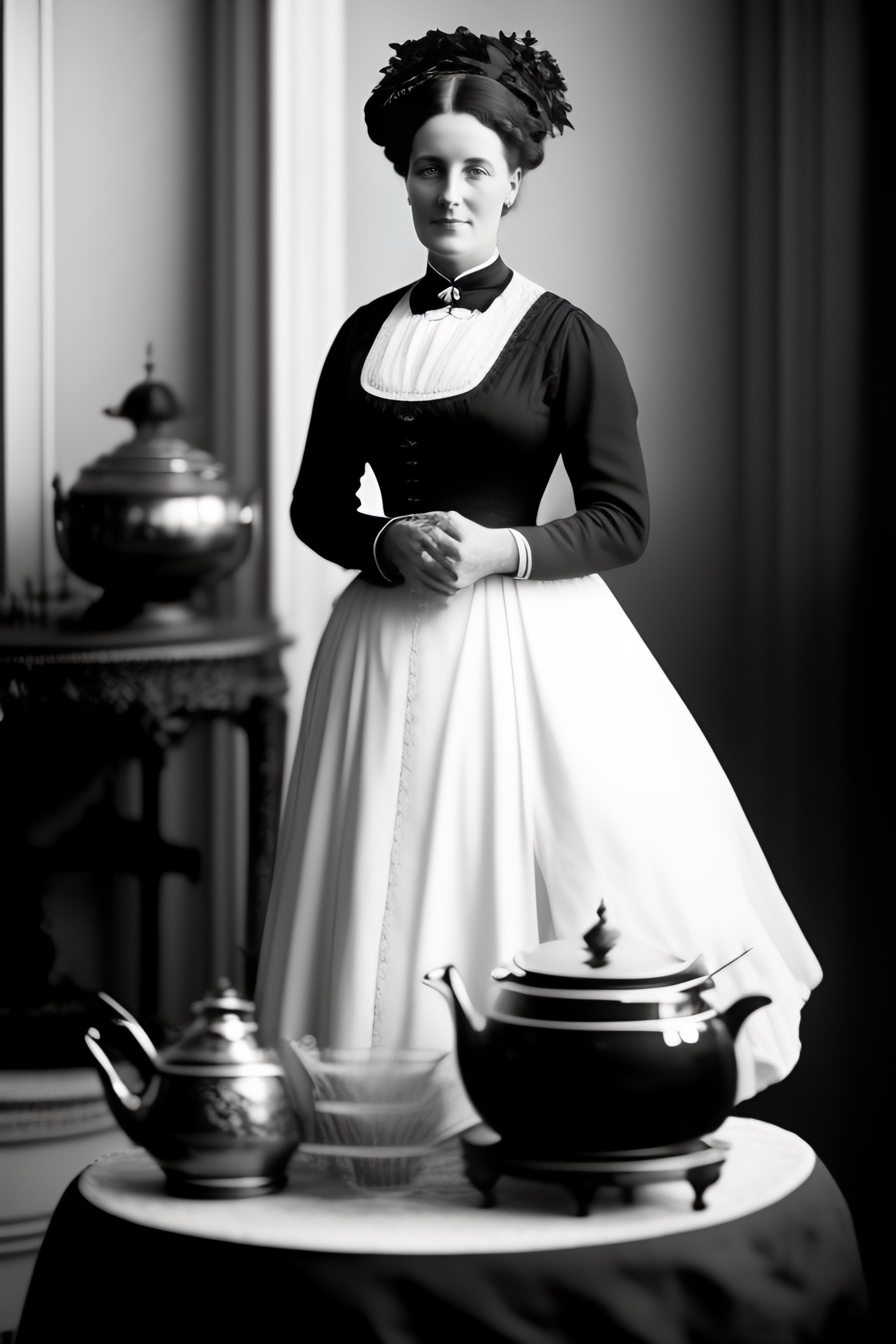 1910 grainy photograph of an edwardian maid with a black dress and a white apron standing next to a tea trolley