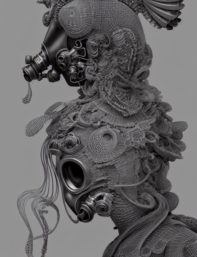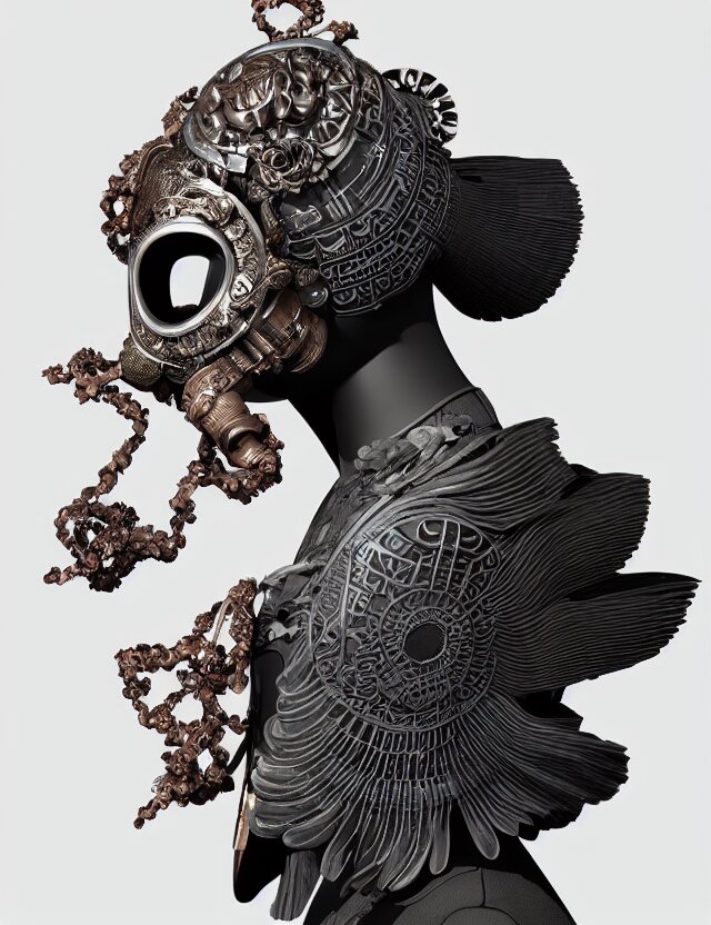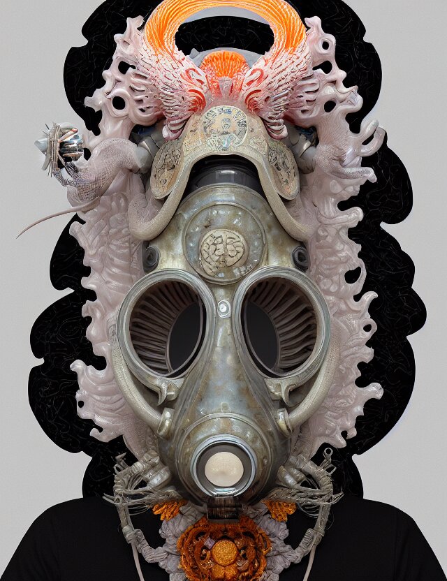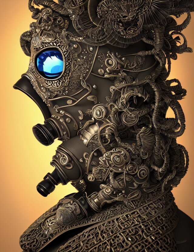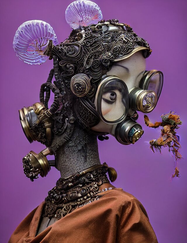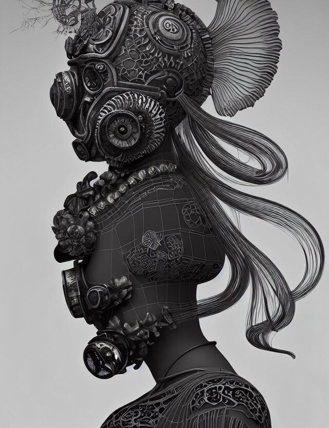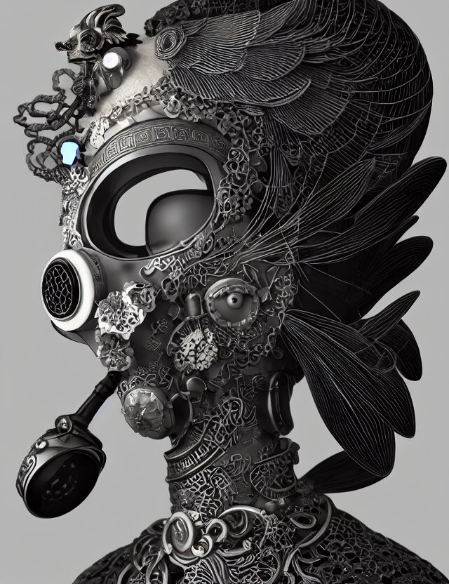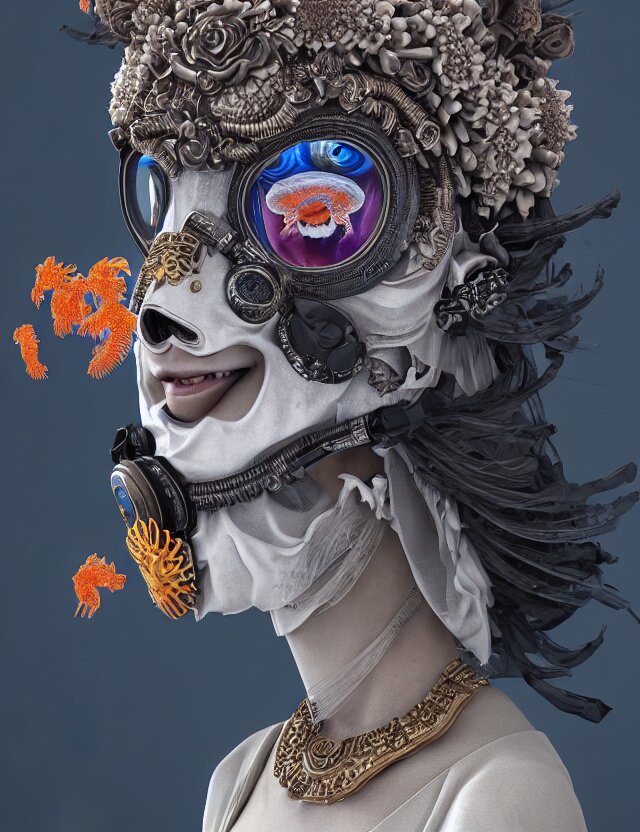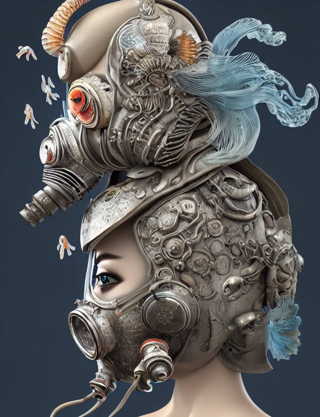 3 d goddess close - up profile portrait with vintage gas mask ram skull. beautiful intricately detailed japanese crow kitsune mask and clasical japanese kimono. betta fish, jellyfish phoenix, bio luminescent, plasma, ice, water, wind, creature, artwork by tooth wu and wlop and beeple and greg rutkowski