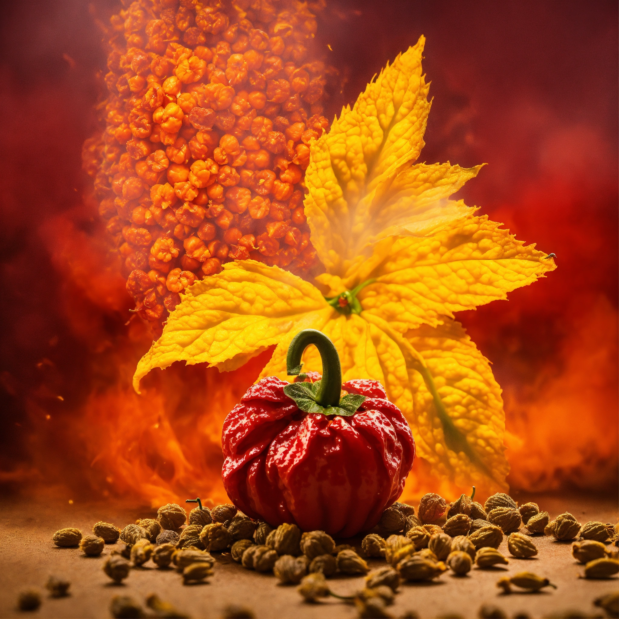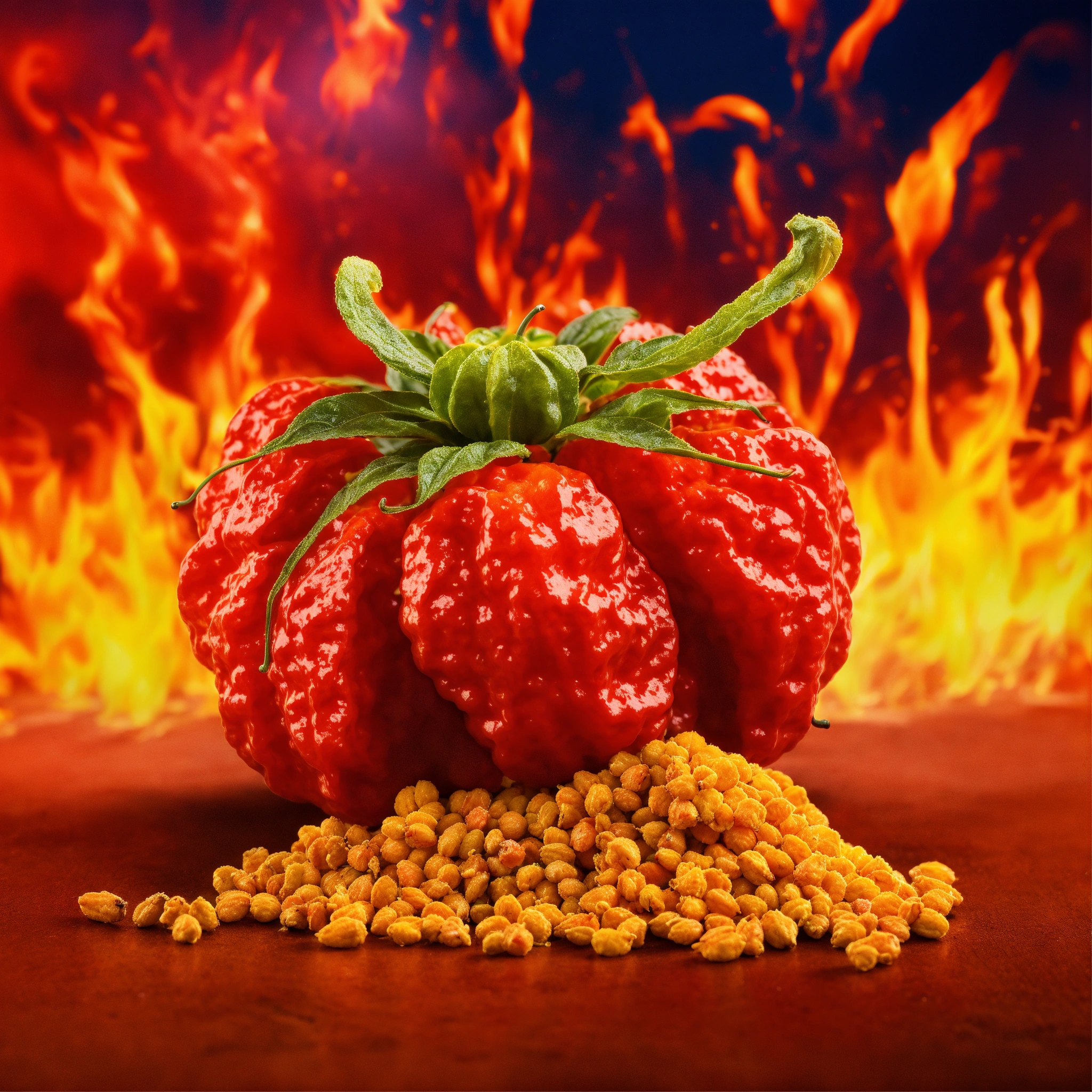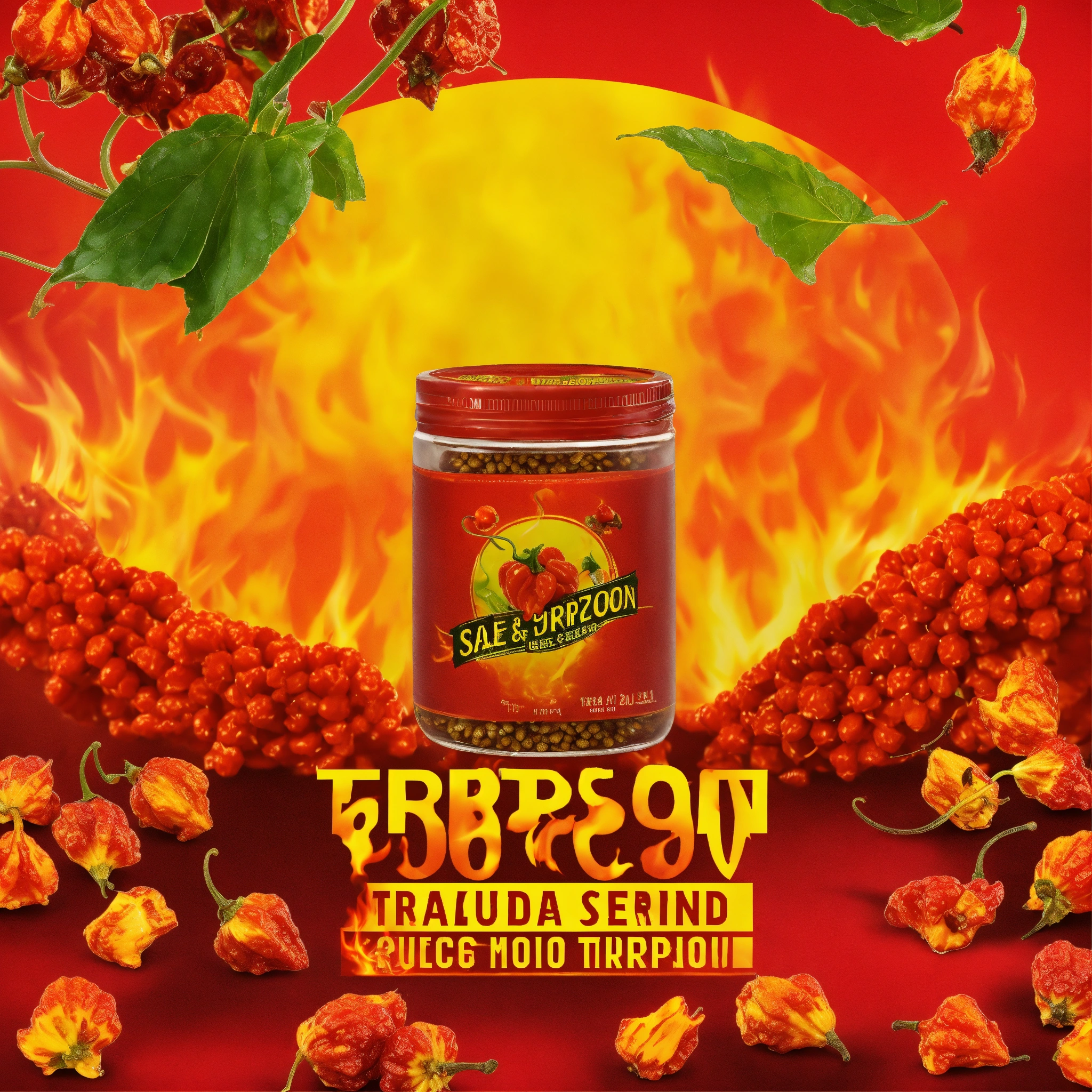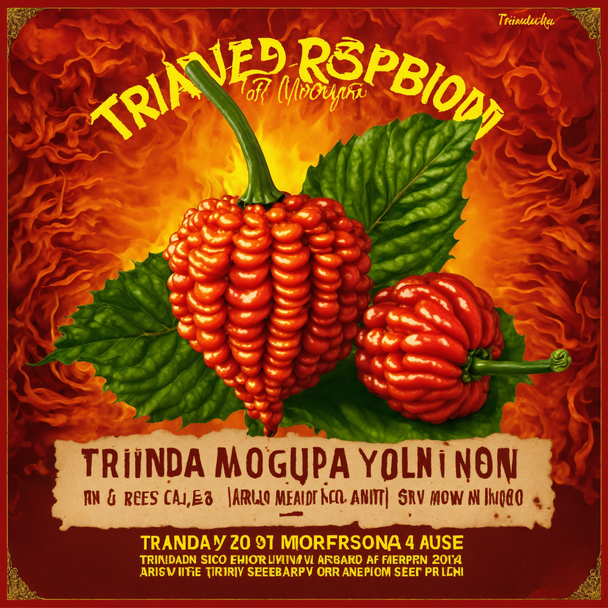Advertisement for the sale of trinidad scorpion moruga yellow seeds on a fiery background