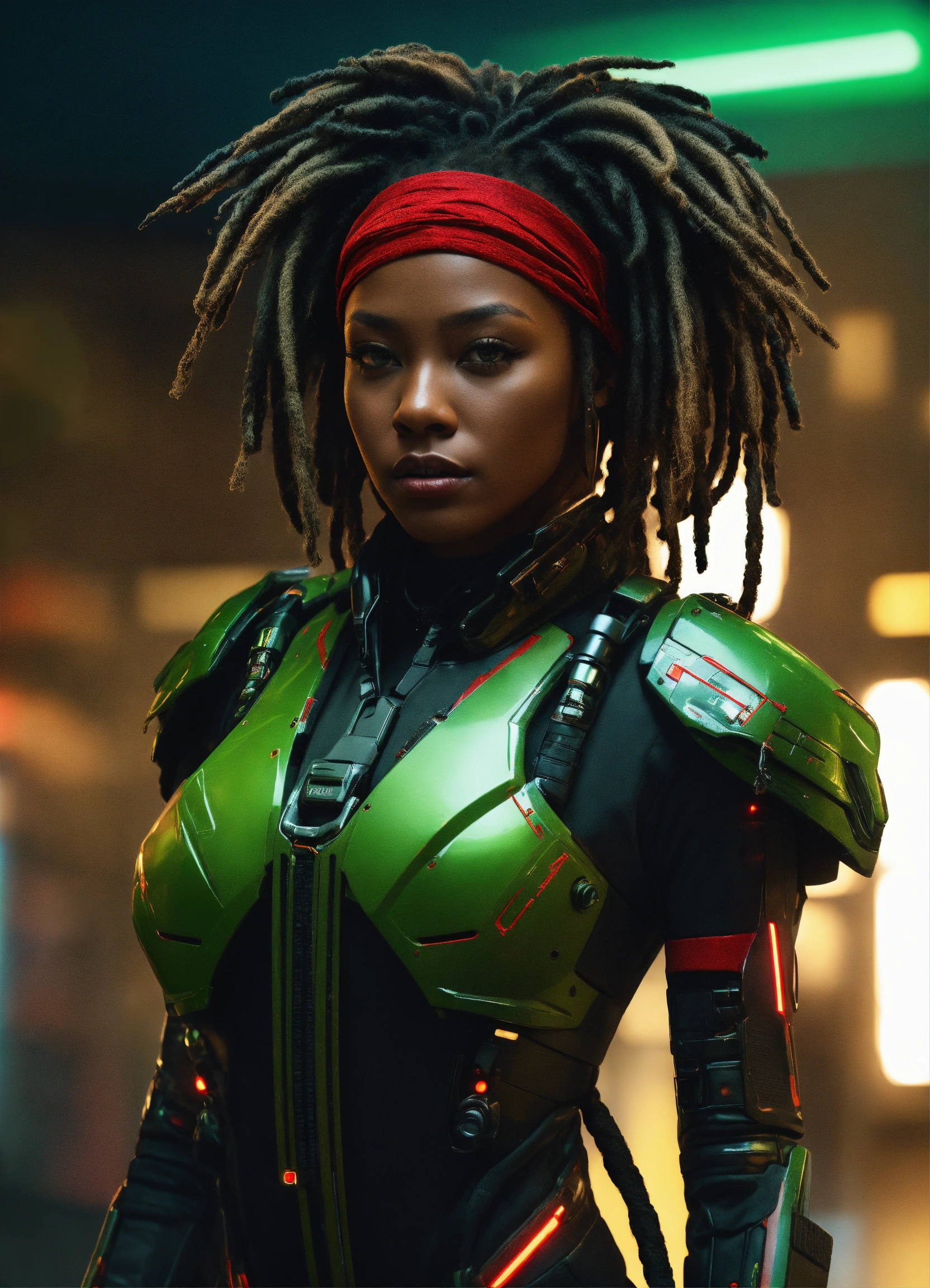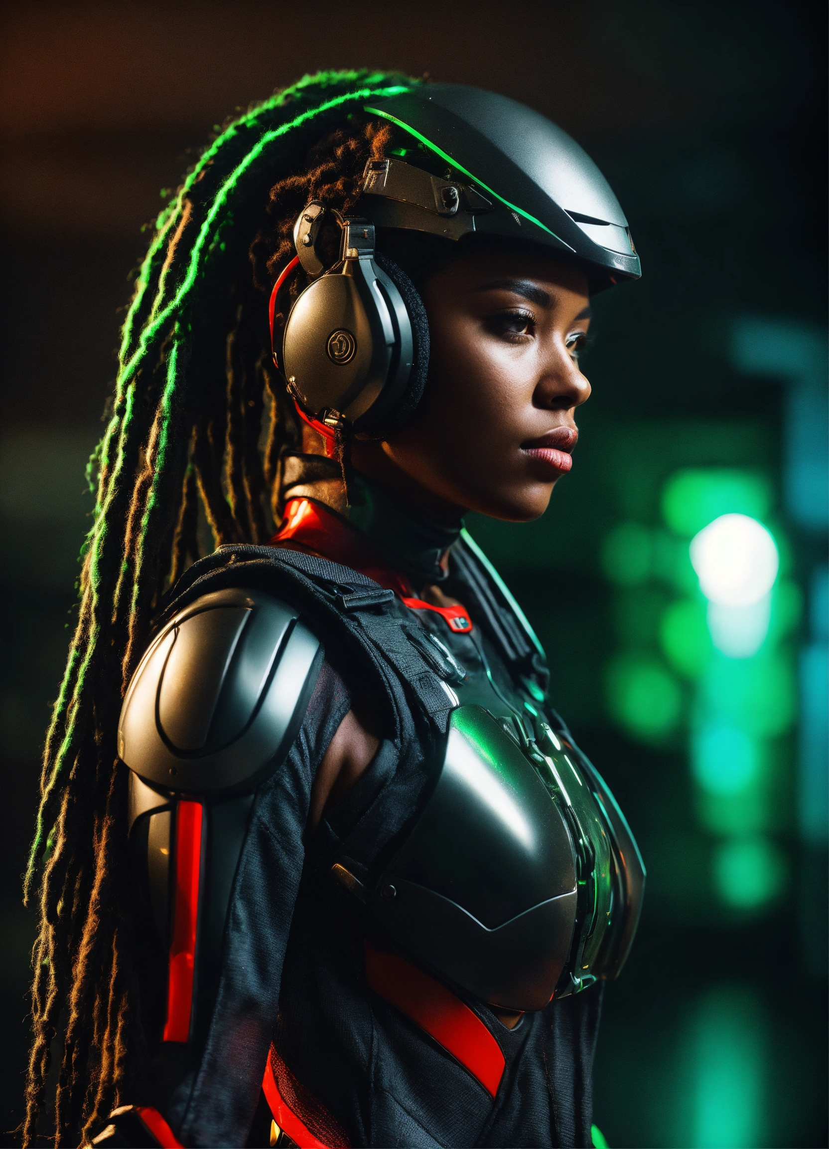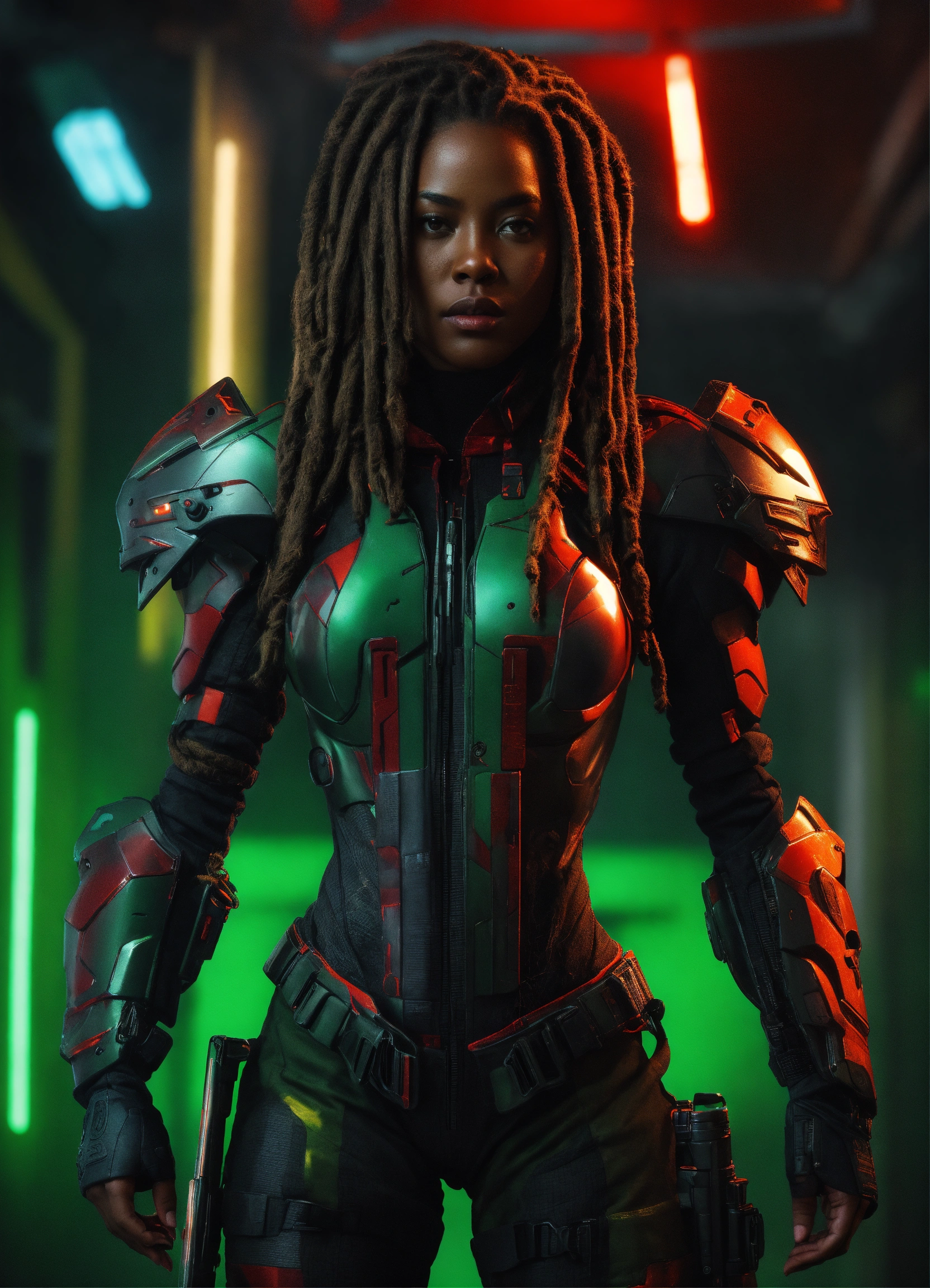 A woman big, african american, black dread locks, tall, full height, summer, tight red, green and black military assassin cyber suit, futuristic helmet, longshot, full shot, extreme wide shot, full front view, deep look, dread locks, beauty, attractive, masterpiece of digital art, very detailed and coherent, intricate, soft, focus, dramatic shadows, ominous shadows, studio lighting, 50mm f1.4 octane render 4k