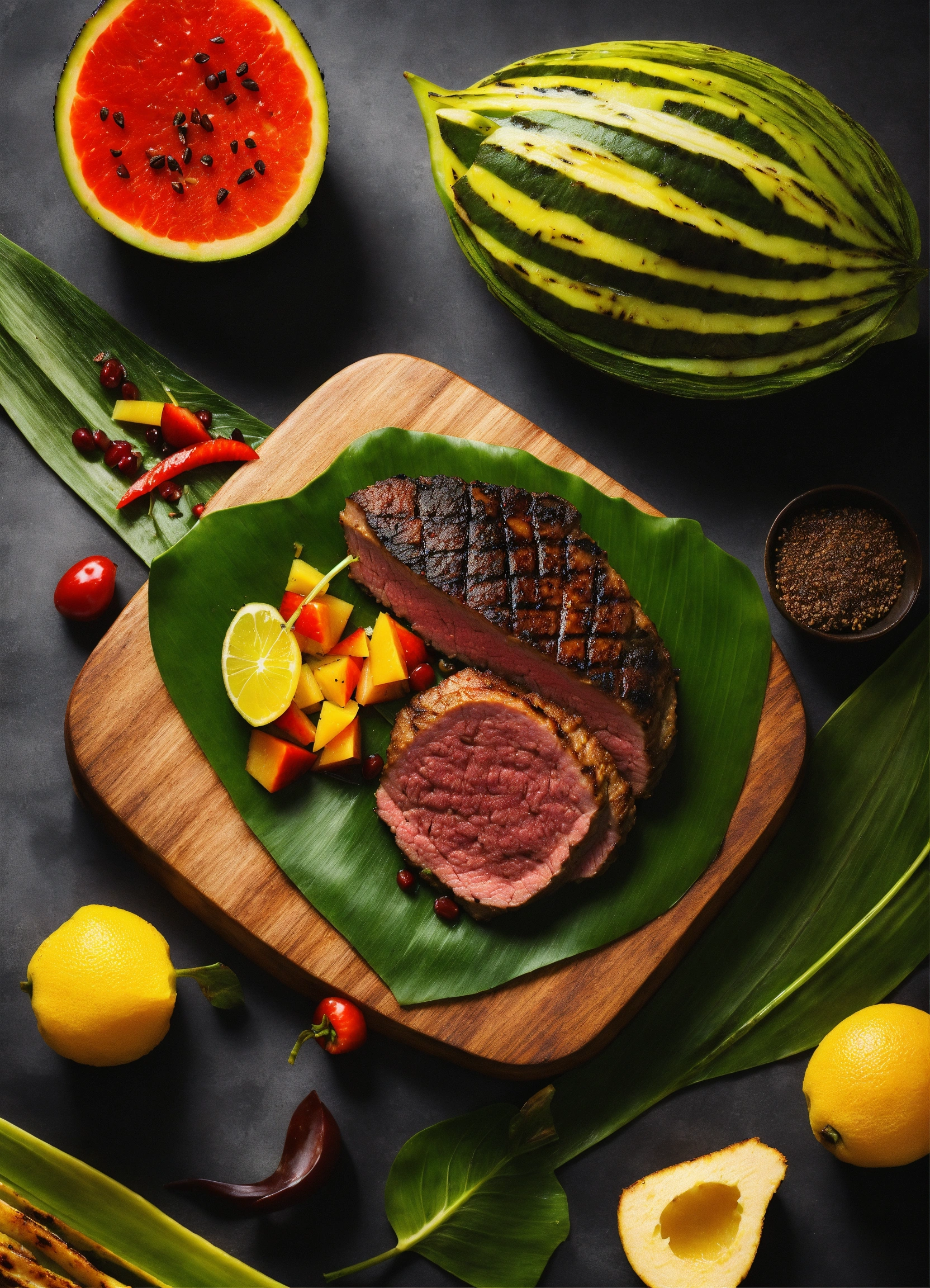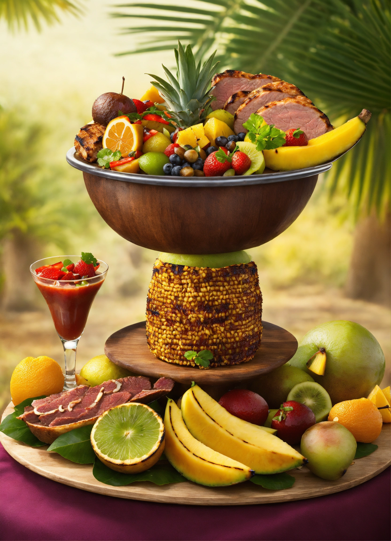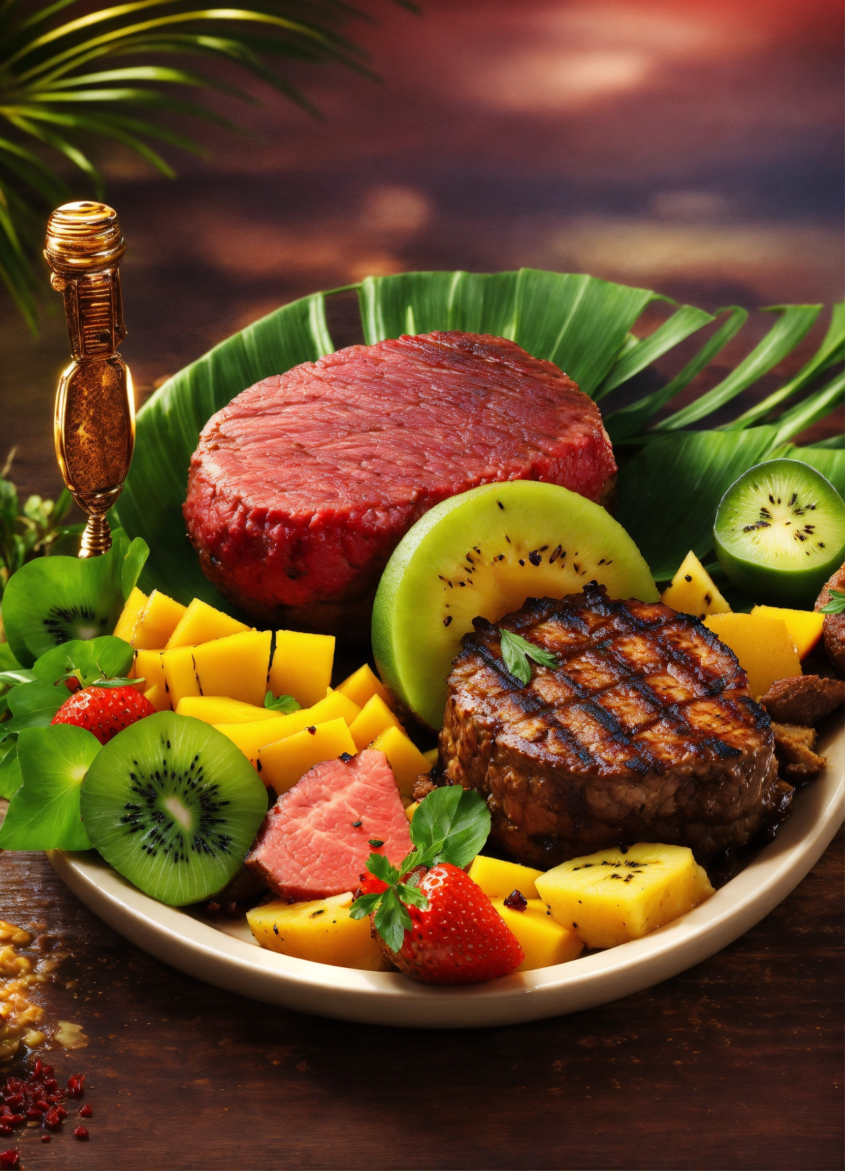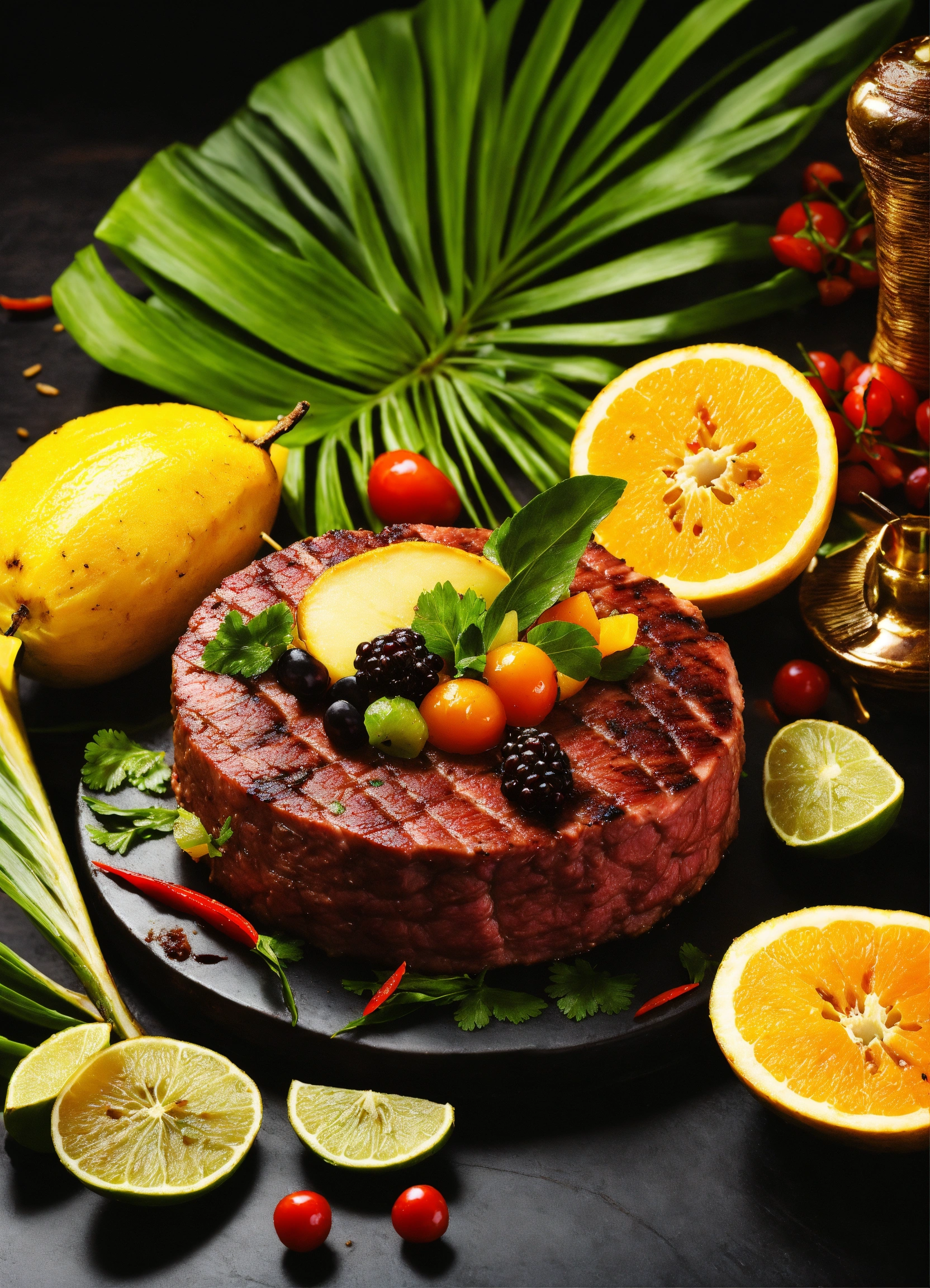 Realistic, african cuisine, fruit garnish, fine dining, tropical background, exotic, grilled meat, barbecue, luxury, tempting, delicious