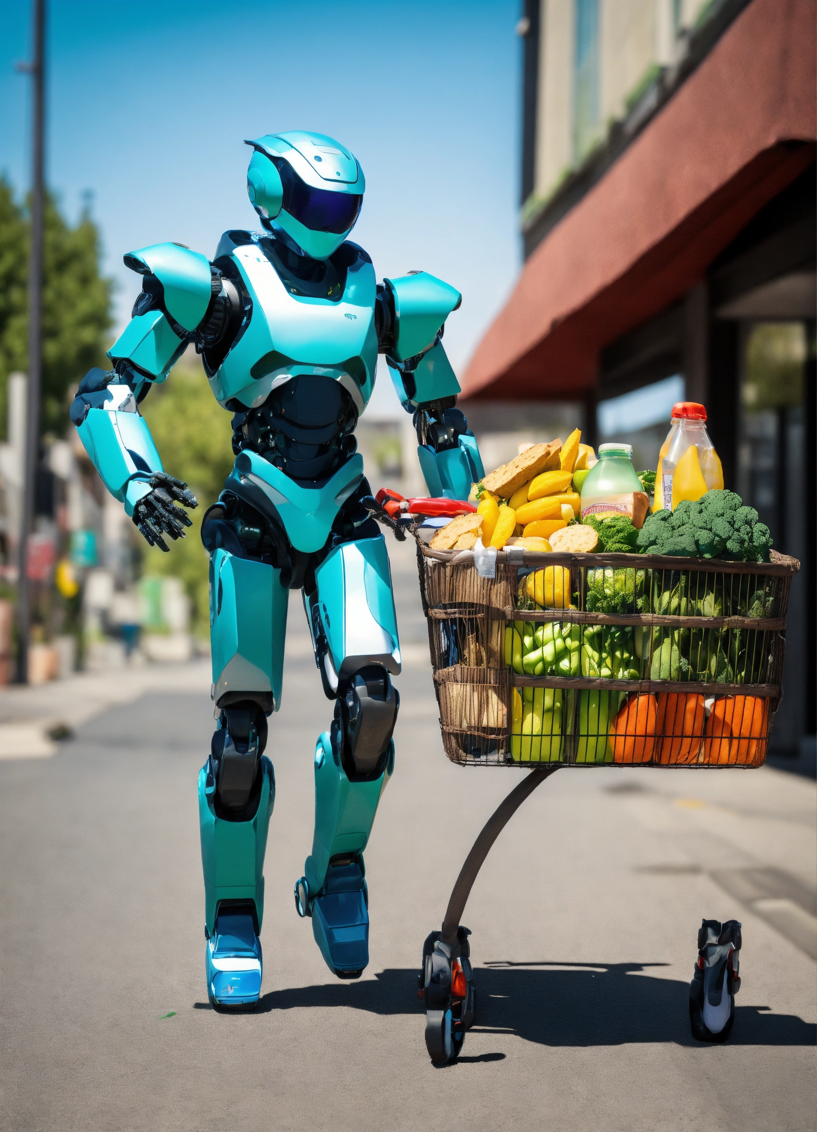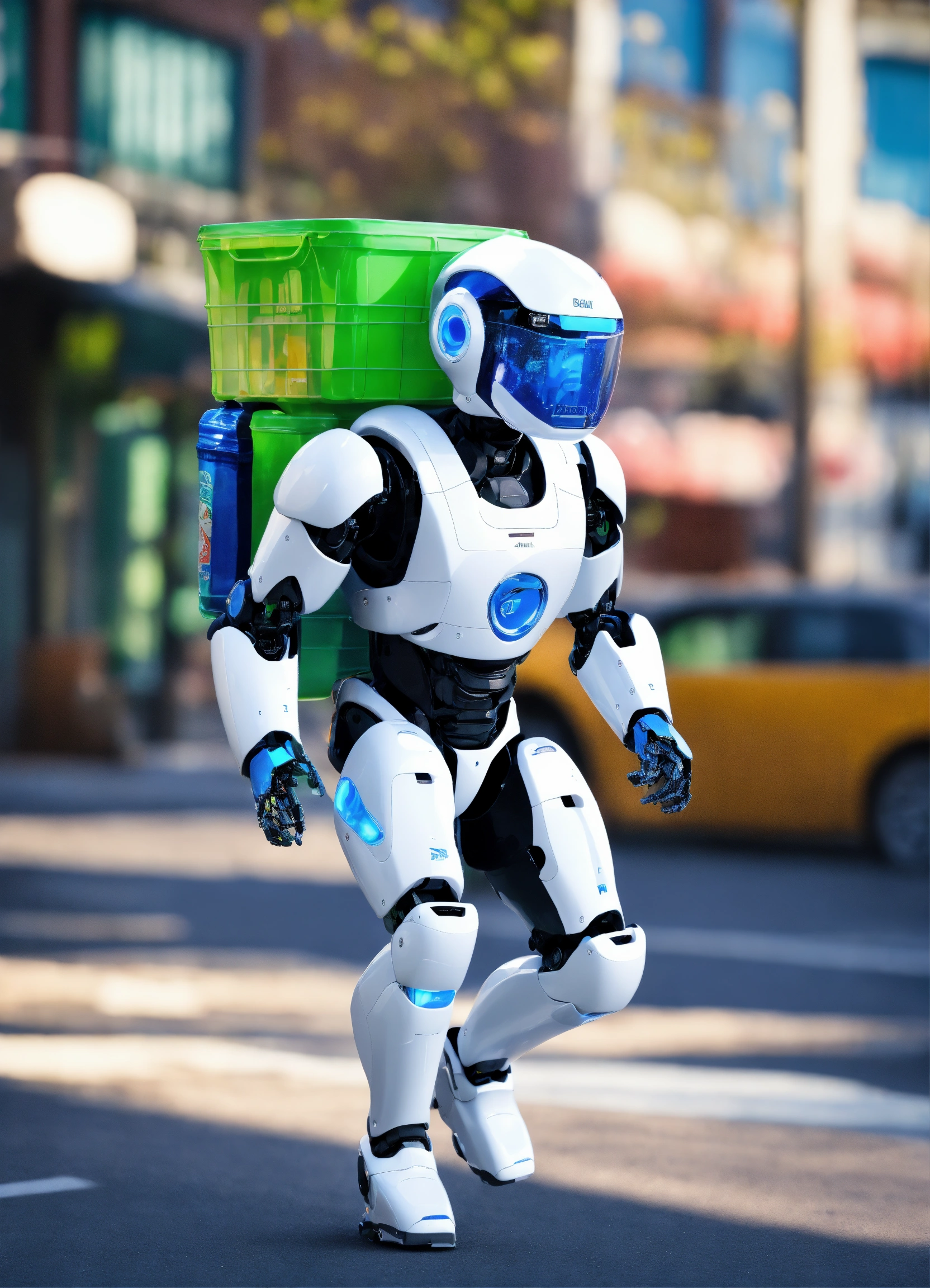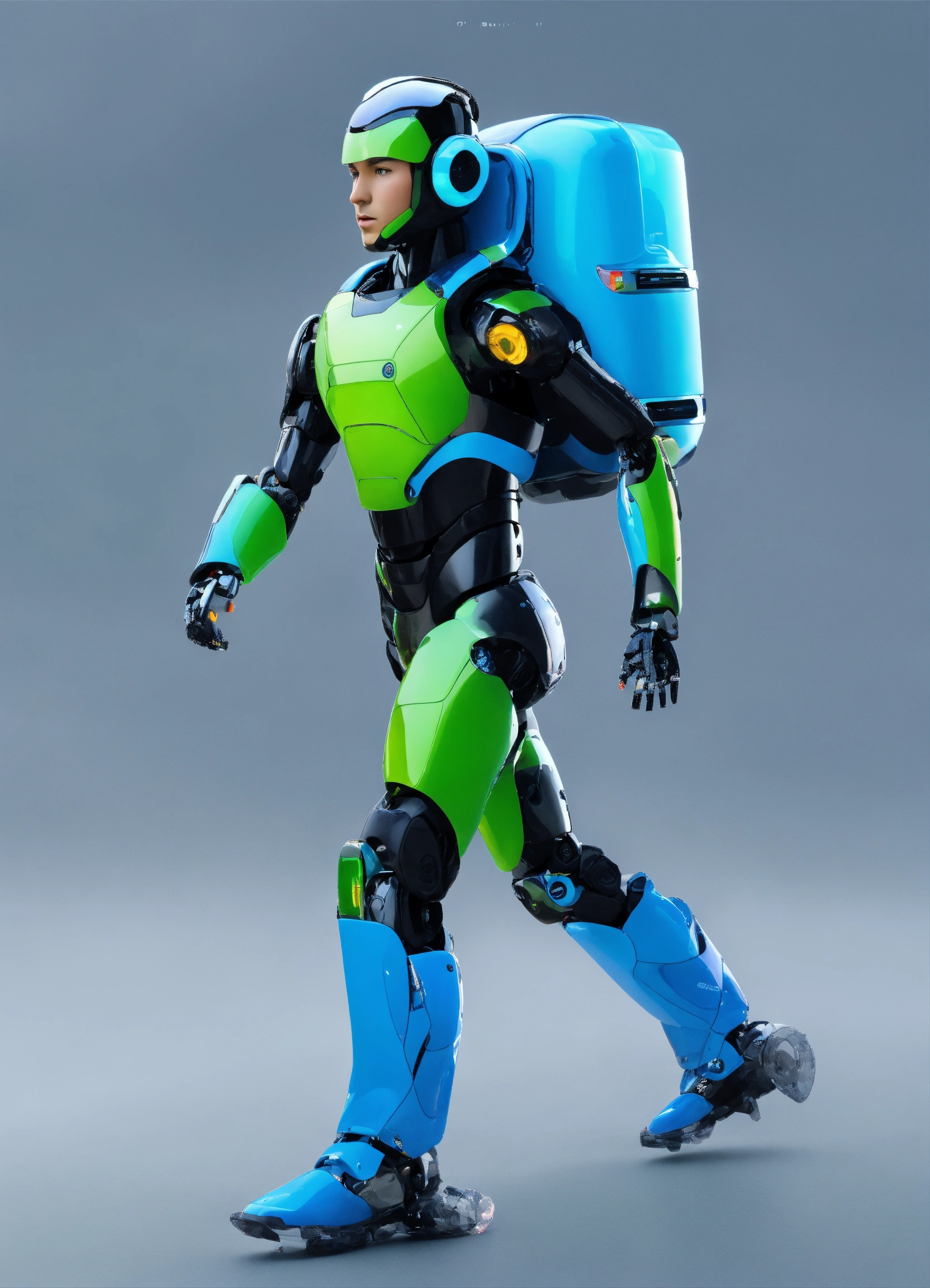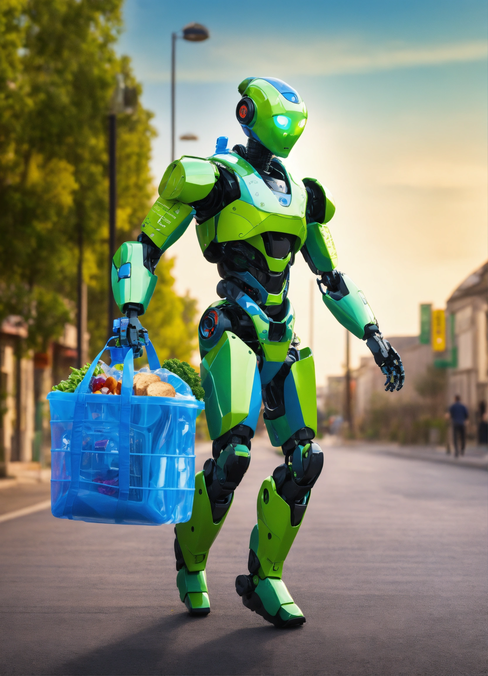 A humanoid robot with realistic man face, with skin and clear eyes, black hair, male, sportive robotic body, running fast. it's delivering groceries, assorted milk bottle, bread pack, soft drink, and some assorted vegetables basket on hands. sports backpack. transparent background, the predominant design colors are gradients of blue and green. transparent background, no background image, background should be gradients of blue and green, realistic face