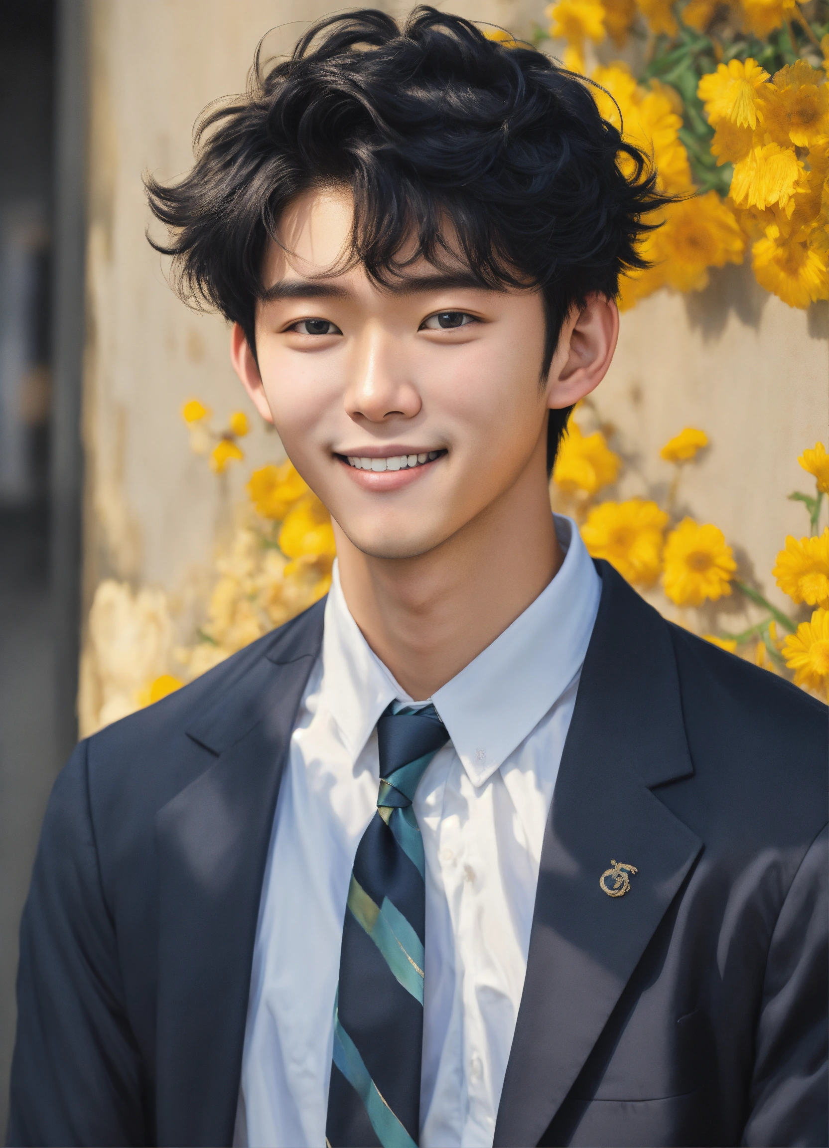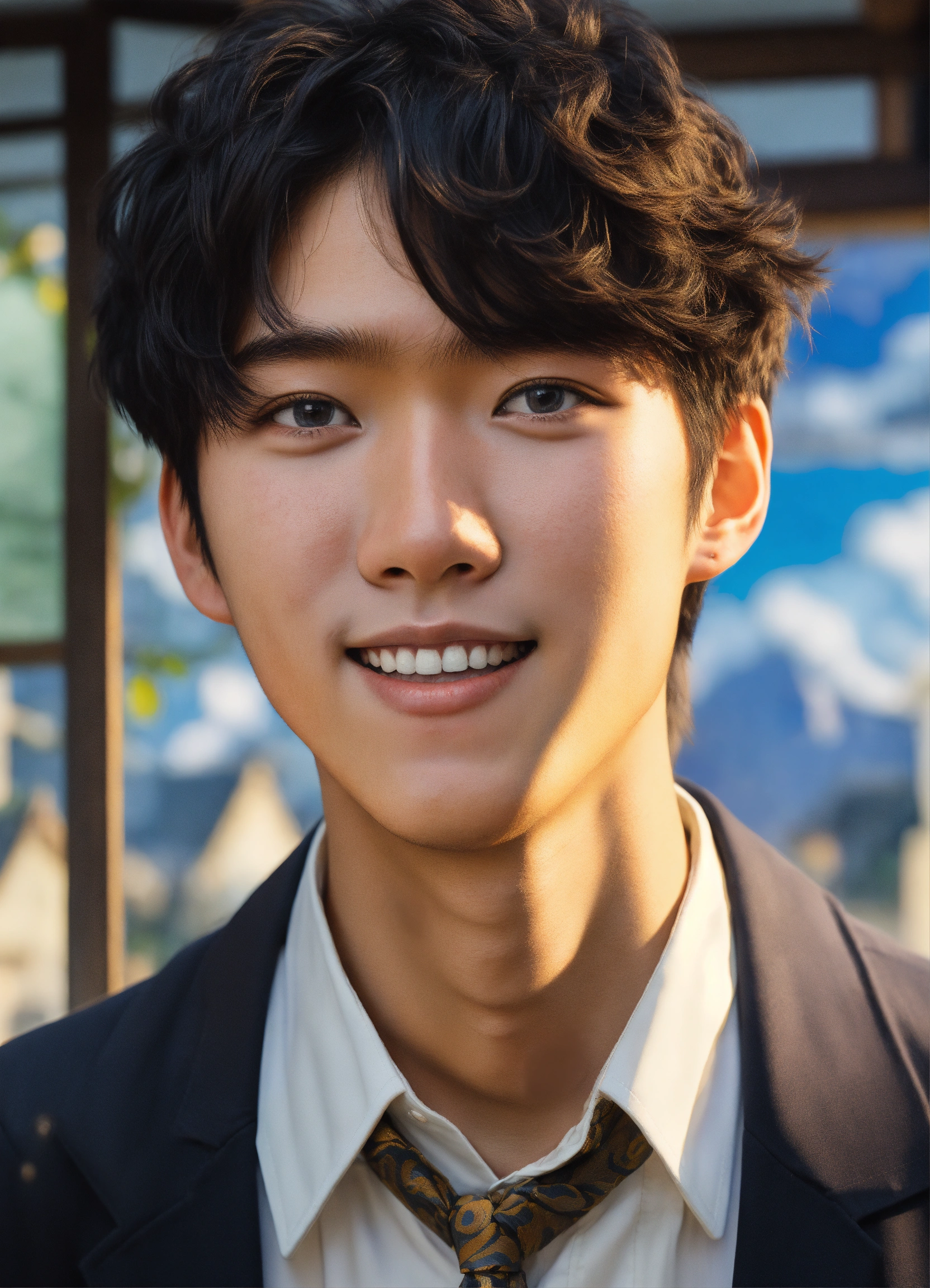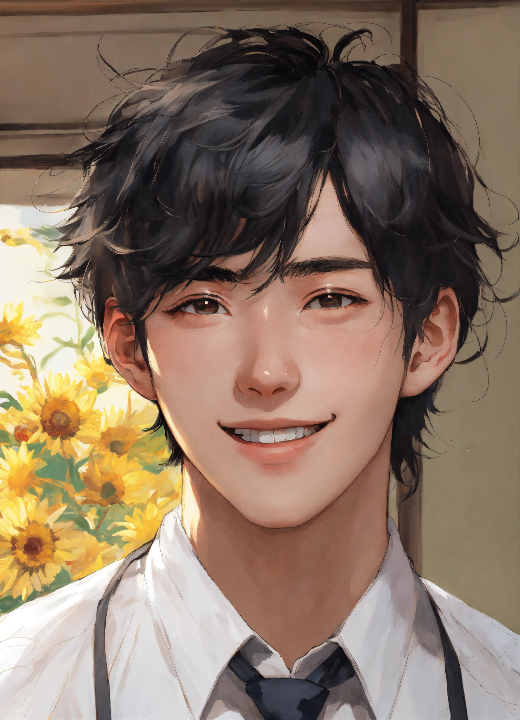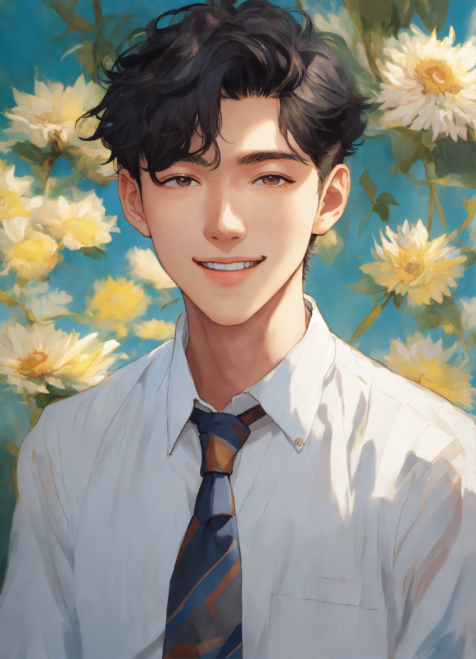 Japanese, 18 years old, male, baby face, black hair, permed hair, fair skin, wide smile, van gogh-like illustration, only the upper body is shown, dressed in a white shirt and tie.