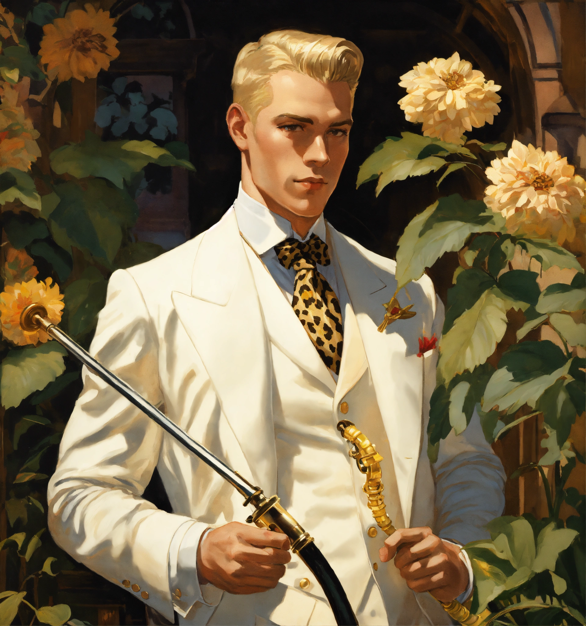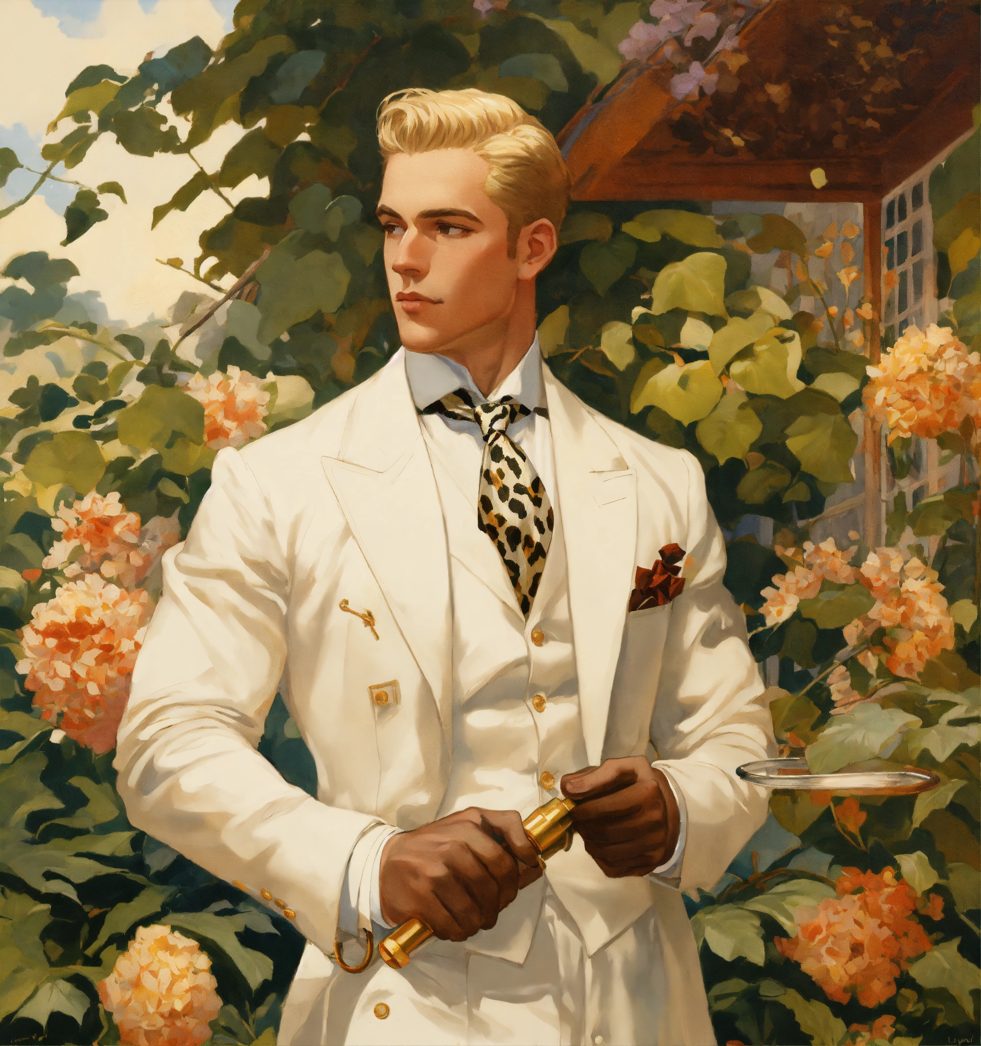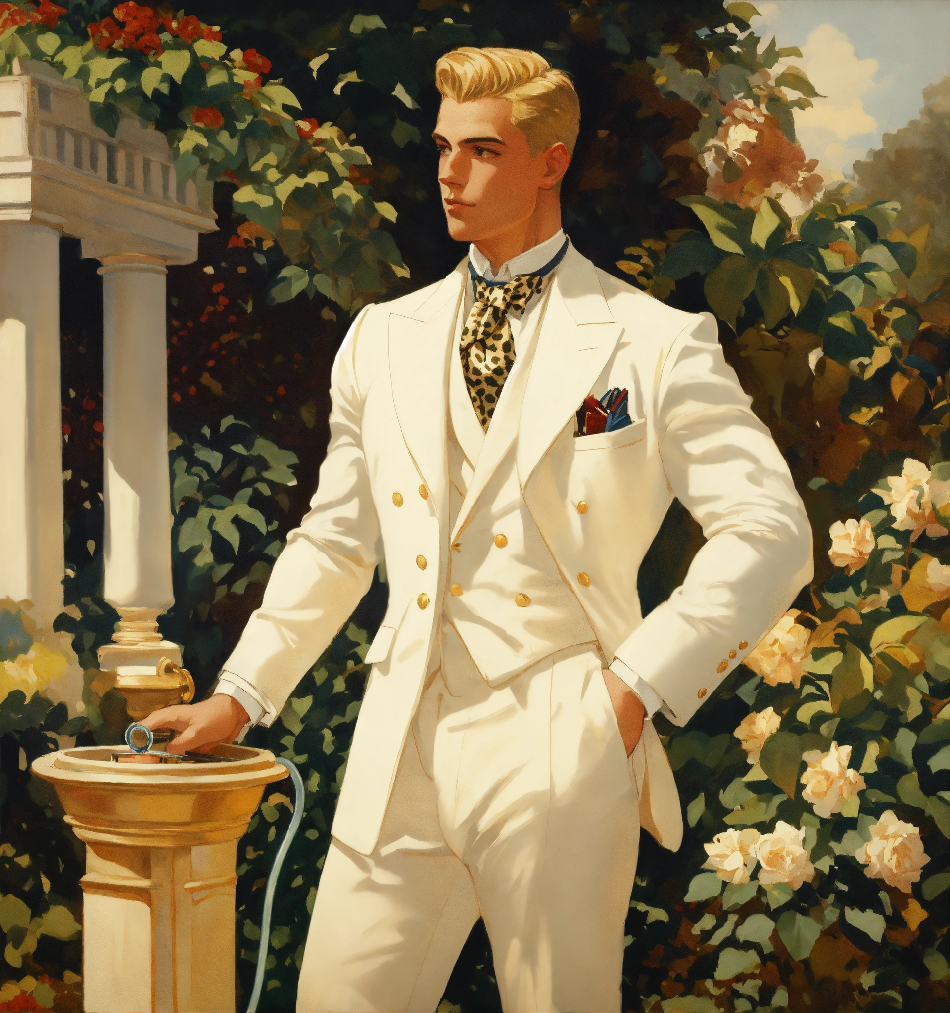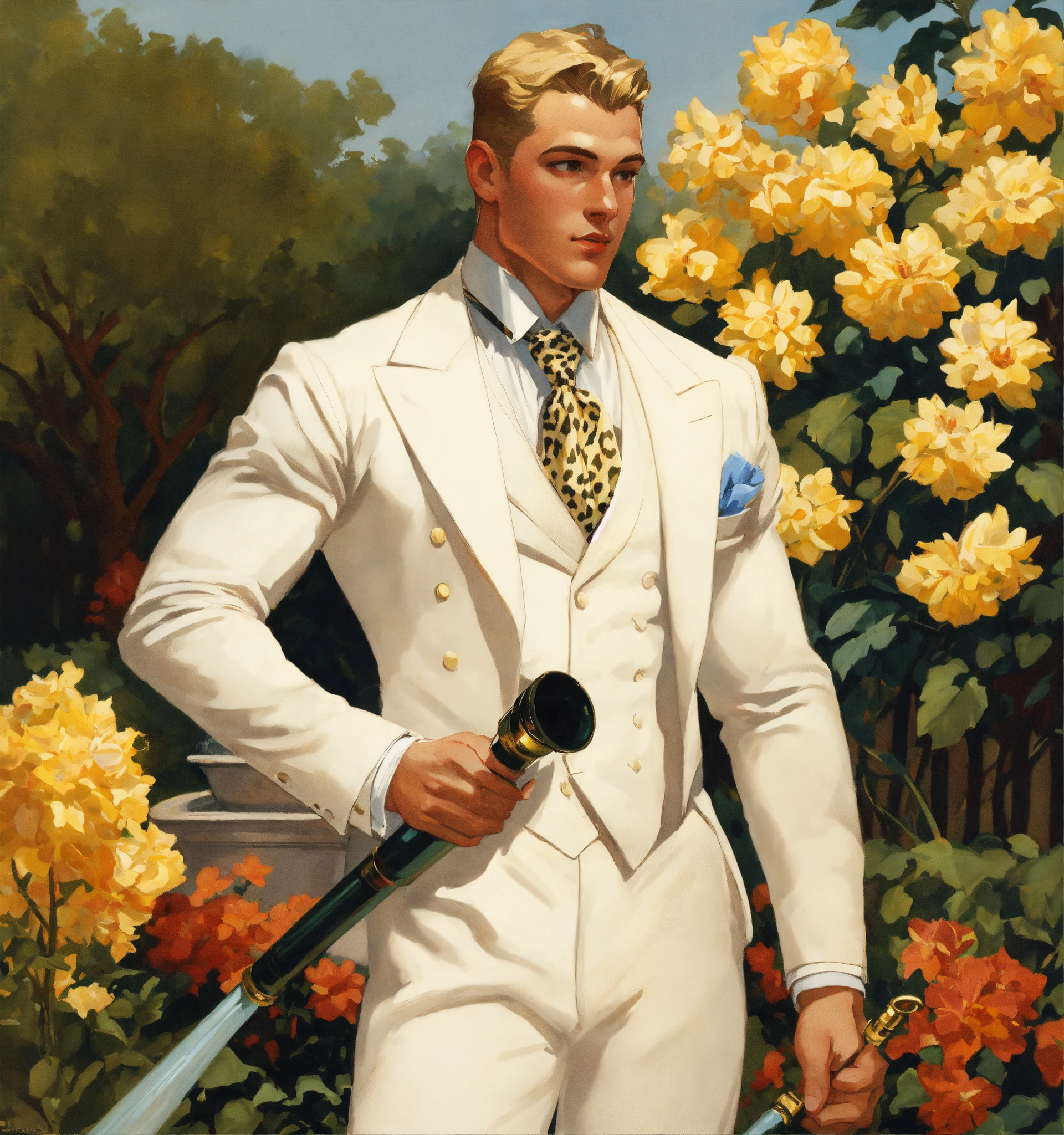 A muscled male gentleman in white vested suit, leopard tie, blonde brushed hair, holding a hosepipe in a garden, leyendecker style