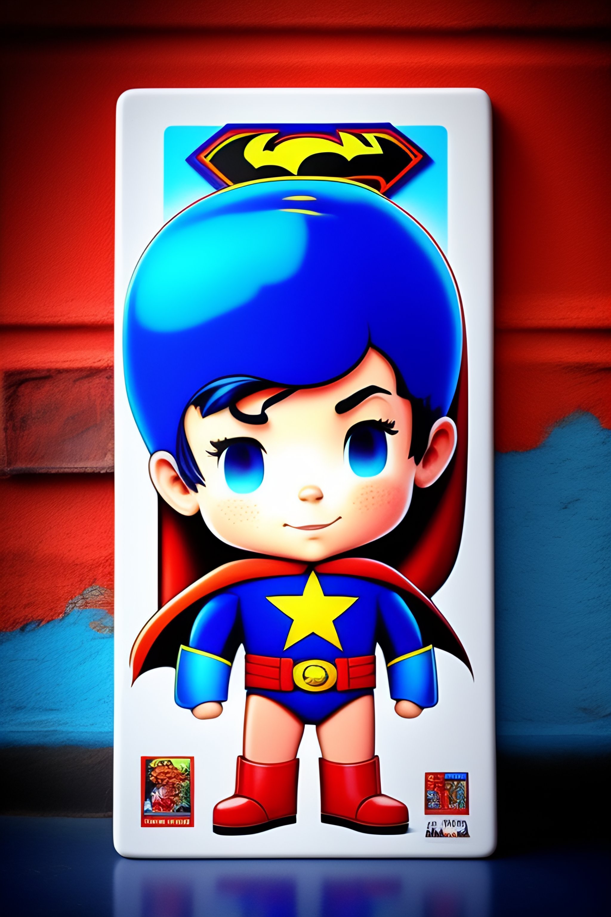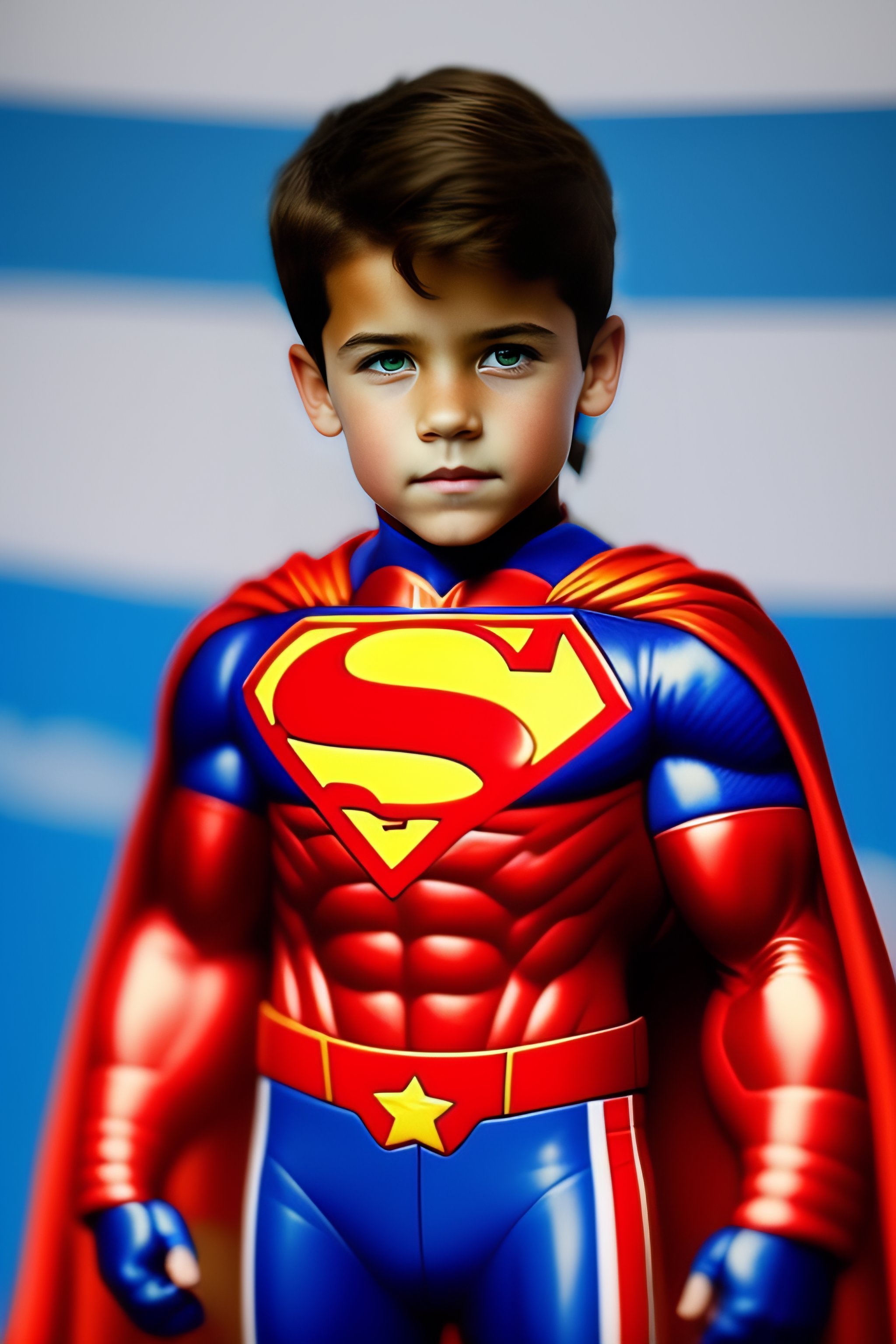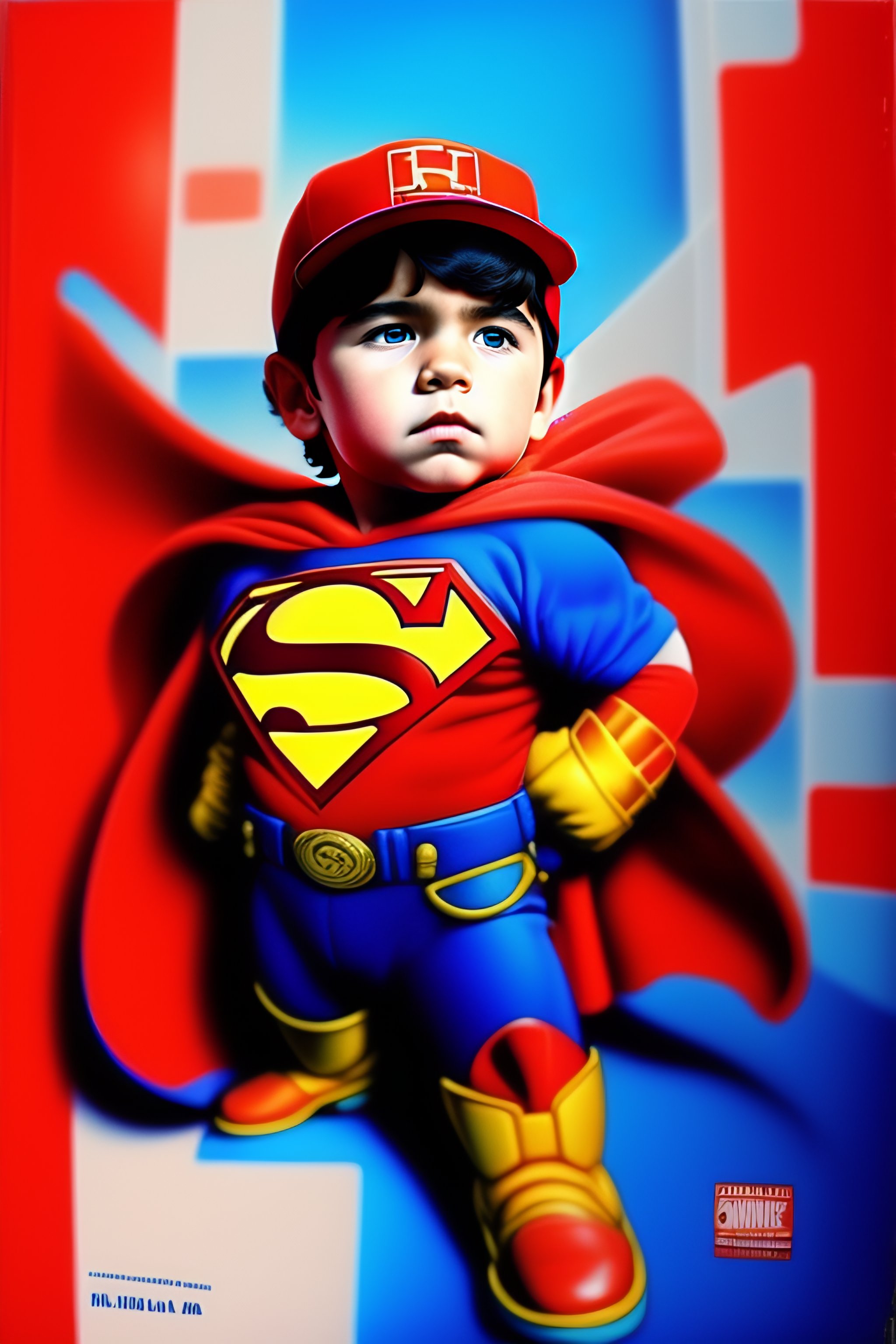 Super heroe, niño blanco 10 años dibujo animado, con traje super heroe color azul y rojo, para marketing de mini market