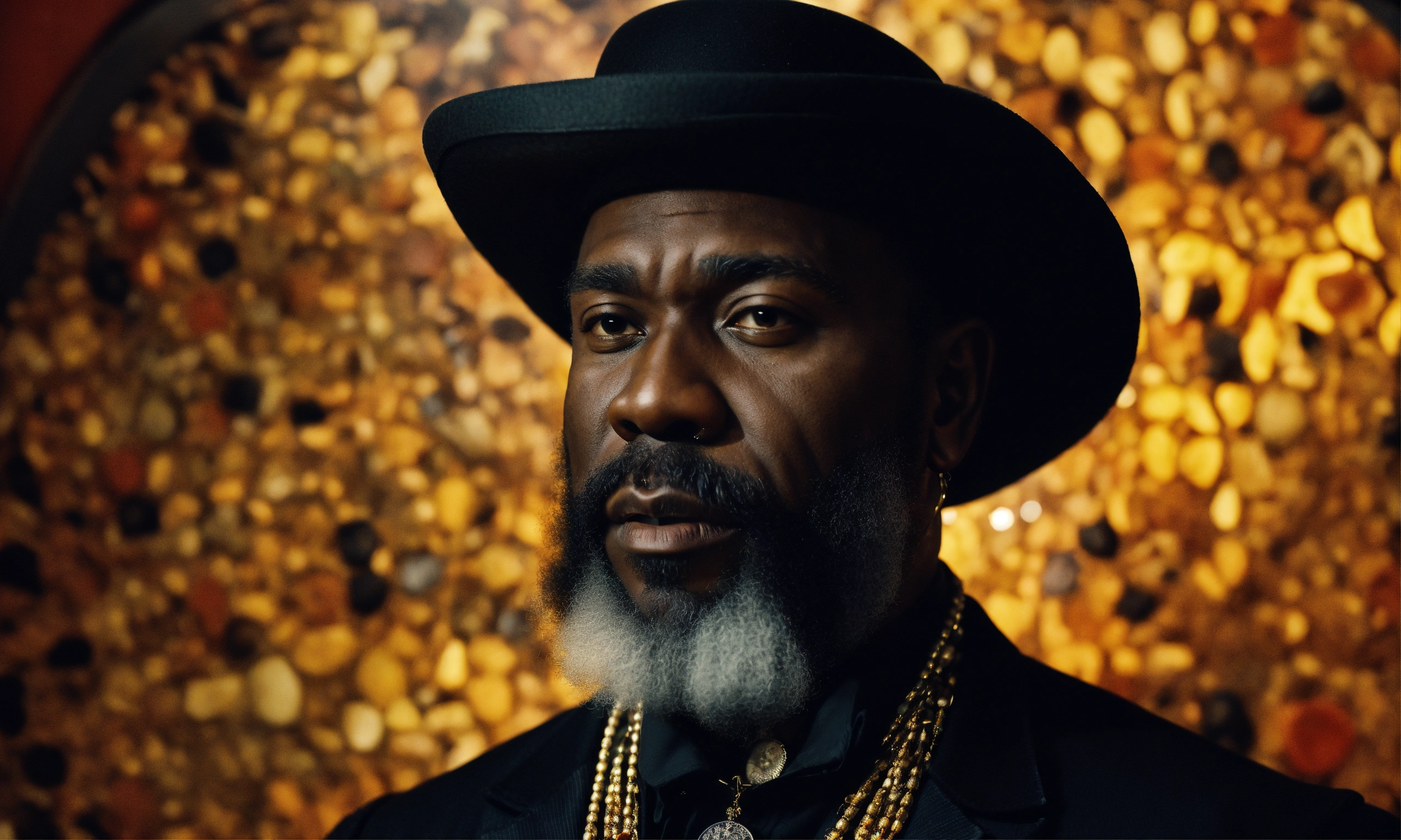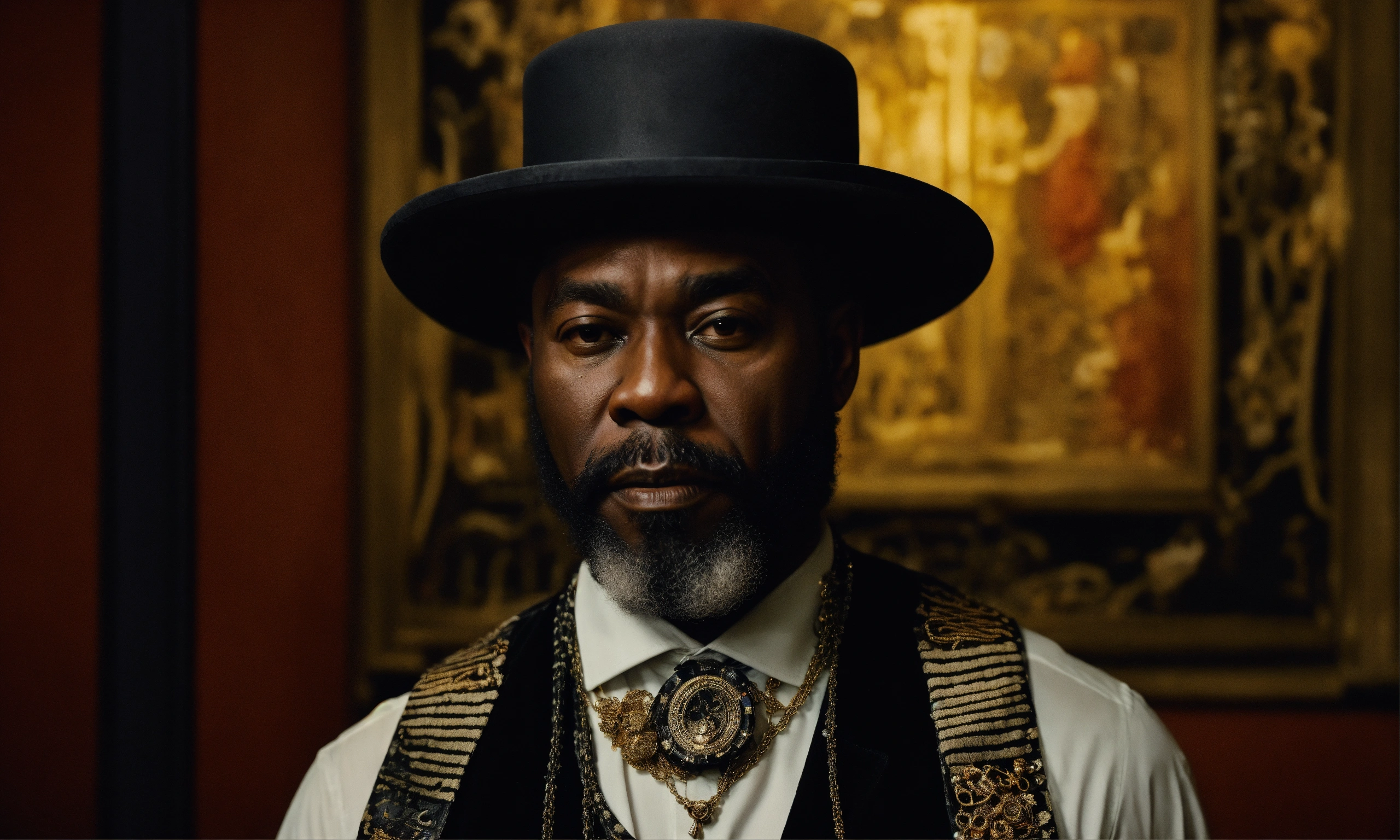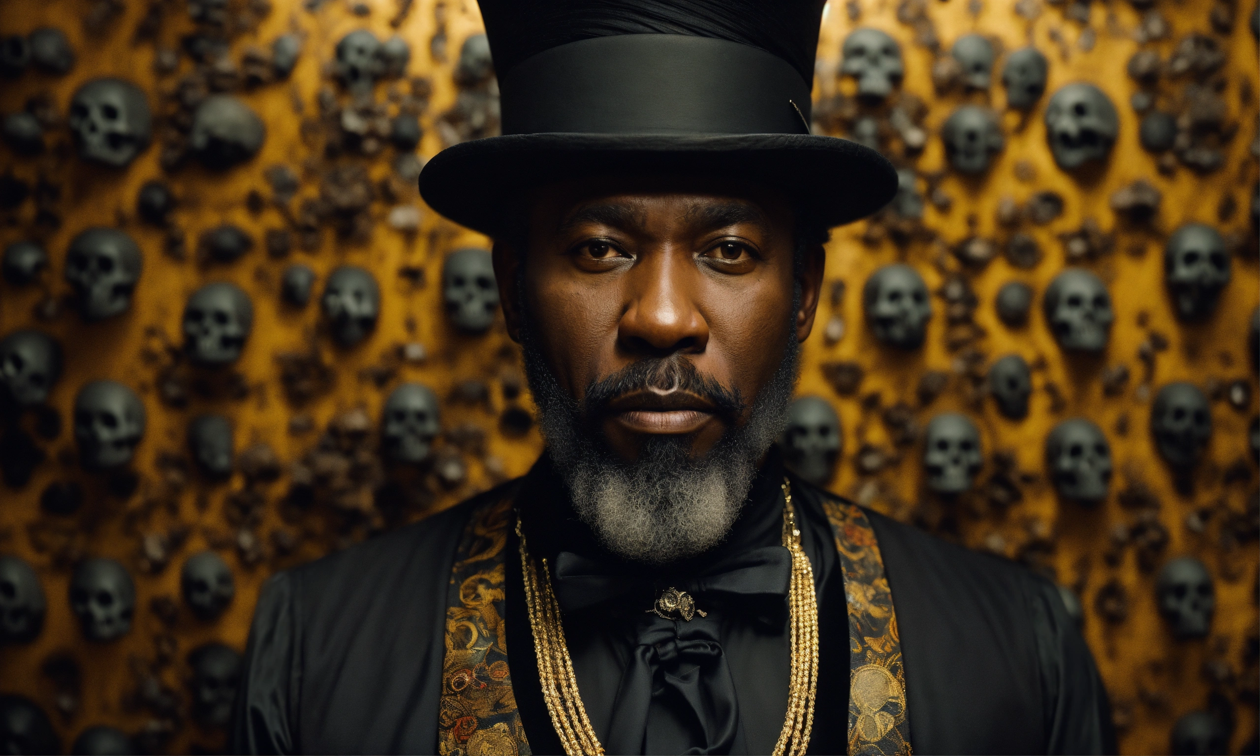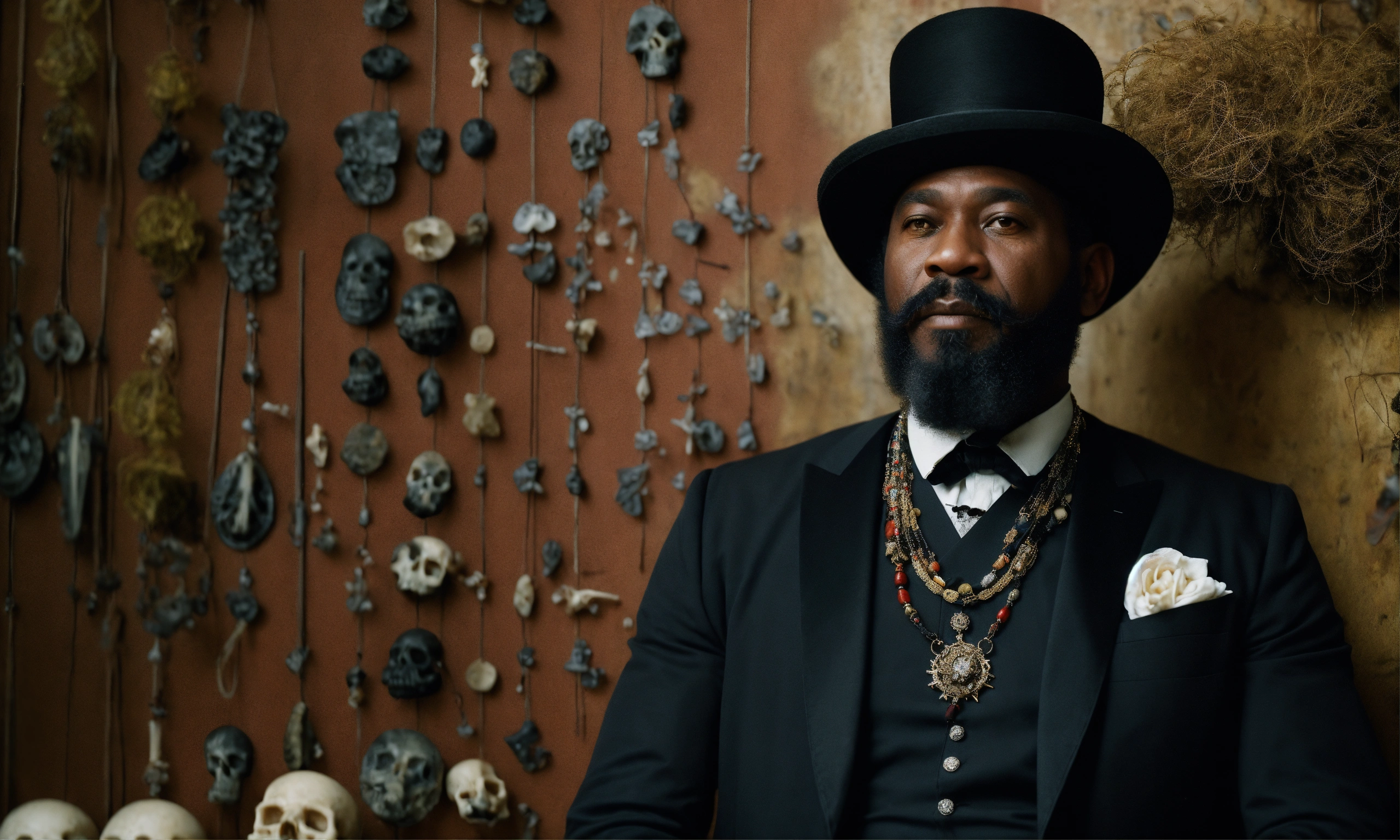 Portrait of middle-aged, black man with a beard, voodoo priest, wearing a black top hat and vest, a necklace made of cells and bones around his neck, hyper-realistic, shot by annie leibowitz