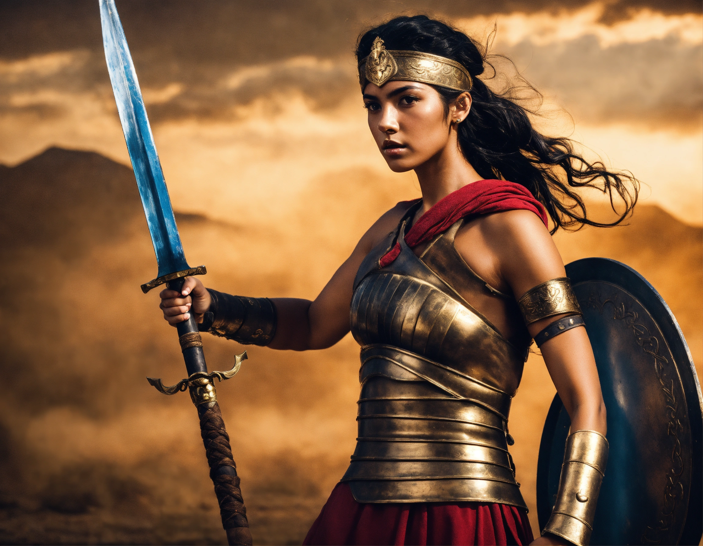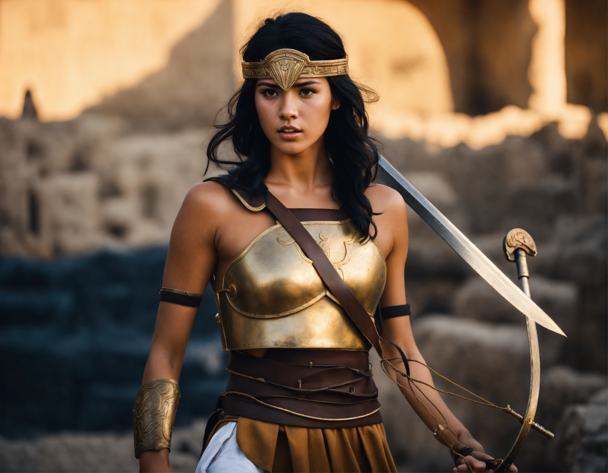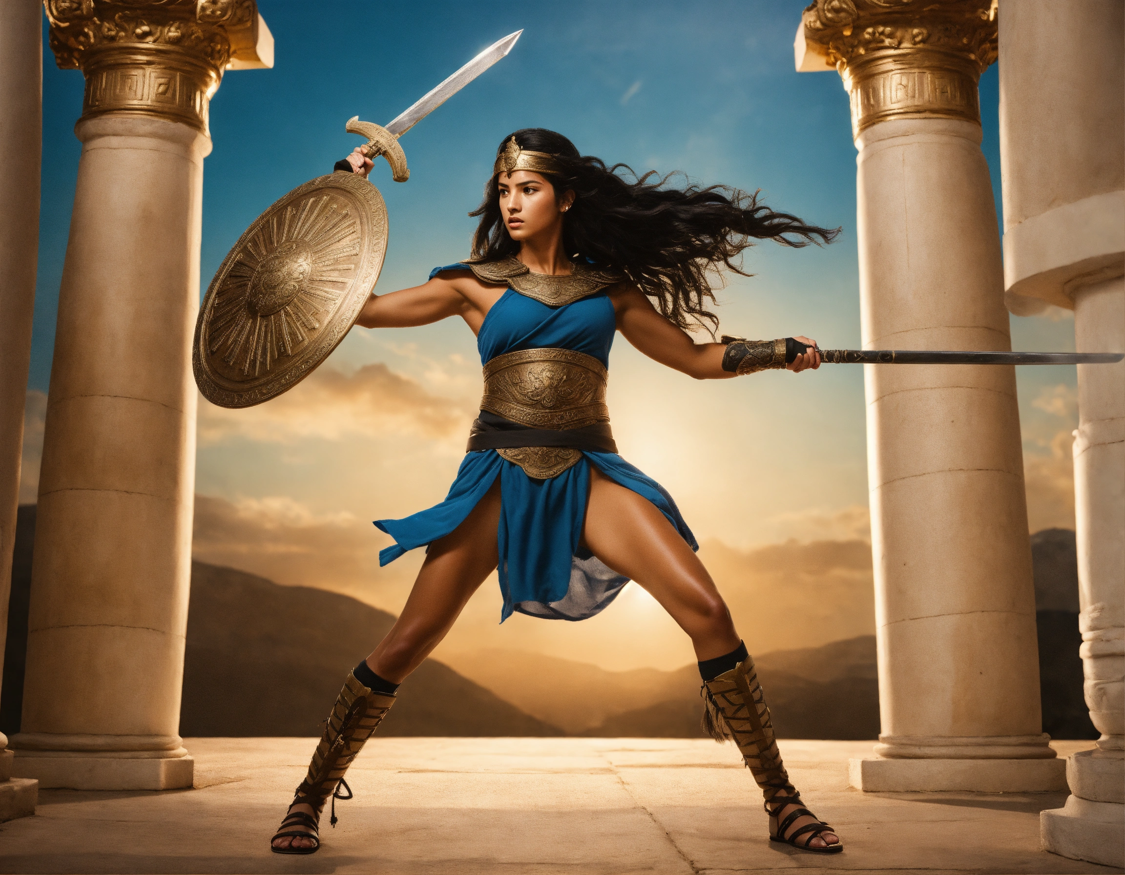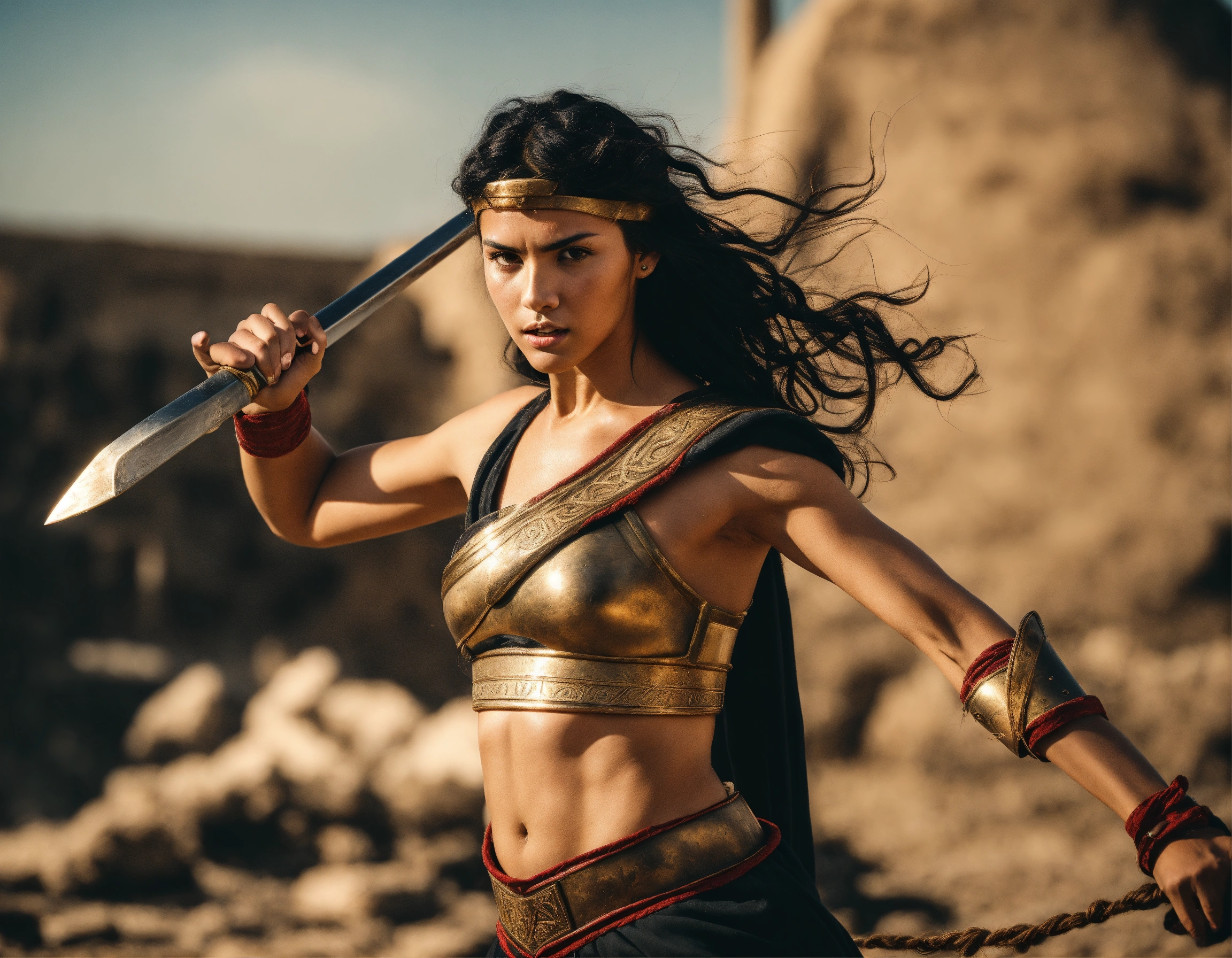 Skinny young woman with tan skin and black hair dressed as a greek warrior fighting in a battle