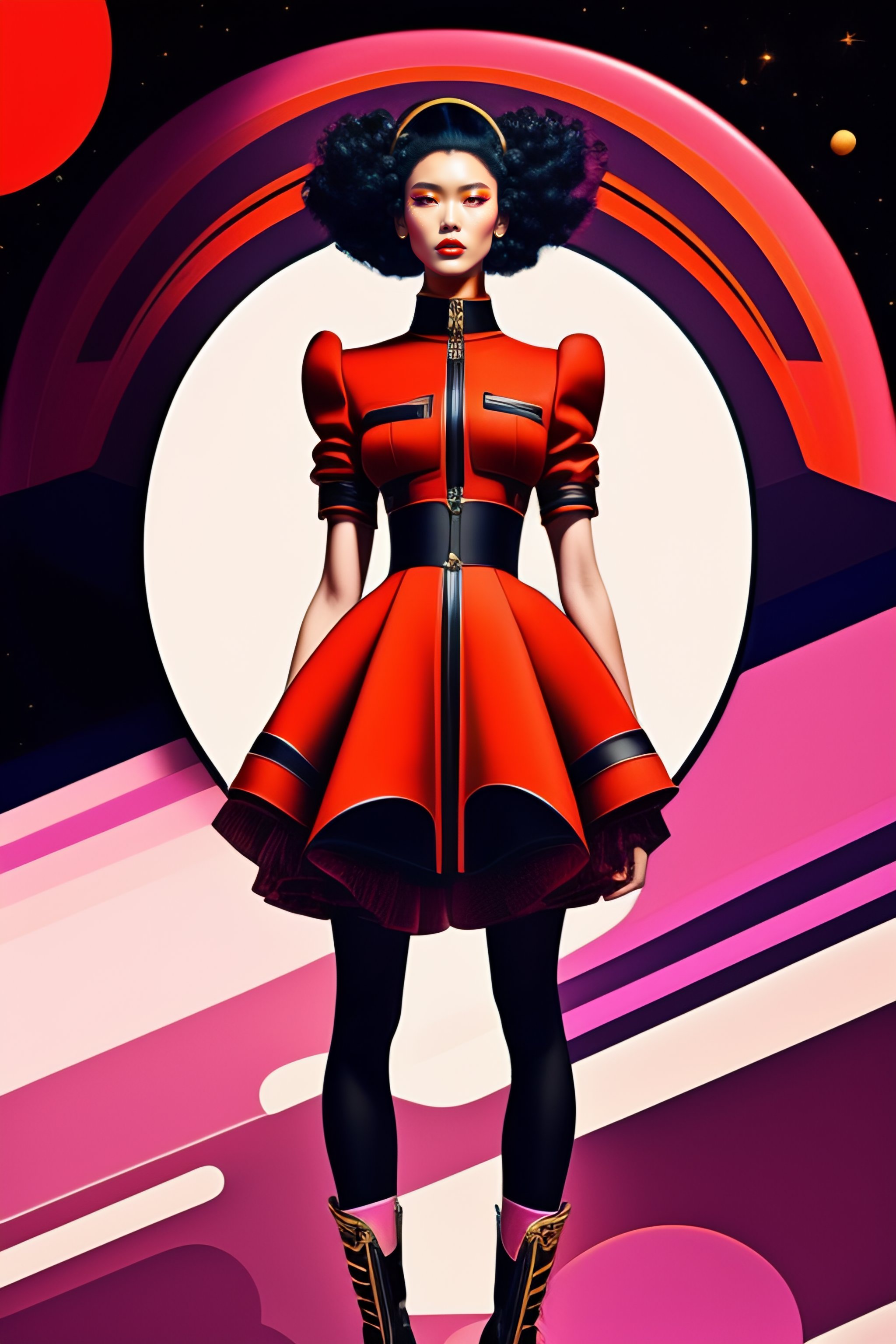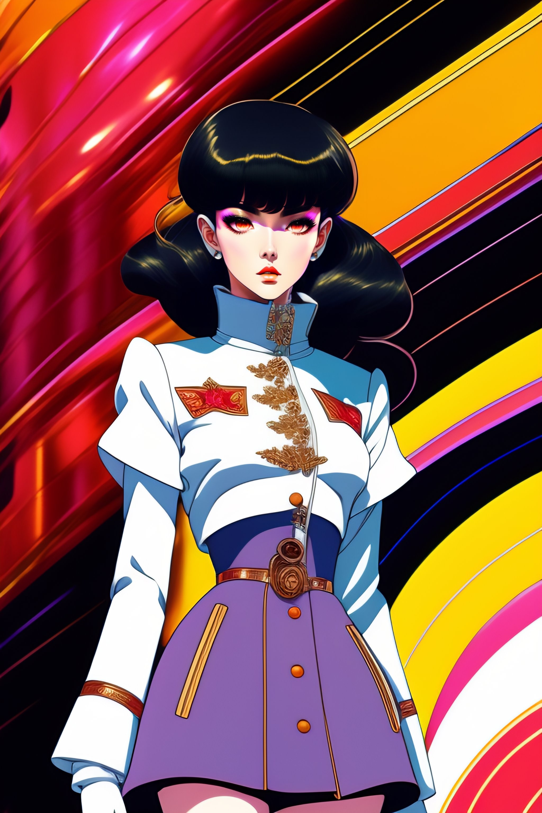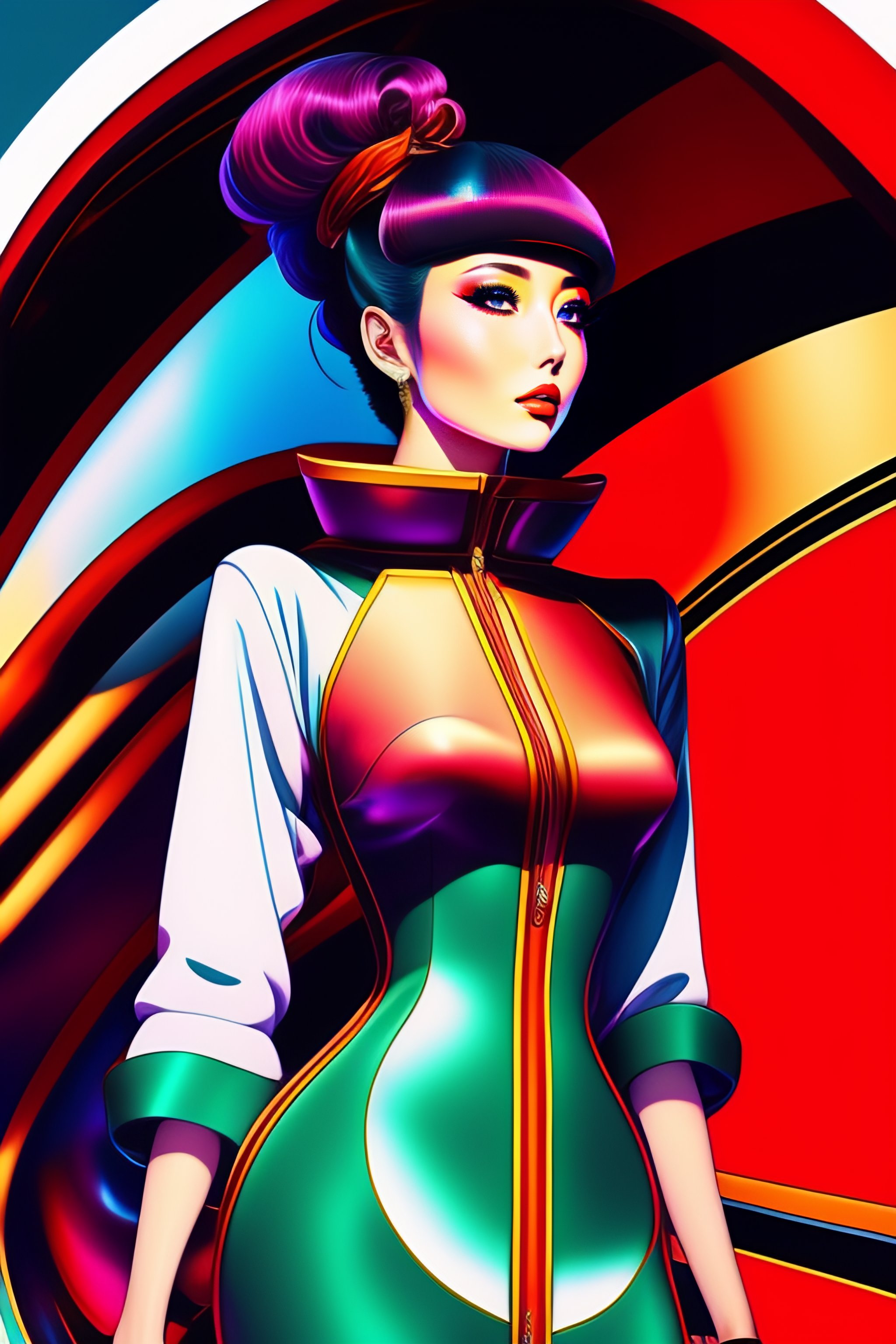 Stylish haute couture outfit worn by model in the style of 90's vintage anime, surrealism, akira style. detailed line art. fine details. inside a space ship.