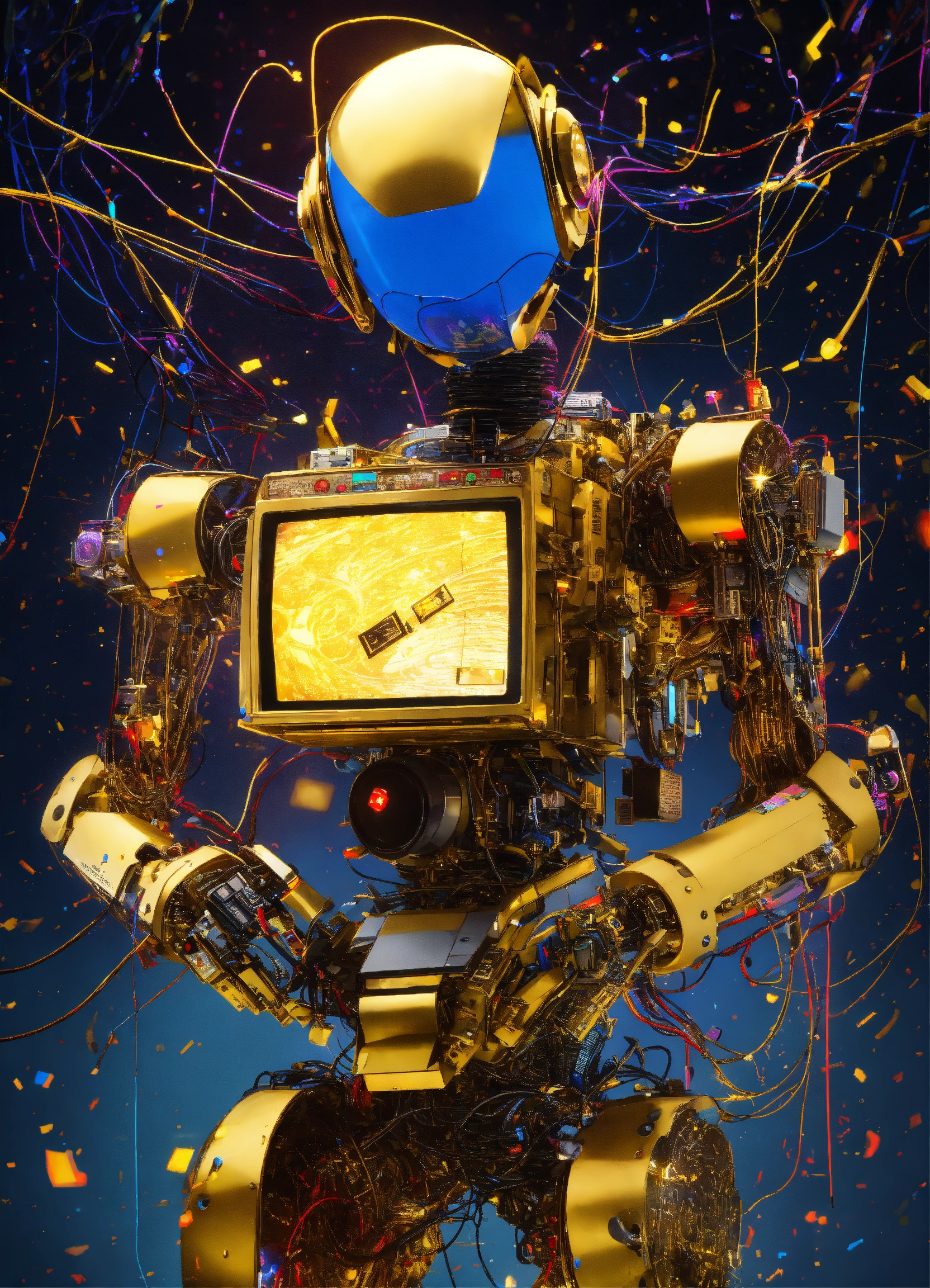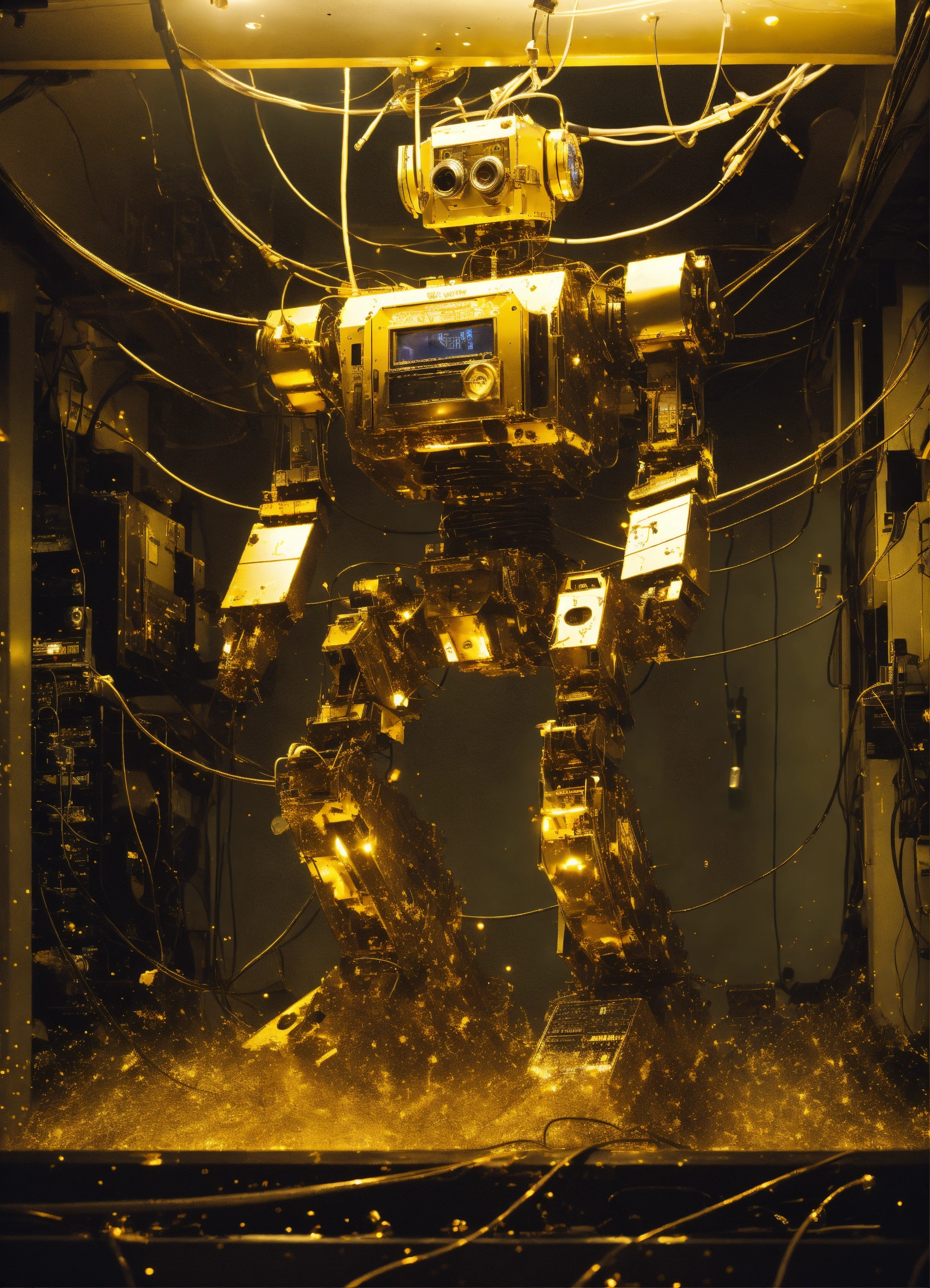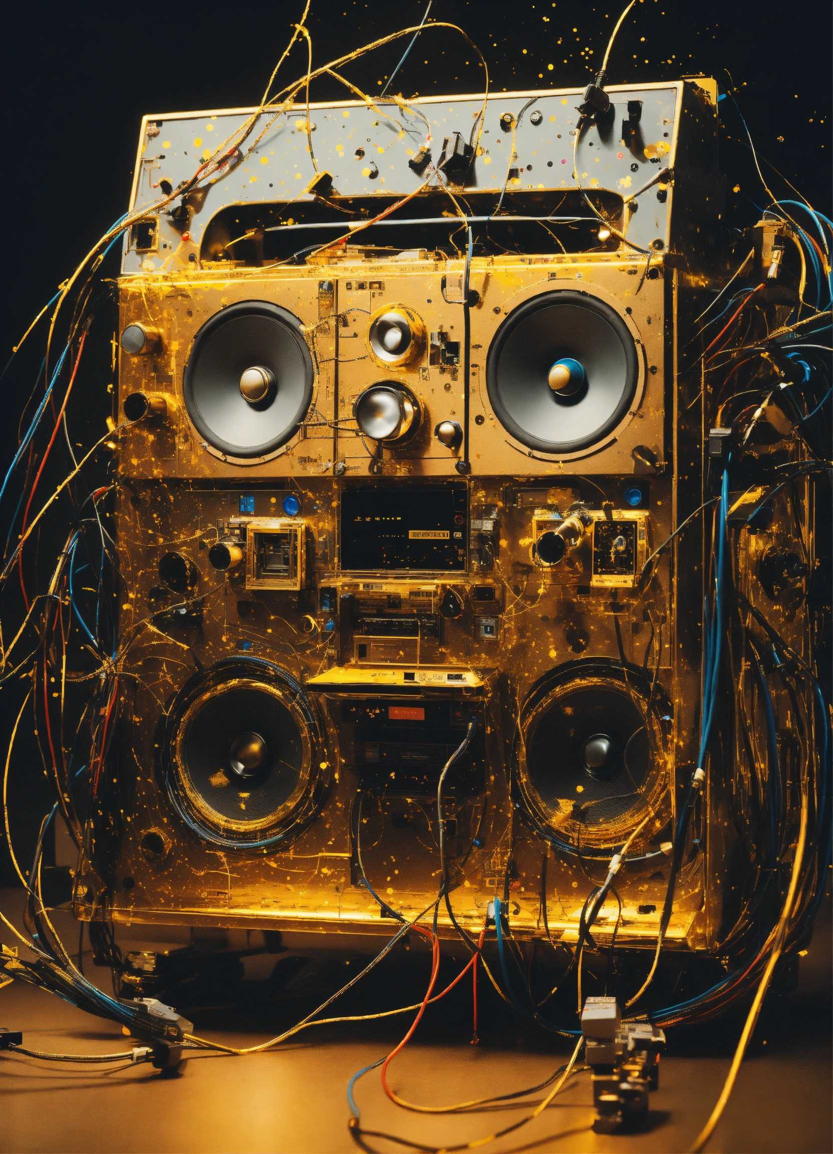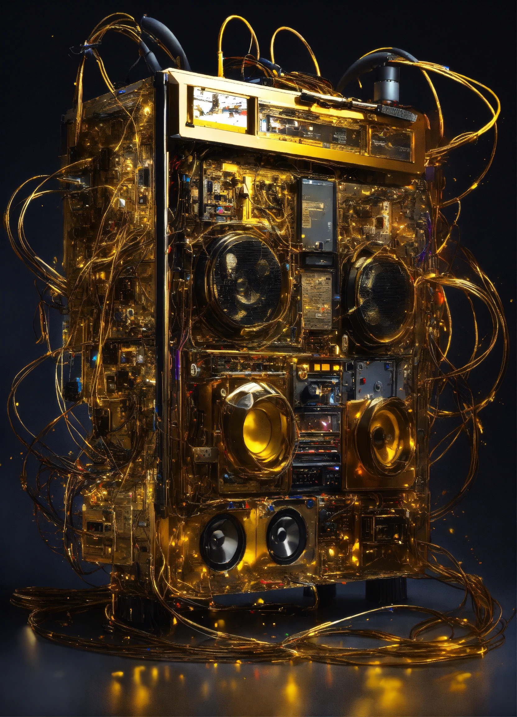 Shaded colors low-angle view shot photography of a robot body emerged from spiral dark gold ink dots splatters, flying huge 3d plexiglass multi cassette ghetto blaster, play station, screeen computer, full of cables and wires, with big boomers, 80 degree view