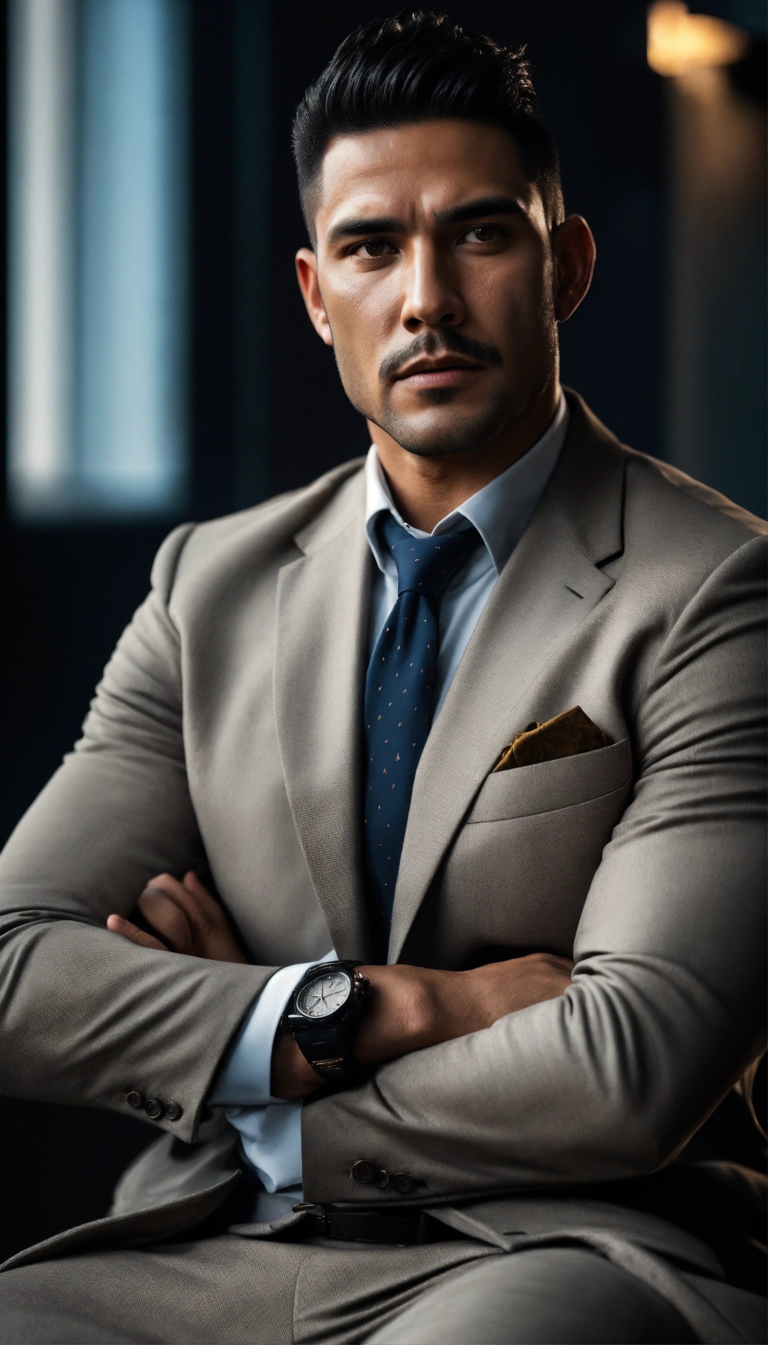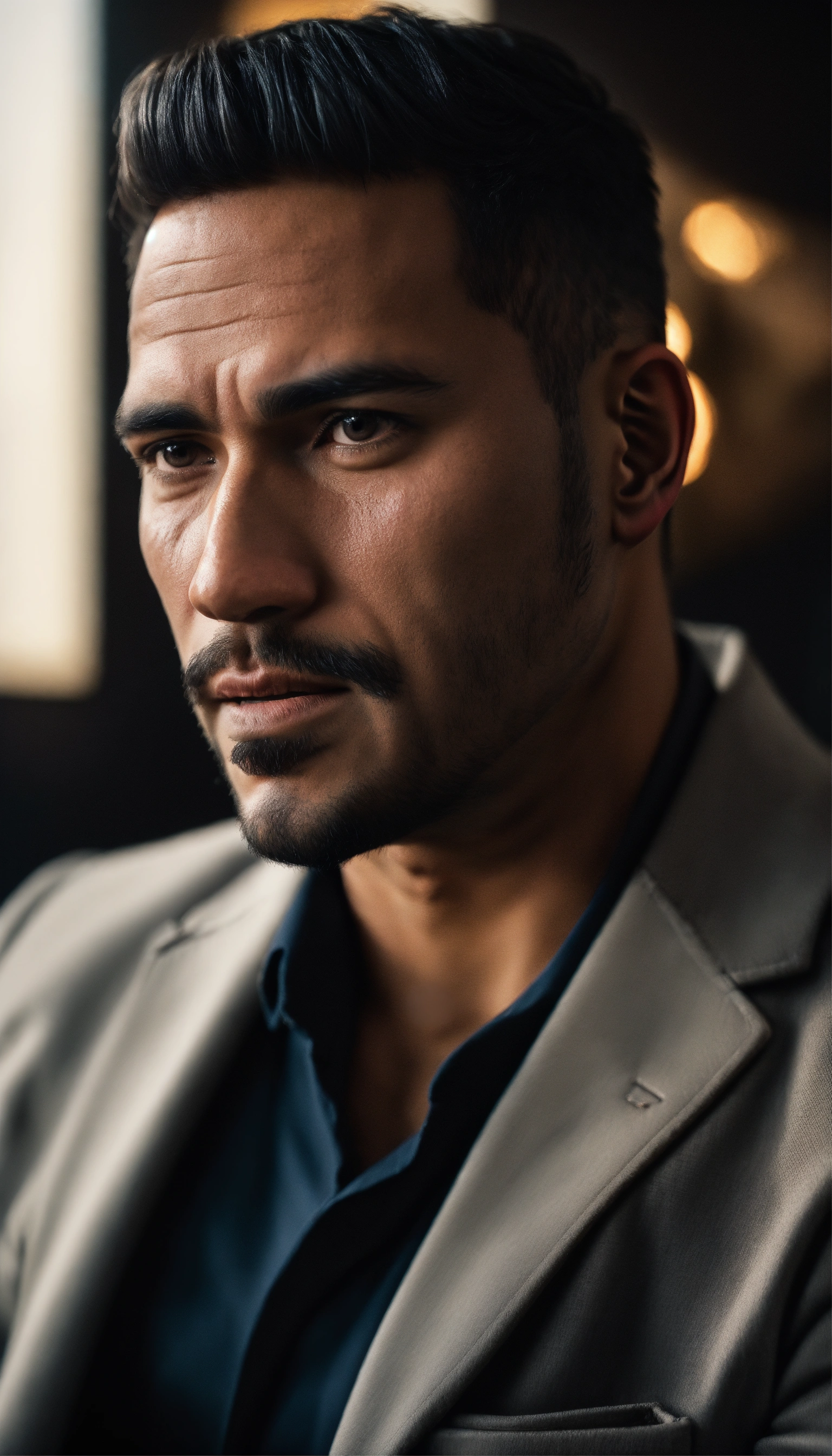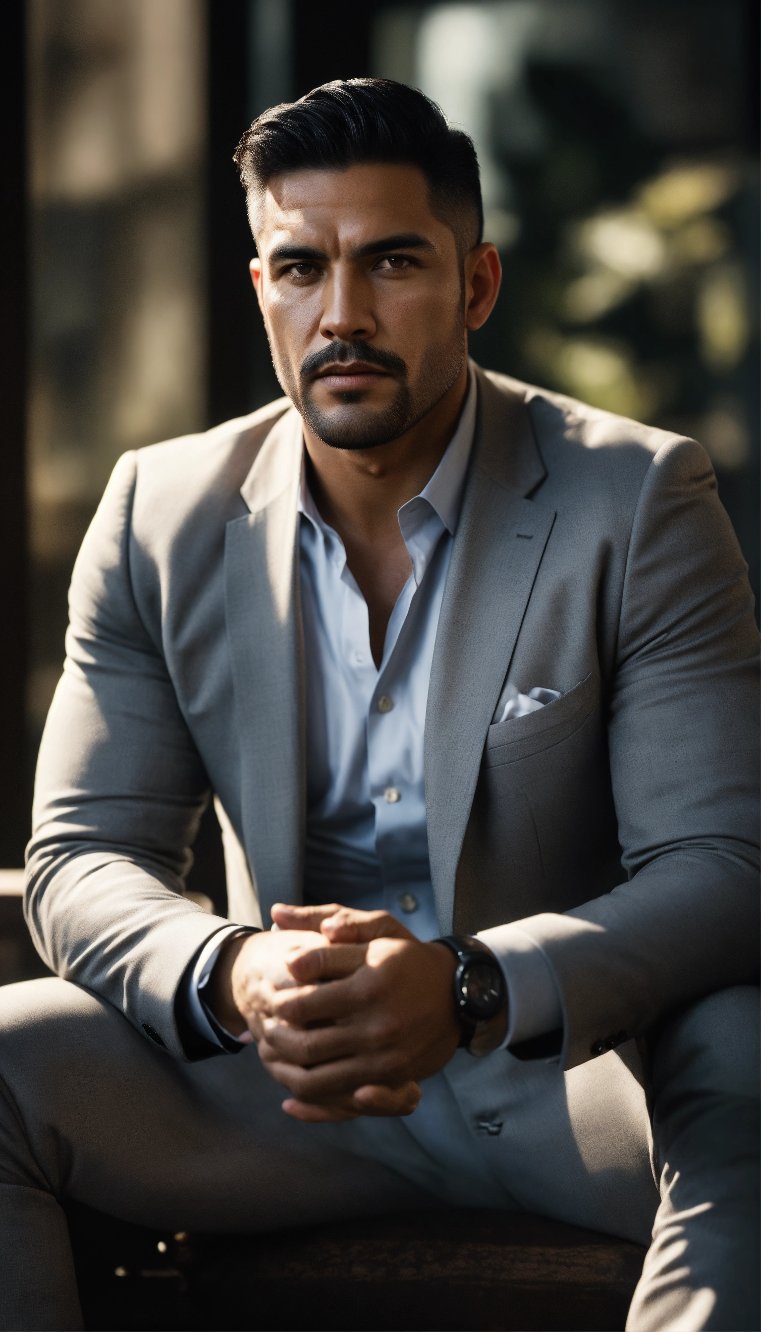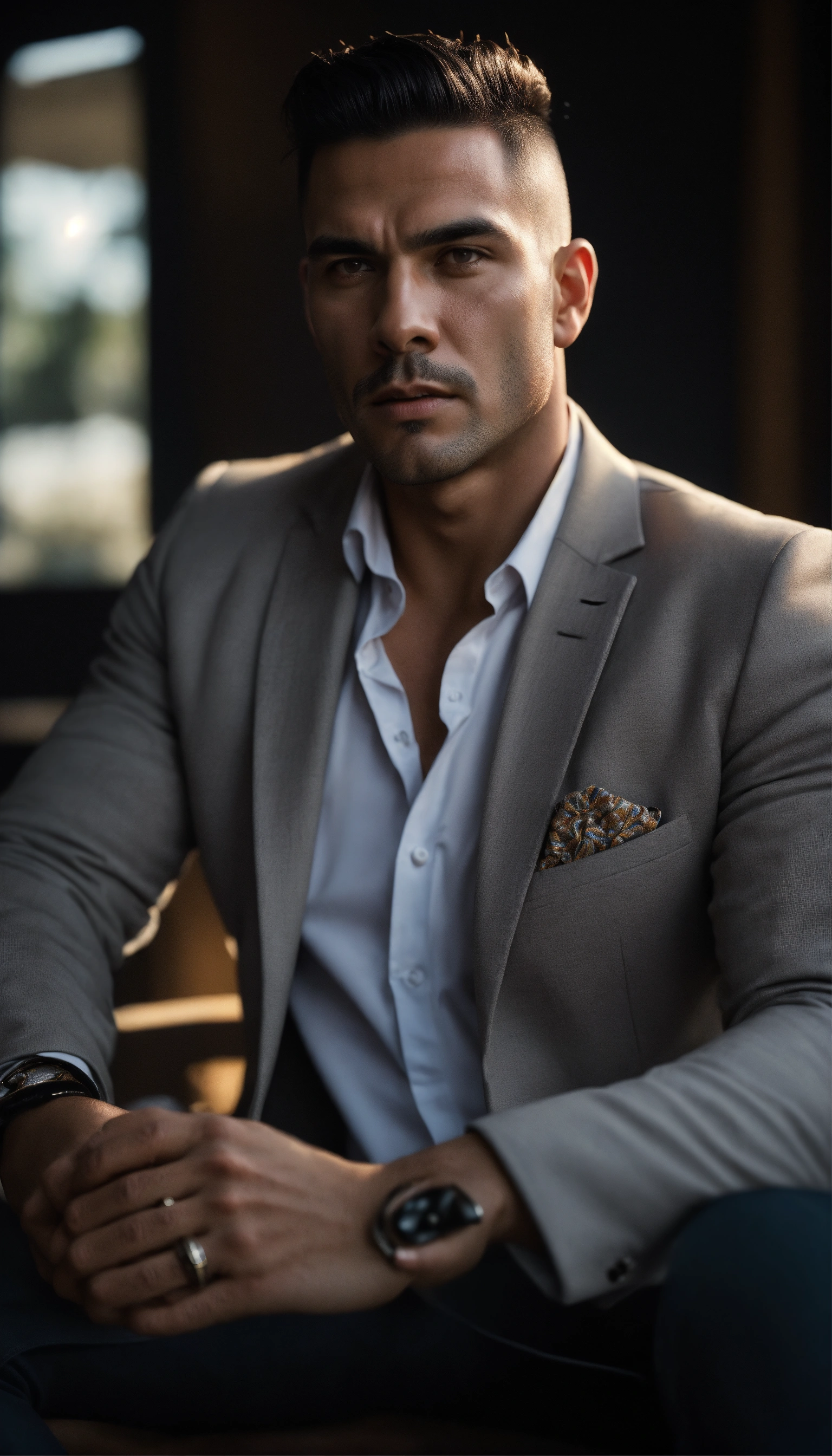 A detailed photograph of a confident looking latino, sitting, hands relaxed, square jaws, masculine shaved face, wrinkles, buff looking, wearing a light gray blazer, realistic skin texture, black background, sharp focus, front view, waist up shot, high contrast, natural sunlight, action film dark color lut, cinematic luts, 8k