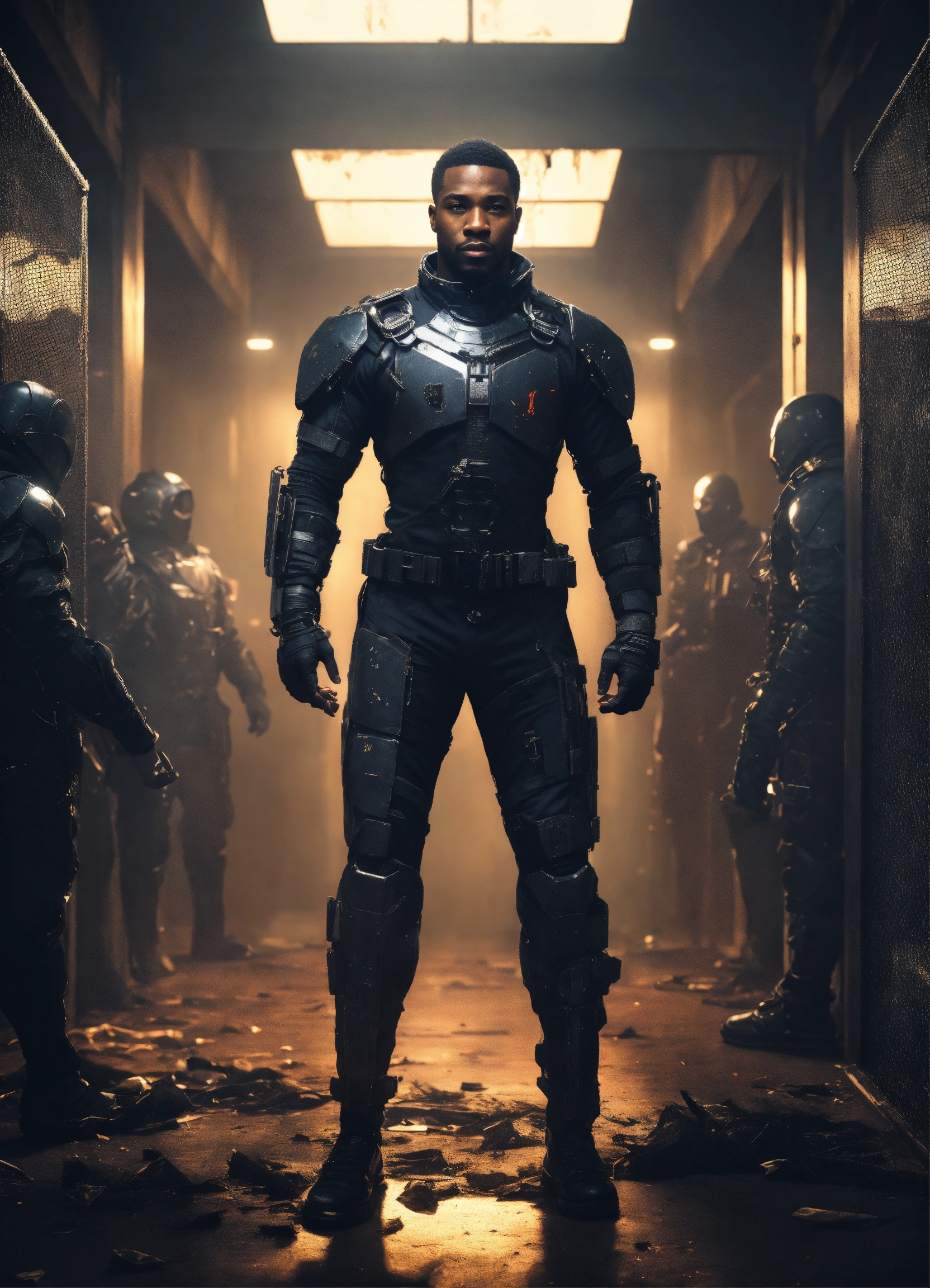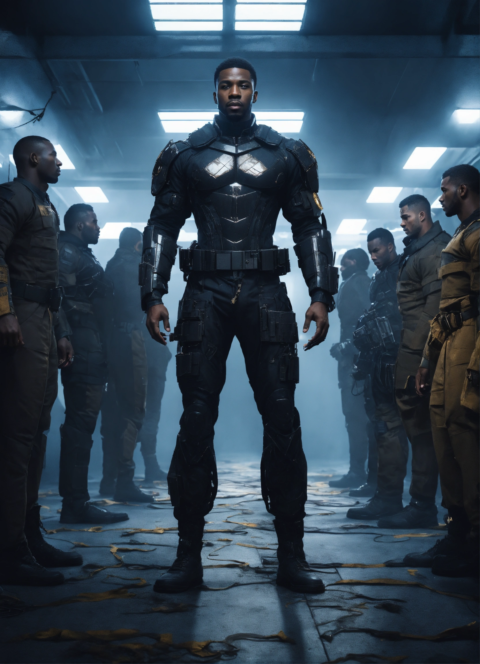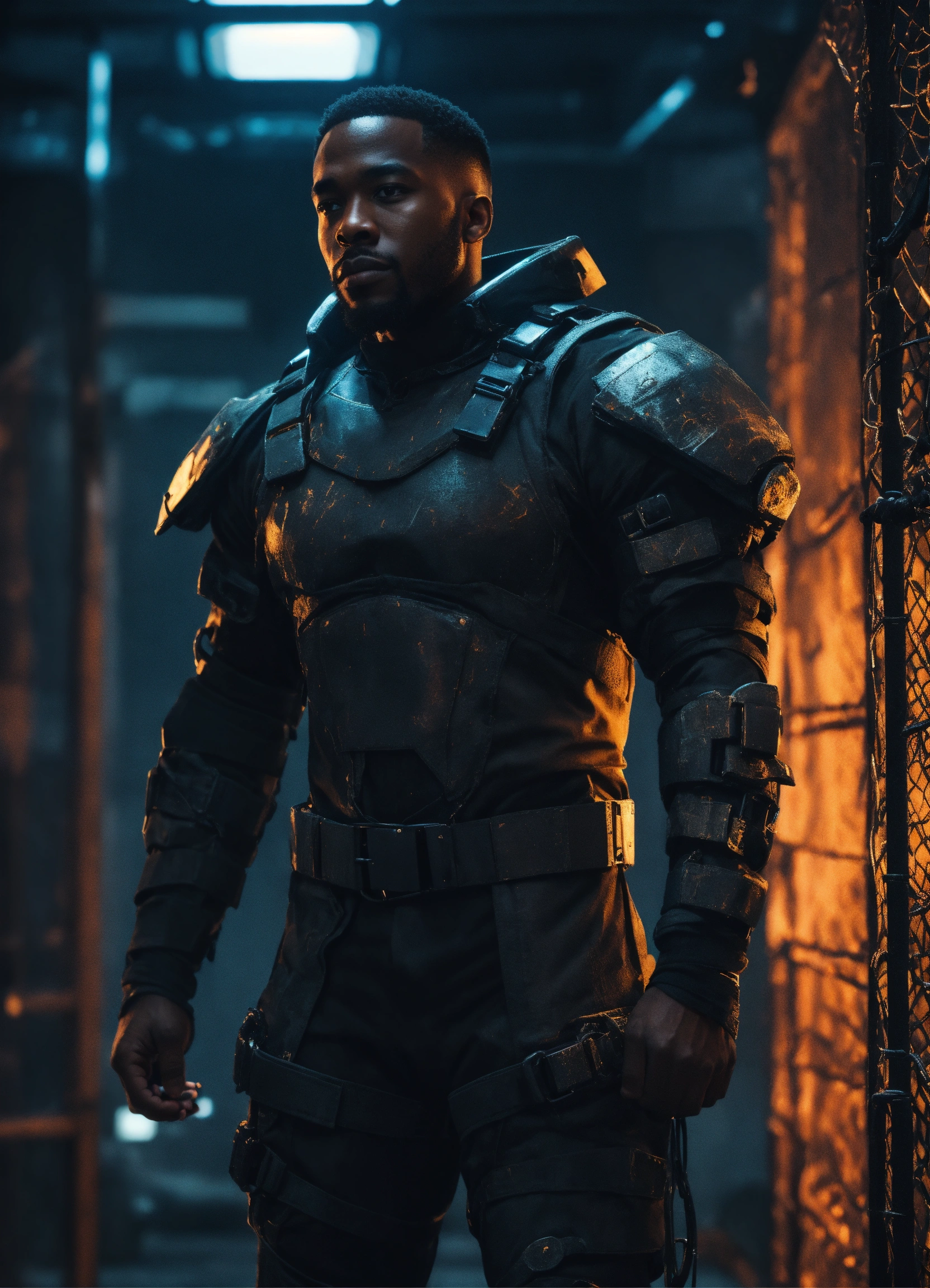 Handcuffed, a handsome black male god, a strong prisoner with short dark hair, wearing the remains of tattered futuristic super spy stealth suit, held captive in a spooky dark cell with monstrous guards in the backgroundl, resolution 8k, insanely detailed