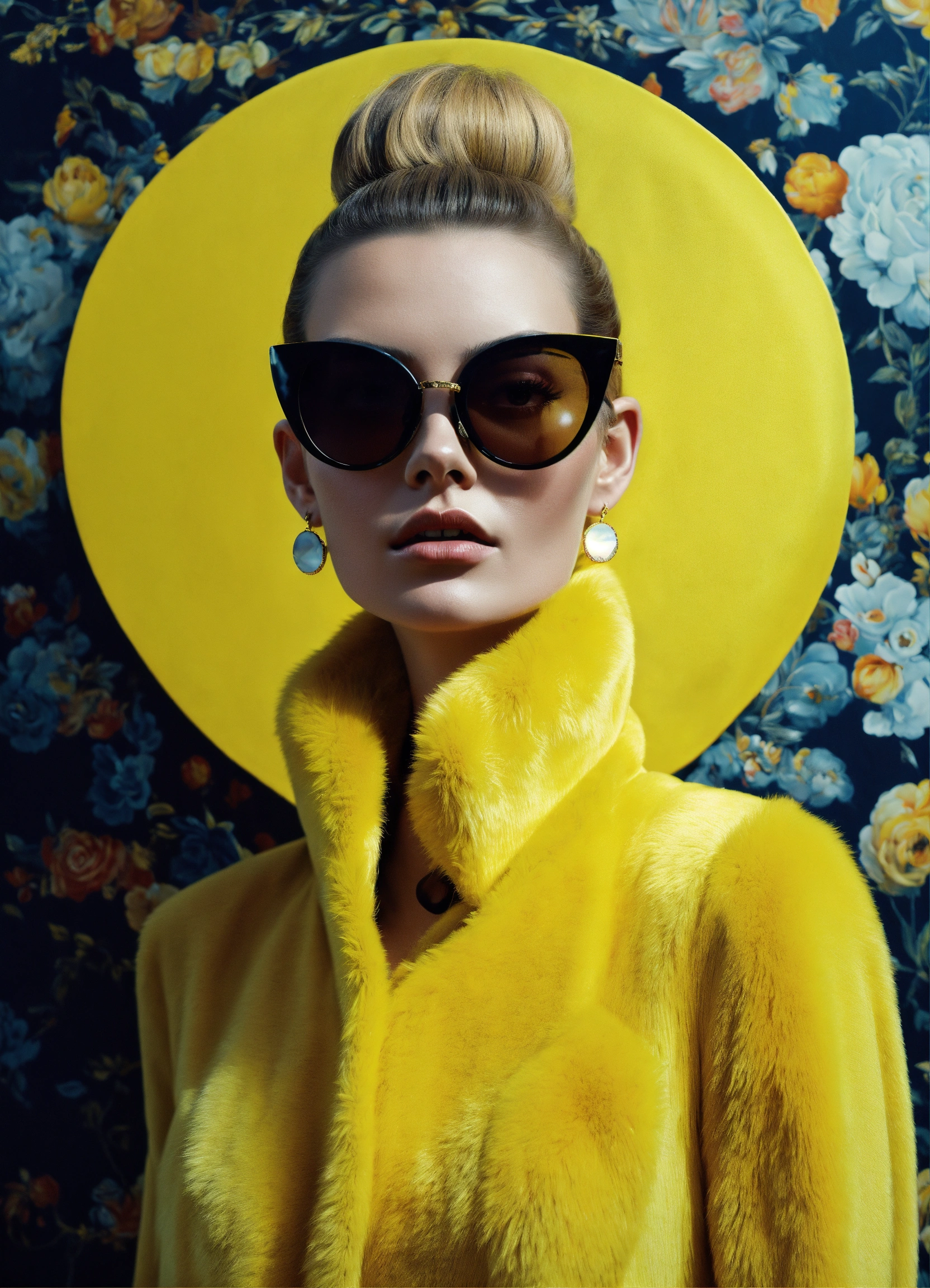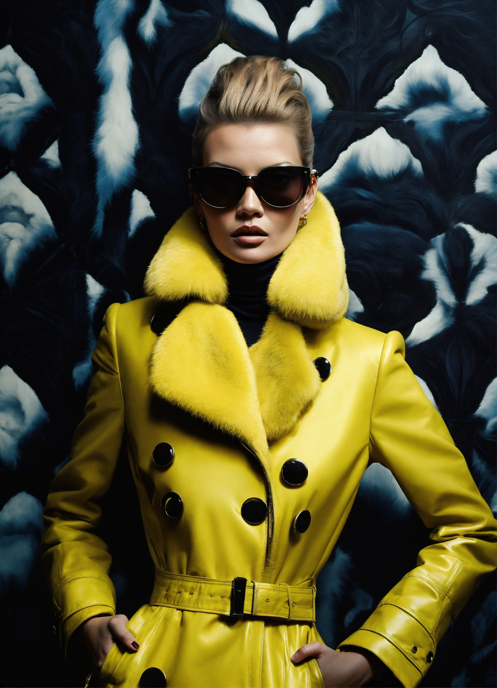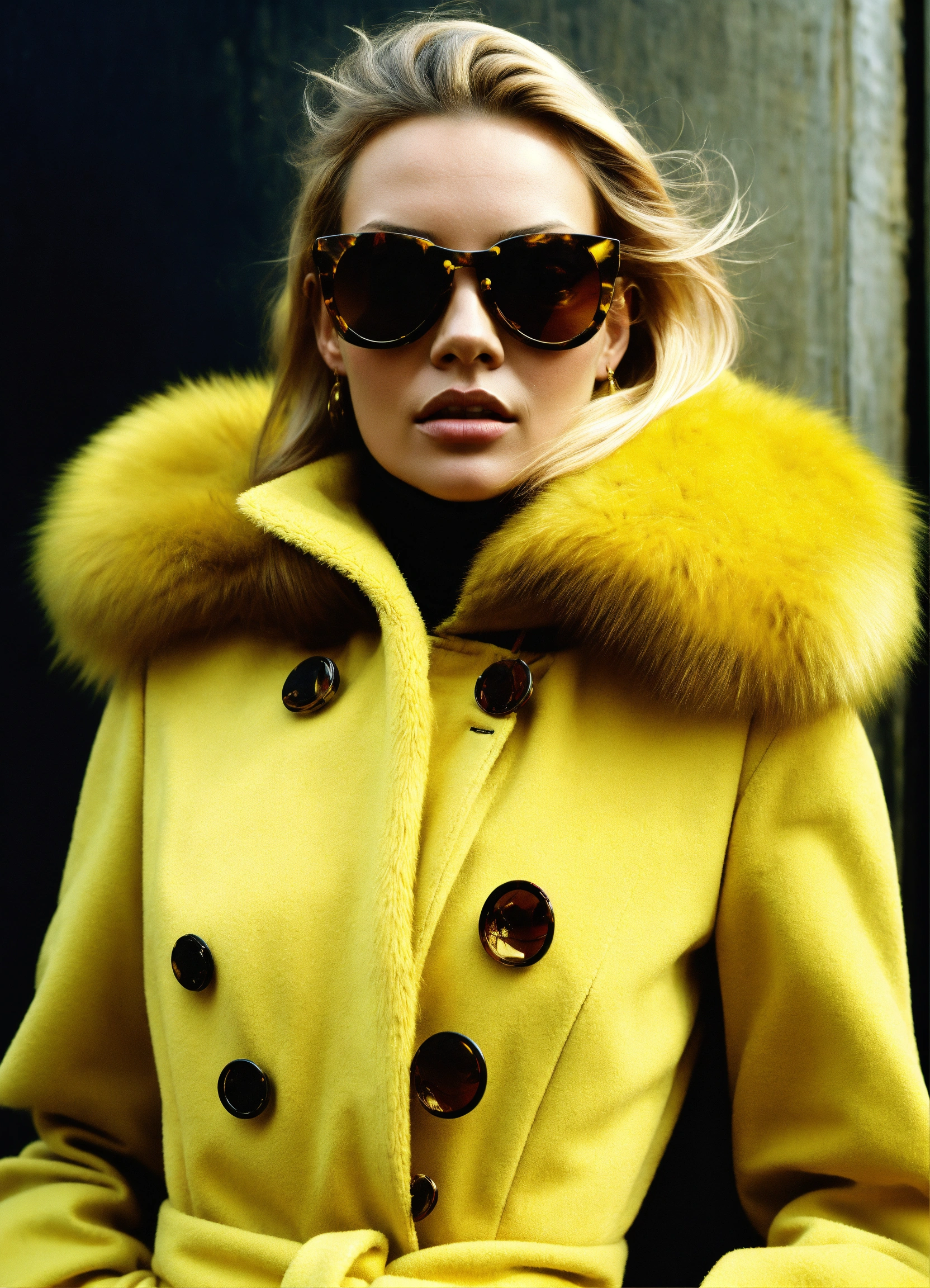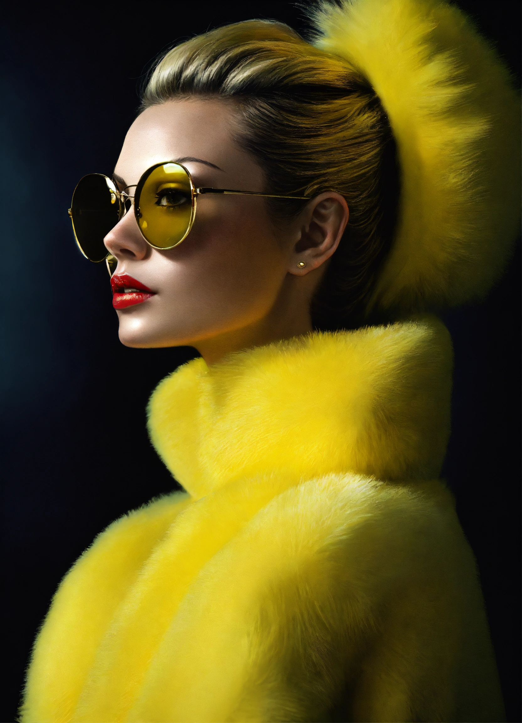 Front profile half body photography, in front of black wall, kate moss with 50's haircut, in a yellow coat turtleneck dress and large fur sunglasses, 80 degree view, art by sergio lopez, natalie shau, james jean and salvador dali
