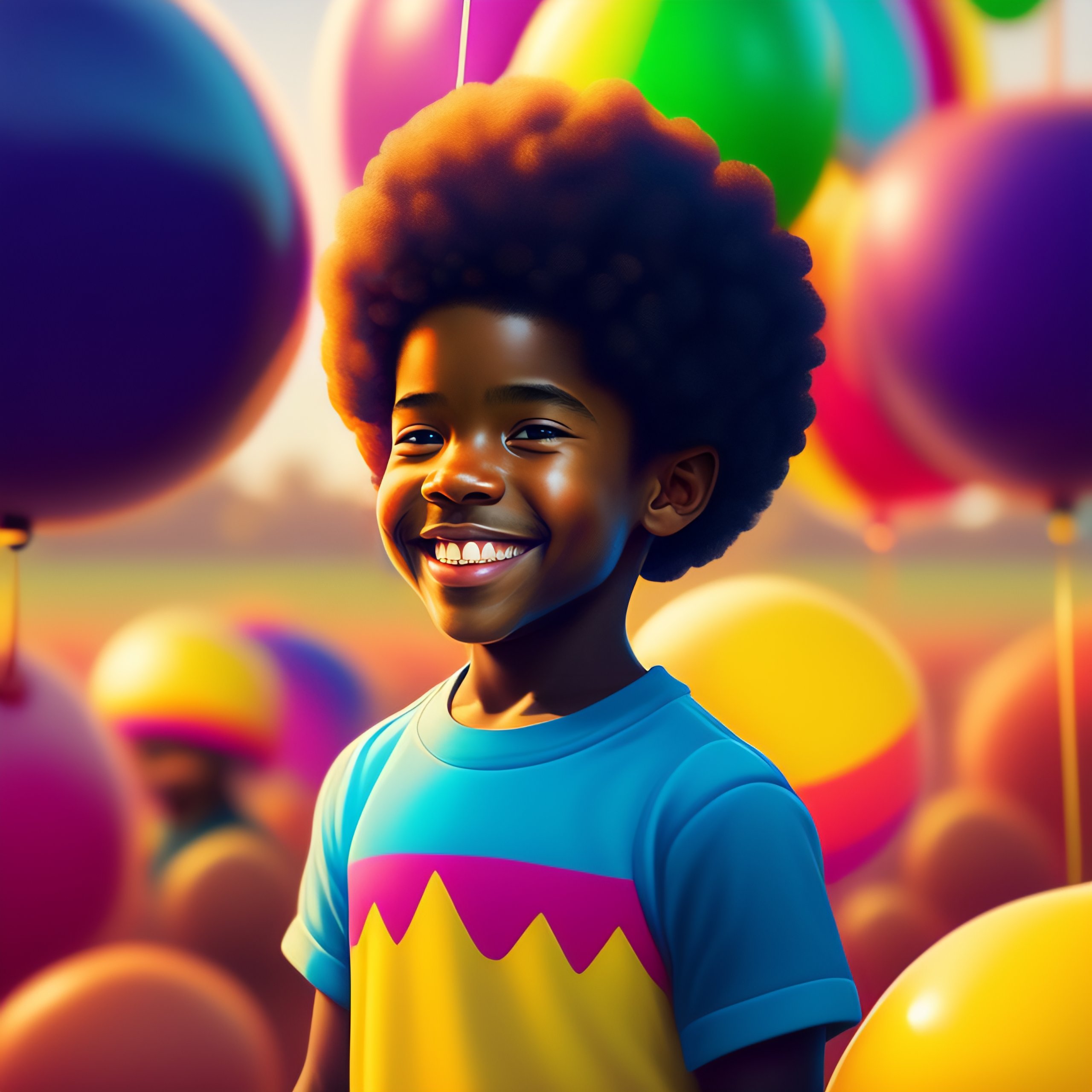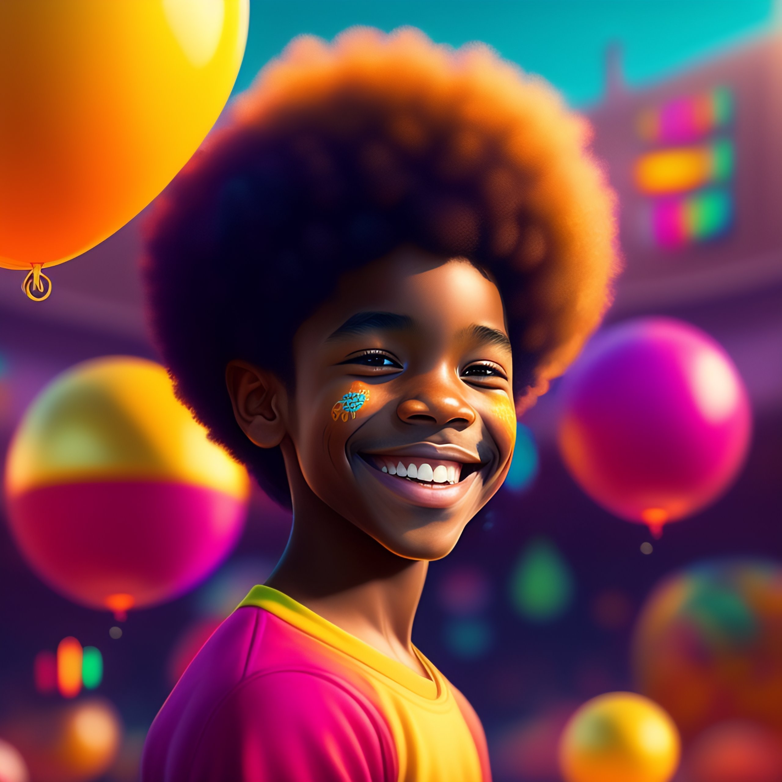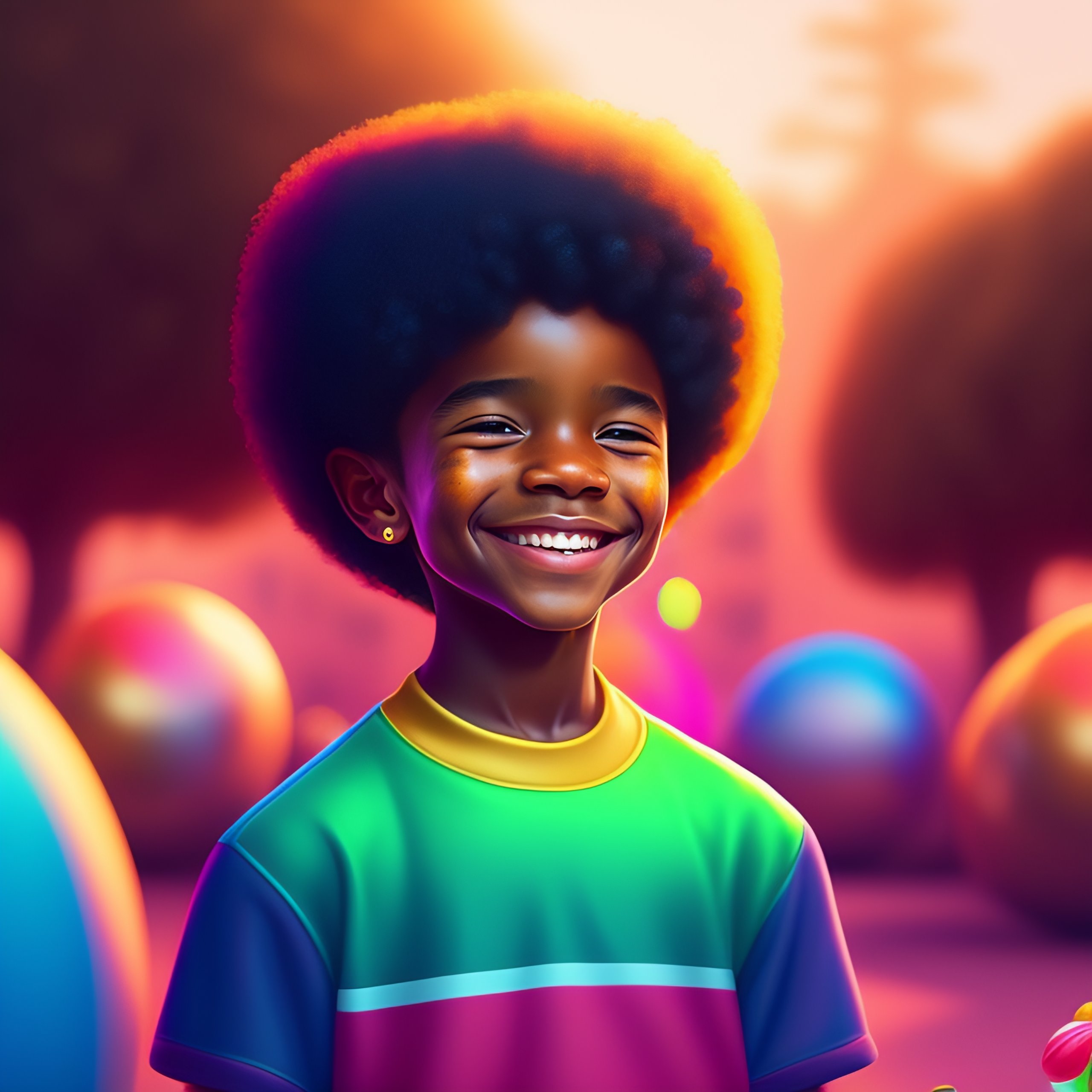 Afro boy with a bright smile, curious of the best birthday gift he will receive, surrounded by a colorful, joyful atmosphere, realistic and detailed, chocolate bar in his hands, with bright neon and golden details, by boris vallejo, simon stålenhag, and laura zalenga, trending on artstation.