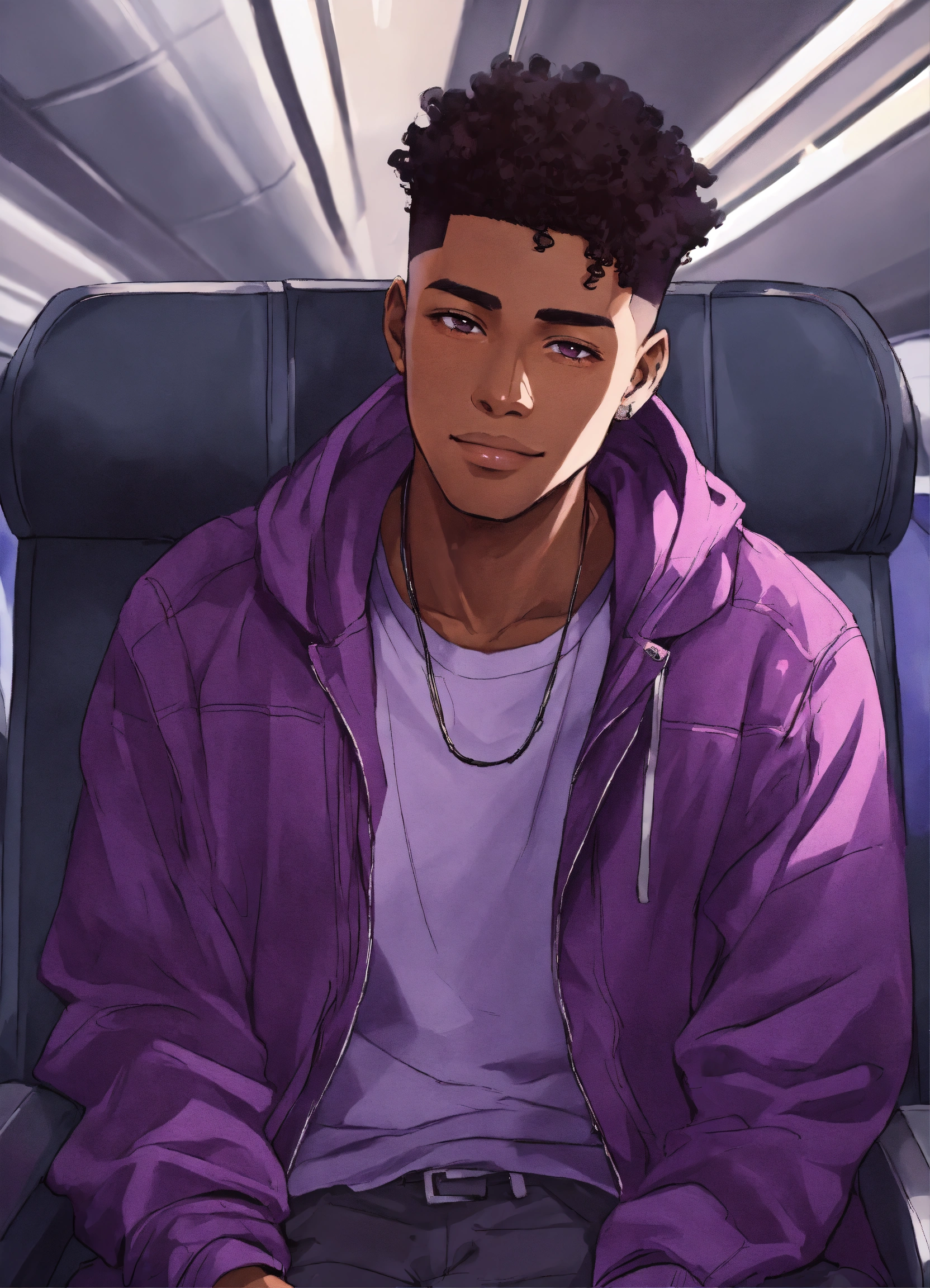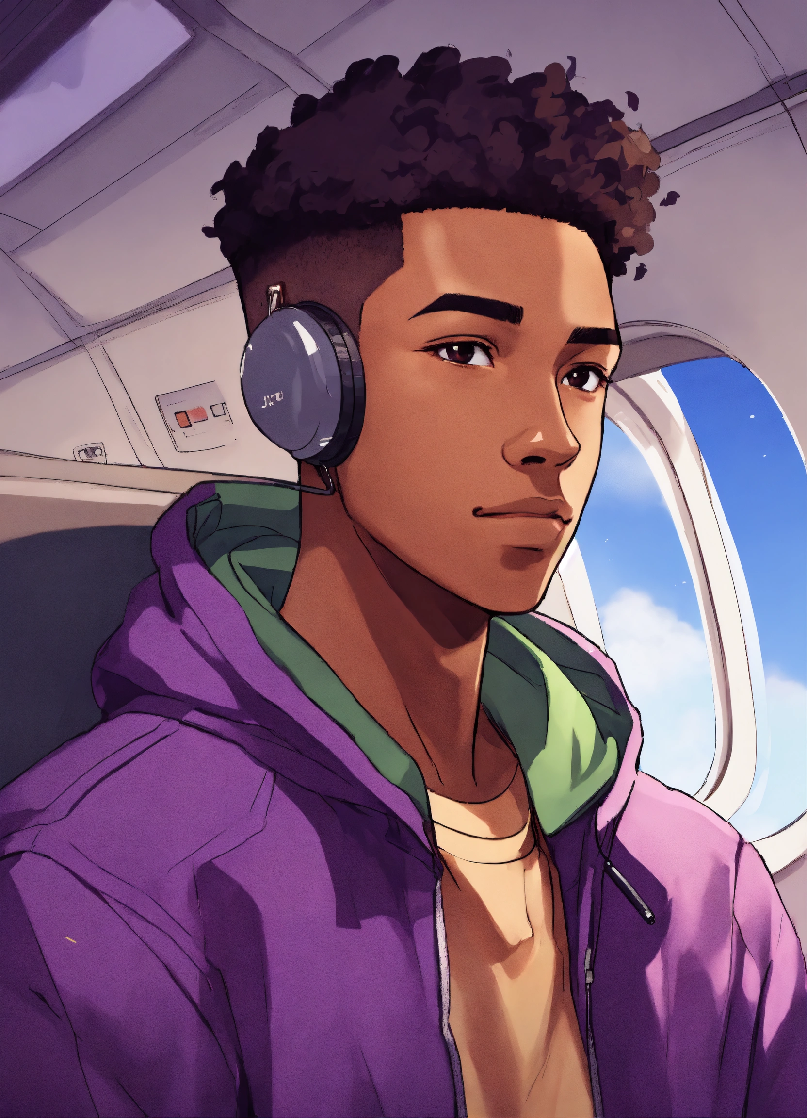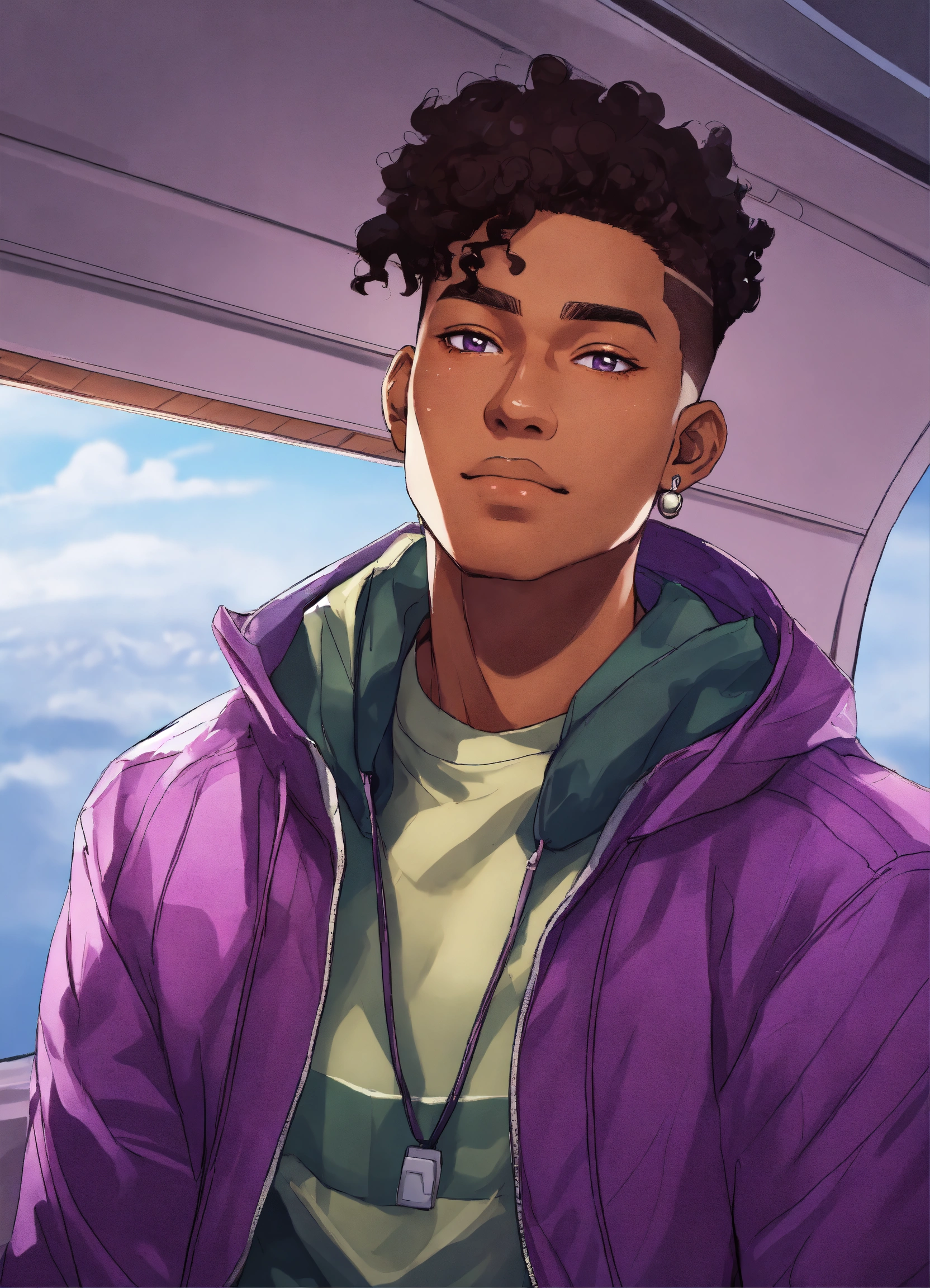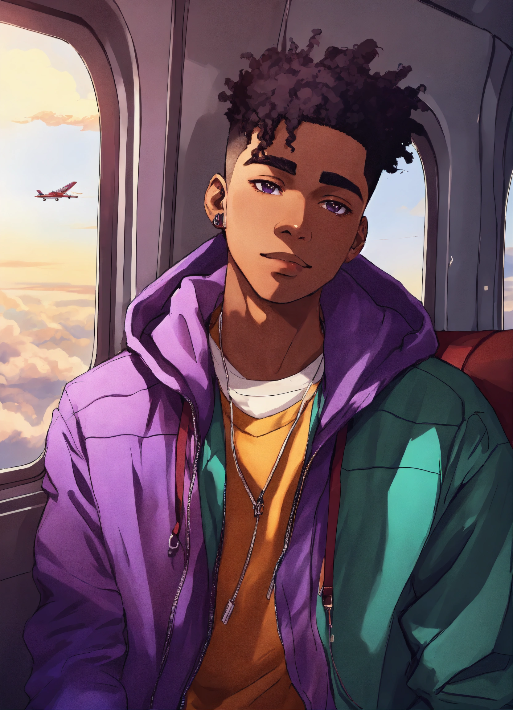 Young african caribbean chinese indian irish mixed race male, 20s, soft face, dark skin, with a sad smile, 4c high top fade, wearing a purple jacket, staring outside the window on a plane anime style