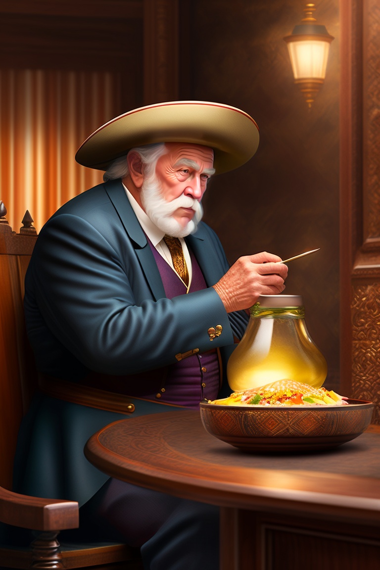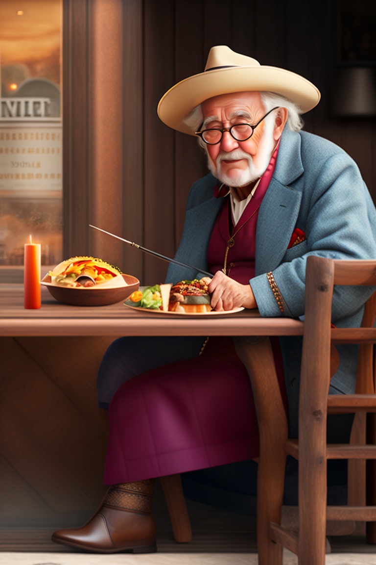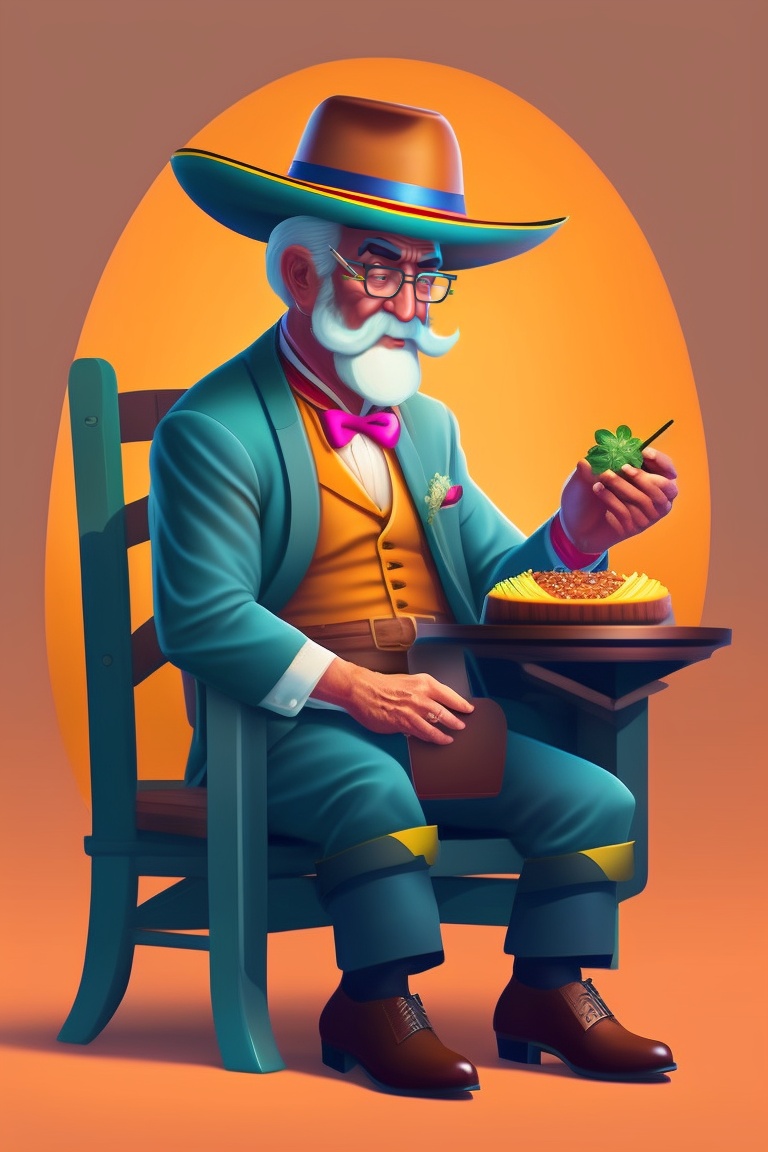 An old man sitting on a wooden chair with a gun next to him, offering a hot taco to someone . do it mexican style