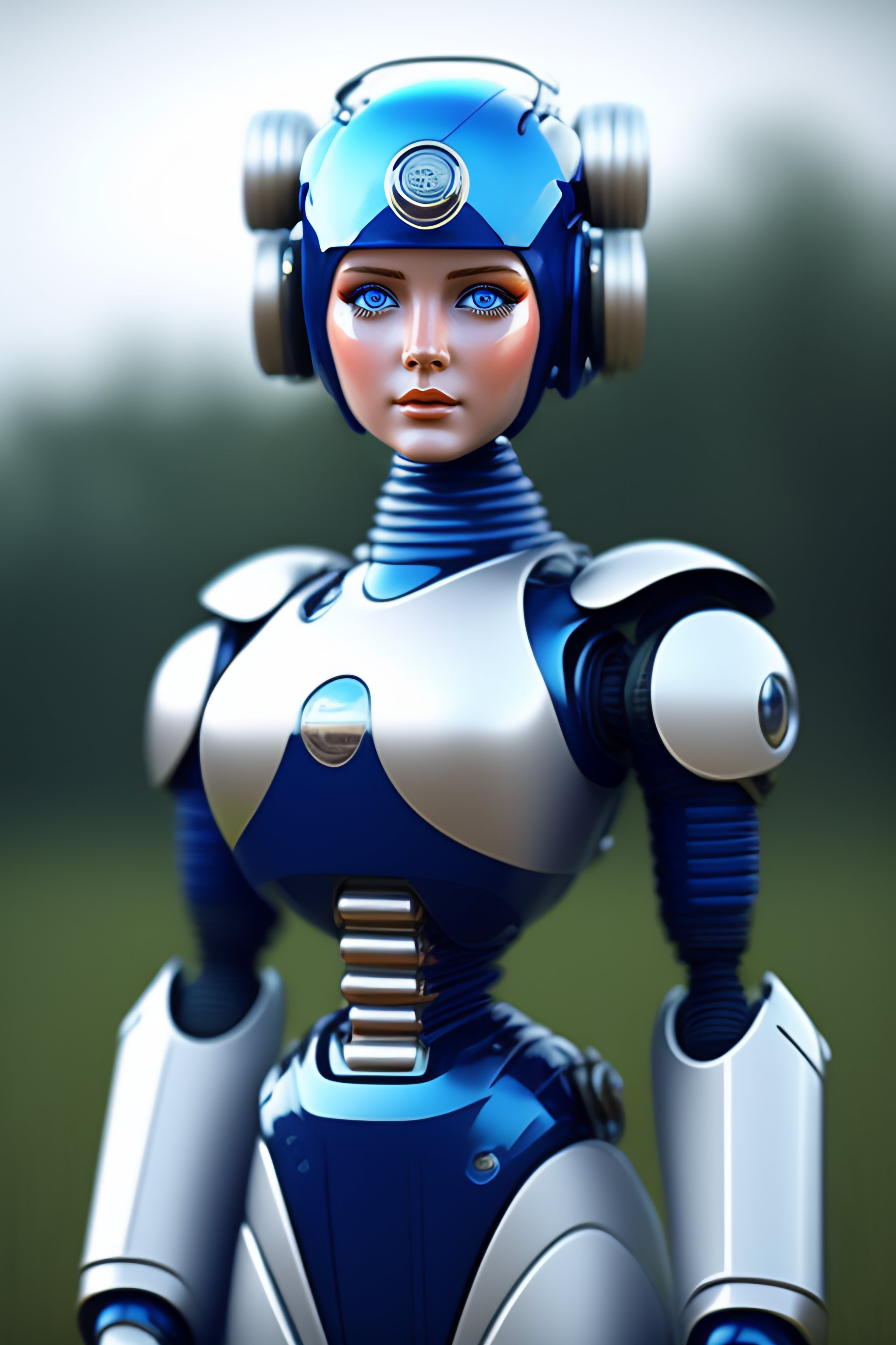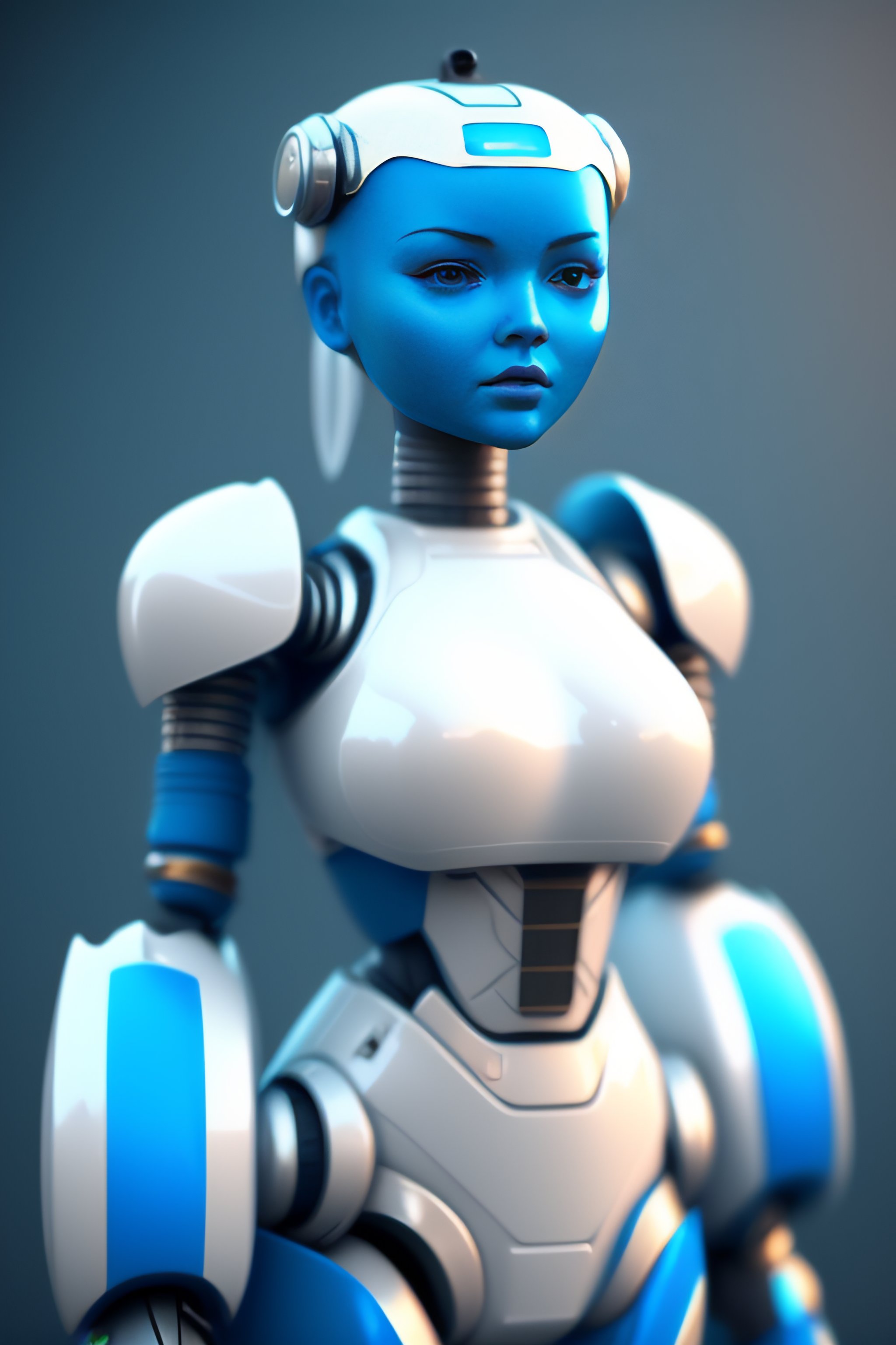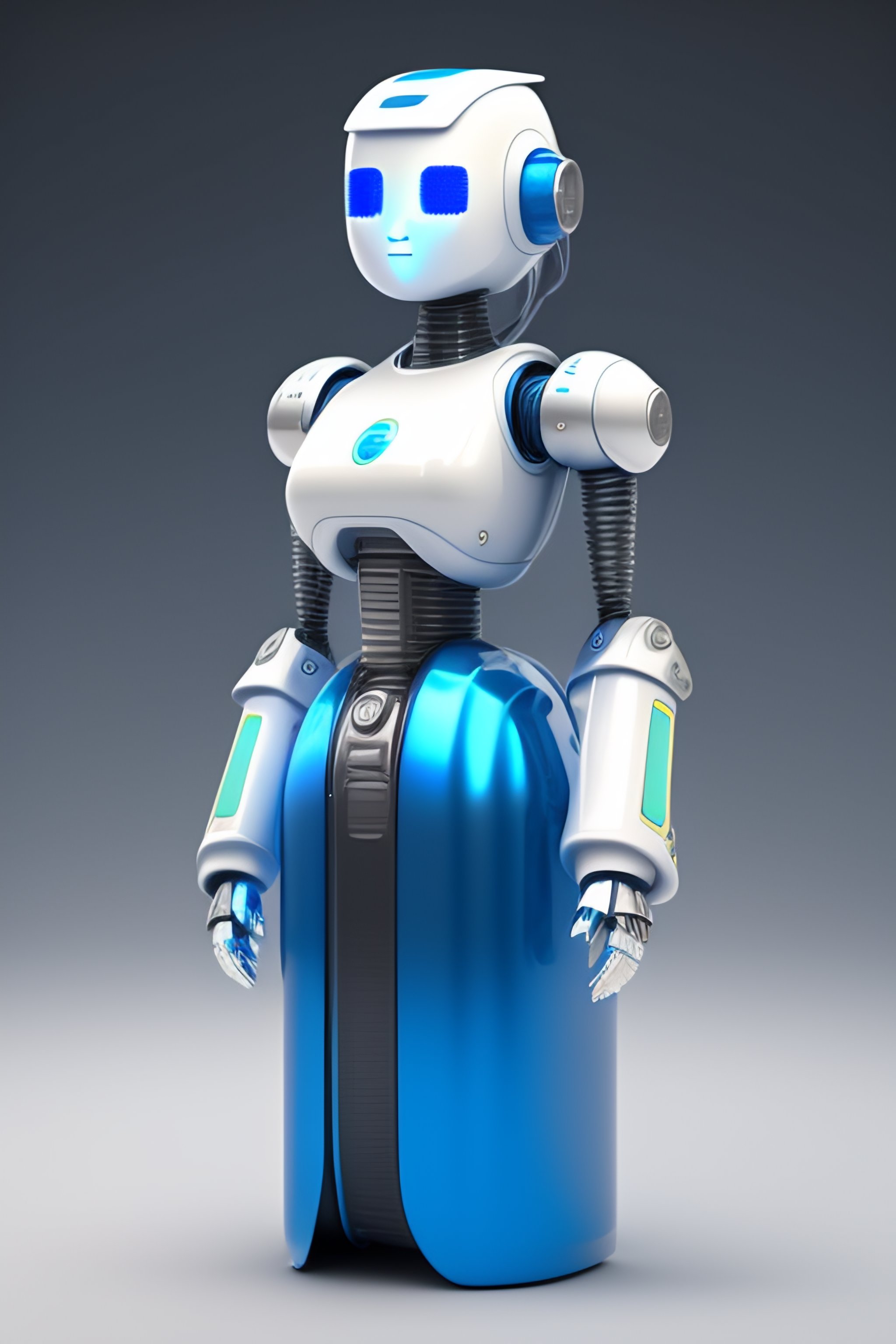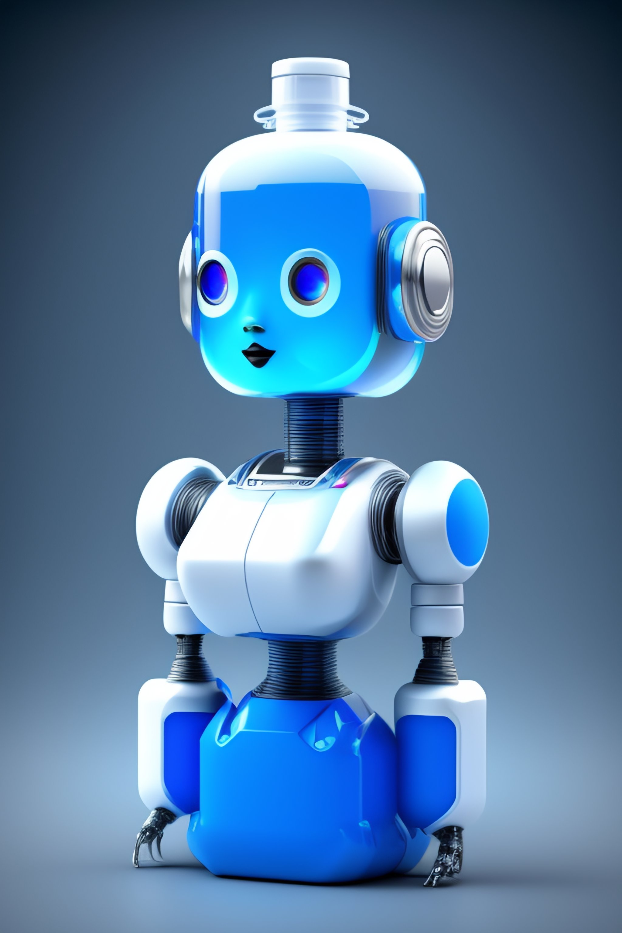 Robot girl made from various detergent bottles, realistic, concept art, 8k, blank white face, blue eyes