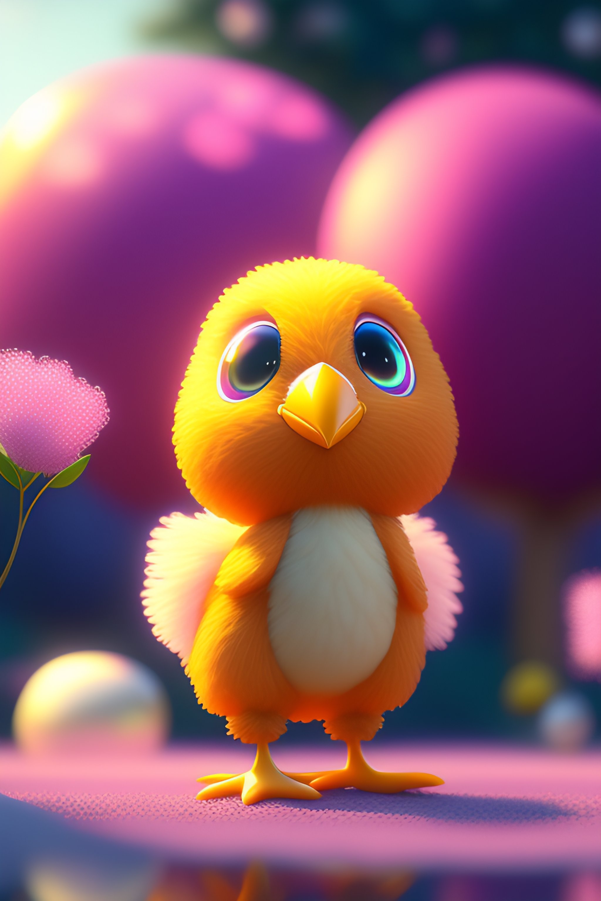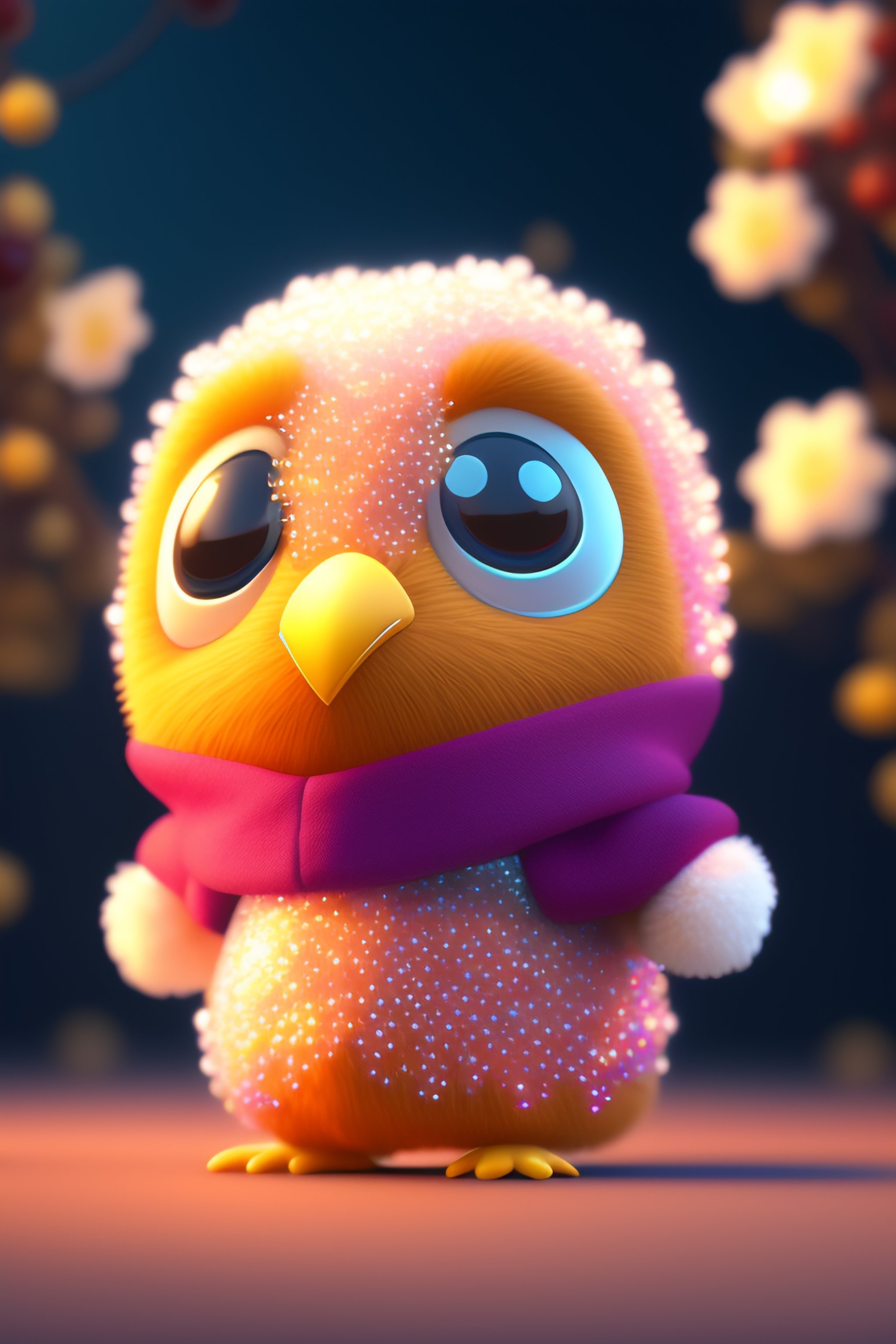A super cute pixar chicken baby in the distance, plush toy, wearing a christmas costume, bright big eyes, shiny fur, sweet smile, sitting on an apple made of transparent foam crystals and cherry blossoms, intricate details, soft movie lights, 16k, sparkling, halo, portrait, 3d animation, octane rendering, unreal engine 5, high-quality, hd, 8k