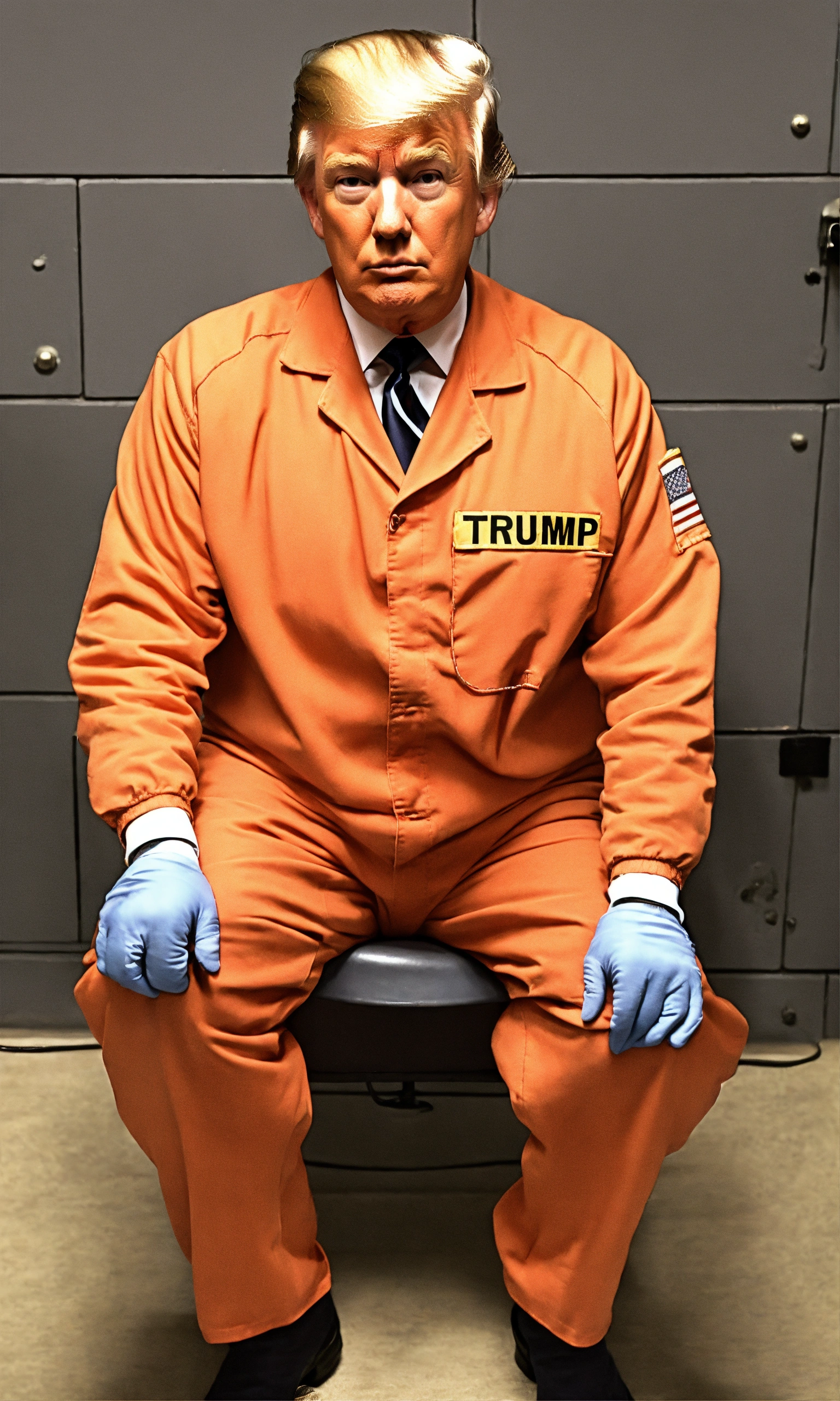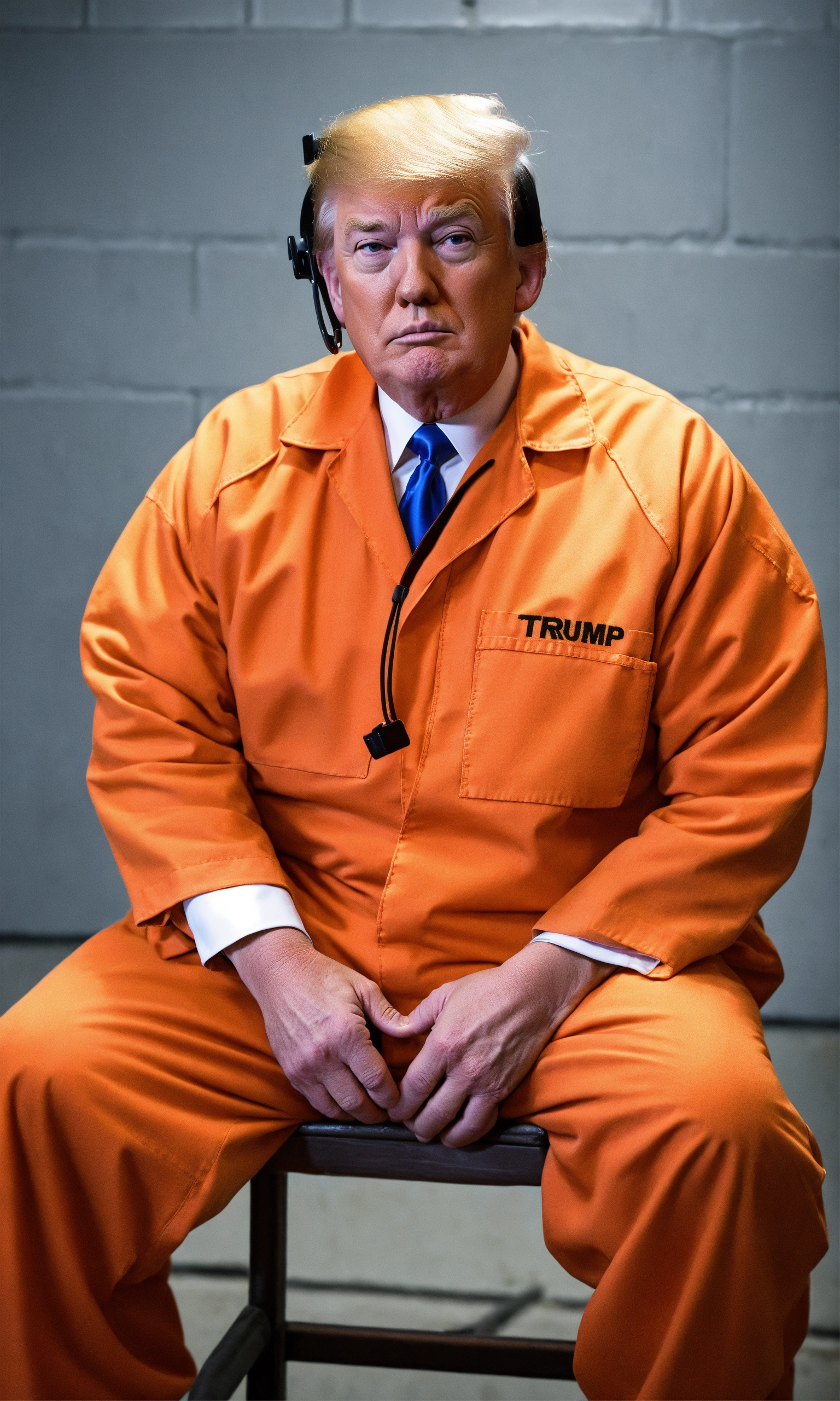 A professional mugshot photo of donald trump in a prison jumpsuit