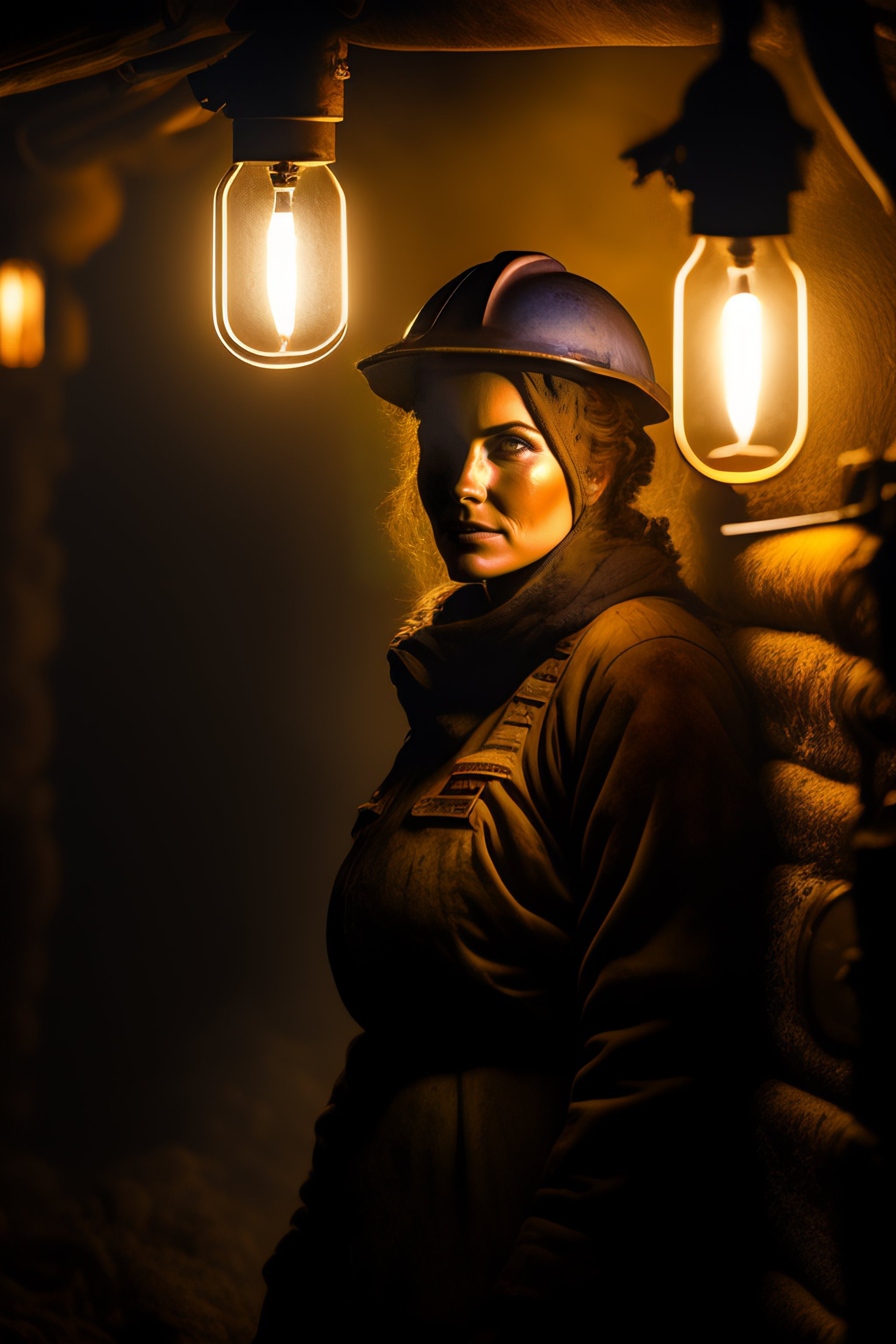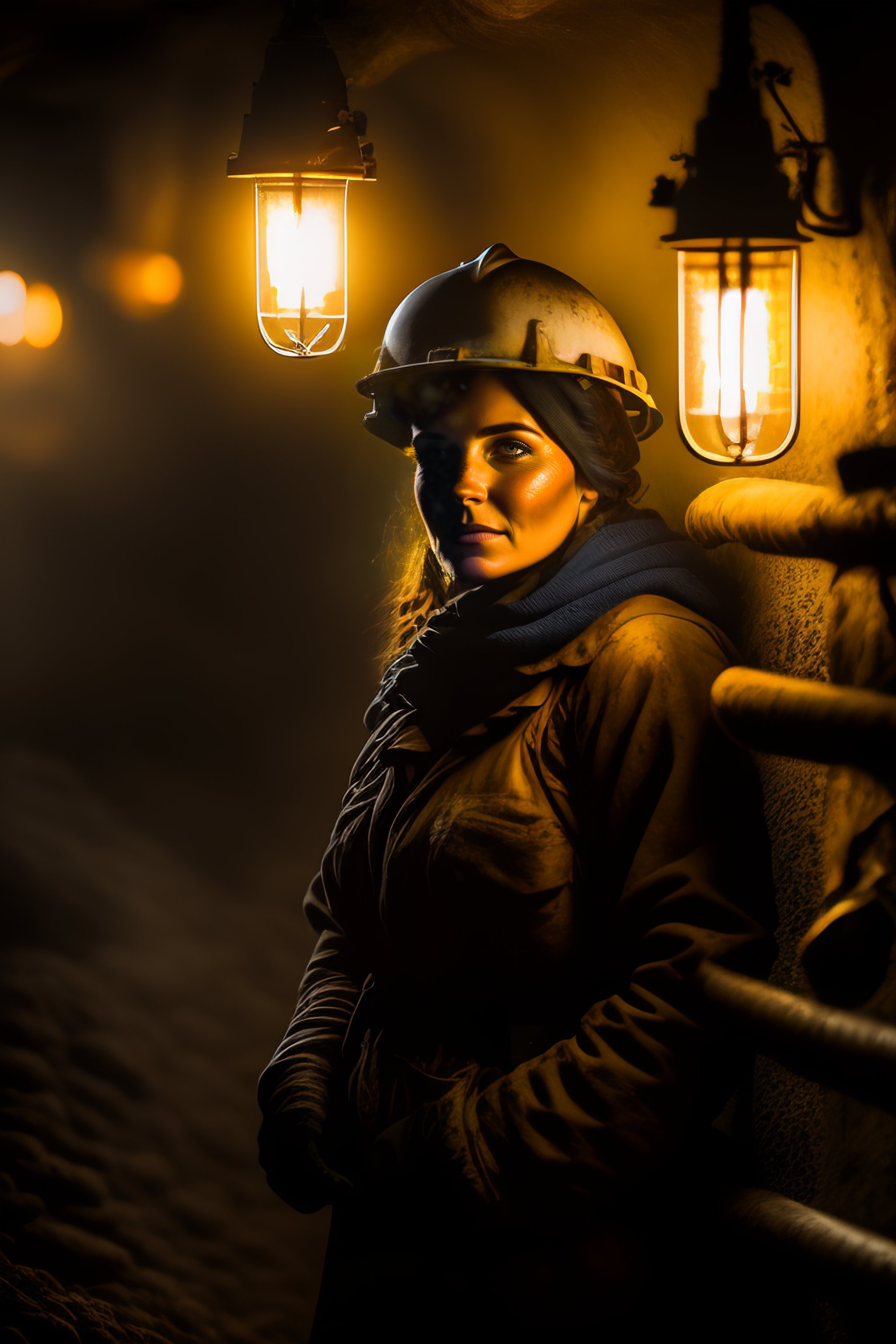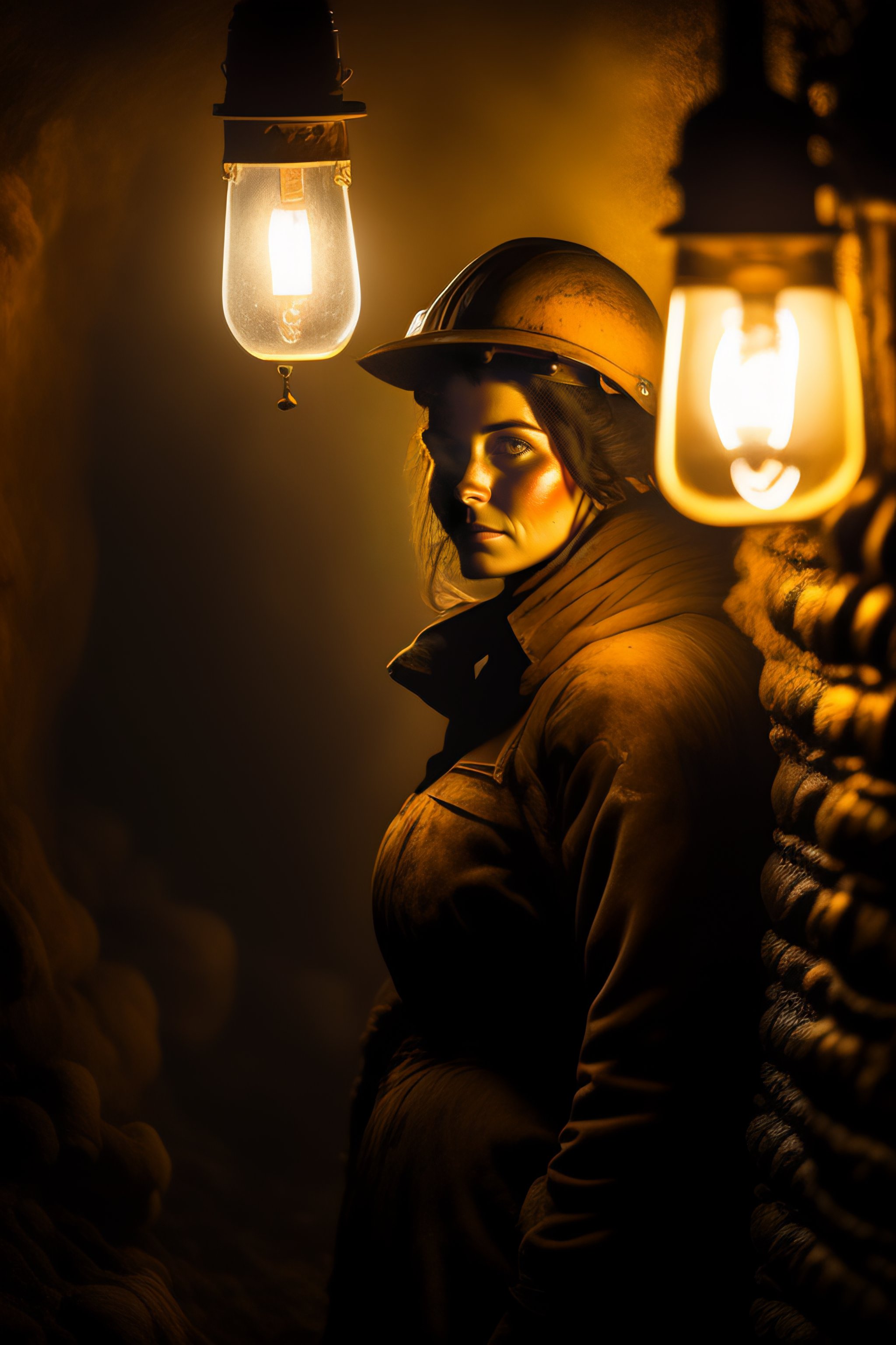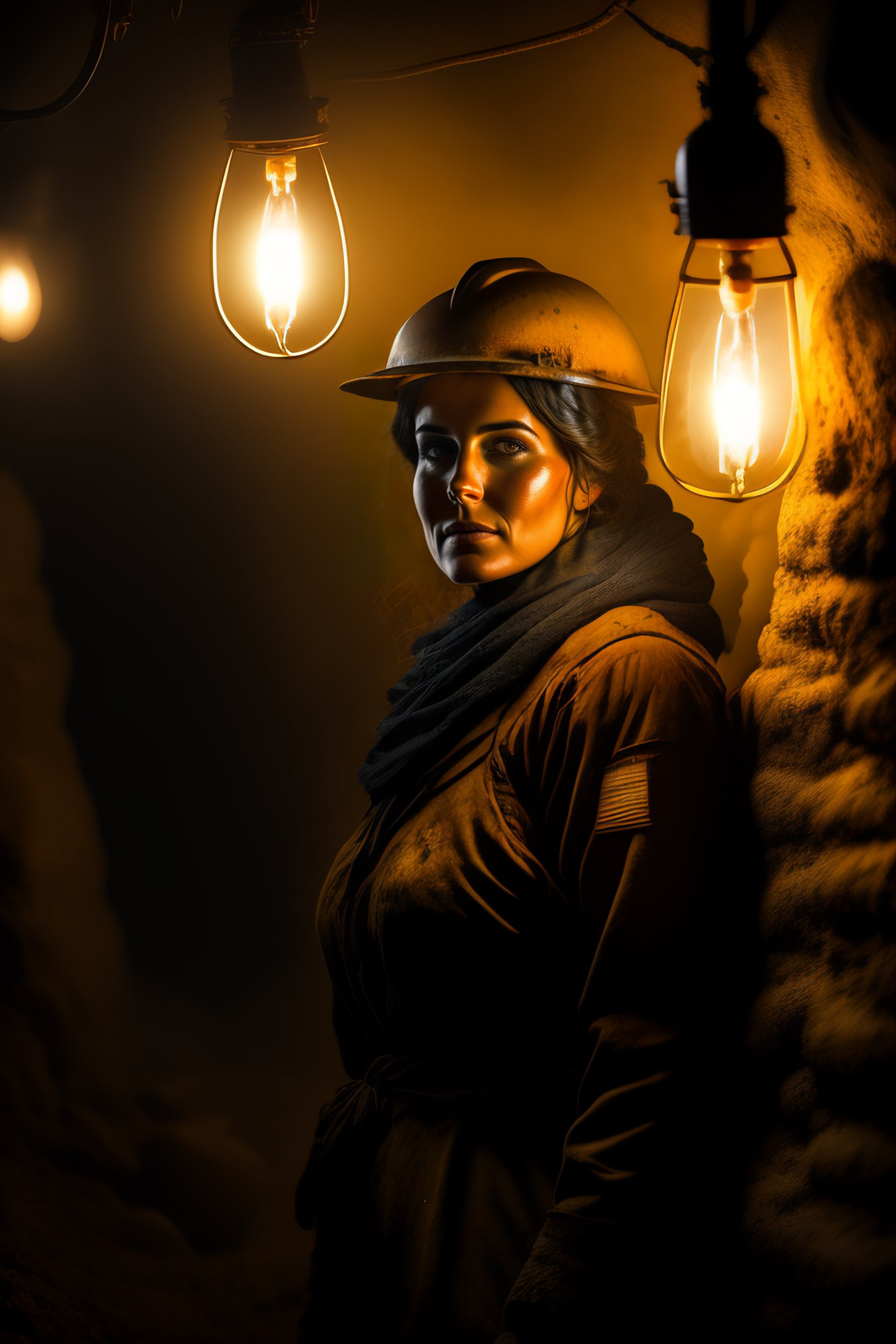 A coal miner woman covered in coal dust in a mine lit by kerosene lamps, sweaty and gross pioneer work, atmospheric lighting
