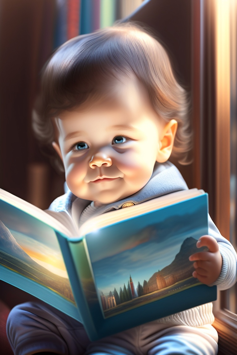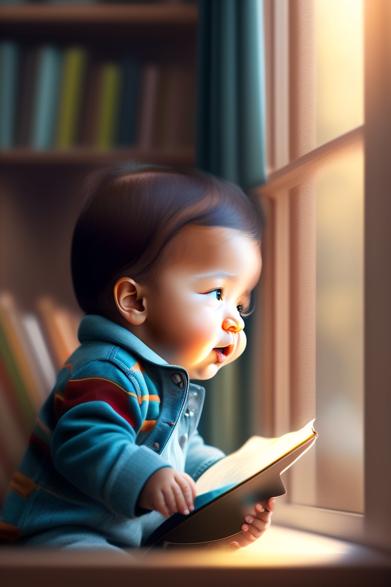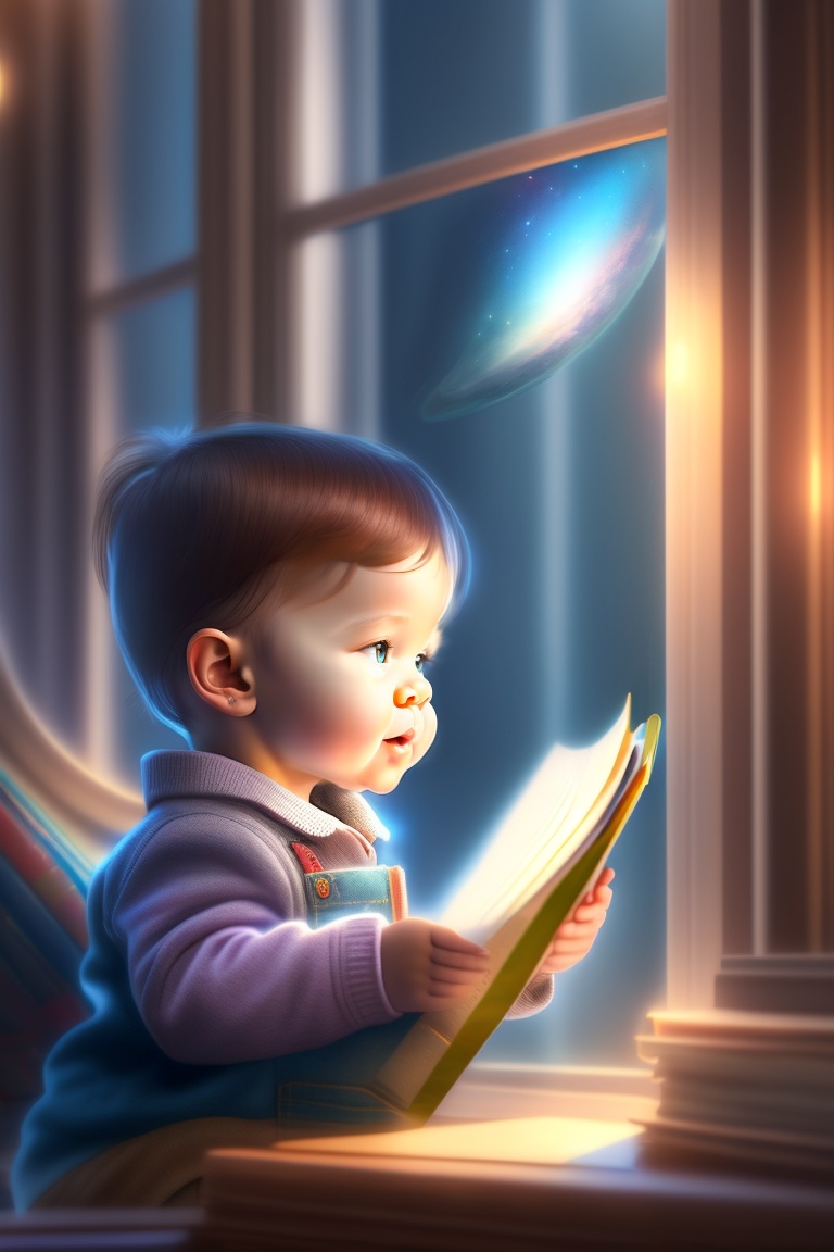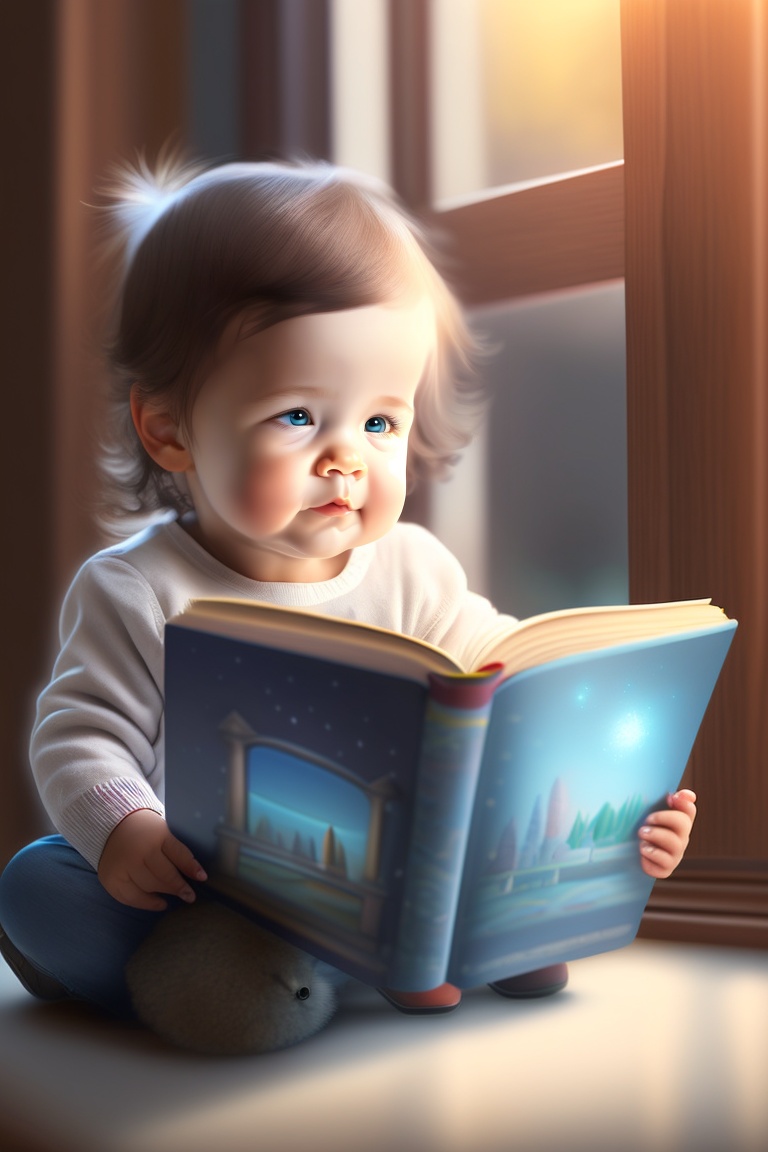 A cute little baby, age 4 to 5, looking at a story book in a room with a smiling face. dreamlike visualization, day light coming through window.