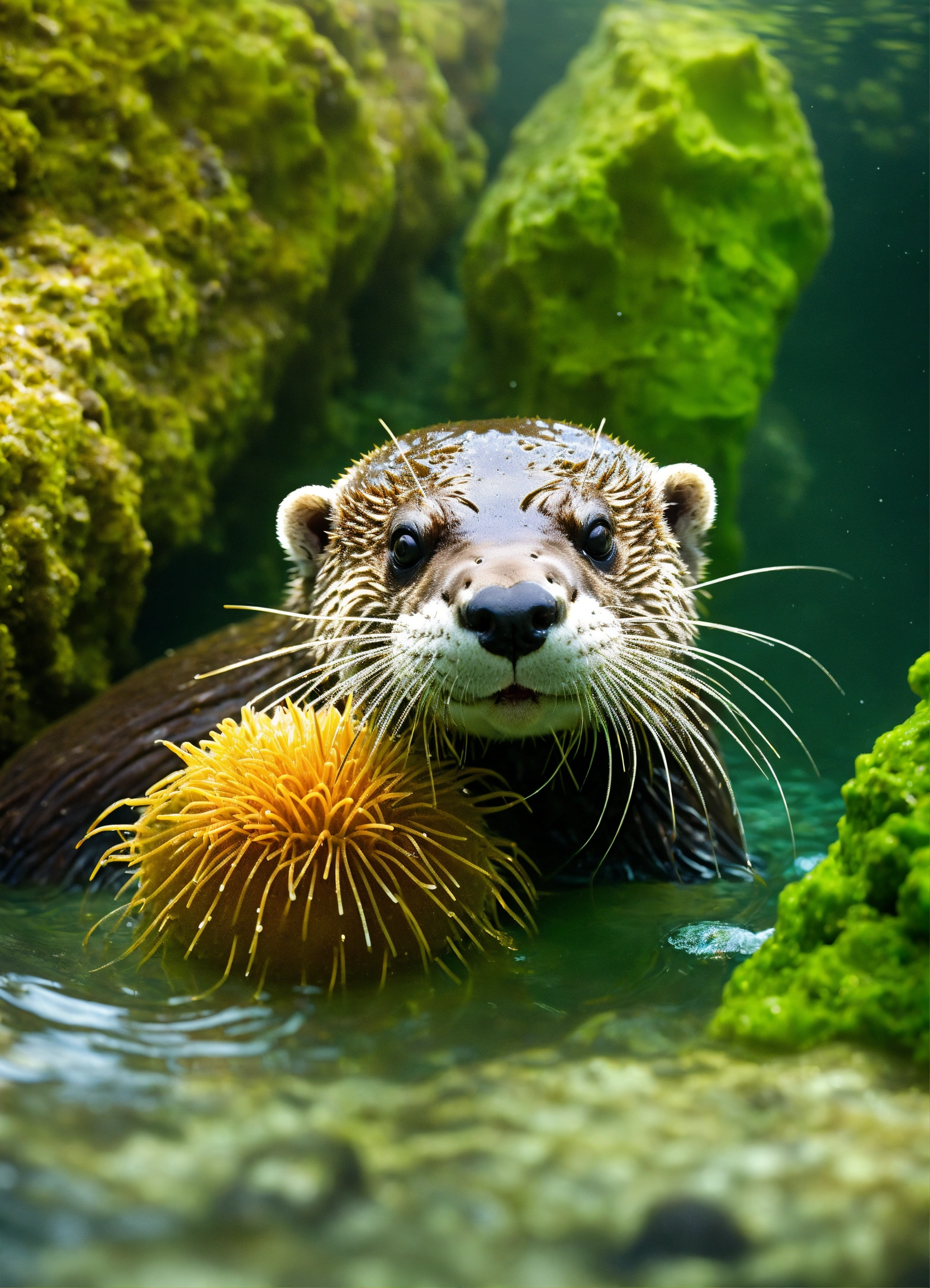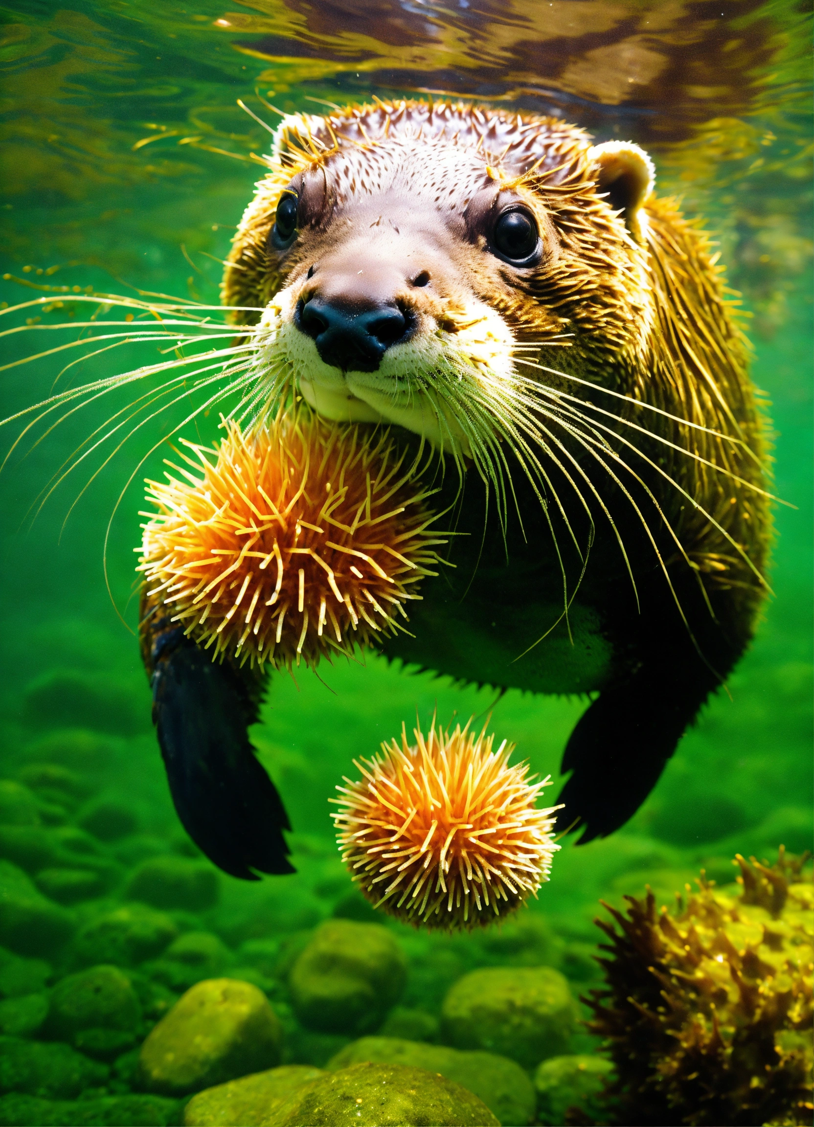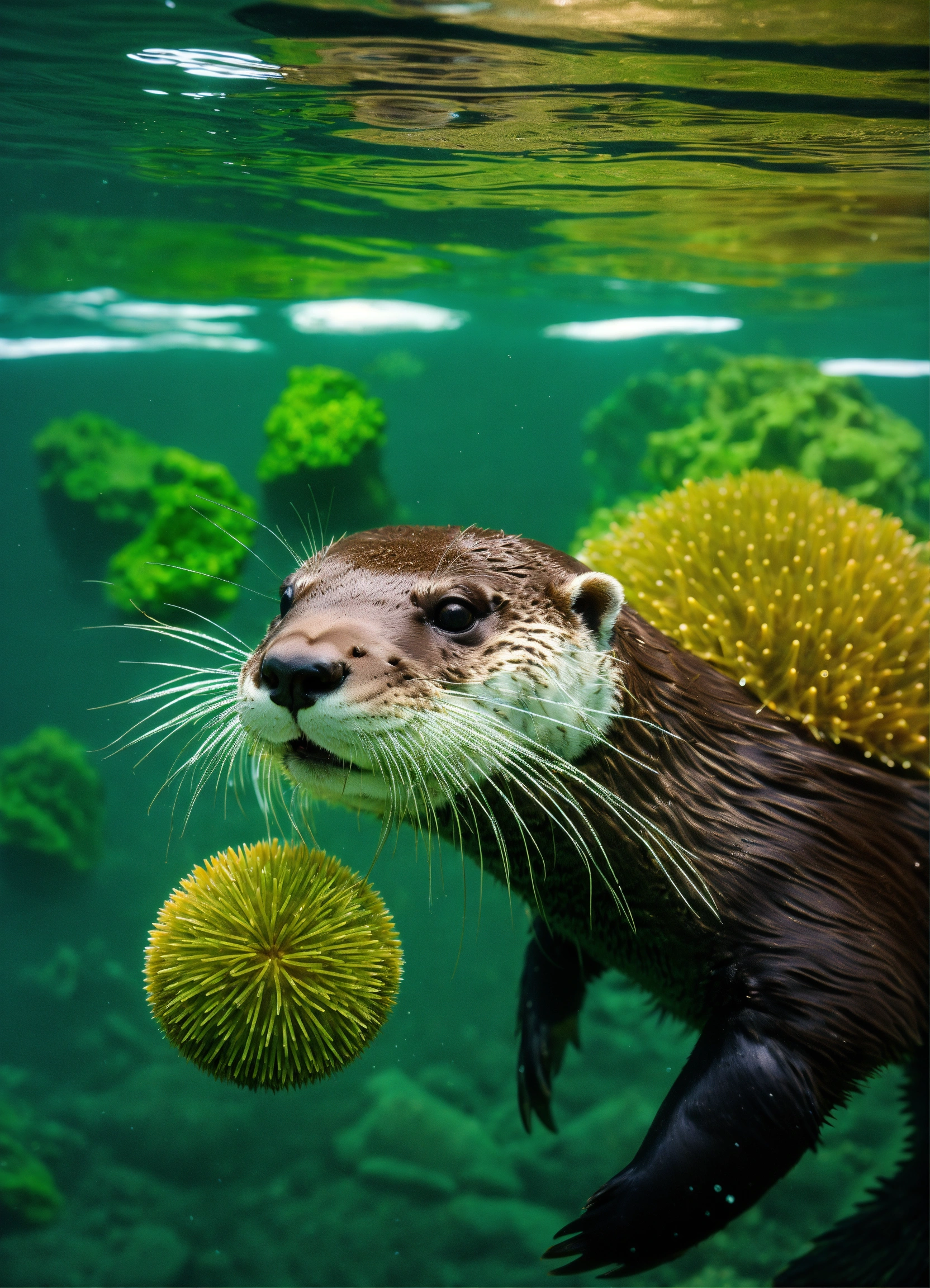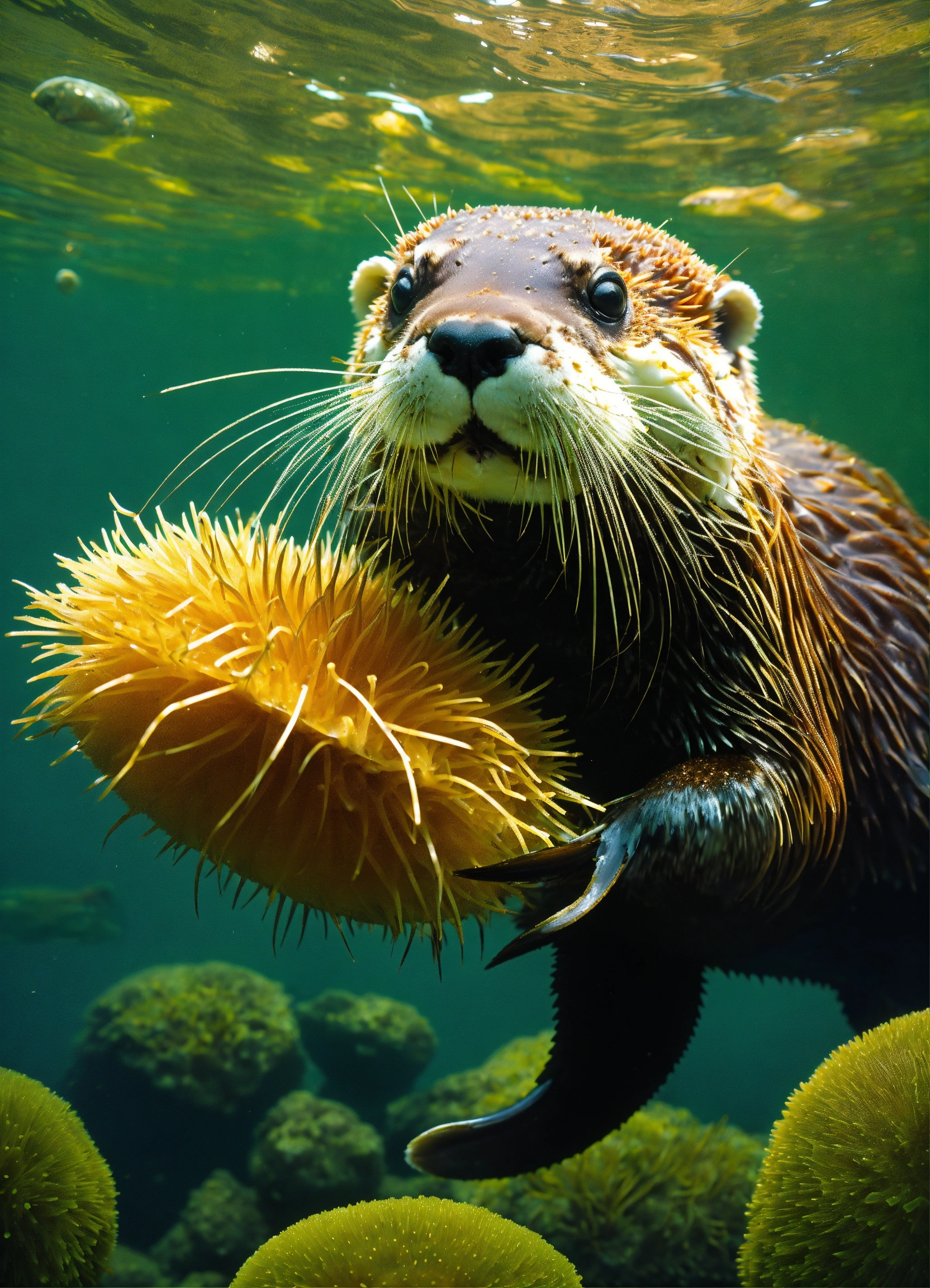 Otter playing under water kelp sea urchin green water rocks dungeness crab