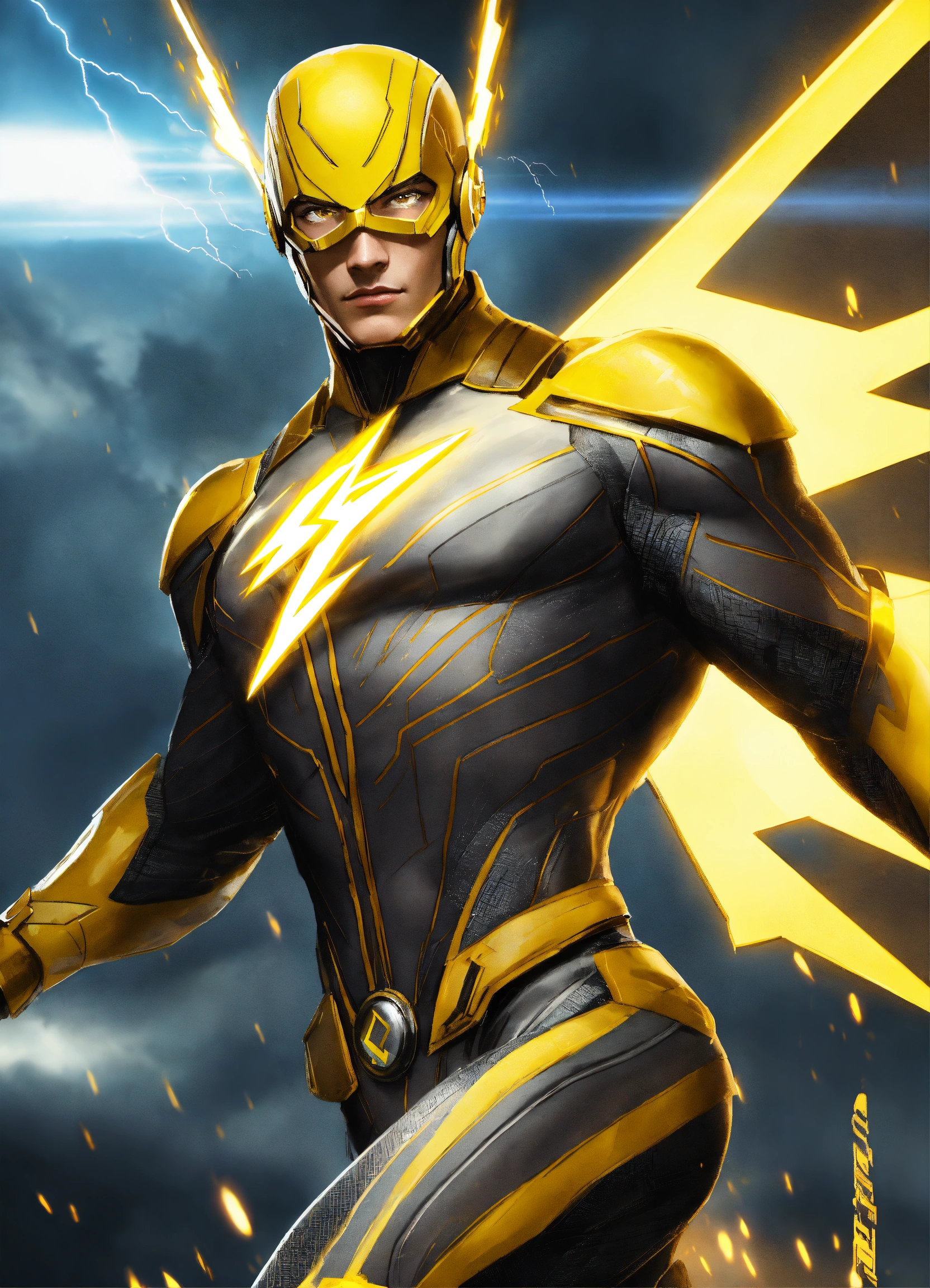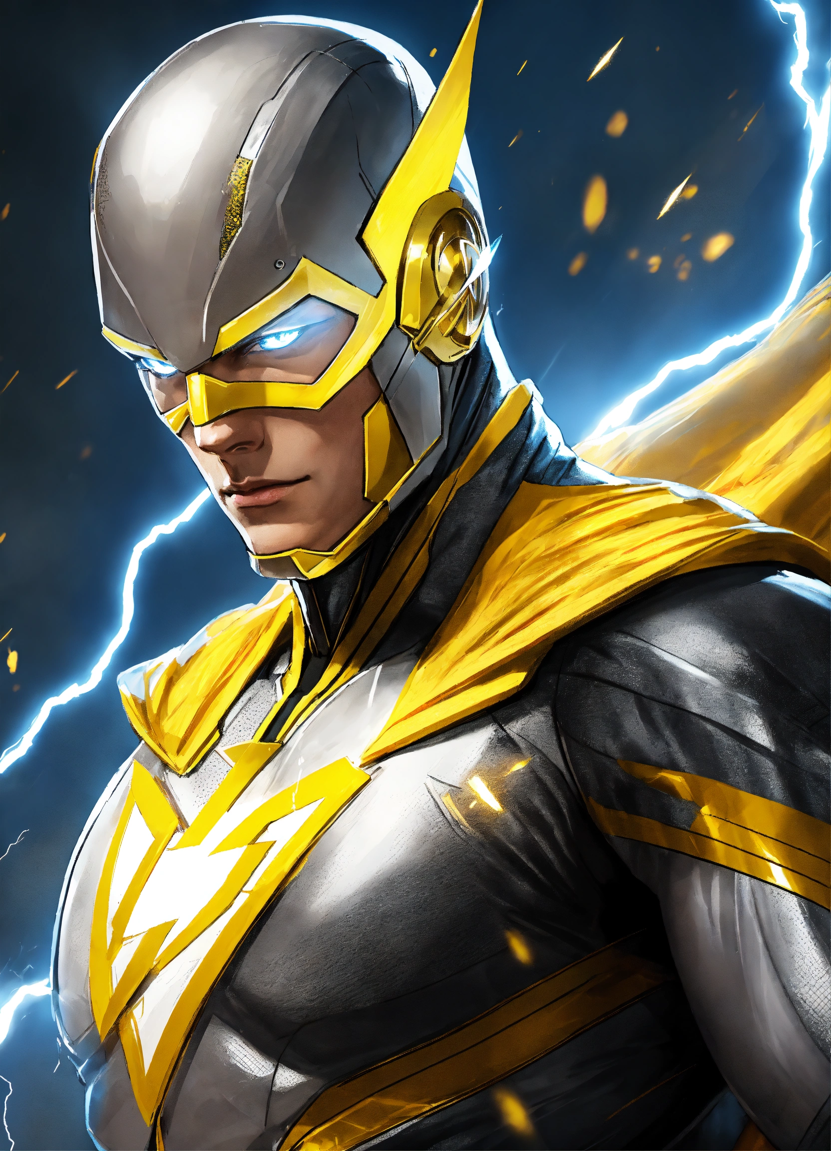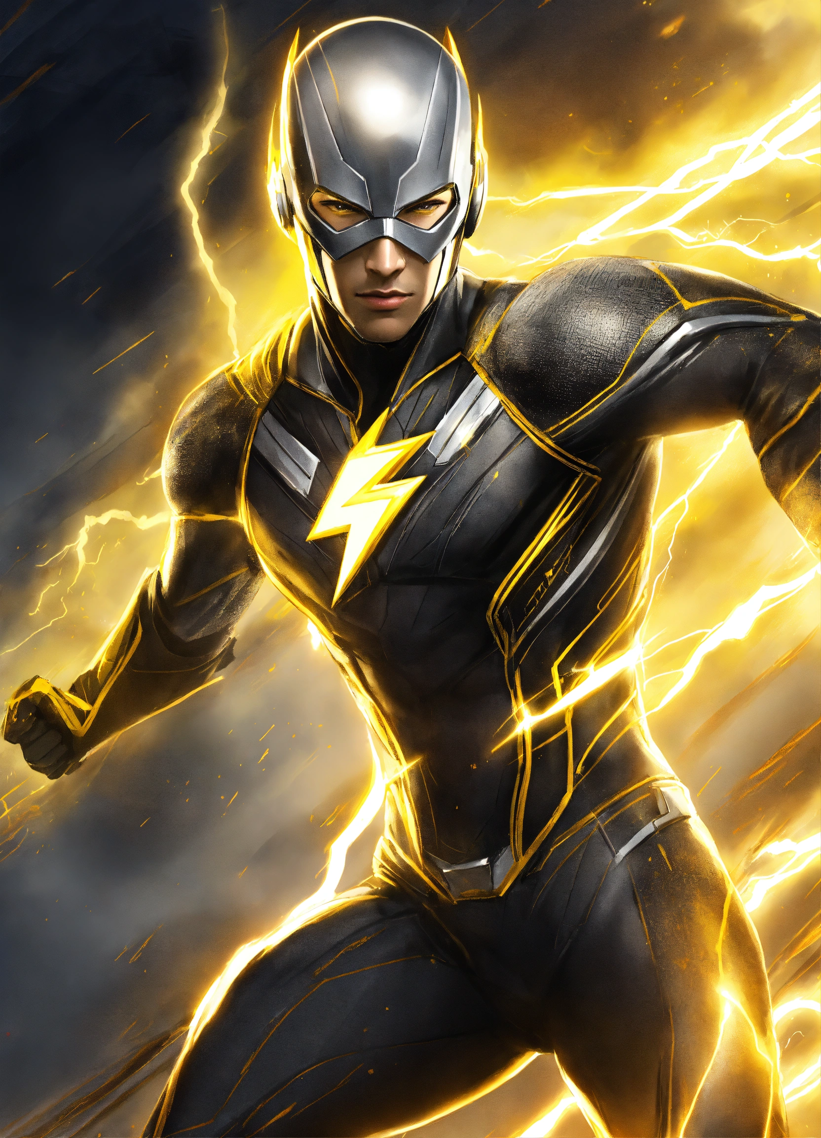 Realistic digital illustration art, ink, speedstreak super abilities, super speed, speed force manipulation, accelerated healing, time manipulation, speed thinking, speedstreak wears a sleek gray and yellow costume that enhances his aerodynamics. his emblem is a stylized lightning bolt, symbolizing his speed and power --ar 916 --v5.2 --seed 77767