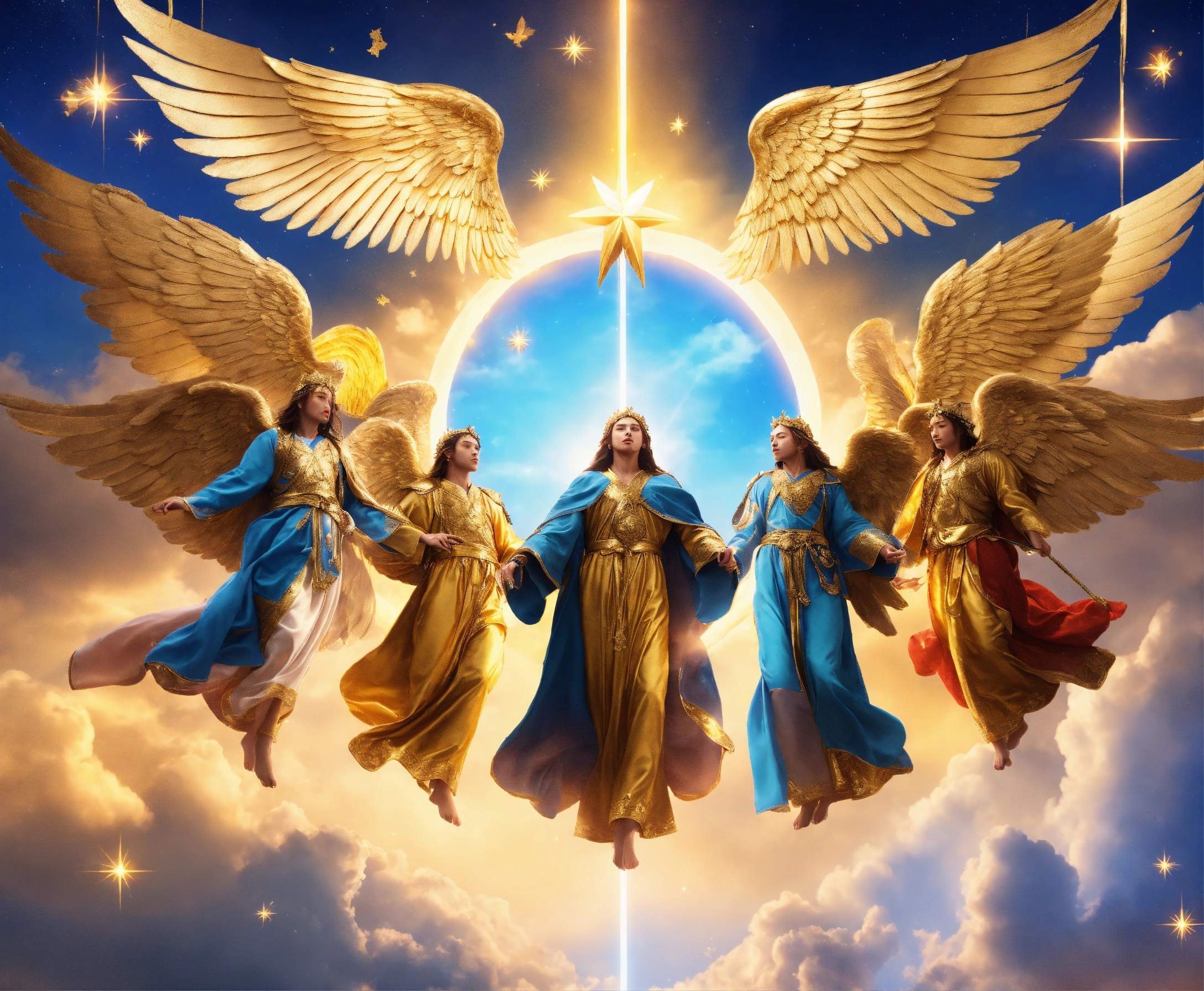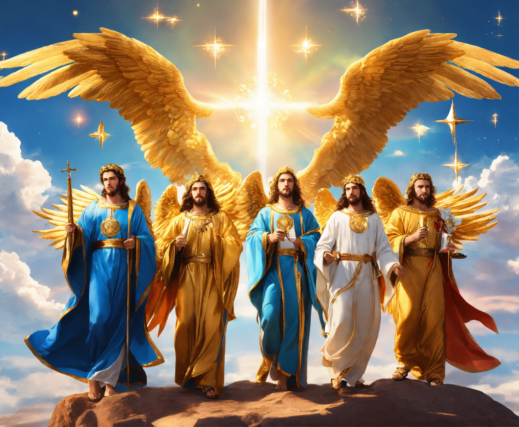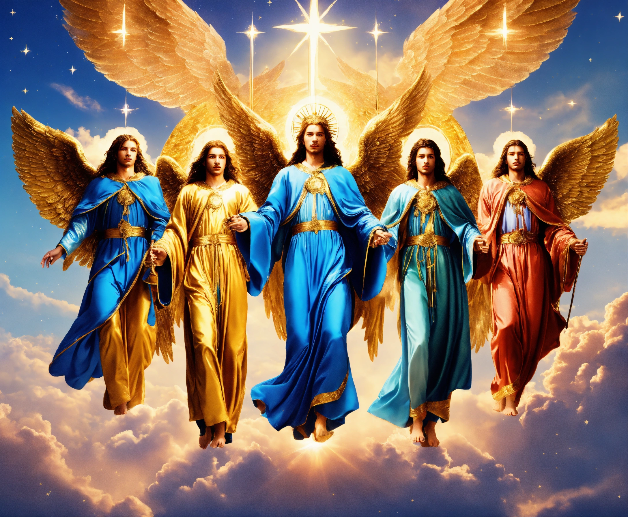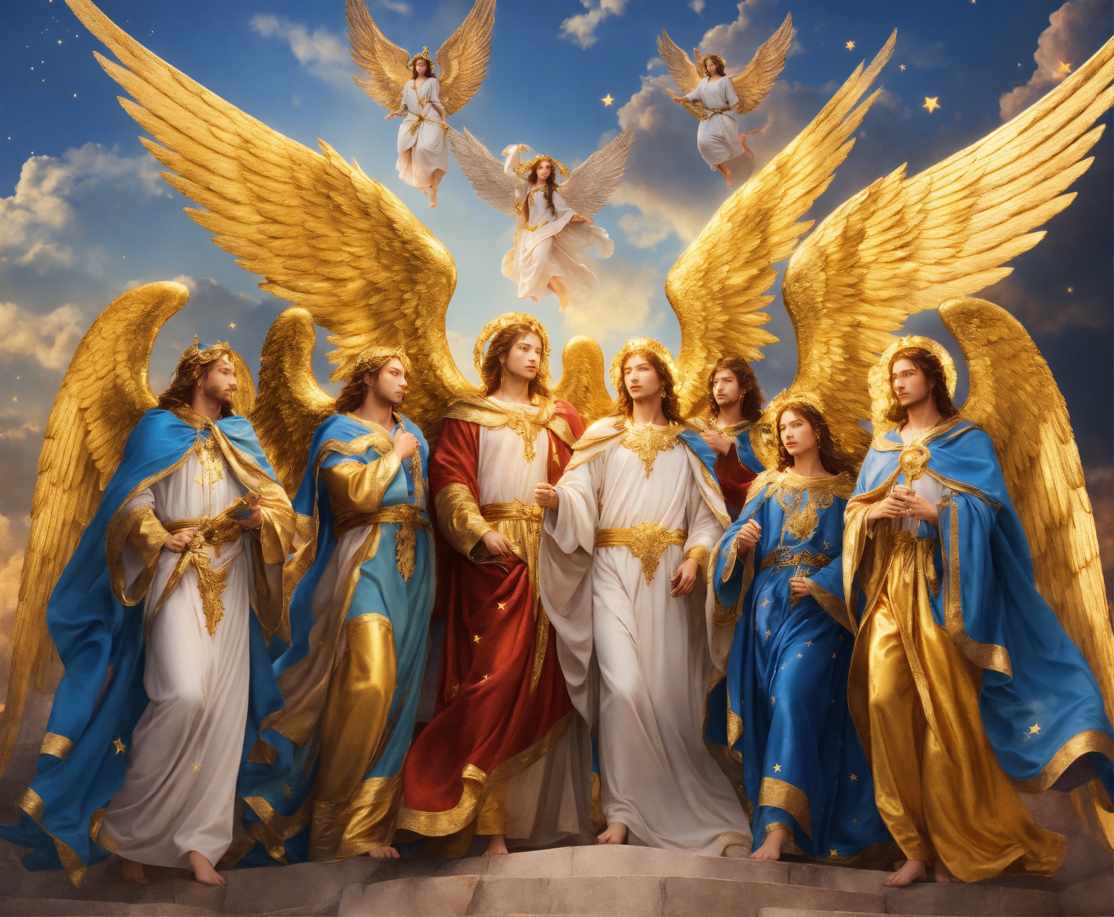 Seven archangels, with beautiful colorful robes, golden wings, blue sky with white clouds and golden stars, 8k, hyper-realistic background, hd.