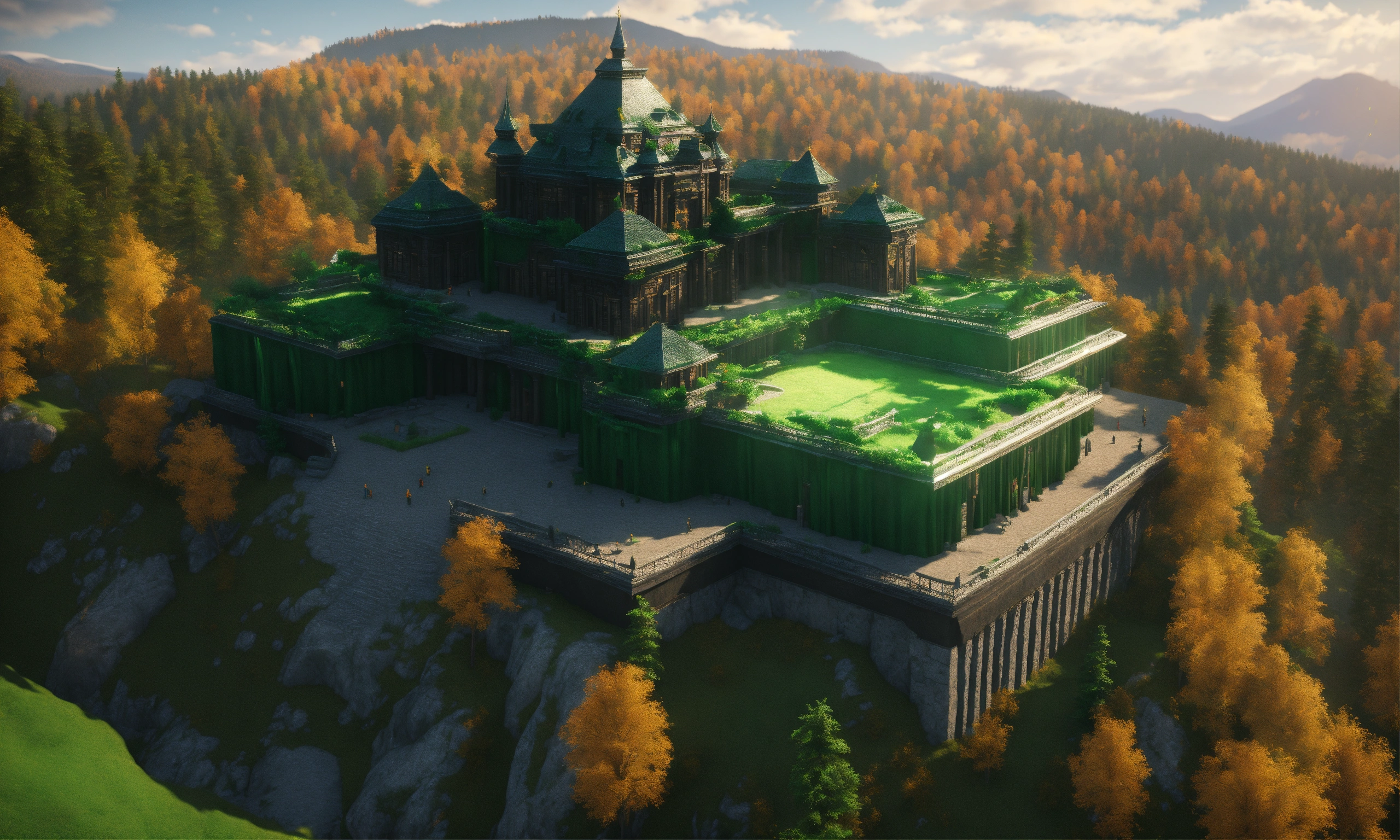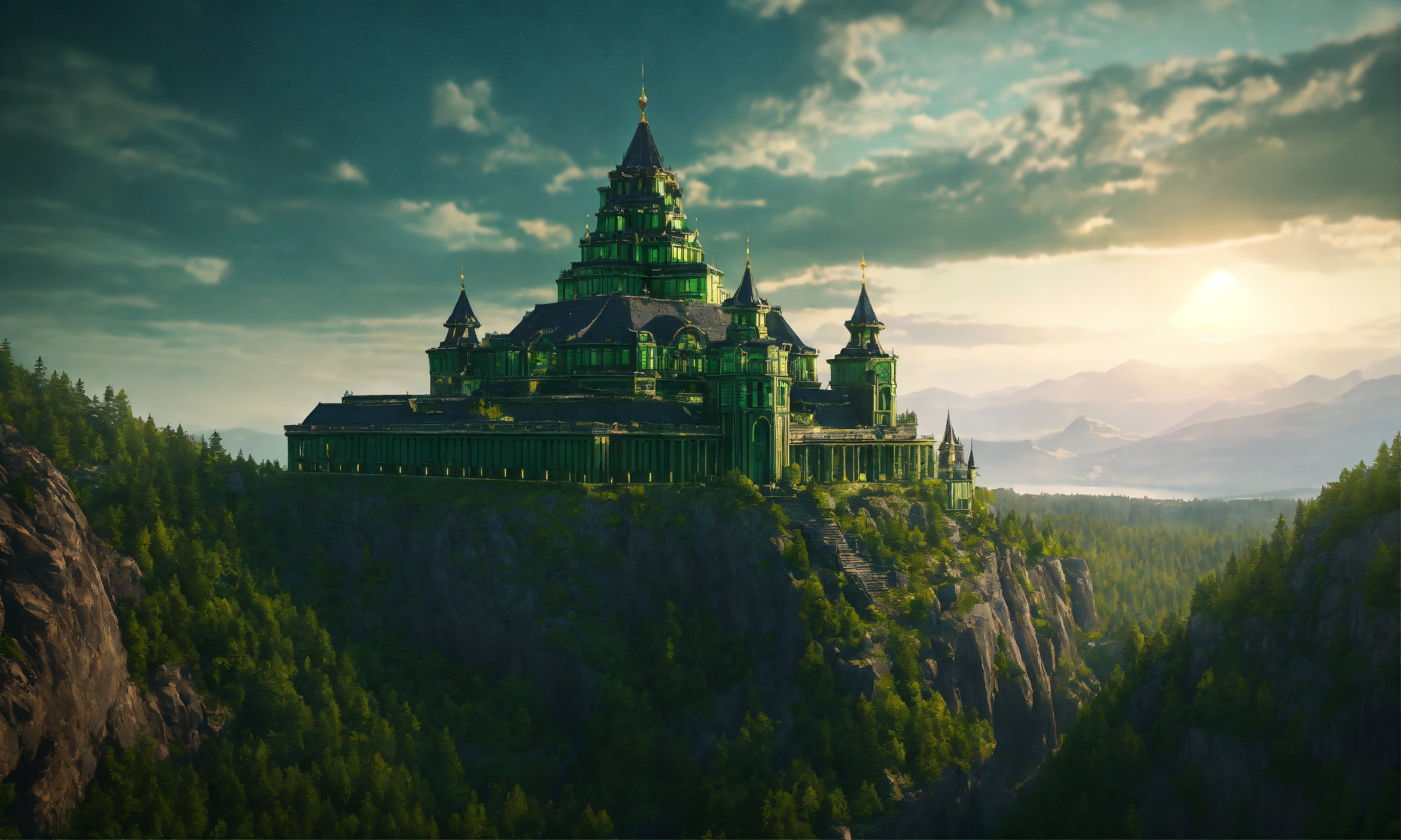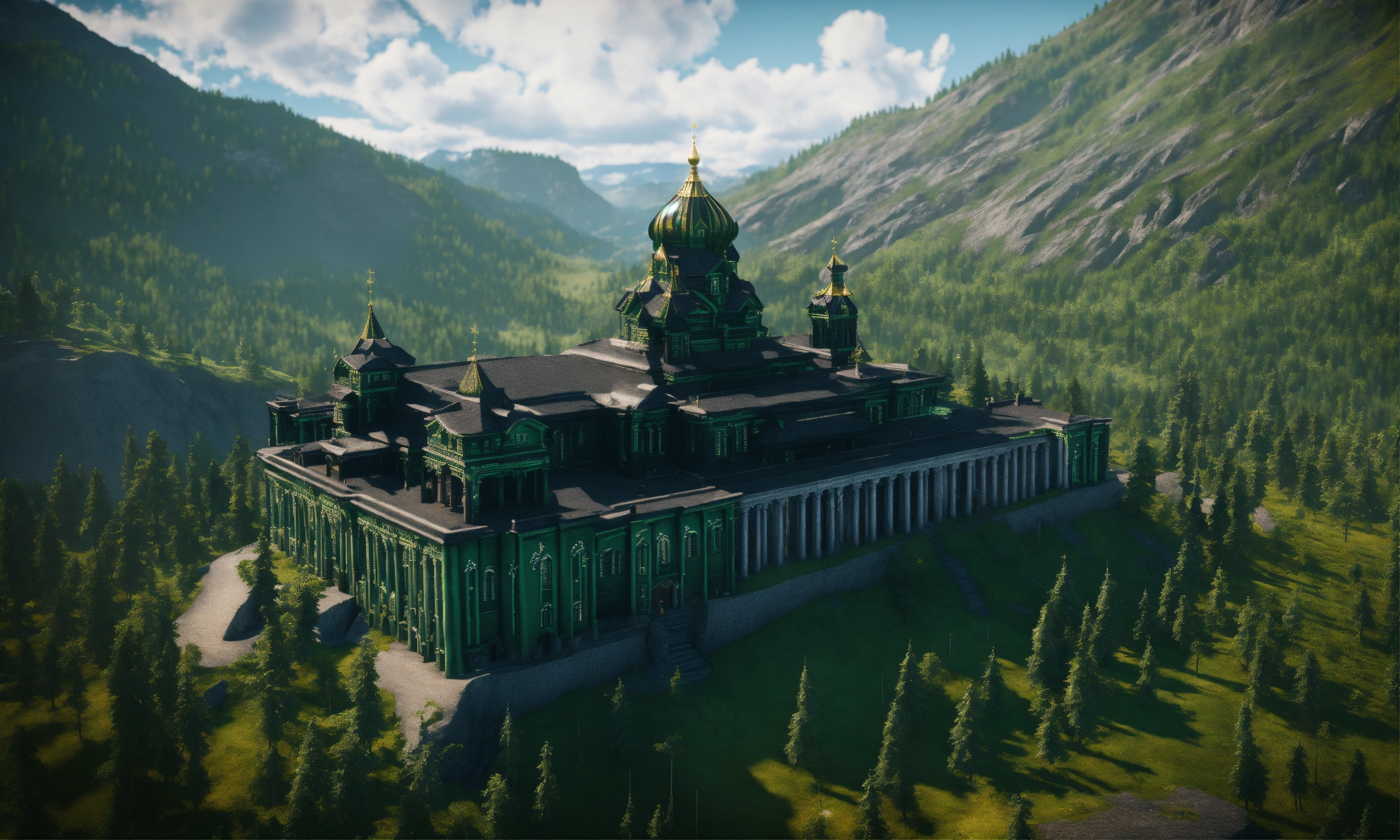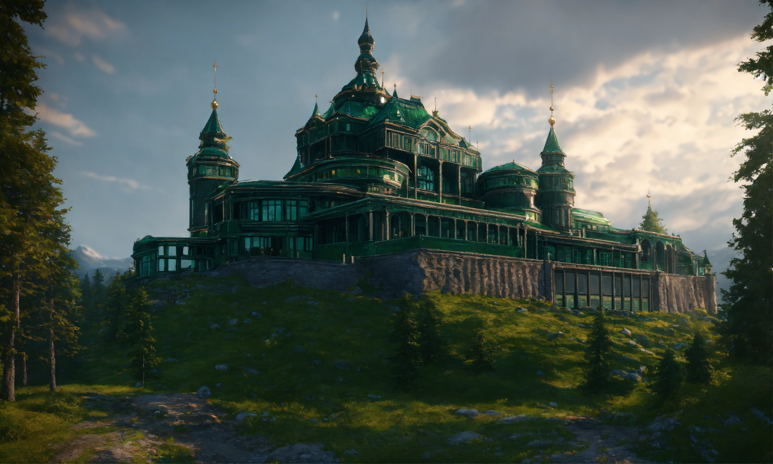 A massive black and green palace on a mountain overlooking the ural mountains, russian architecture, 8k, unreal engine, hd