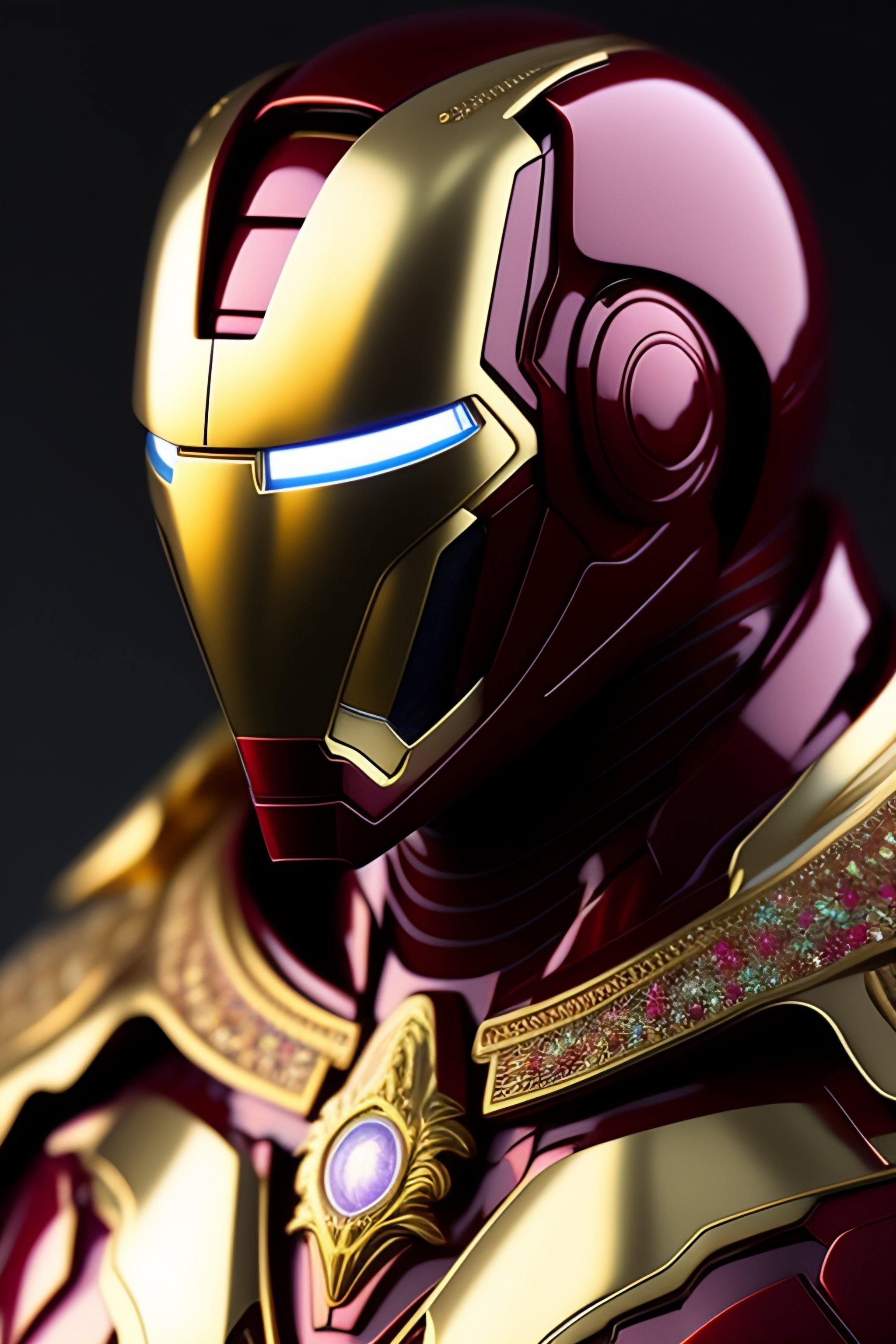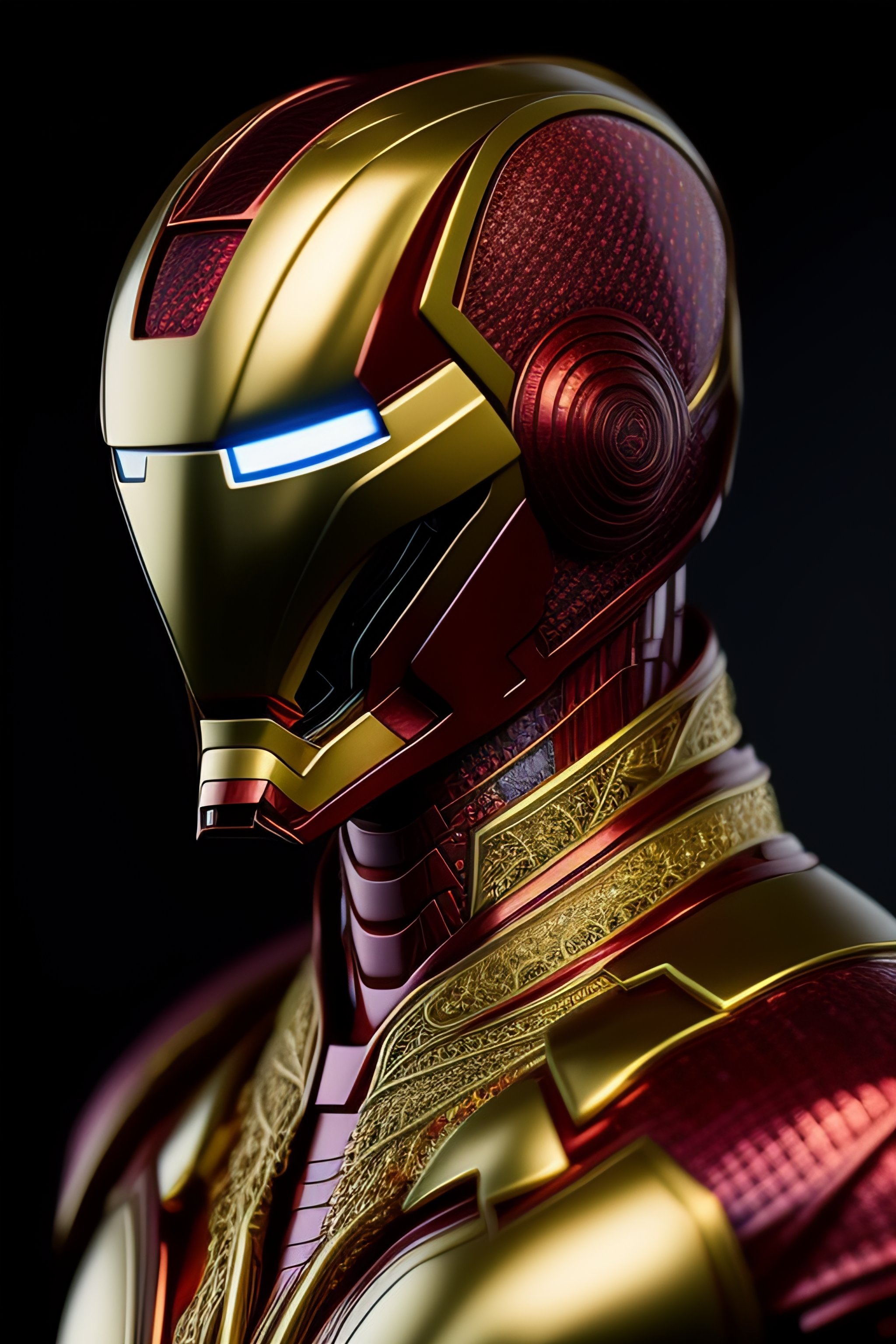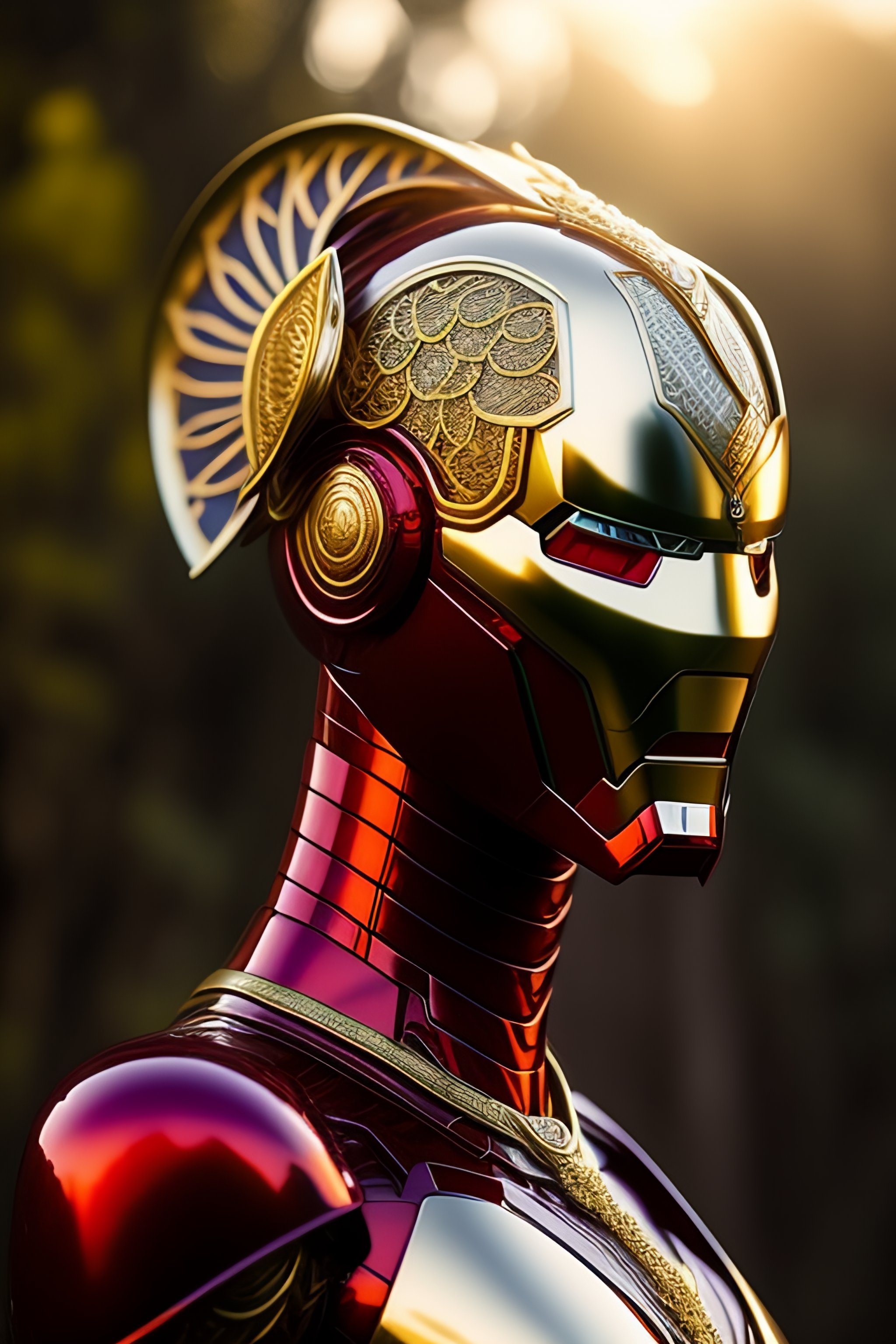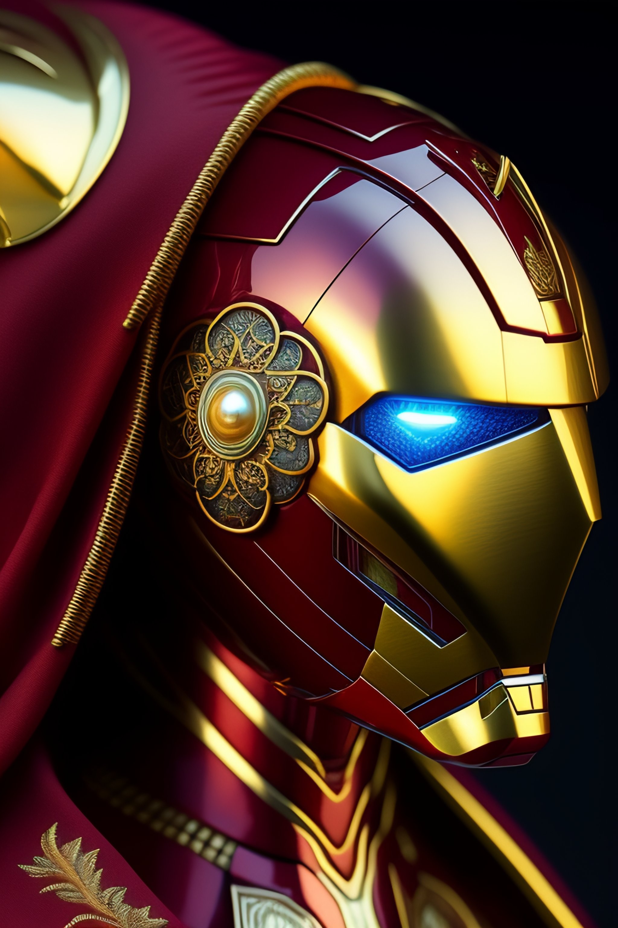 Iron man armor with doctor stranger's cape, ultra realistic, concept art, biomechanical skull demon king concept art portrait by casey weldon bioluminiscent creatures 1 5 0 mm lens, beautiful natural soft rim light big leaves and stems, white blossoms, sinuous roots, fine foliage lace alexander mcqueen high fashion haute couture charles de vilmorin silver, gold, red filigree details, pearl earring art nouveau fashion embroidered