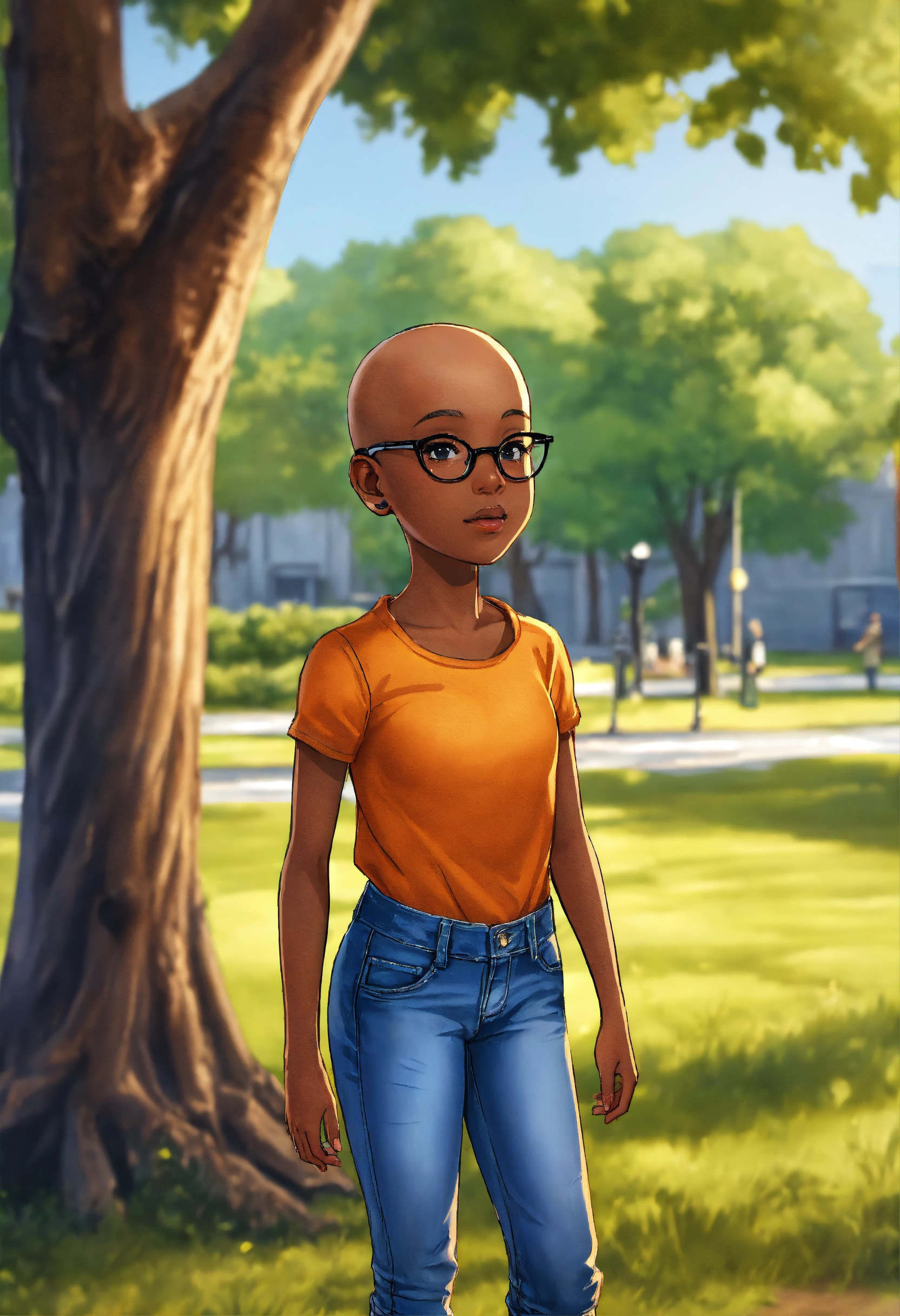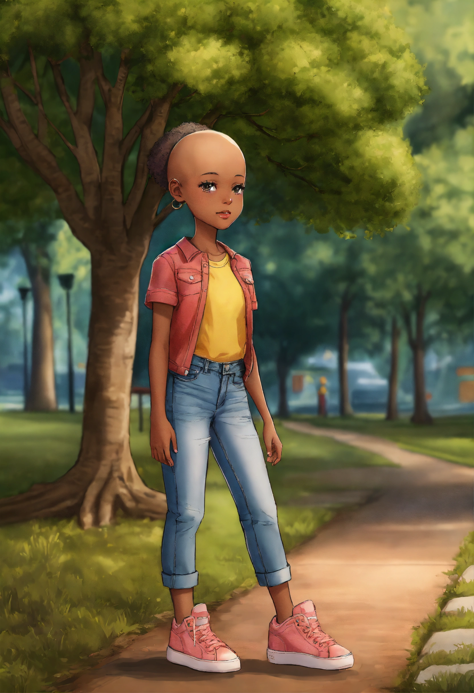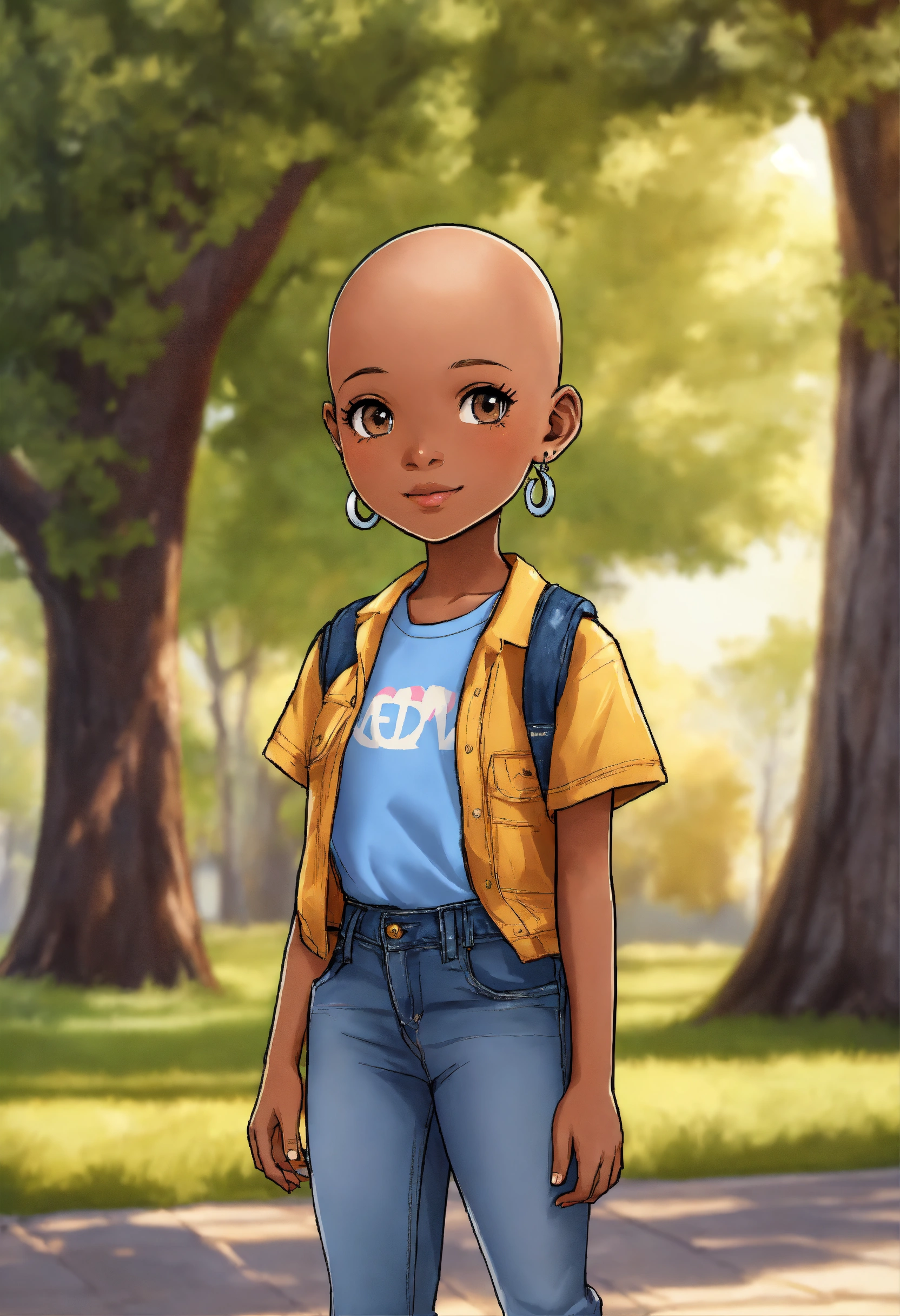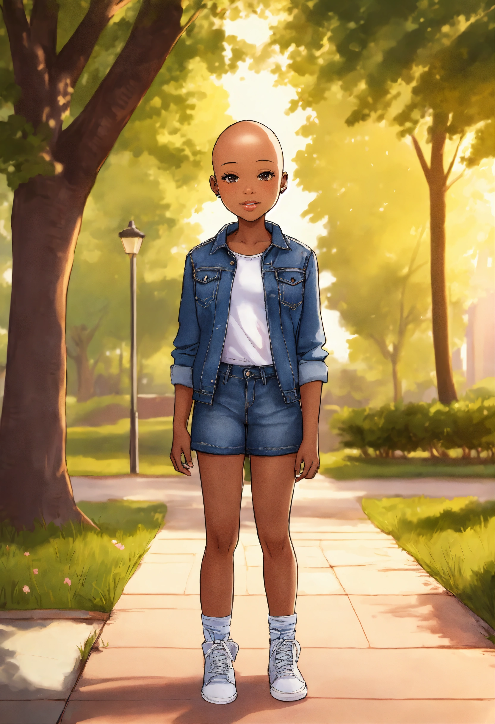 Realistic hd manga cartoon dark complexion african american 8 year old bald girl with full alopecia, wearing denim street wear style standing near a tree in a park, alopecia awareness, bald head and no eyebrows