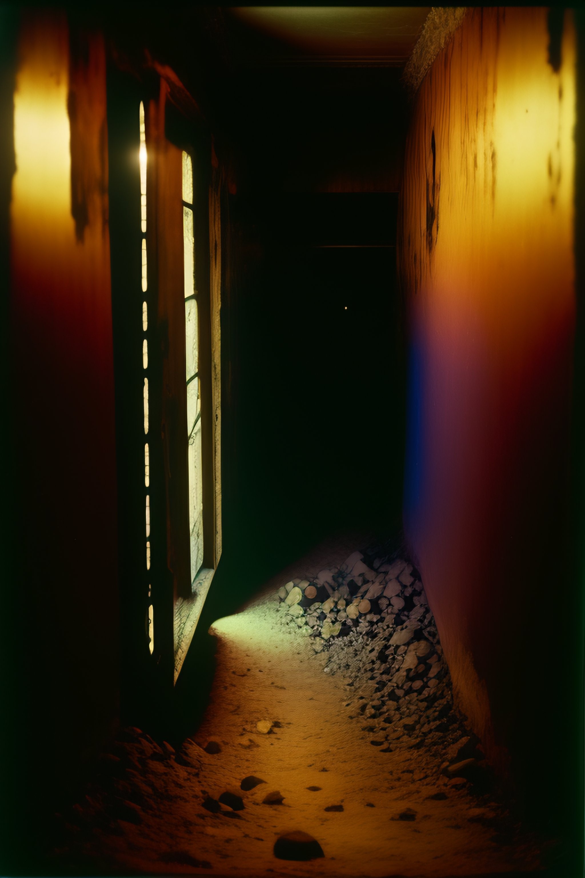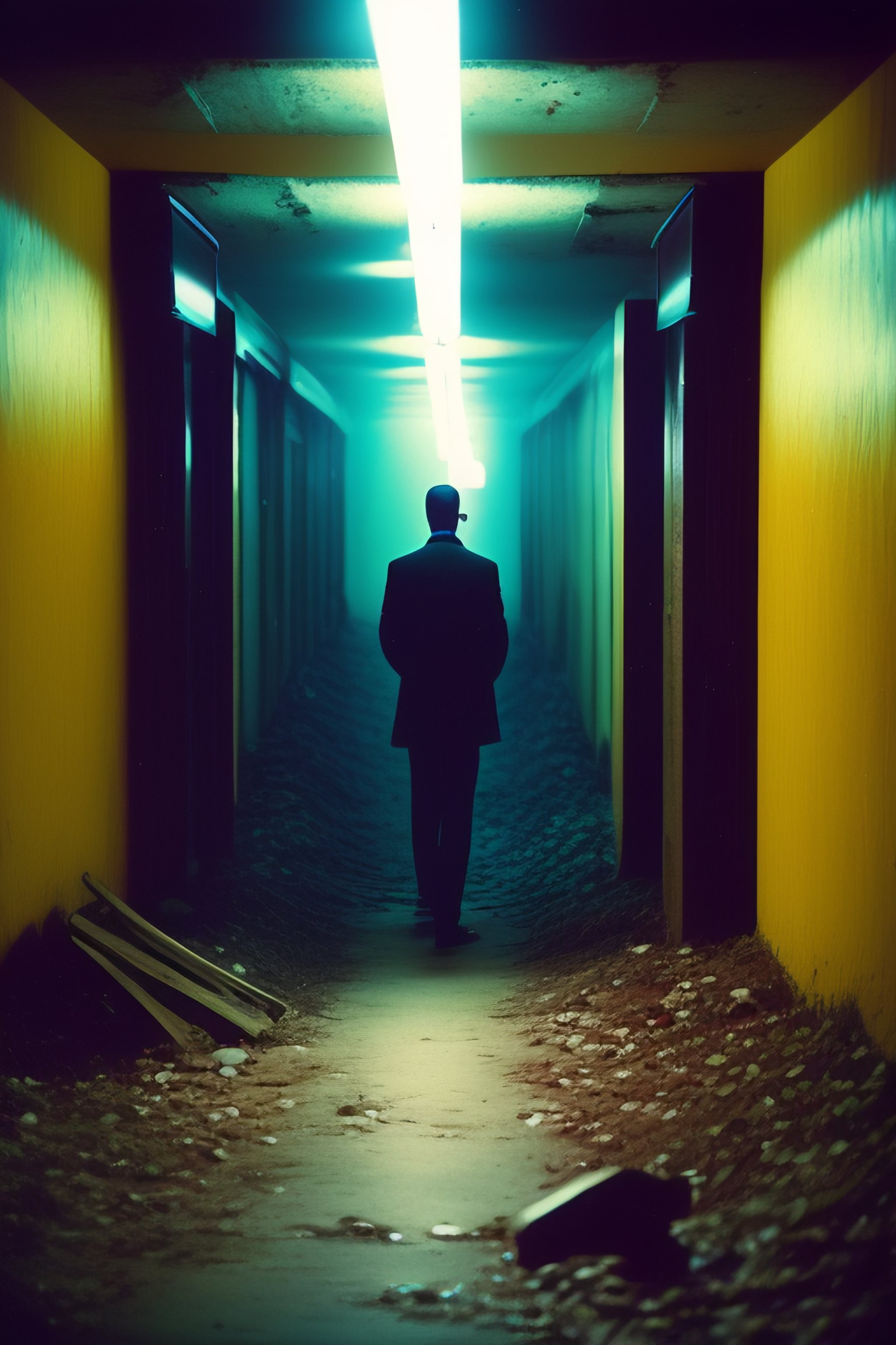 Old found footage of hyper realistic a man, abandoned, liminal space, horror, eerie, mysterious, noise and grain, dark hues, dark tones, single source of light, 35mm, kodak autochrome, floating particles, auto flash, auto focus