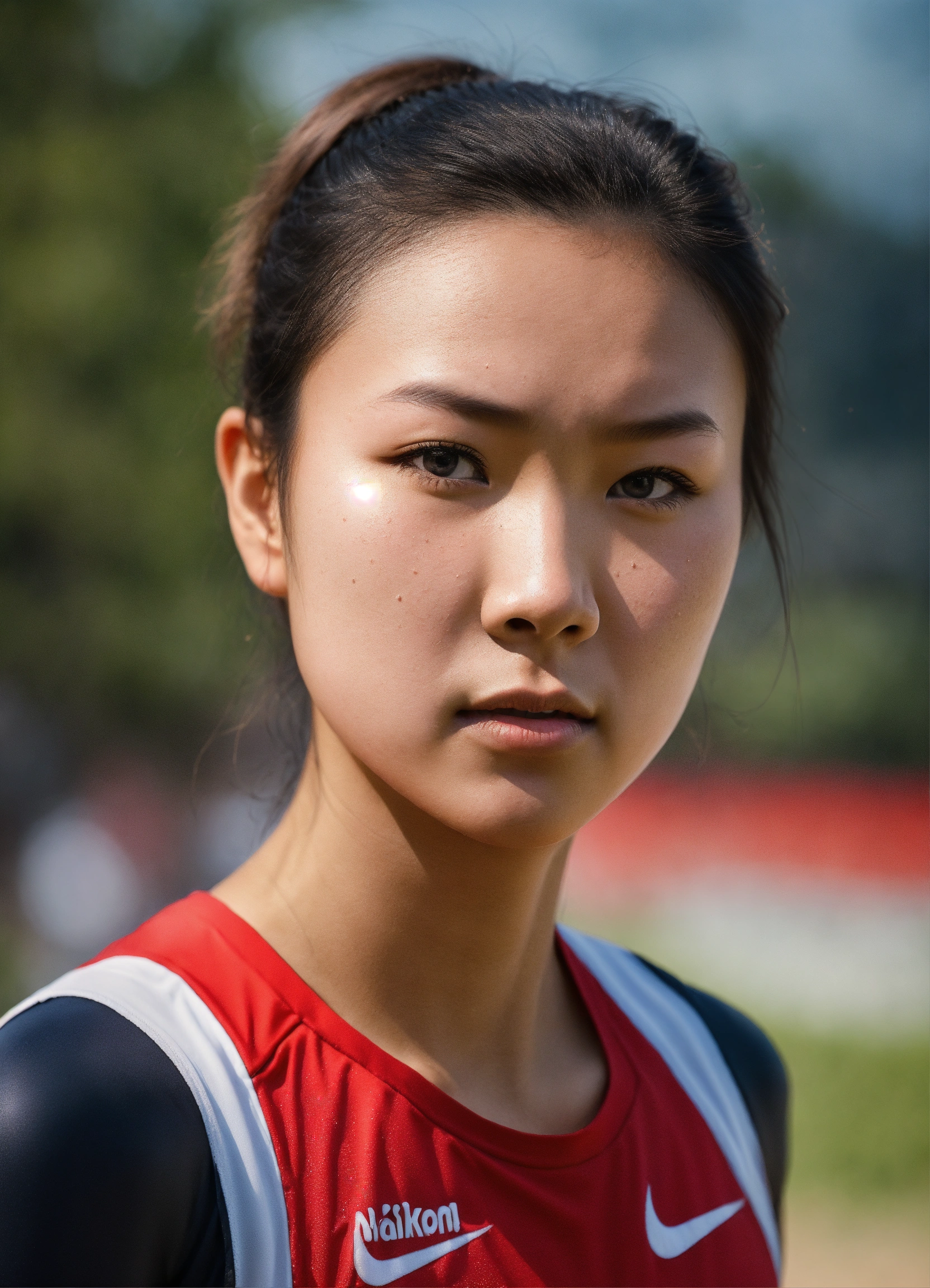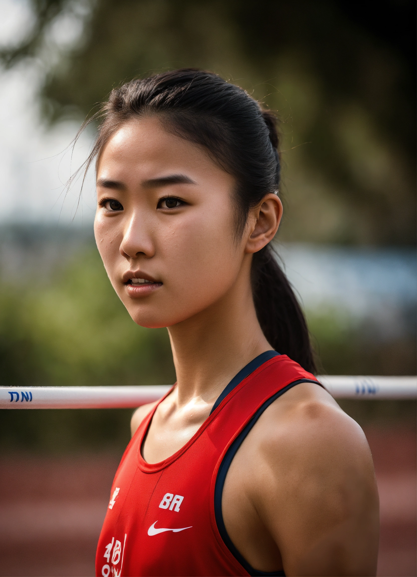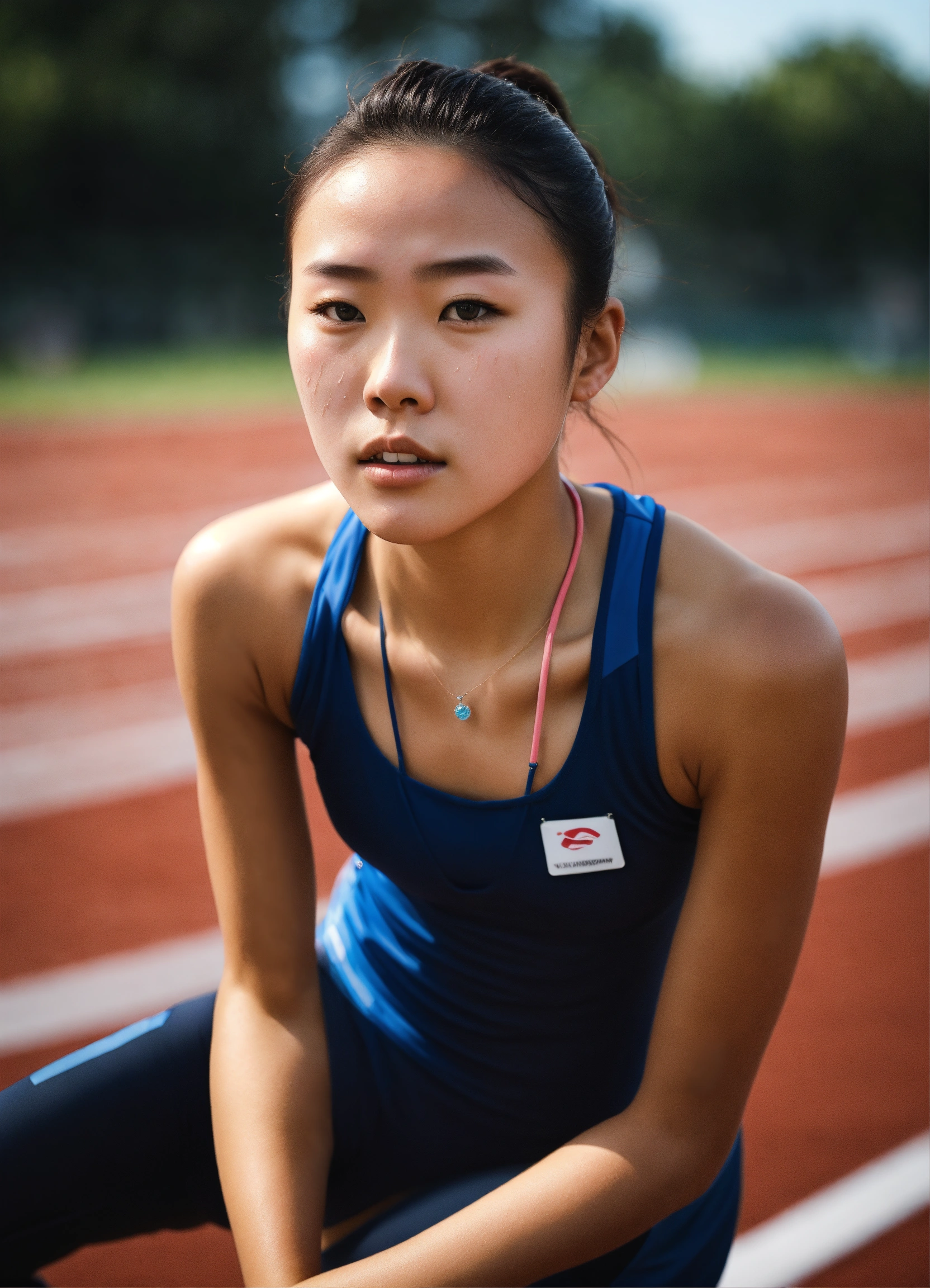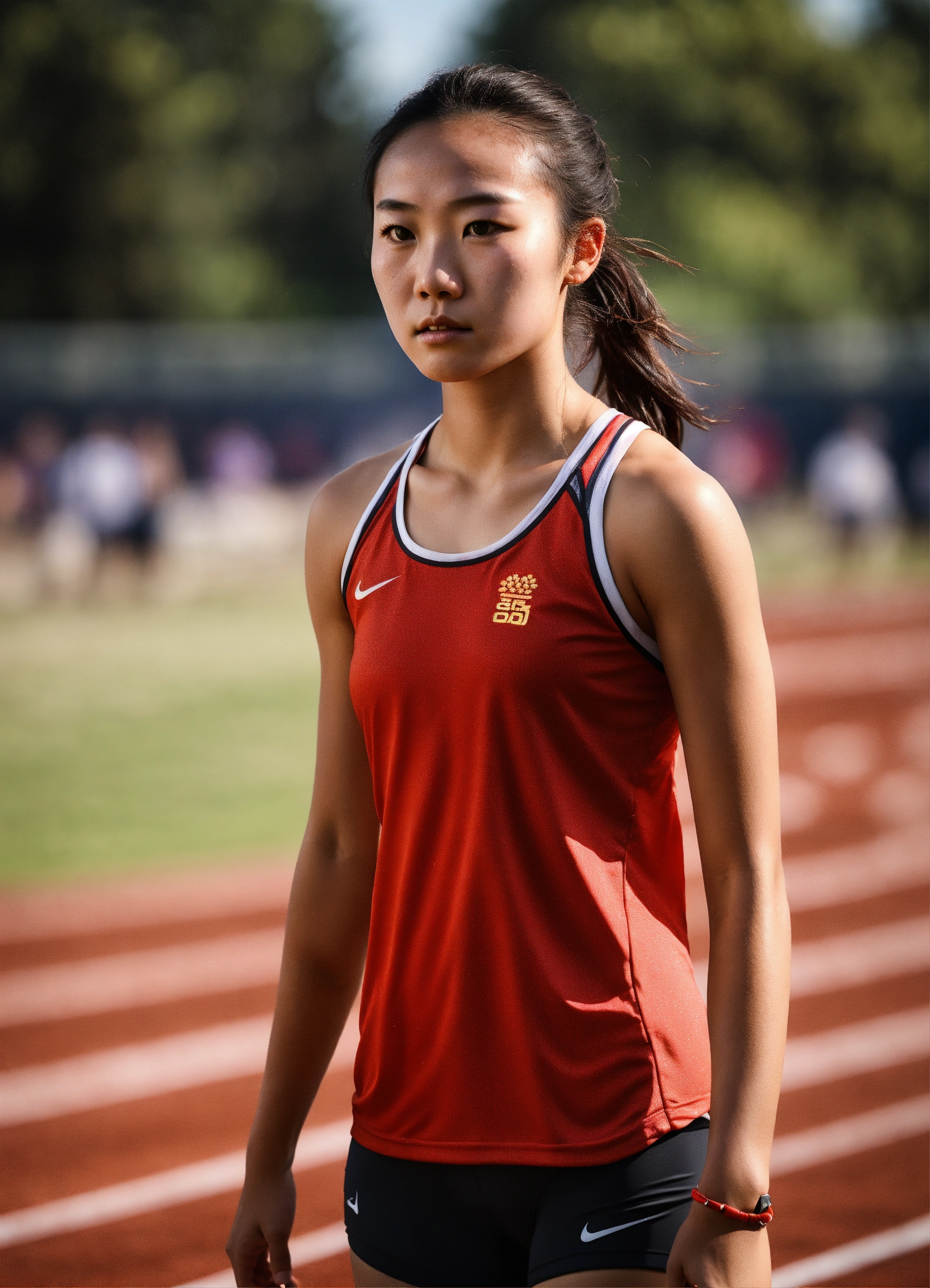 Mid-day at a track field. close-up shot of an 18-year-old tanned and athletic chinese girl, a determined national team runner captured during an intense training session, her toned skin, bronzed from hours under the sun, complements her youthful yet intense exertion evident on her face, glistening beads of sweat stand out on her forehead, coupled with signs of heavy breathing, she's adorned in athletic wear in red and white. every droplet of sweat exudes determination and perseverance, while her focused gaze radiates ambition and drive, shot with a nikon d850, 85mm f/1.4 lens, with a shallow depth of field to emphasize her features, digital photography infused with subtle watercolor rendering for artistic depth, the bright mid-day light contrasts her determination, creating a powerful juxtaposition.